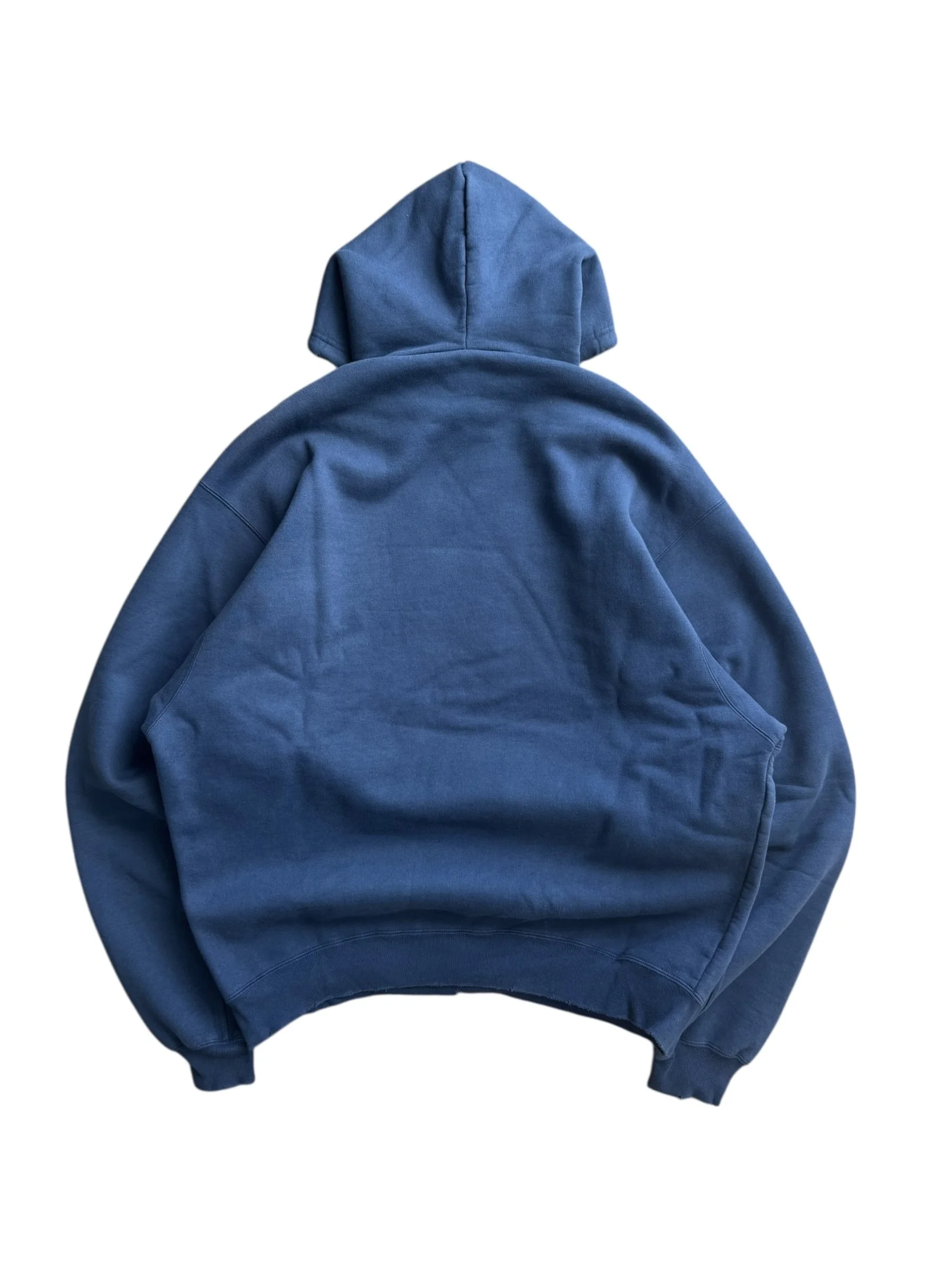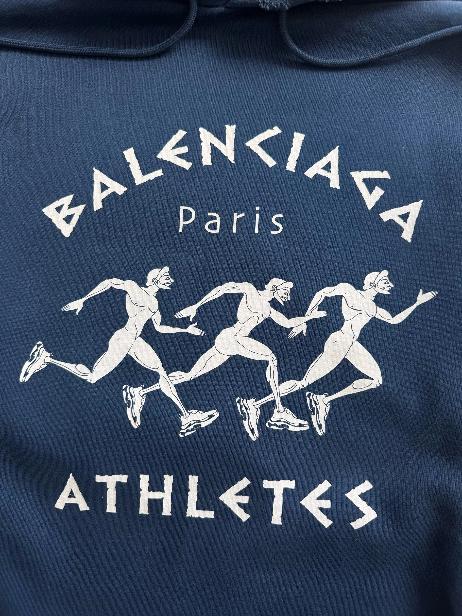 This classic oversized Balenciaga hoodie was released in the Spring/Summer 2021 collection. Coming in the blue color way, the front graphic pays homage to the 2020 Olympic Games and features ‘Balenciaga Athletes’ wearing the signature Triple S sneakers. Distressing detail on the hood & hem. Tagged a xxs but fits extremely oversized, close to xl. In good condition with no flaws or damages