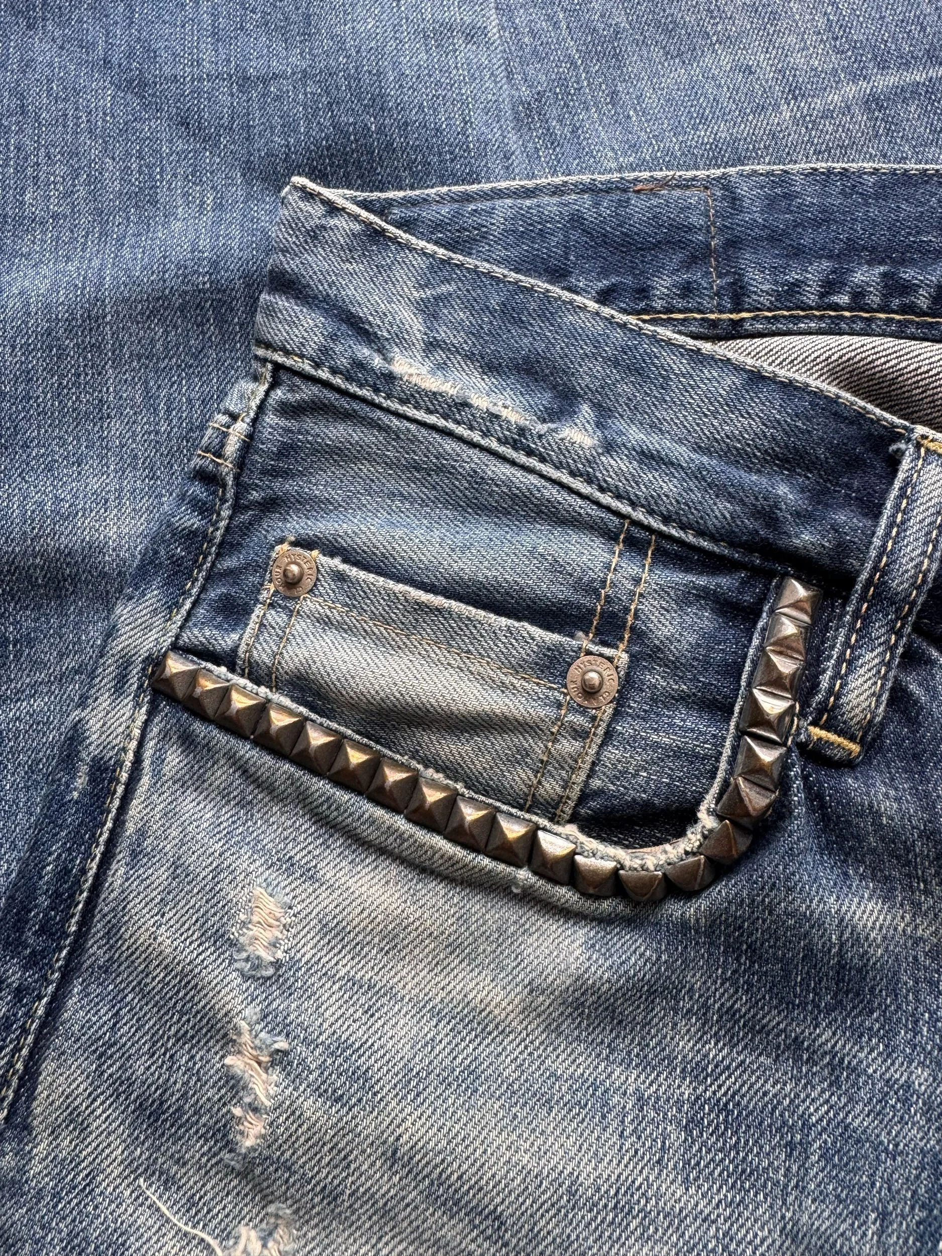 Showcased is a beautiful pair of Hysteric Glamour jeans with l factory processed distressing throughout, with blowouts on the knee and grunge stripe patchwork details. Signature studded right pocket seen across many Hysteric Glamour jeans. In good condition with no major flaws or damages
