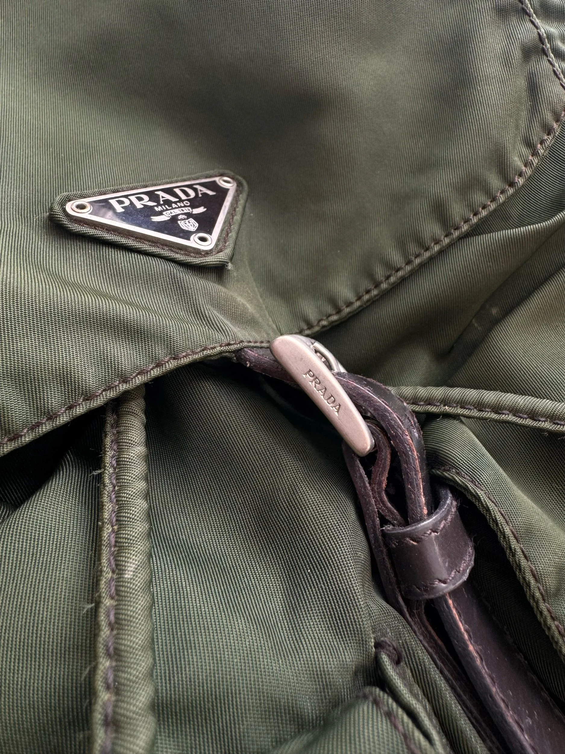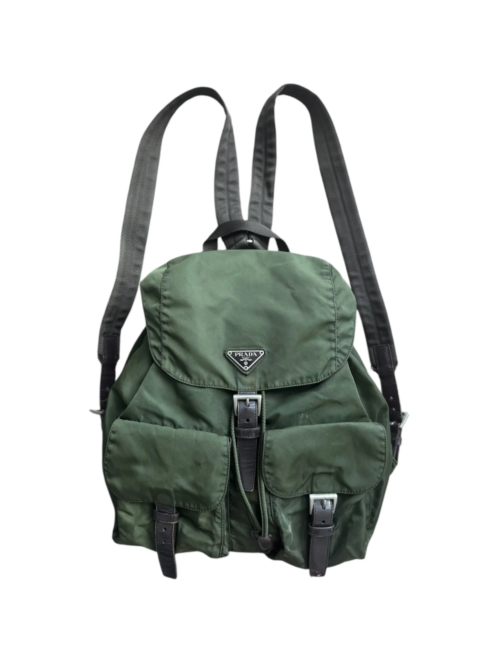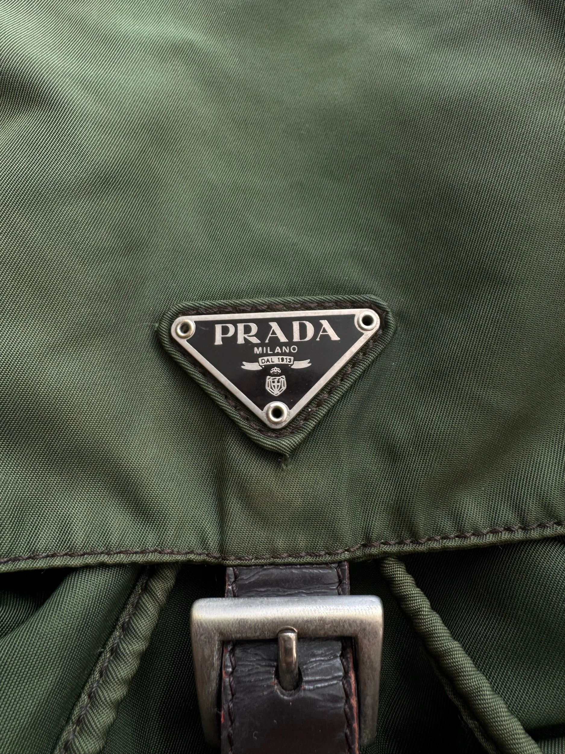 This beautiful backpack coming in the lovely ‘Ebano’ color way is constructed of nylon material and features the Prada triangular plate logo on the front side. One main storage compartment with two other small ones on the front side of the bag. The adjustable strap is constructed of leather, as well as all other straps on the storage compartments. All hardware is engraved with the Prada logo. In good condition with no flaws or damages