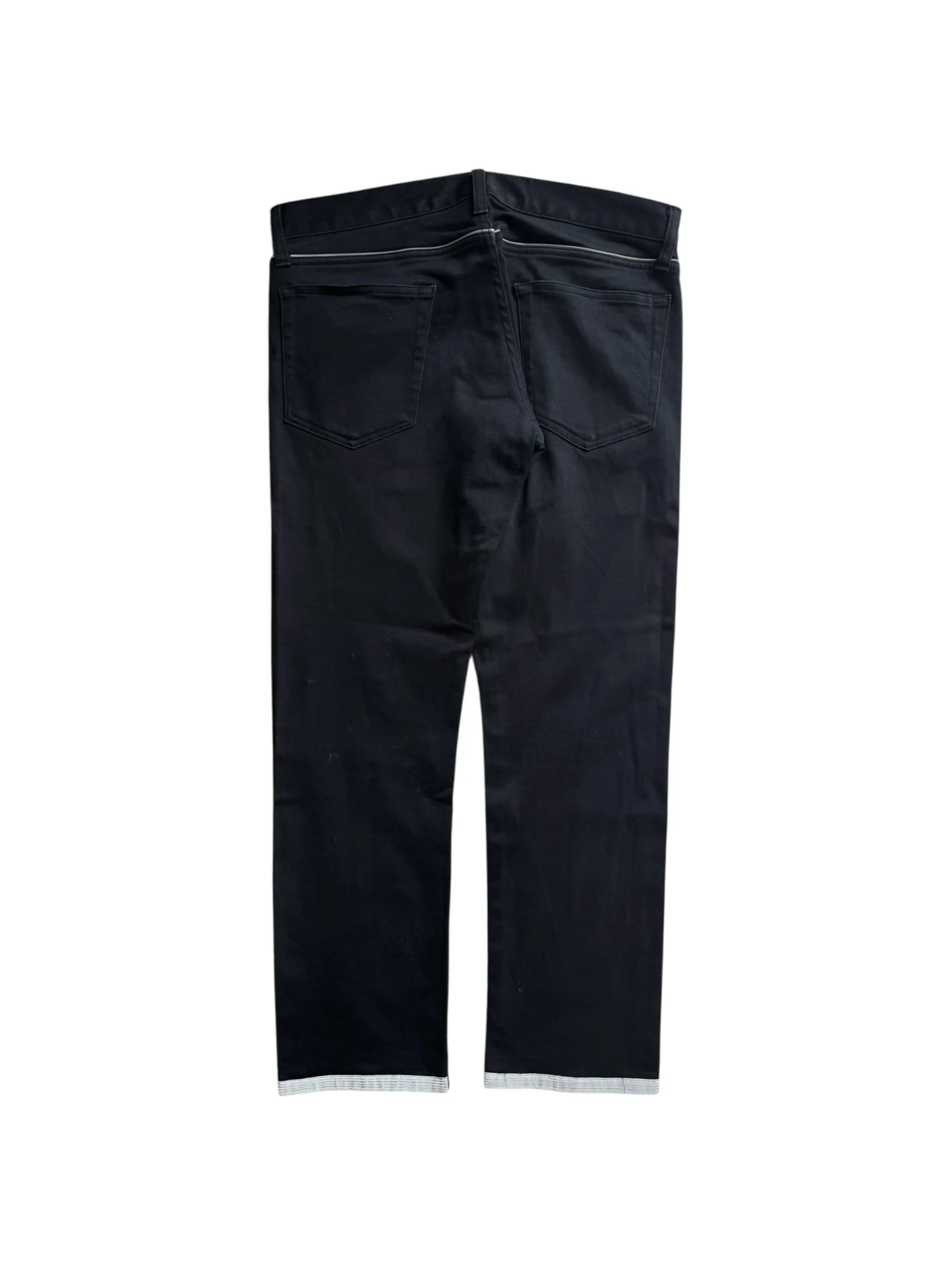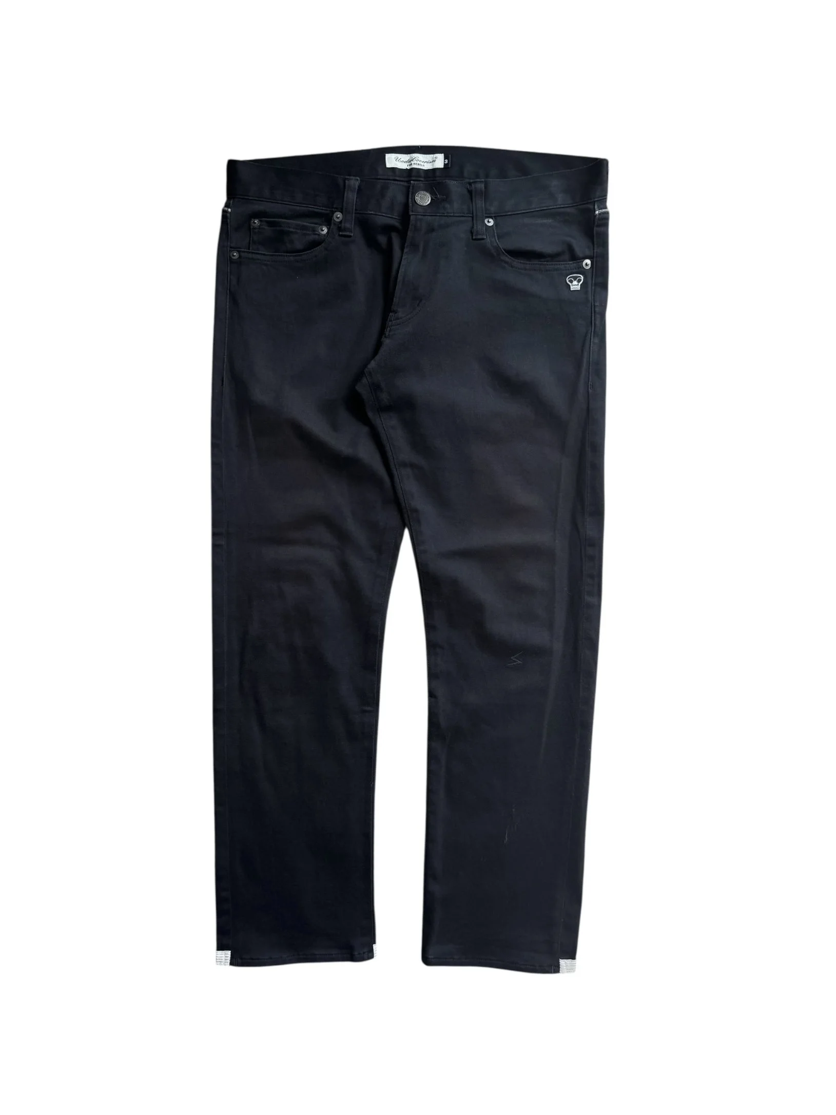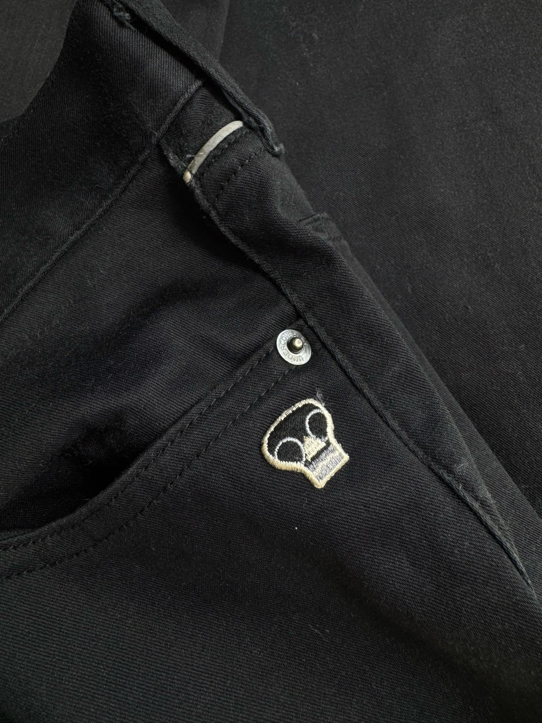 These beautiful all-black slacks are from the Spring/Summer 2008 “Summer Madness” collection. Features a small skull embroidery near the front pocket. White lace lining on the leg opening. Signature Patti Smith bolt tattoo embroidery. In good condition with no major flaws or damages