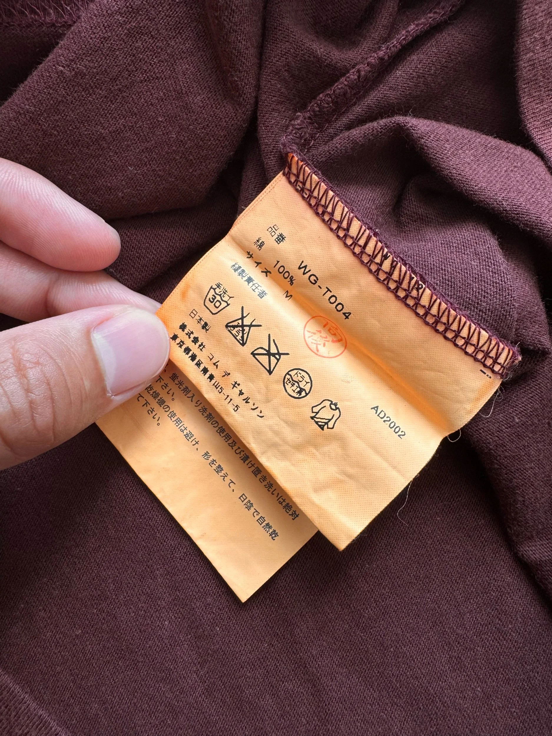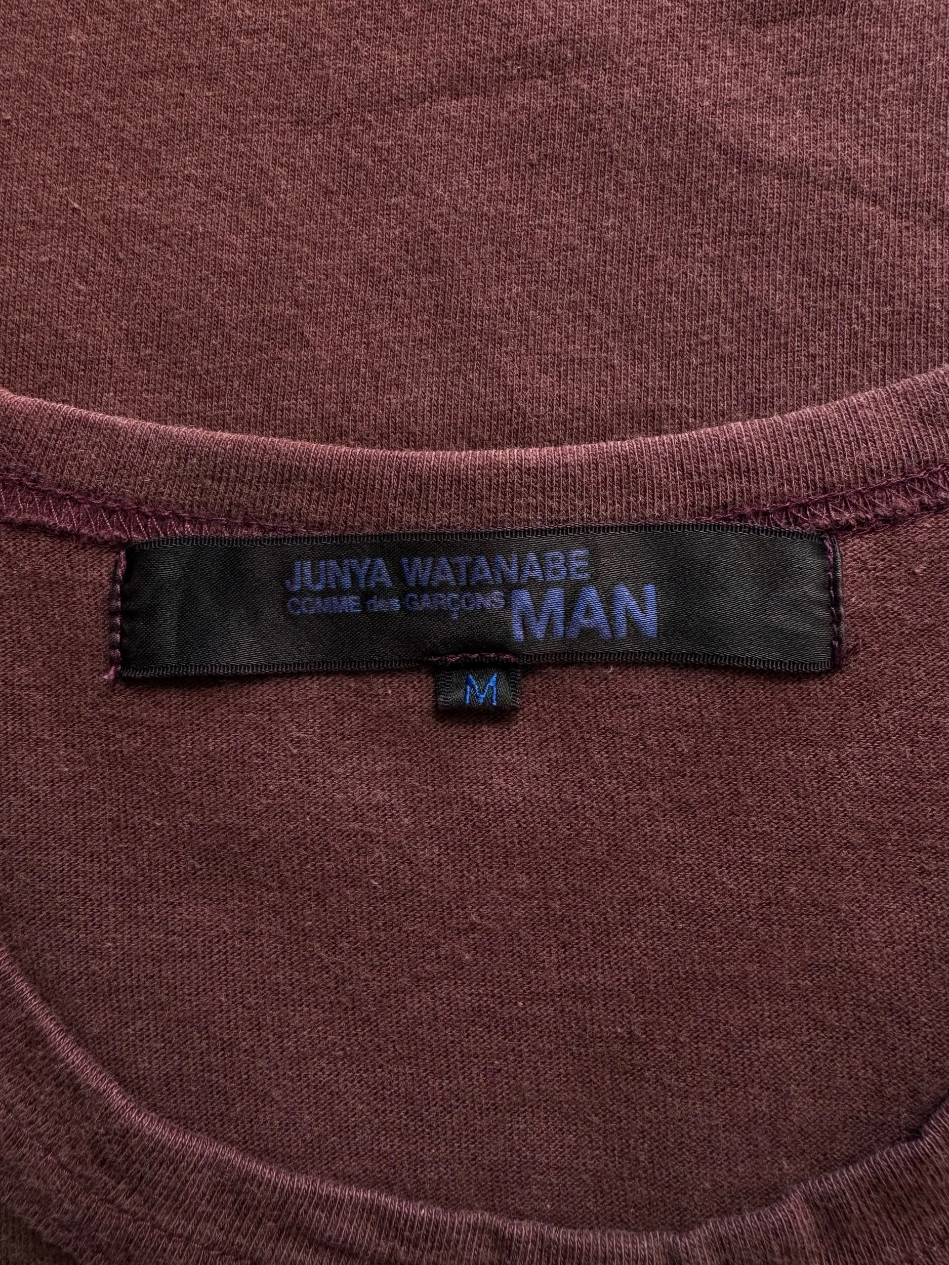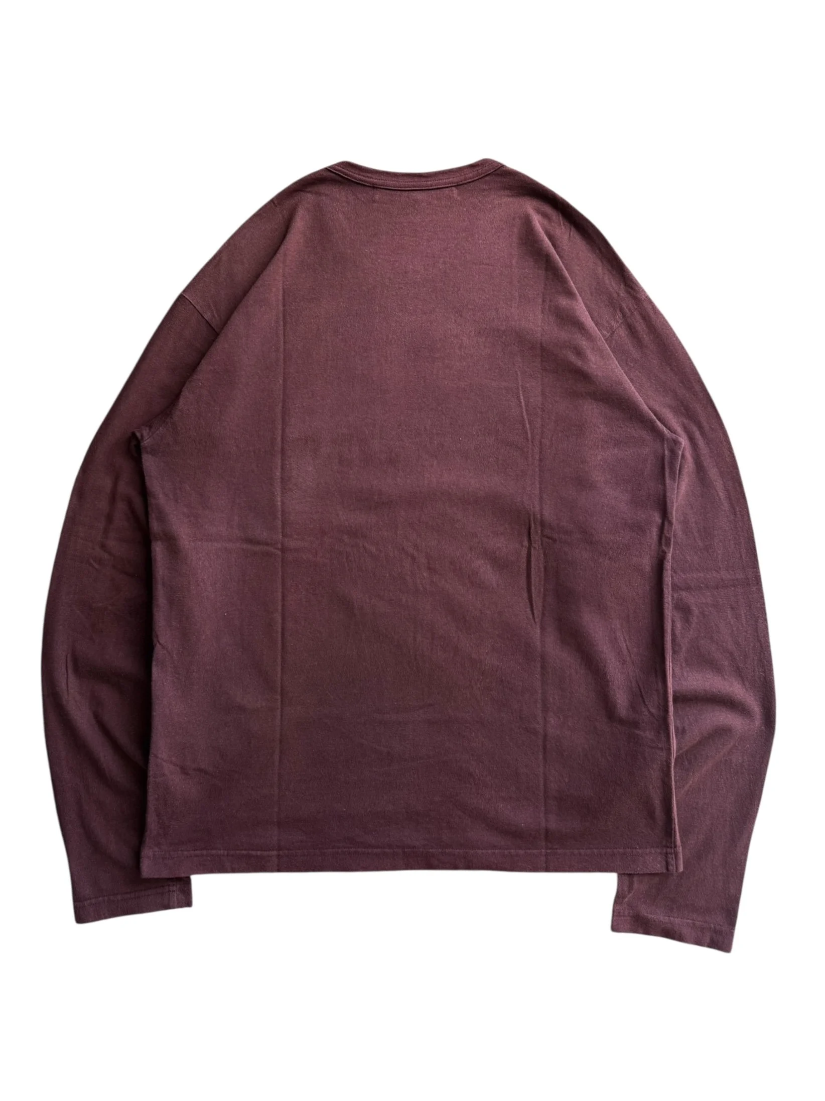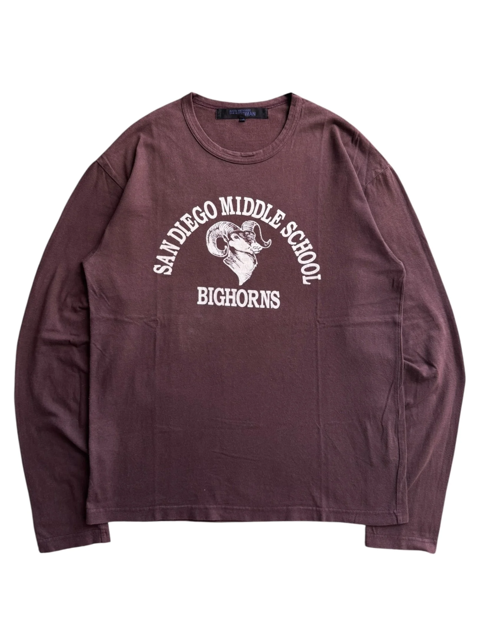Showcased is a beautiful maroon long-sleeve from the Autumn/Winter 2002 collection. For this collection, Junya Watanabe focused on collegiate wear, synthetic fabric, and textile innovation. Multiple pieces in this collection featured different animals with school graphics; this one being the San Diego ‘Big Horns’ which is centered on the front side of the crewneck. In great condition with no major flaws or damages