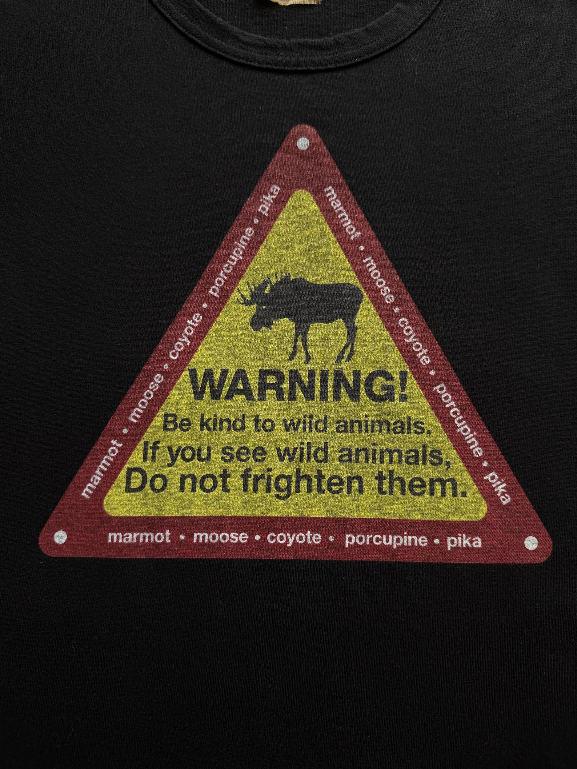 This t shirt was released in the Spring/Summer 2005 collection. Features a very respectful ‘Wild Animal’ warning sign, with name of animals on the border; image of a moose in the center. In good condition with no major flaws or damage