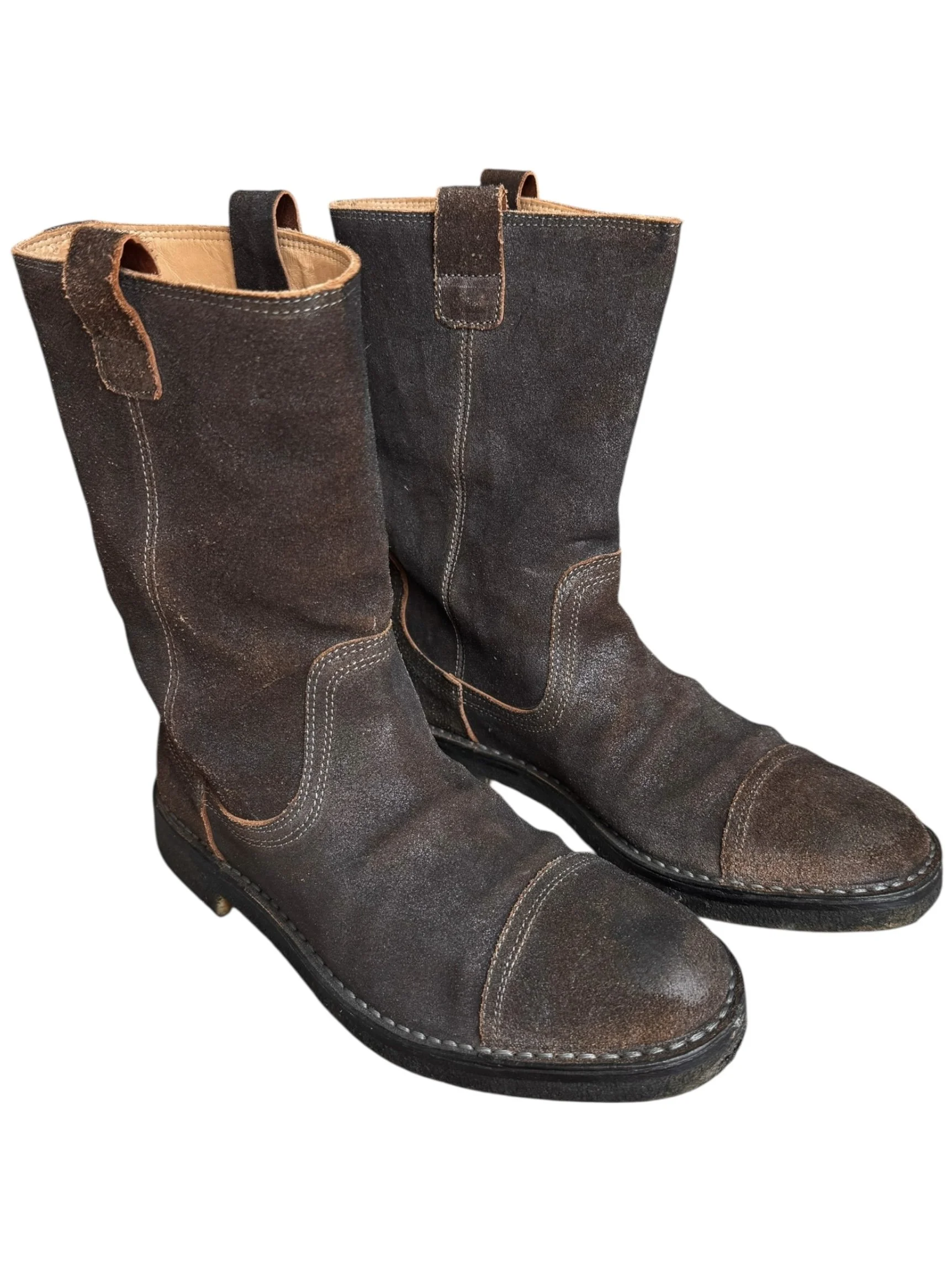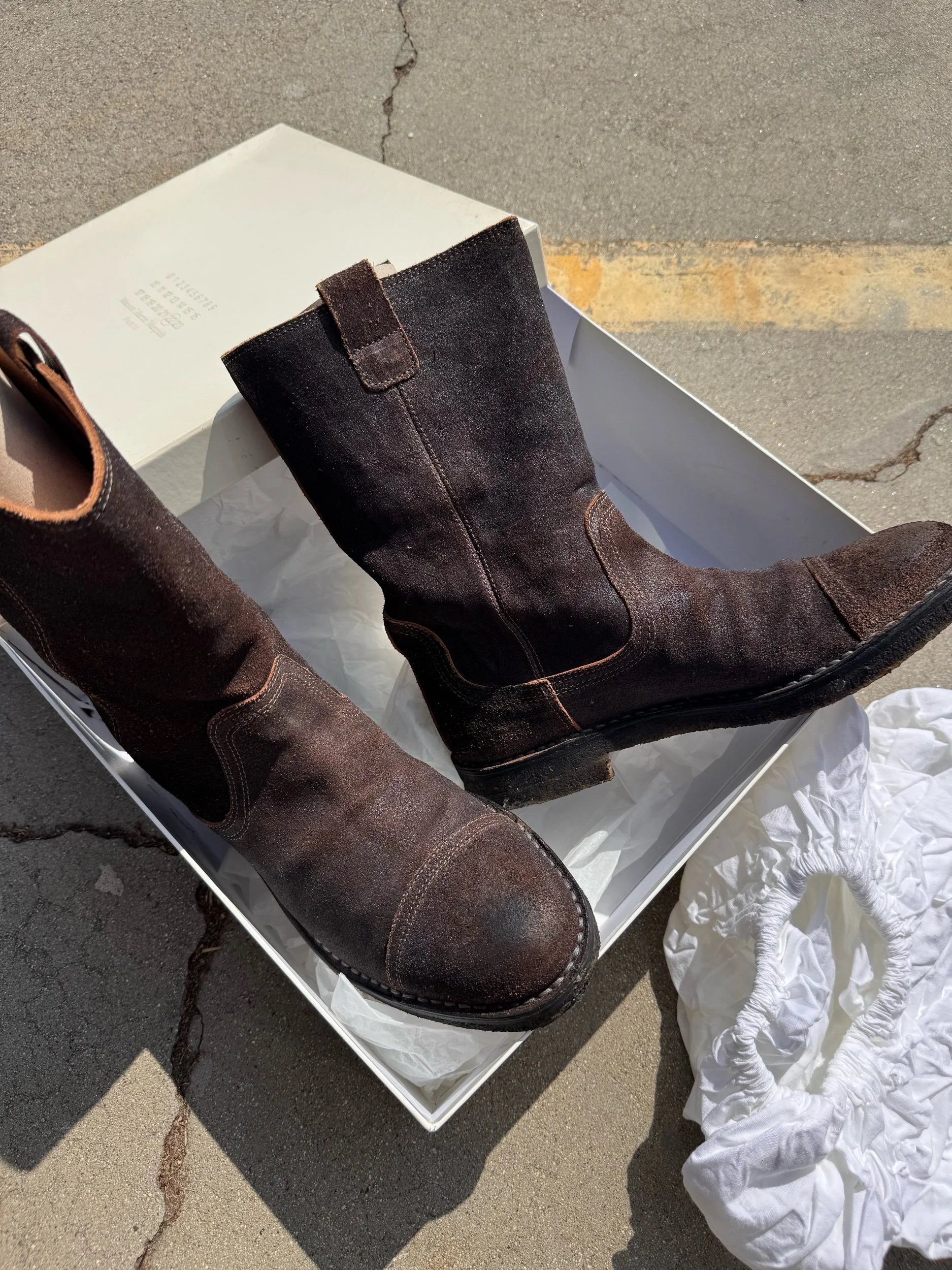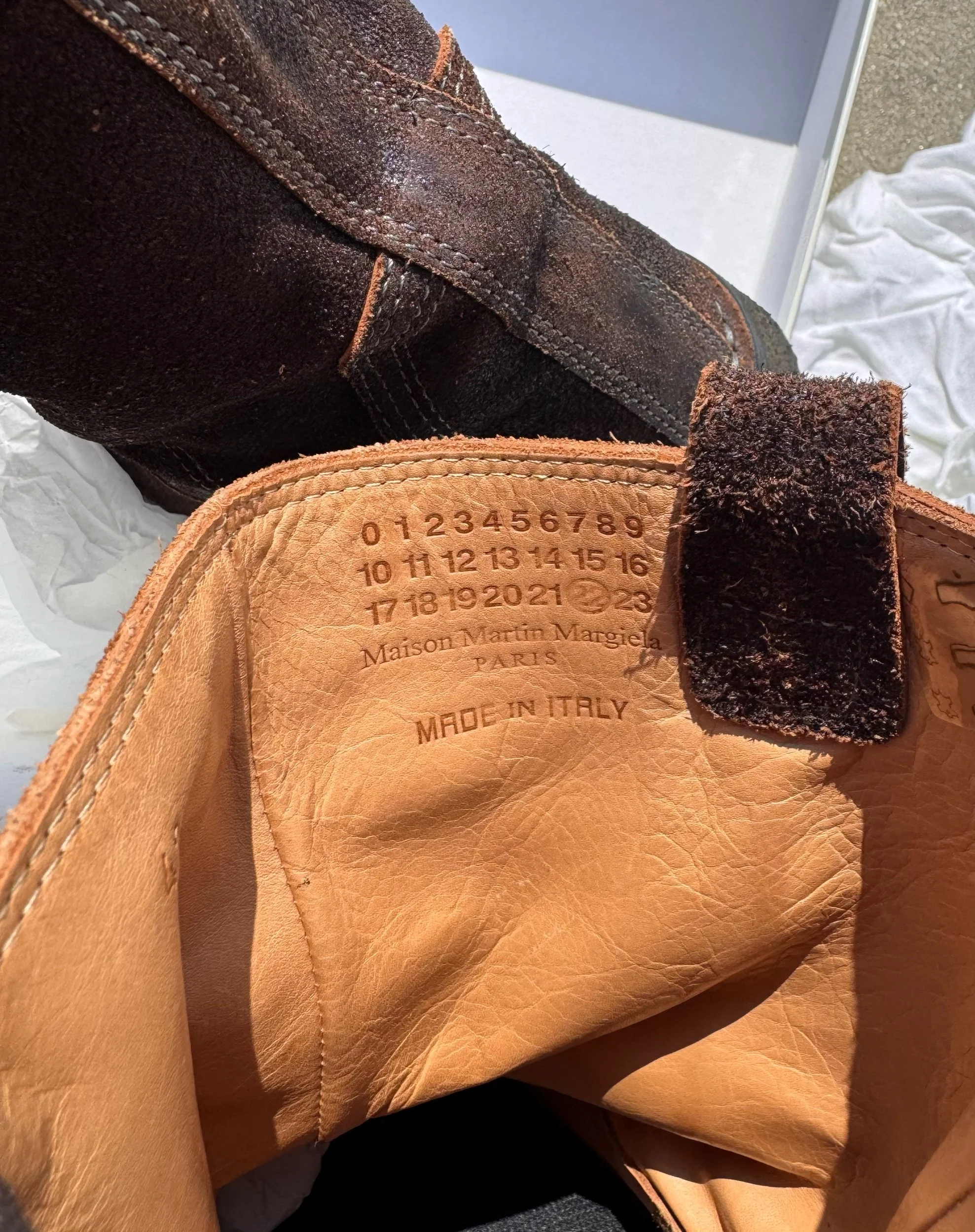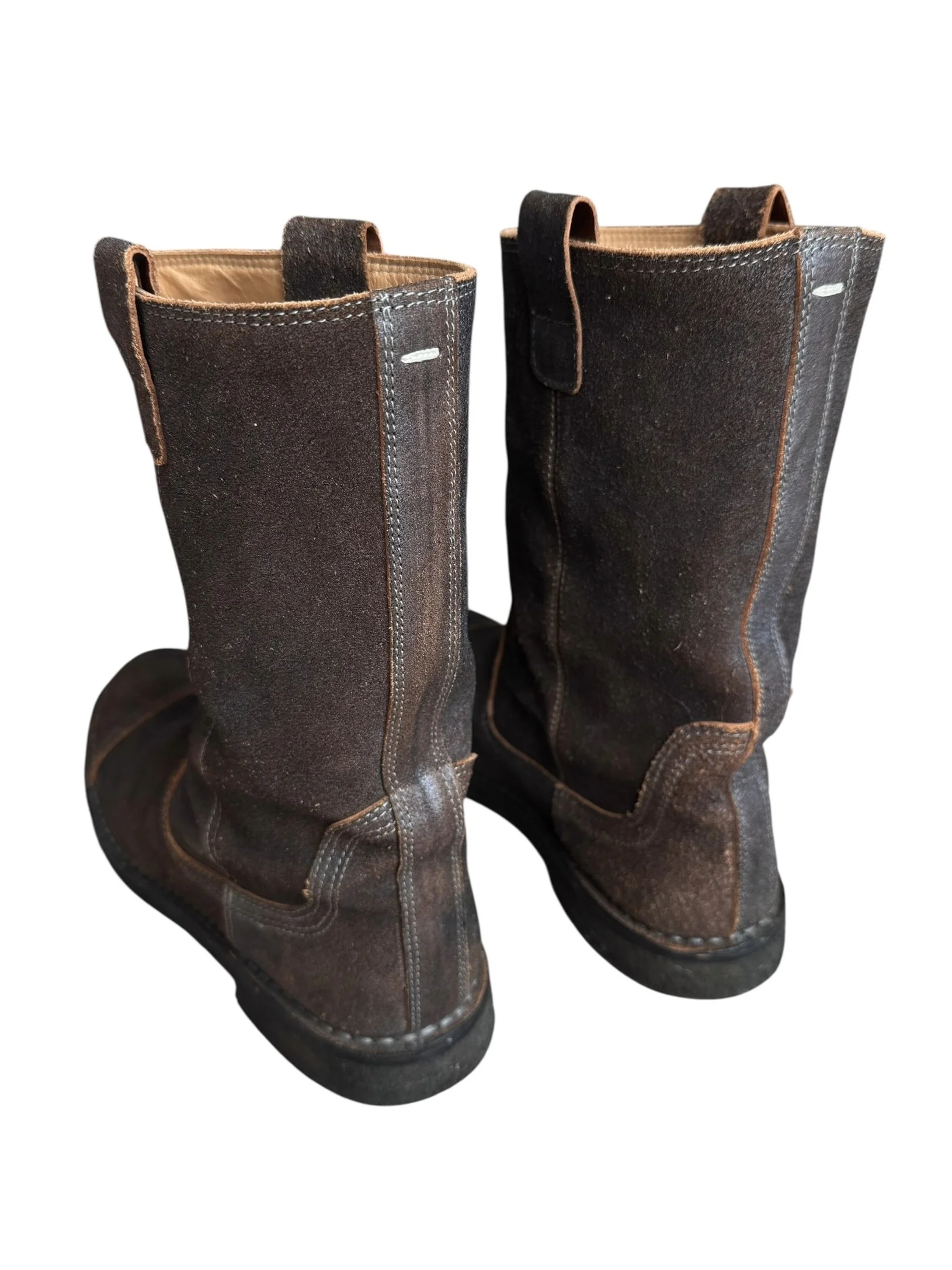 These gorgeous Maison Margiela boots feature a distinctive oil-spill effect, where the surface gradually reveals a subtle glossy underlayer as they age and wear. Crafted from rugged brown, they feature the signature white stitch detail on the rear and the branding embossed in the inner. In brilliant condition with no major flaws or damages. Comes with the original box from purchase