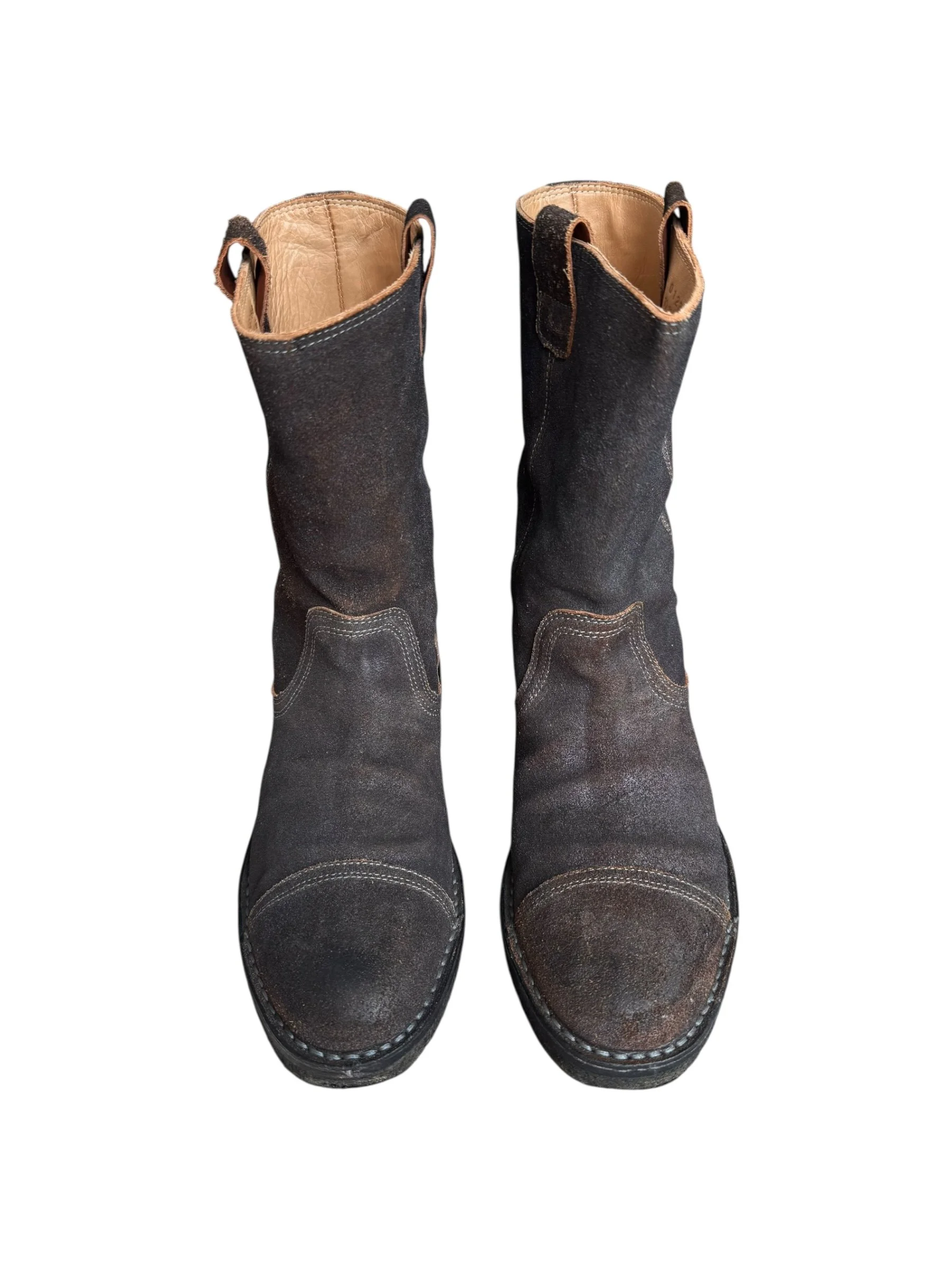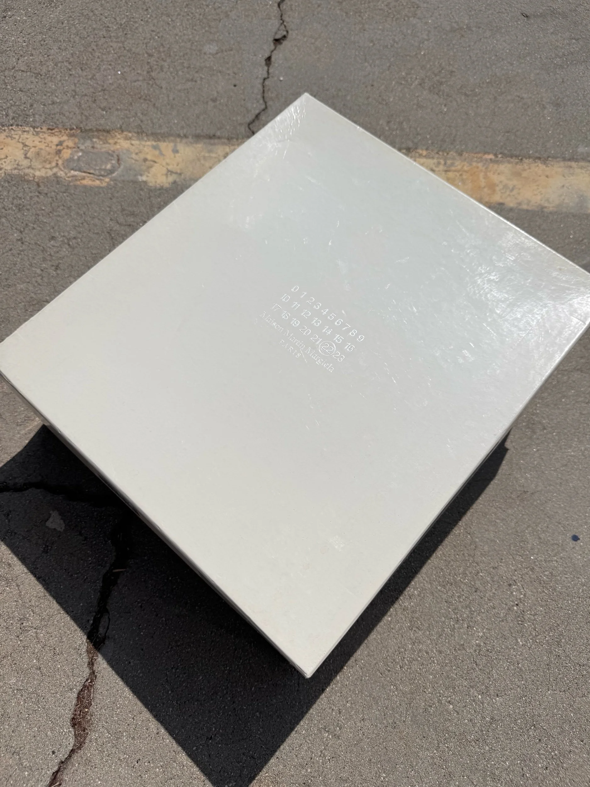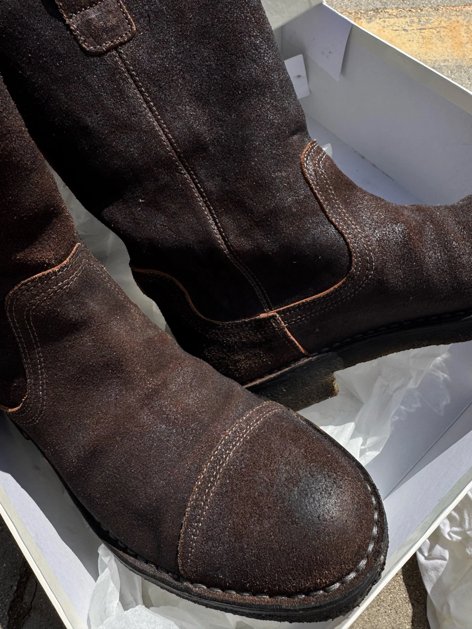 These gorgeous Maison Margiela boots feature a distinctive oil-spill effect, where the surface gradually reveals a subtle glossy underlayer as they age and wear. Crafted from rugged brown, they feature the signature white stitch detail on the rear and the branding embossed in the inner. In brilliant condition with no major flaws or damages. Comes with the original box from purchase