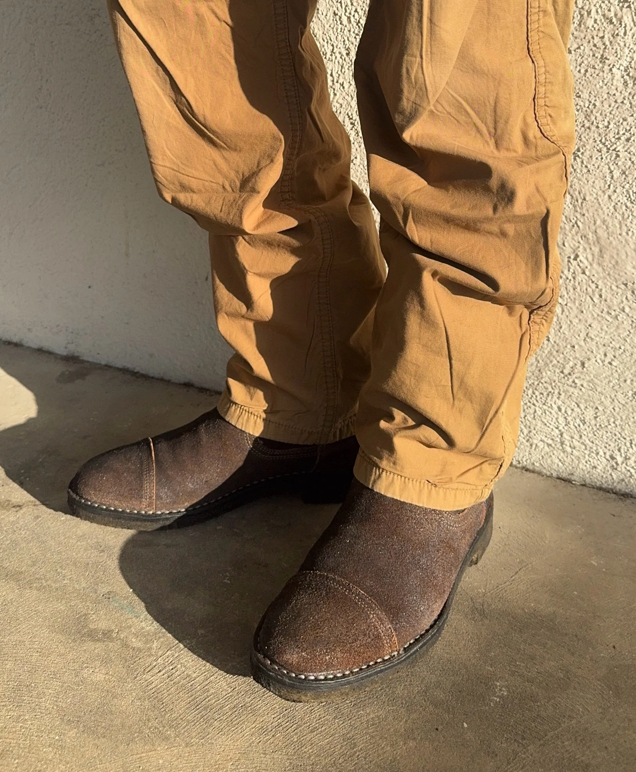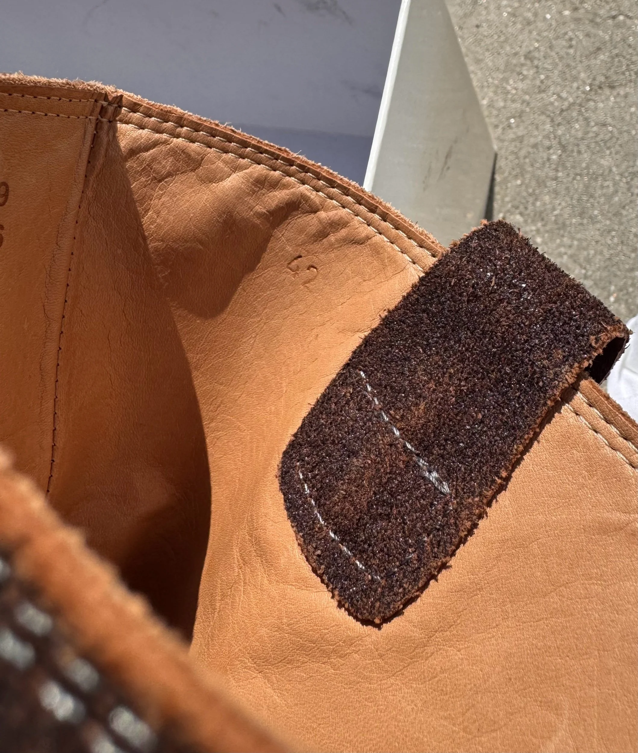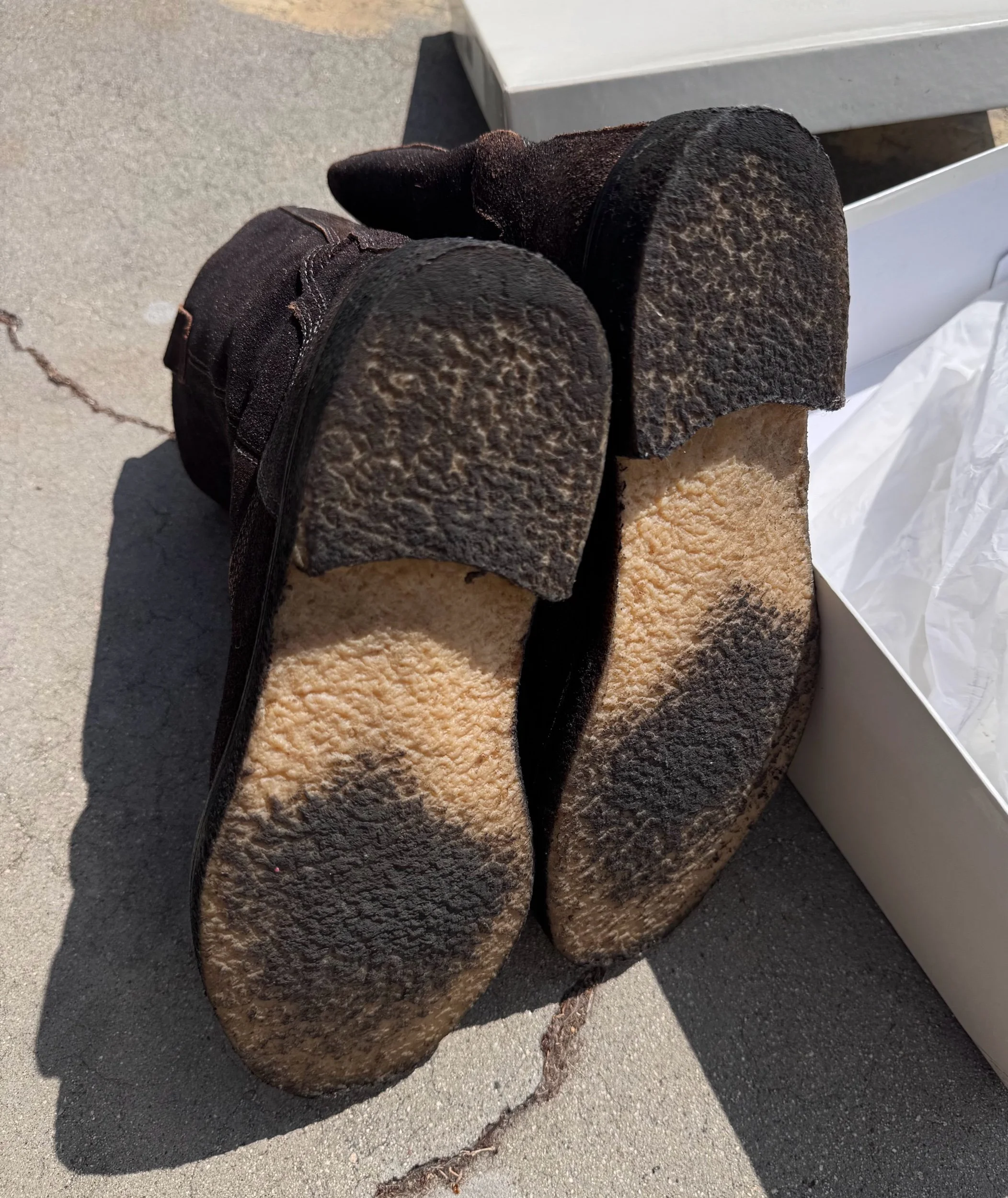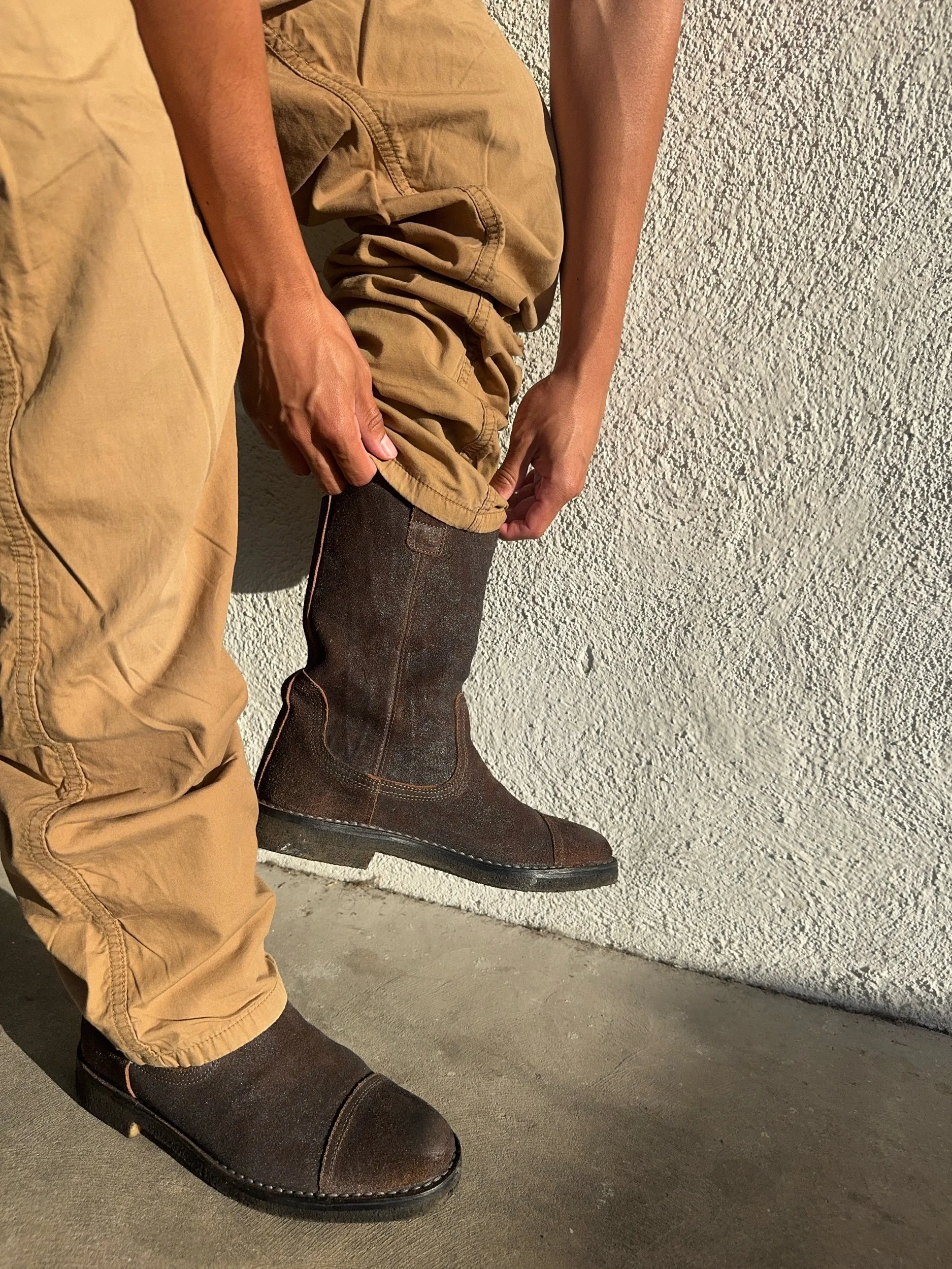 These gorgeous Maison Margiela boots feature a distinctive oil-spill effect, where the surface gradually reveals a subtle glossy underlayer as they age and wear. Crafted from rugged brown, they feature the signature white stitch detail on the rear and the branding embossed in the inner. In brilliant condition with no major flaws or damages. Comes with the original box from purchase