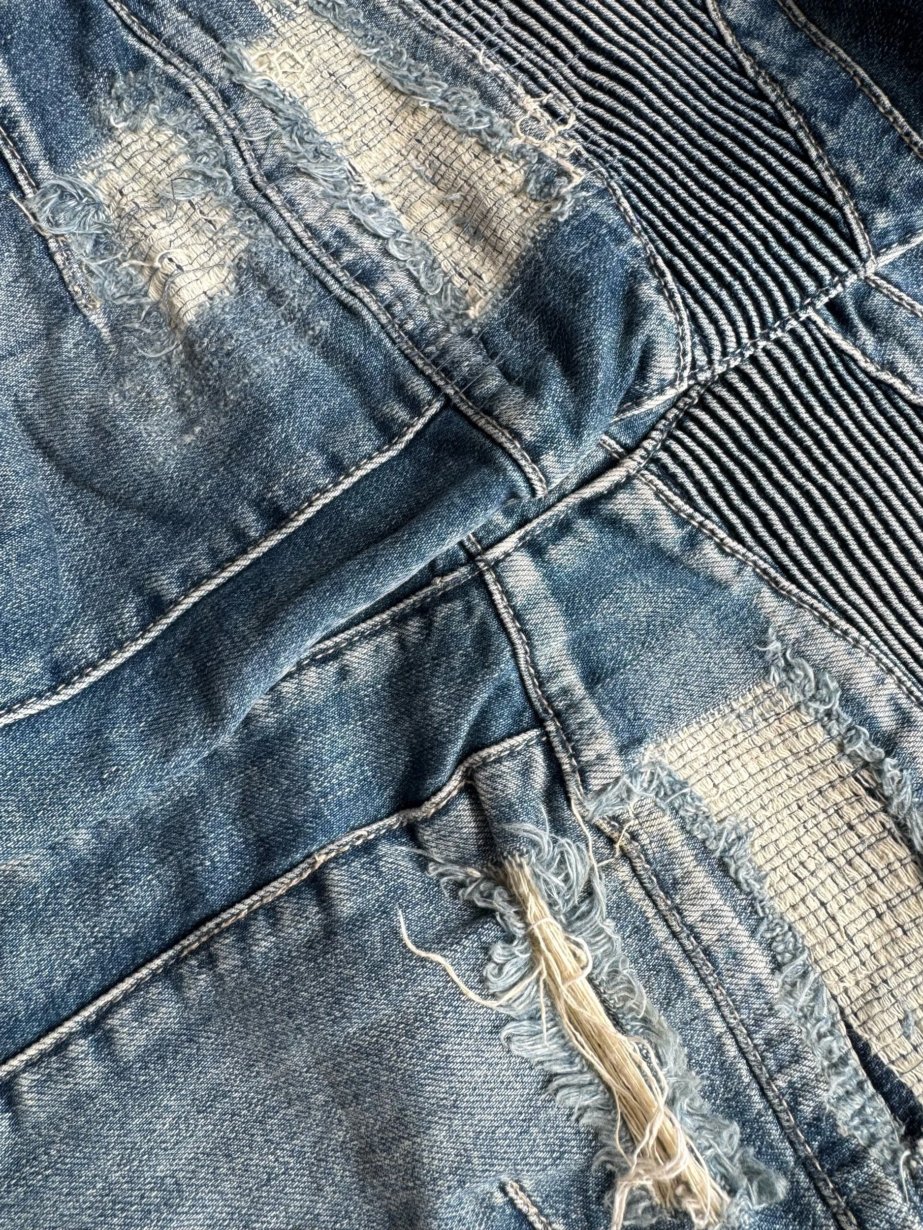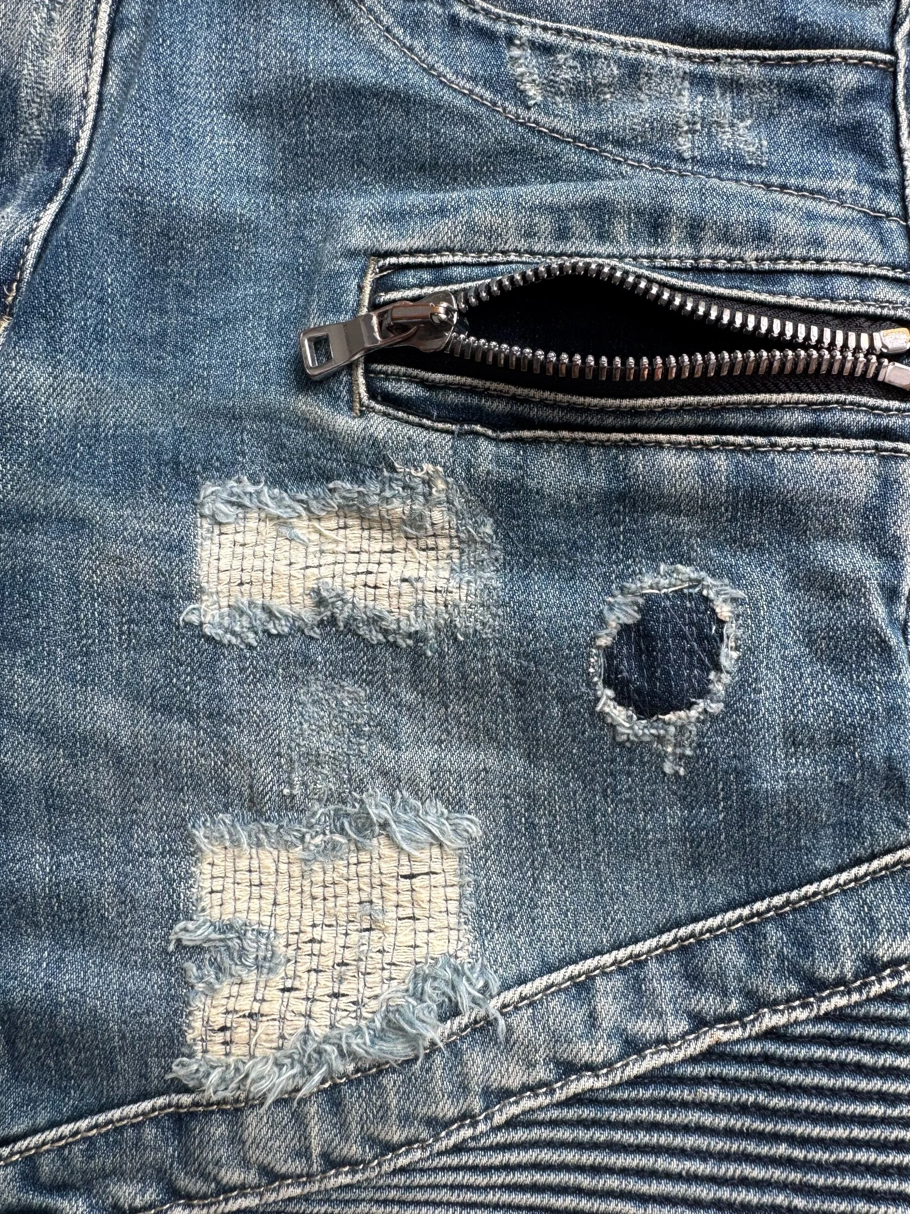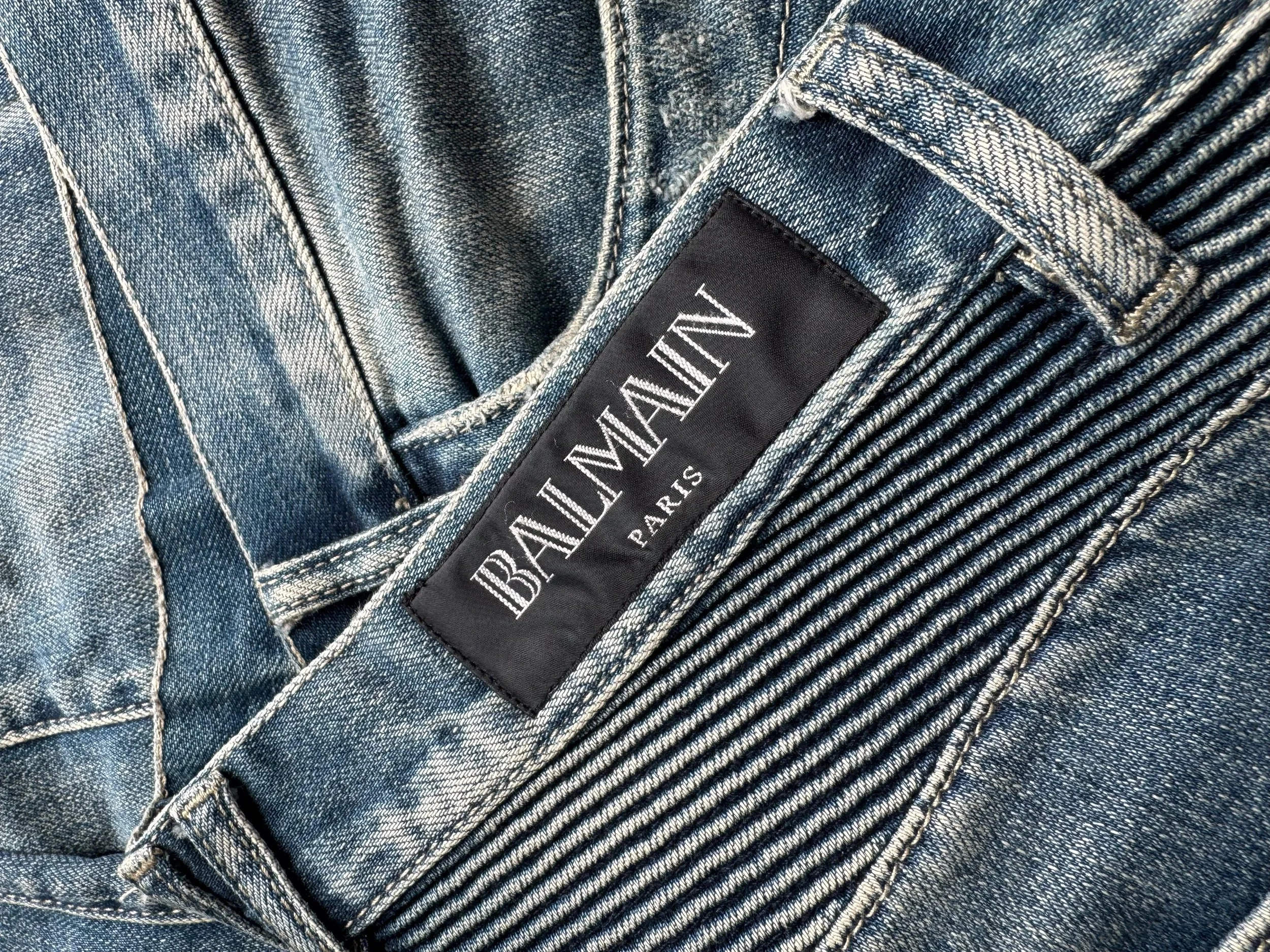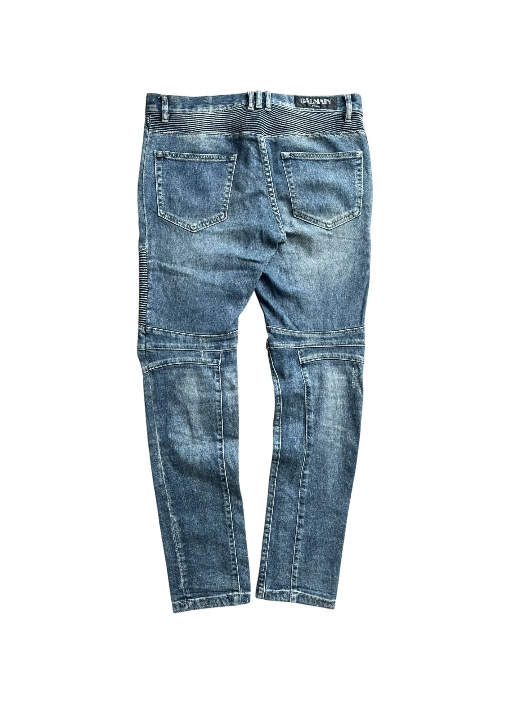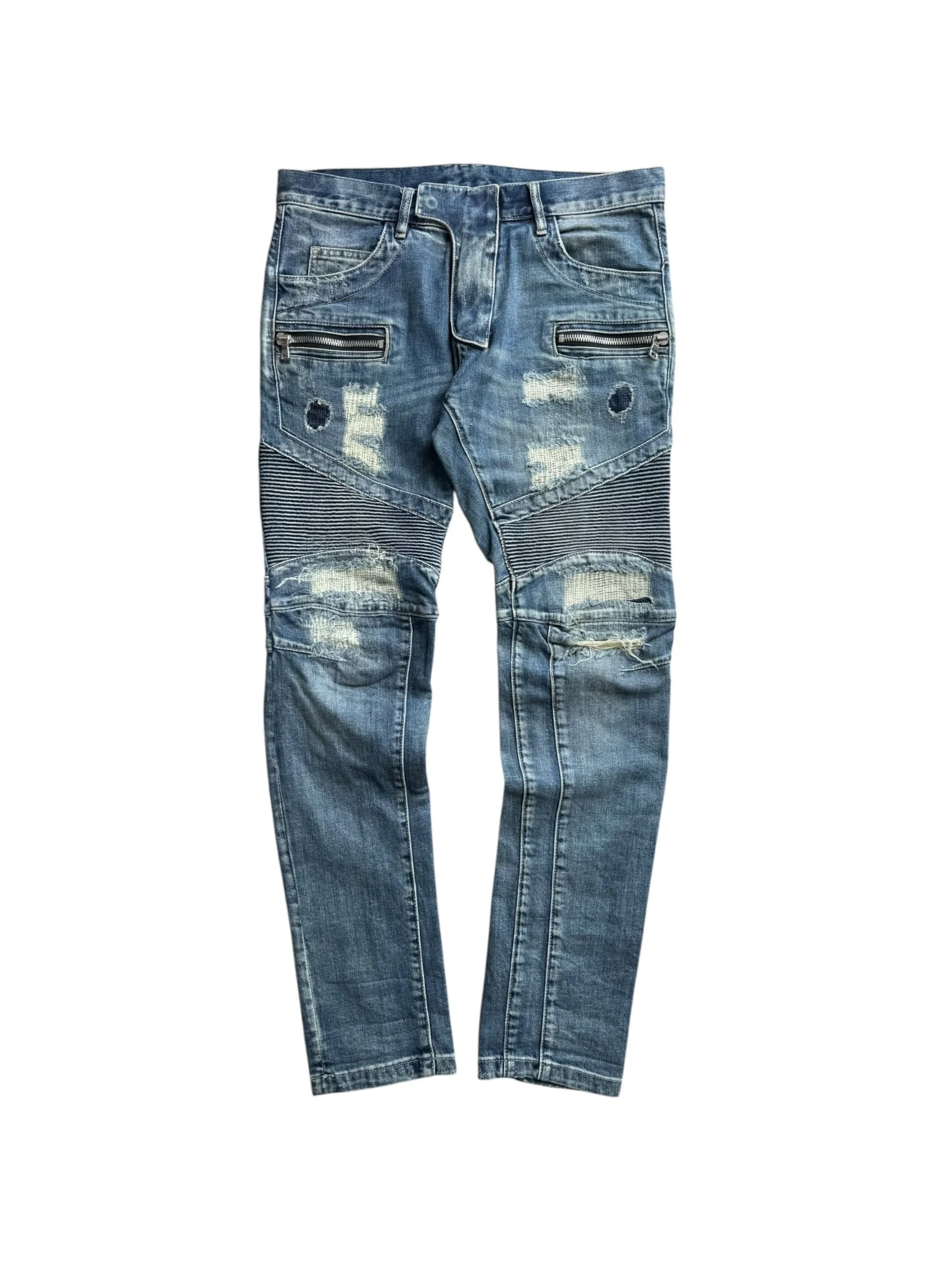 Balmain FW14 Faded Wash Distressed Biker Denim