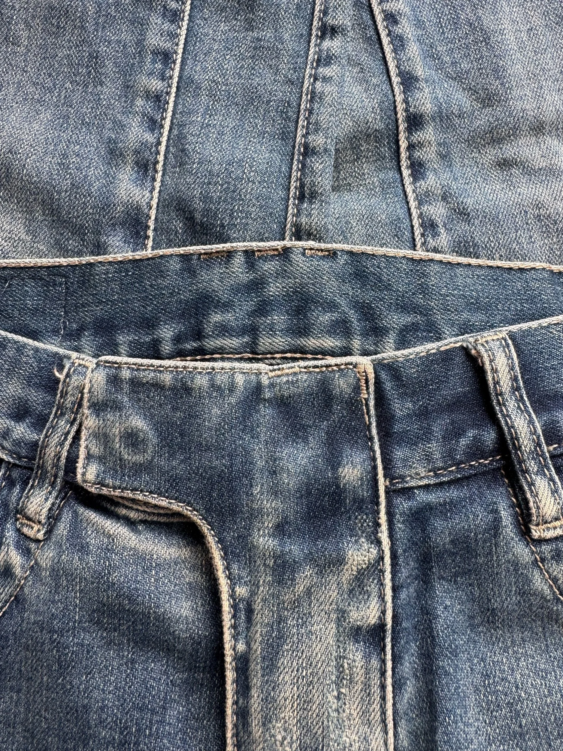 This gorgeous pair of Balmain biker denim was released in the Fall/Winter 2014 collection. Biker-style denim with the padded knee and ribbed panel design. Features two zipper pockets below the front pockets, concealed fly and button fastening. Factory processed distressing throughout with sashiko style repair work heavily throughout the knees and thighs. Classic triple belt loop on the backside. In fantastic condition with no major flaws or damages