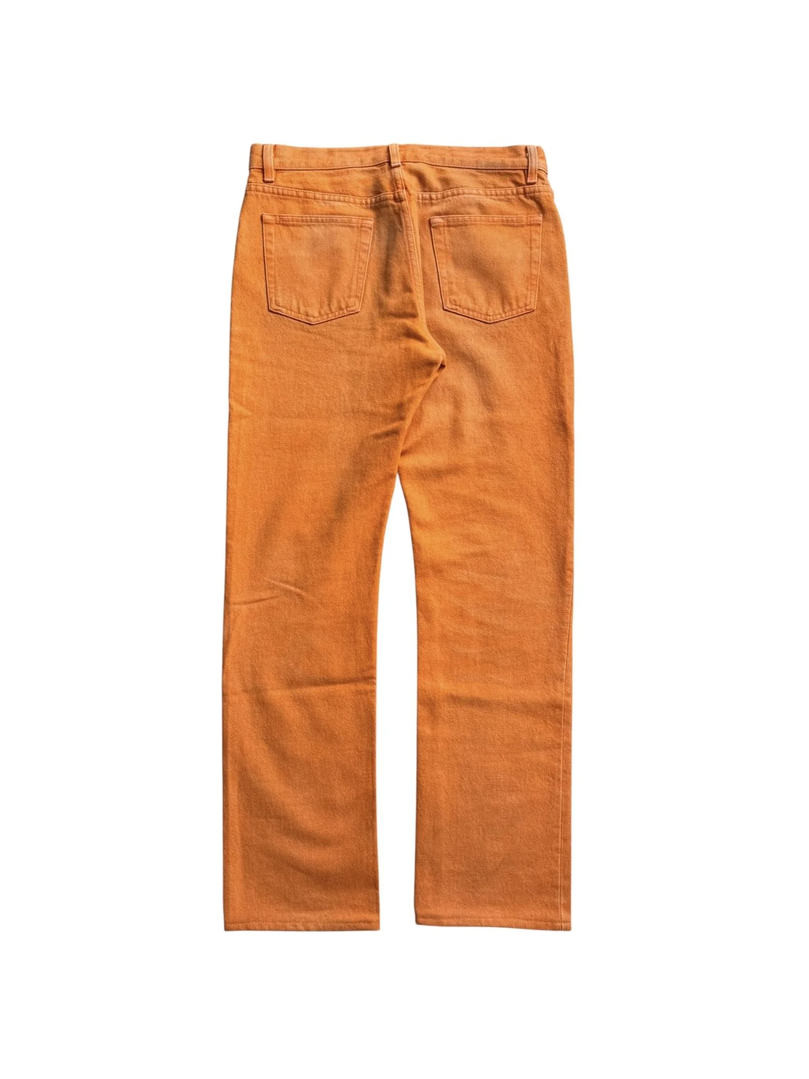 From the Spring/Summer 2000 collection, these gorgeous pair of orange Helmut Lang denim come in the ‘vintage sanded’ wash. Classic Italian cut silhouette, all hardware features branding embossed. In good condition with no flaws or damages, natural aging on denim