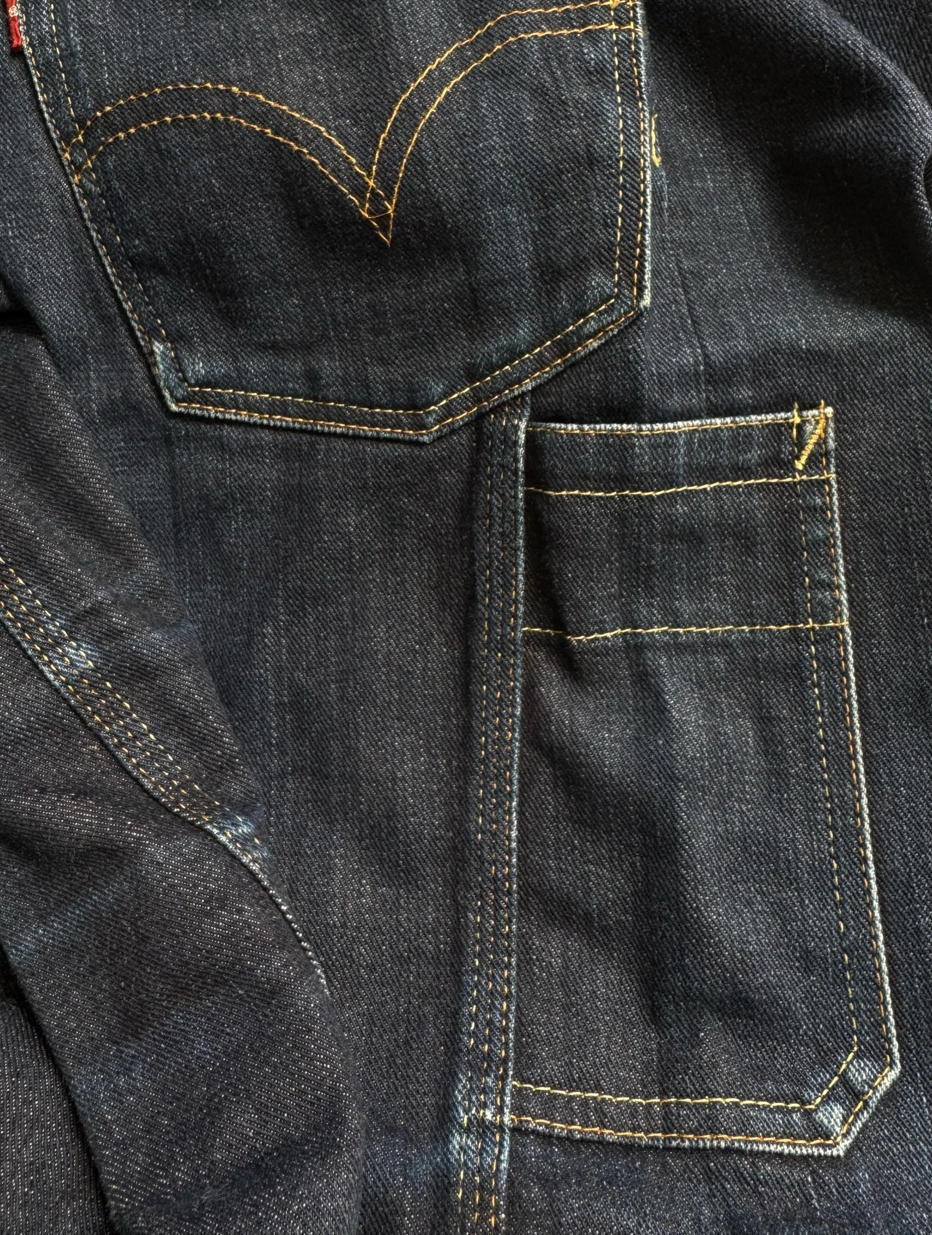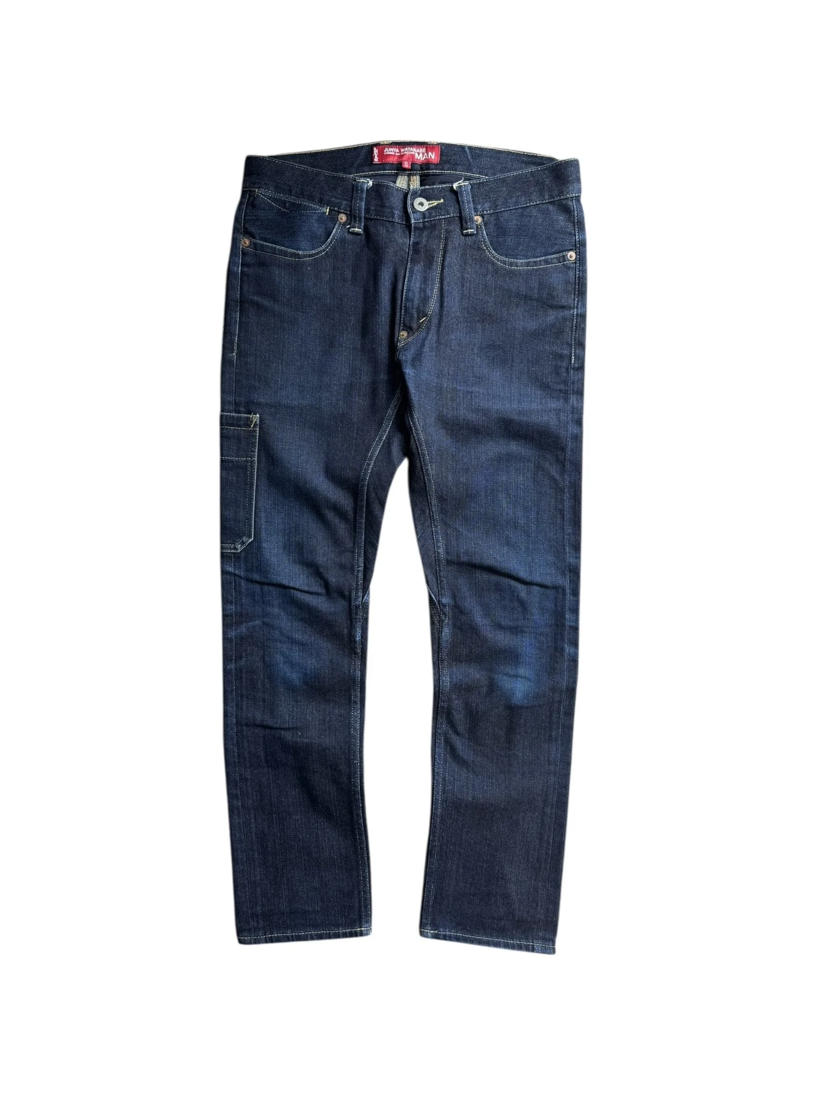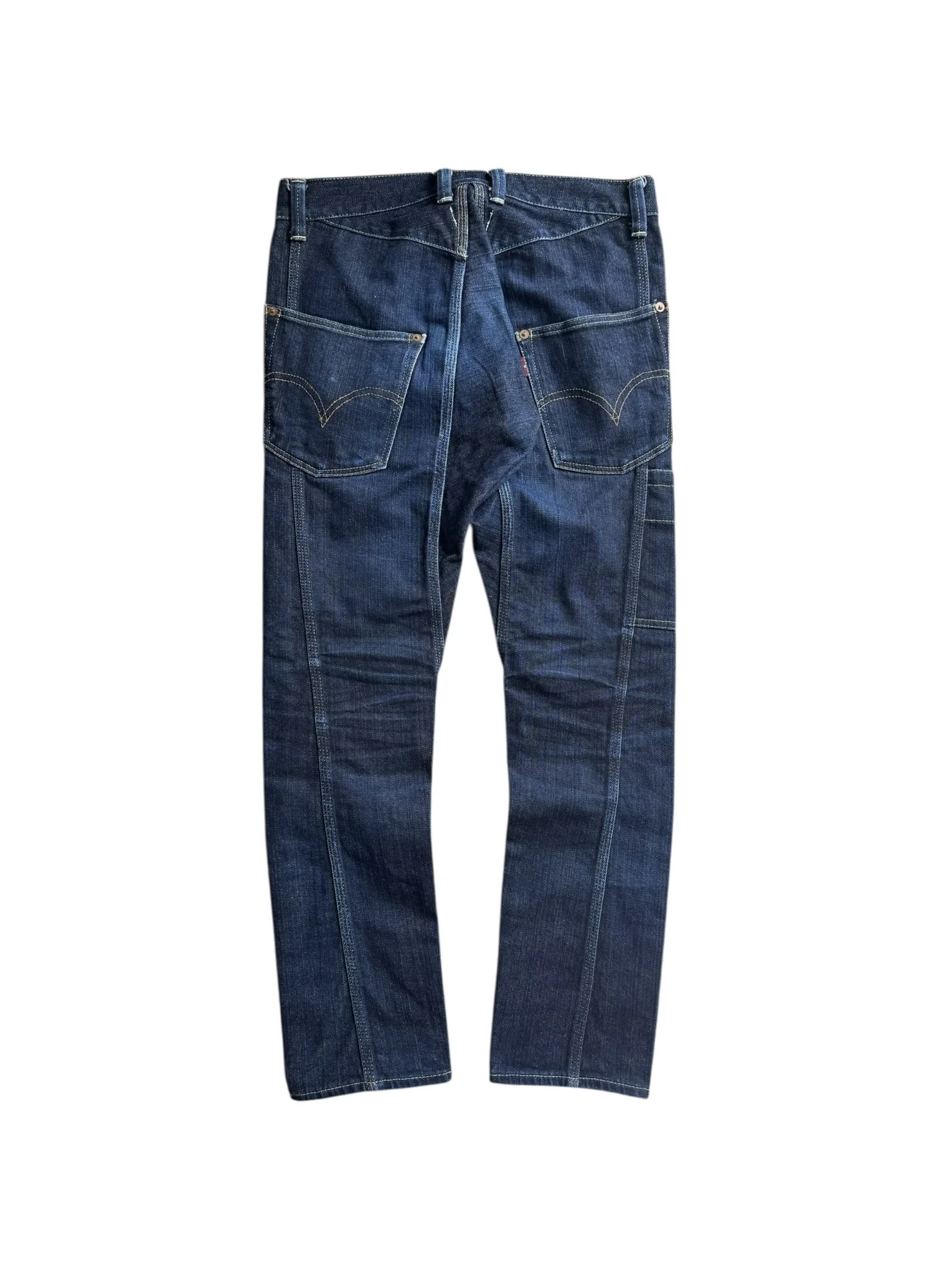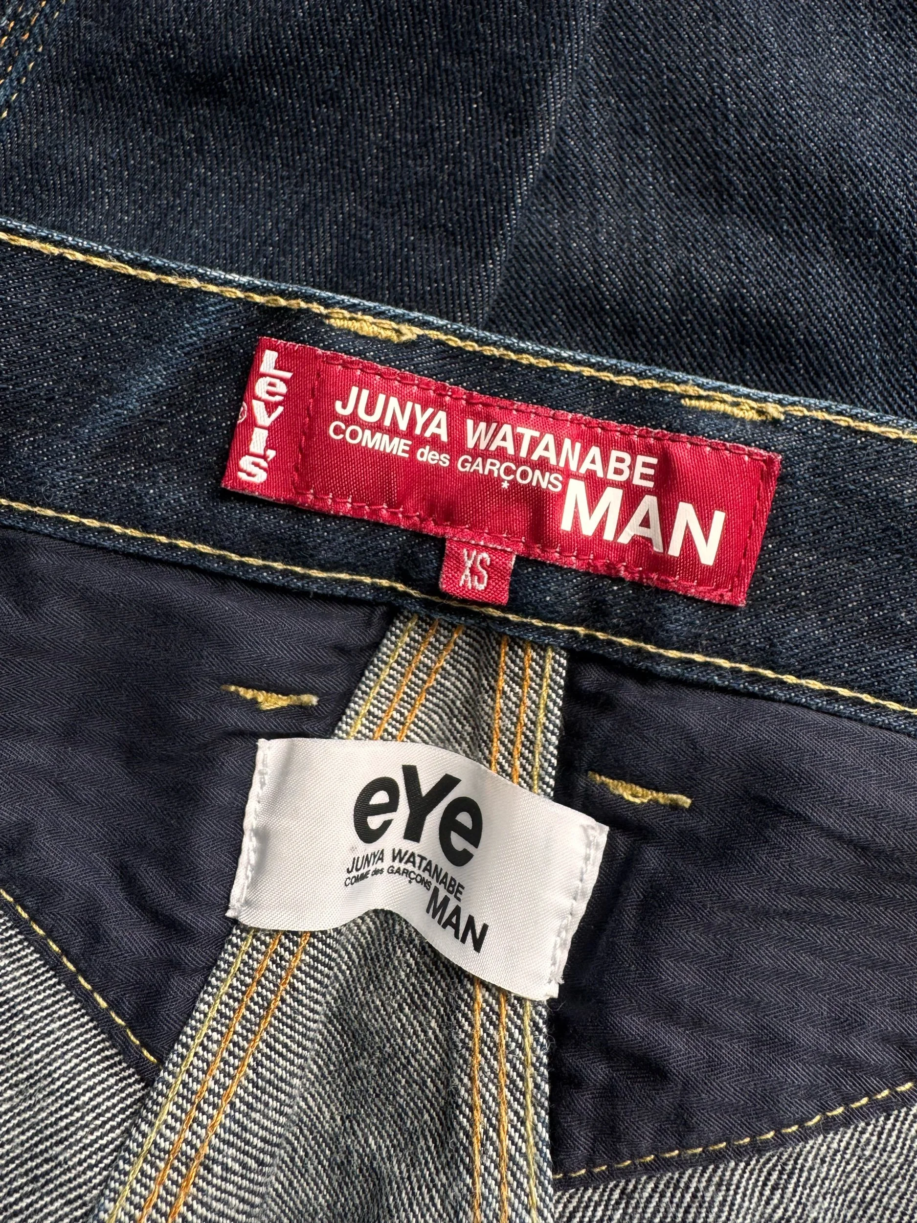Junya Watanabe eYe demin in collaboration with Levi’s released in Spring/Summer 2014. The backside of the denim features a panel construction with visible vertical seam lines running down both legs. Asymmetrical rear pockets. In good condition with no major flaws or damages