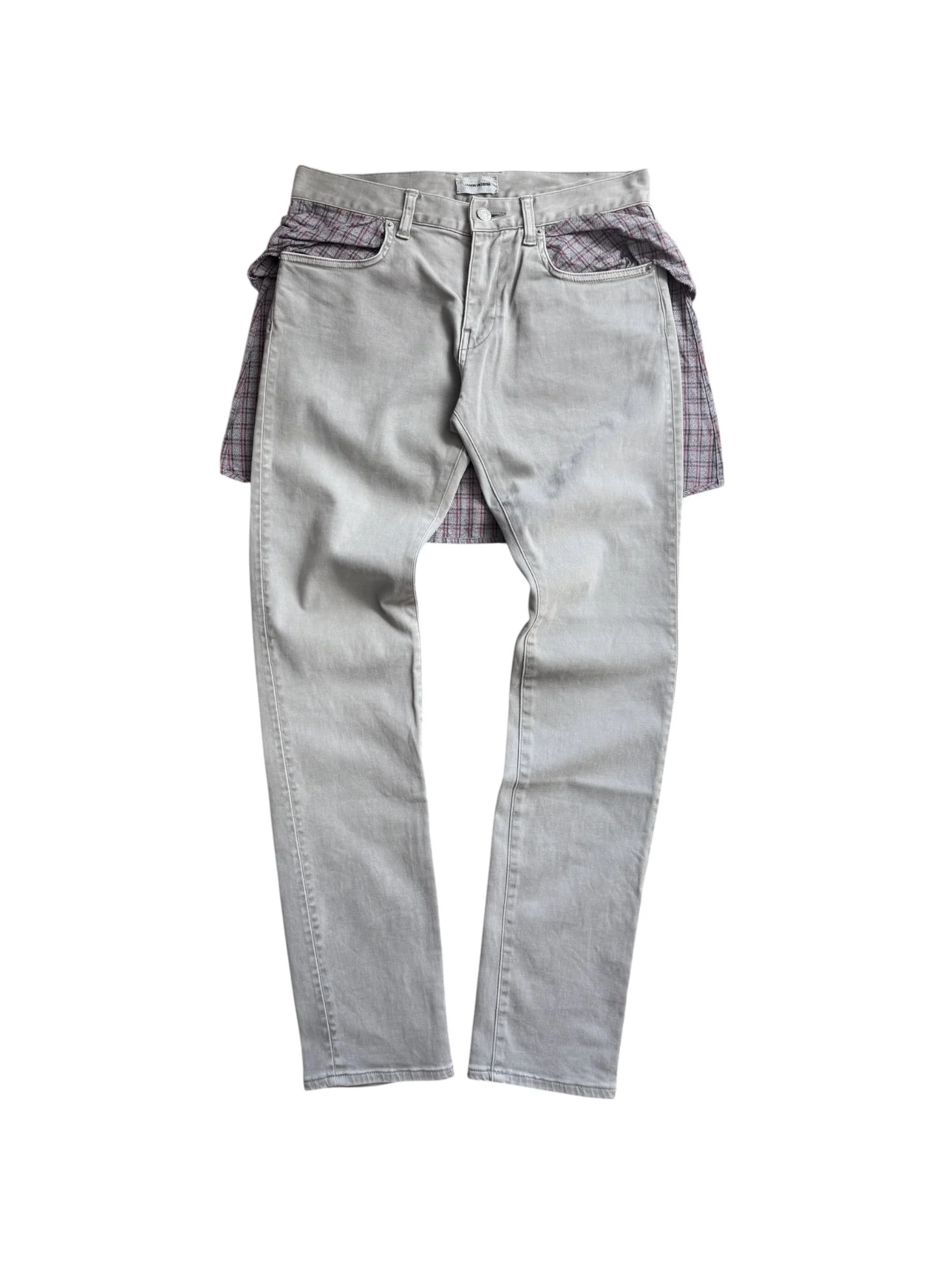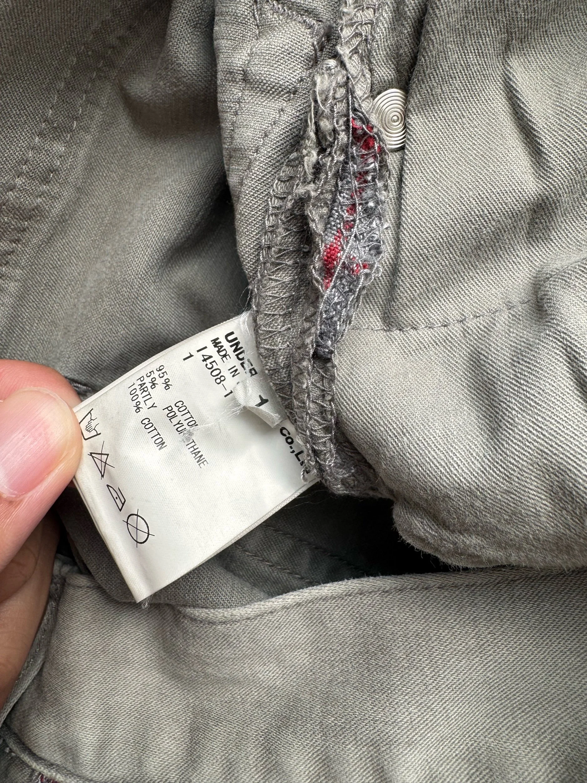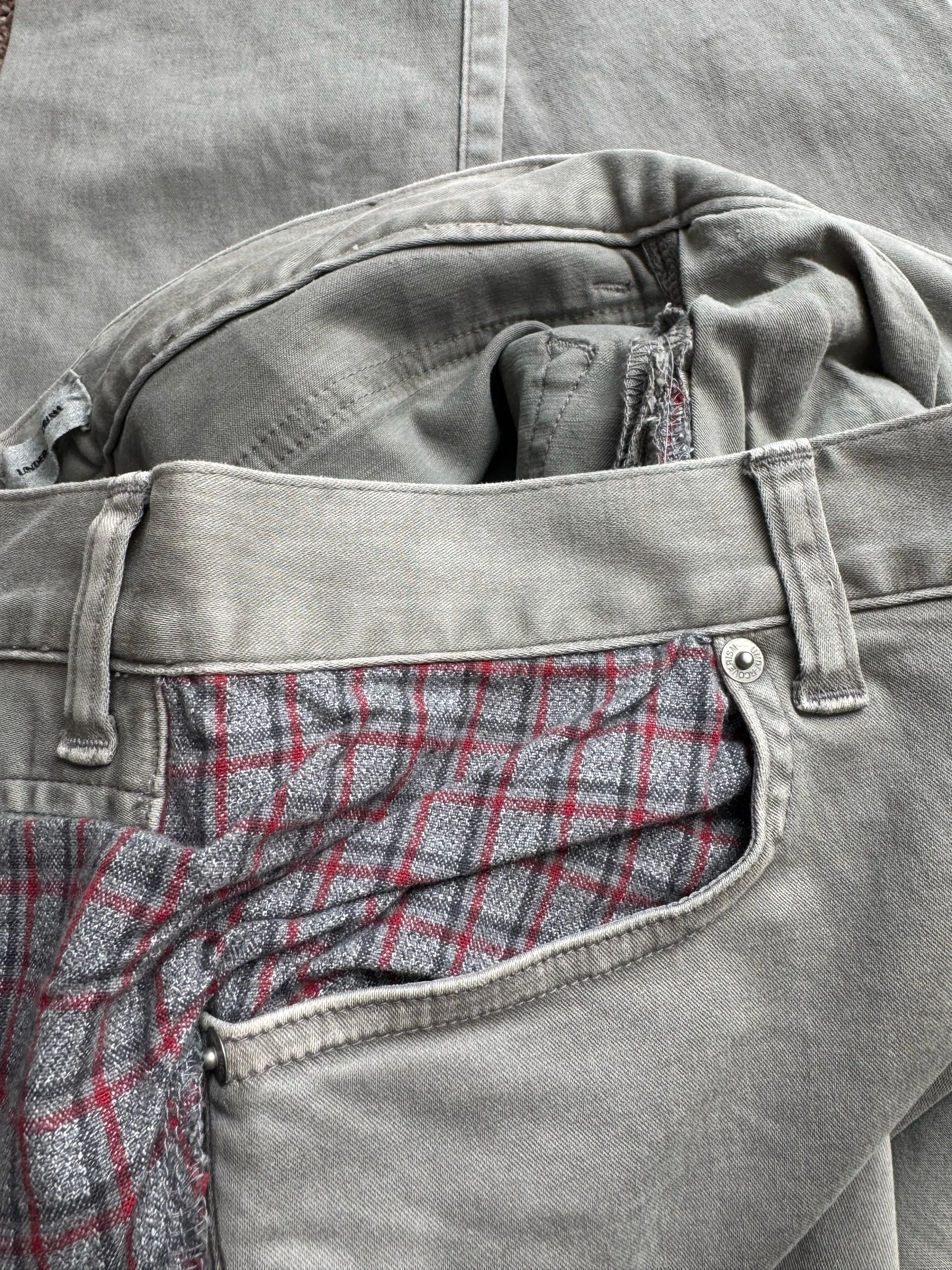 From Spring/Summer 2012 “Open Strings”, these light grey lightweight denim has a unique construction with a two-piece flannel cut sewn onto the rear of the denim. In good condition with no flaws or damages