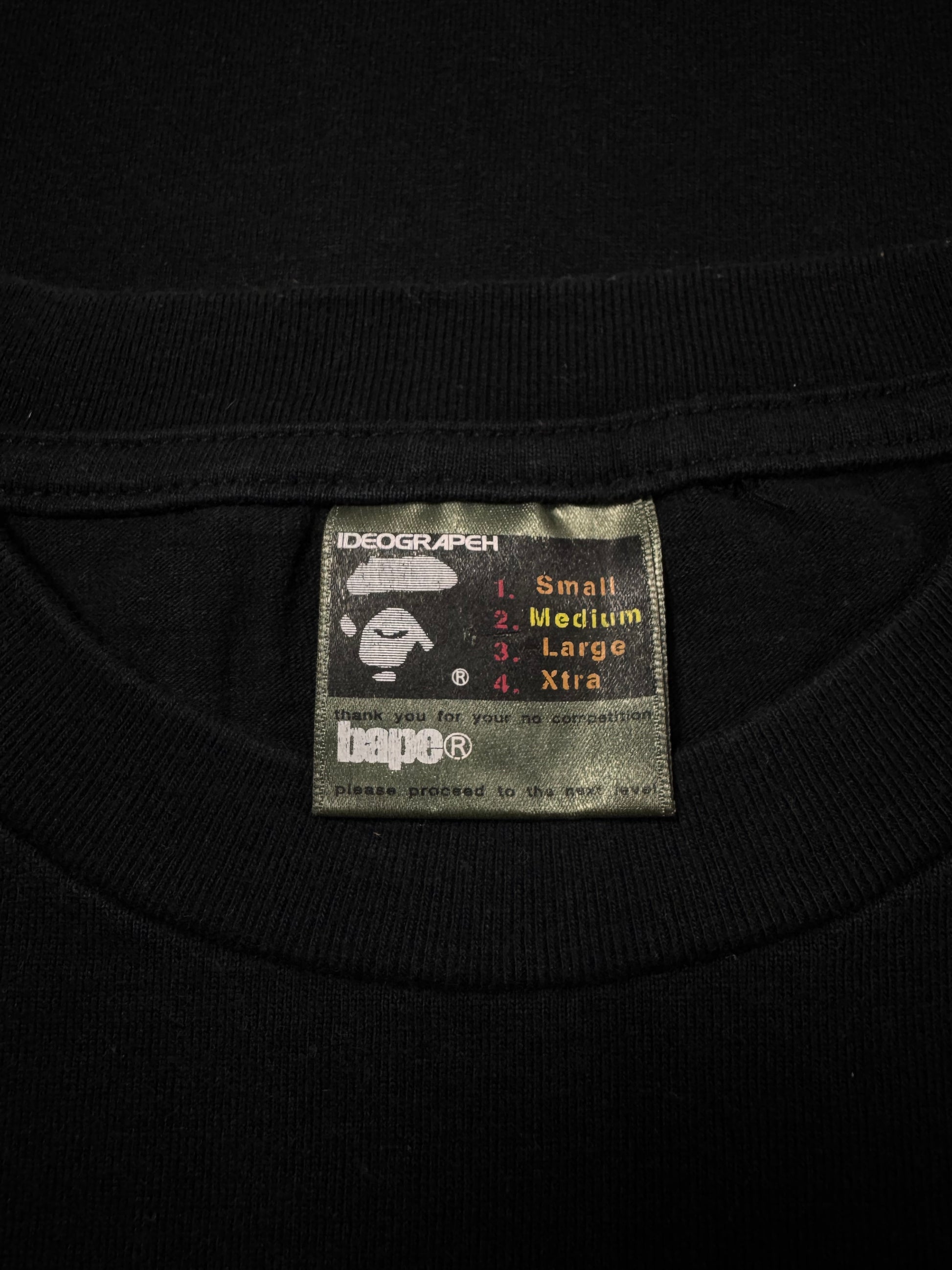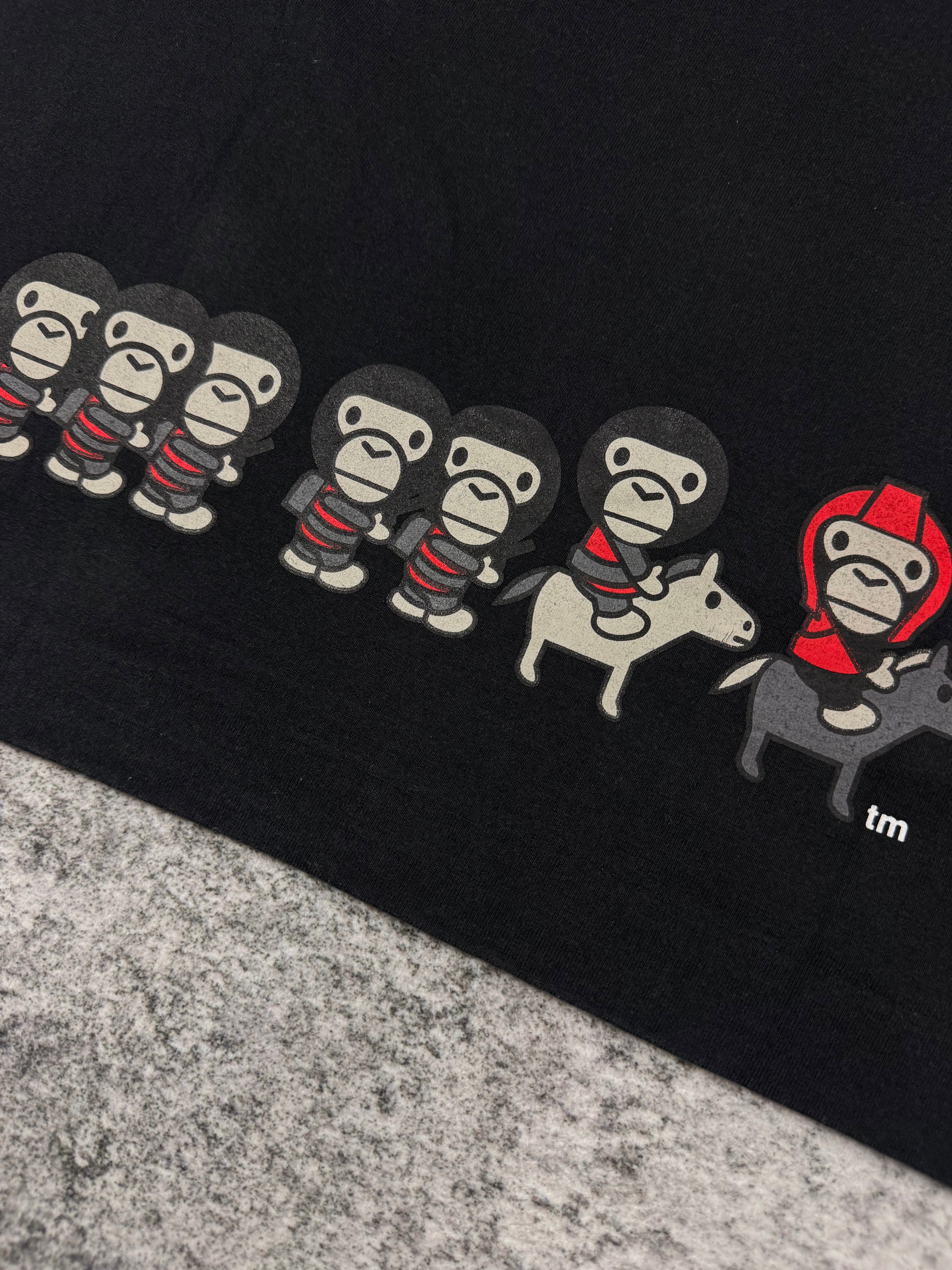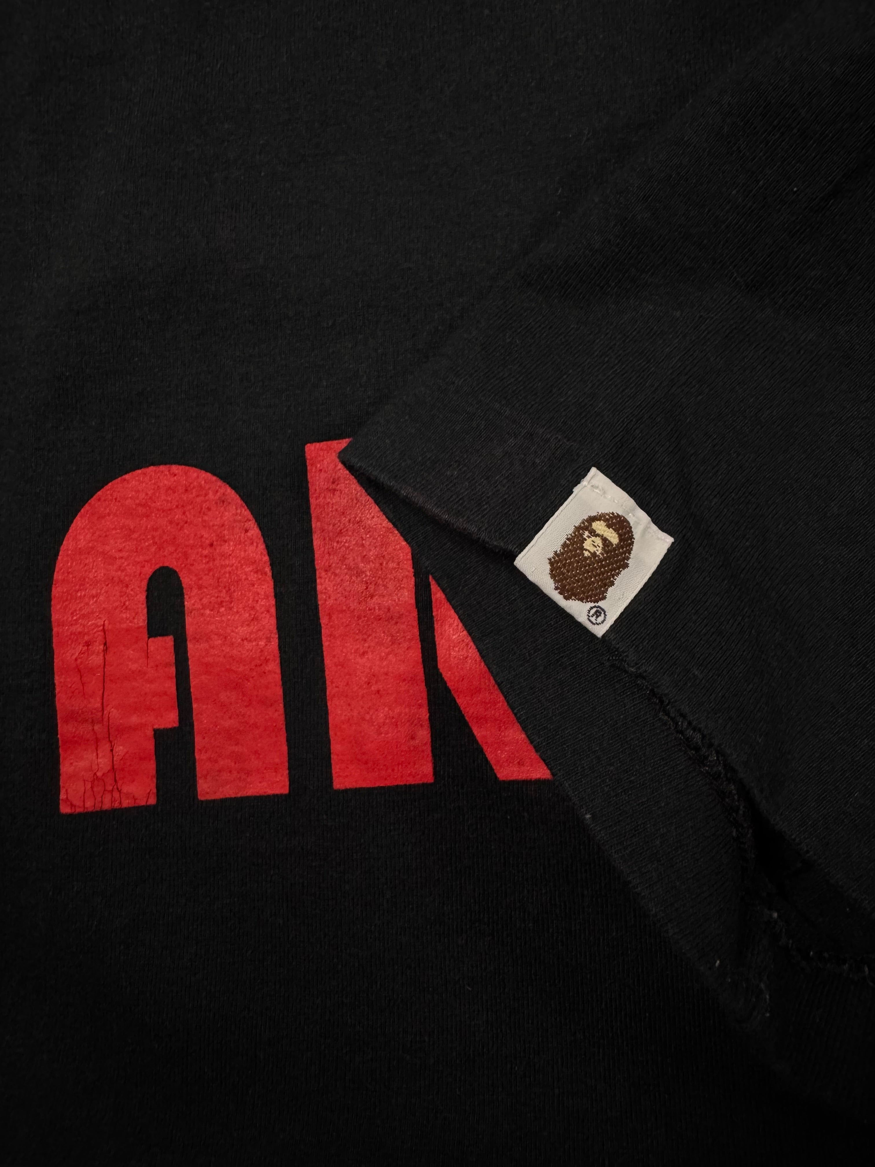 Early-2000s Bape t shirt produced in Japan during the brand’s Nigo golden era. The front features bold red “ARMY” typography, while the back showcases the iconic “Ape Shall Never Kill Ape” Baby Milo graphic sequence near the hem. In solid condtion for its age with some natural discoloration