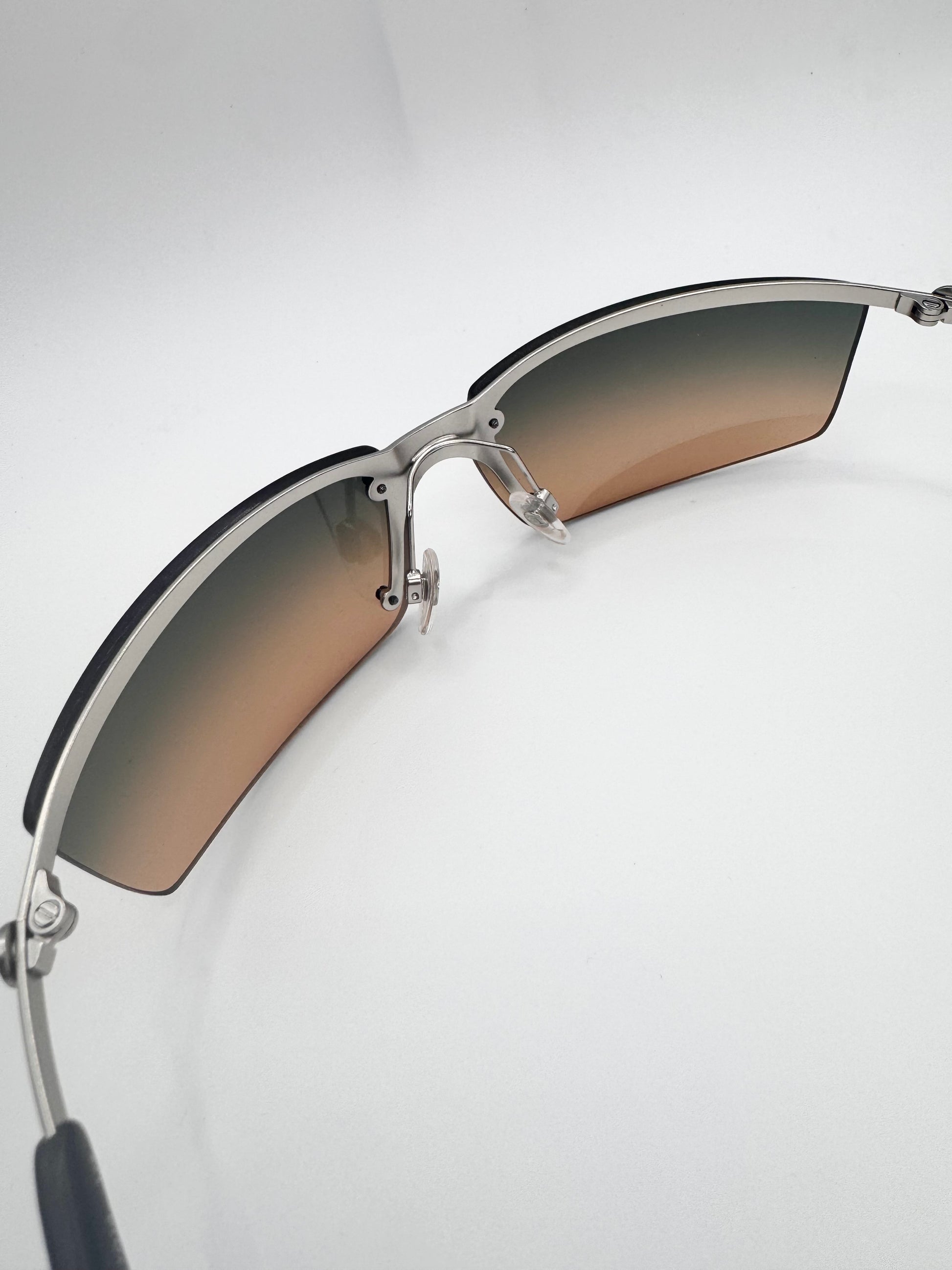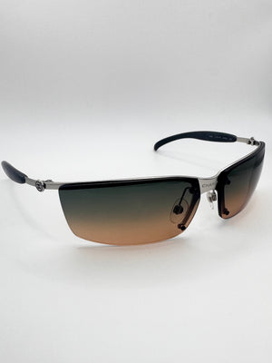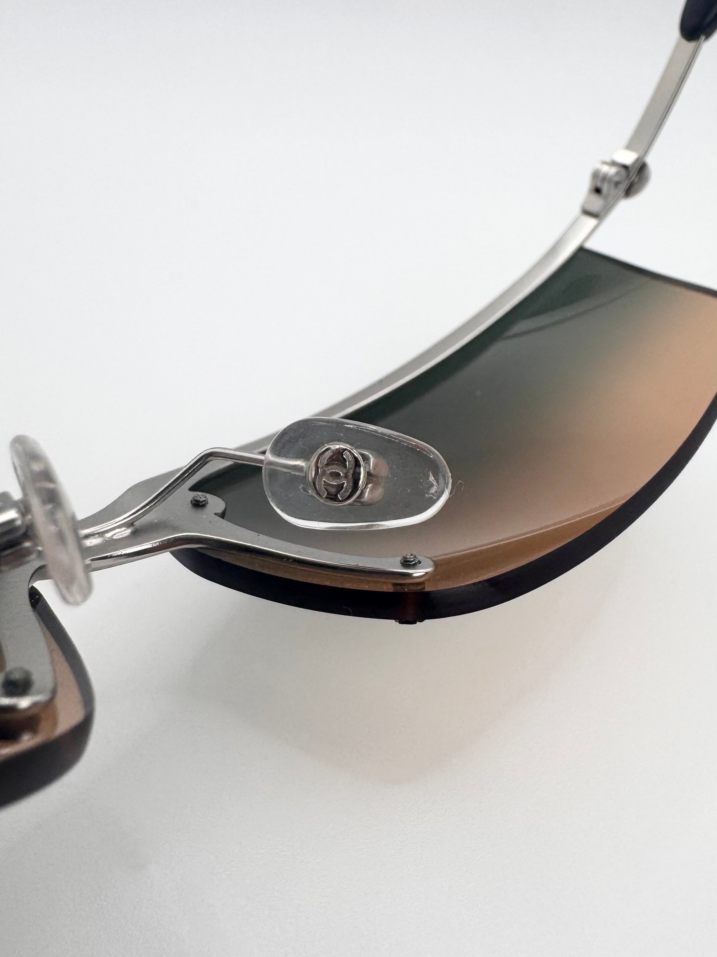 Sleek early-2000s Chanel ‘4008’ rimless shield sunglasses featuring a curved silver-tone metal bridge and minimalist wrap silhouette. Finished with subtle ‘CC’ logo hardware at the temples, a signature design detail from Chanel eyewear of the era. Nany-to-orange gradient lenses and Chanel branding at the bridge as well. In amazing condition with no flaws or damages
