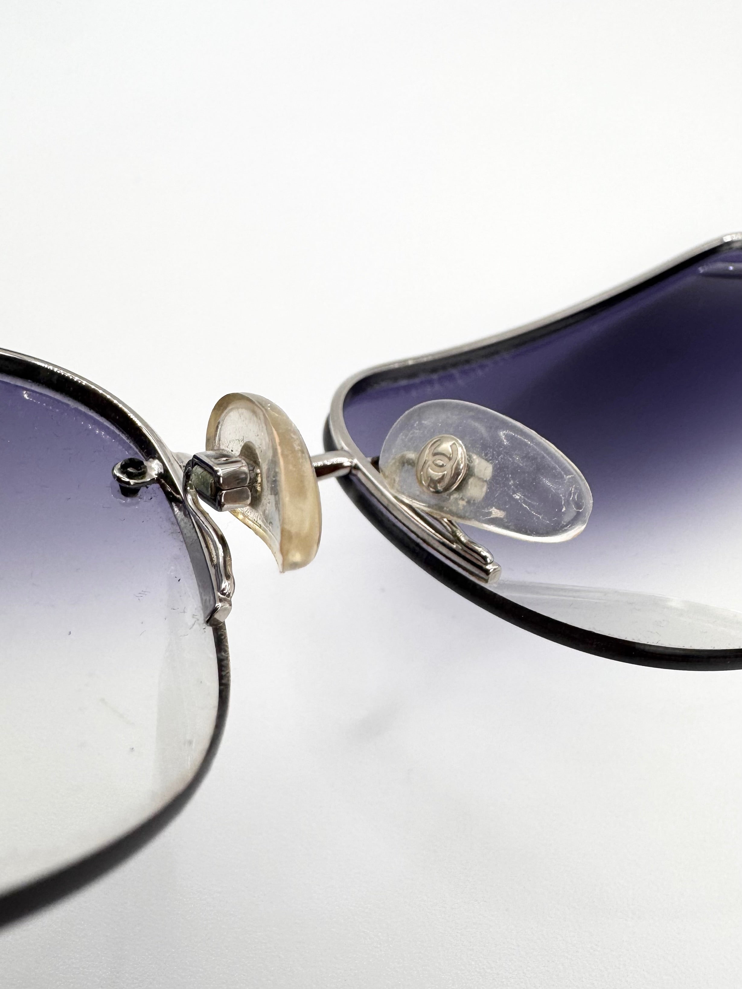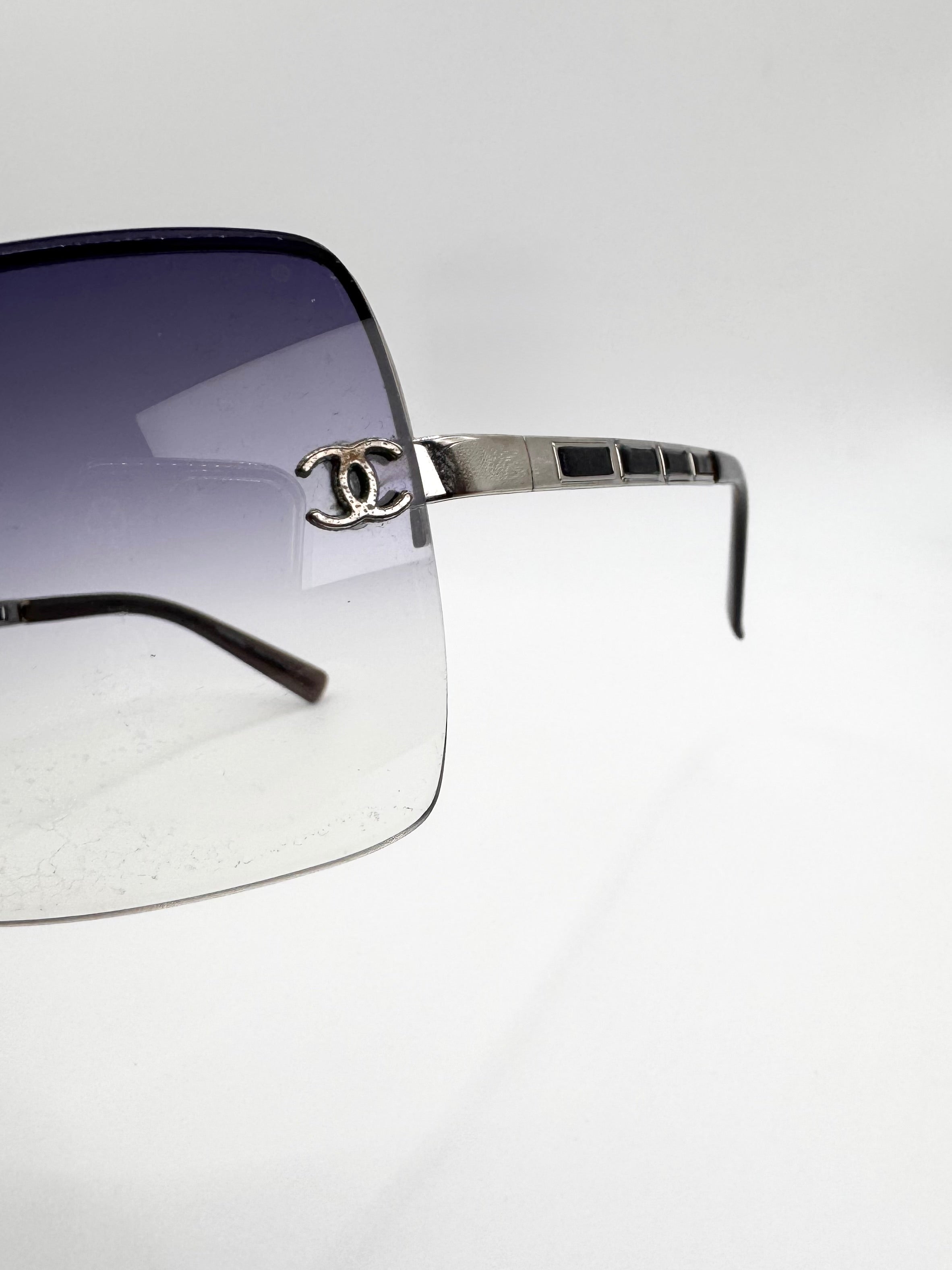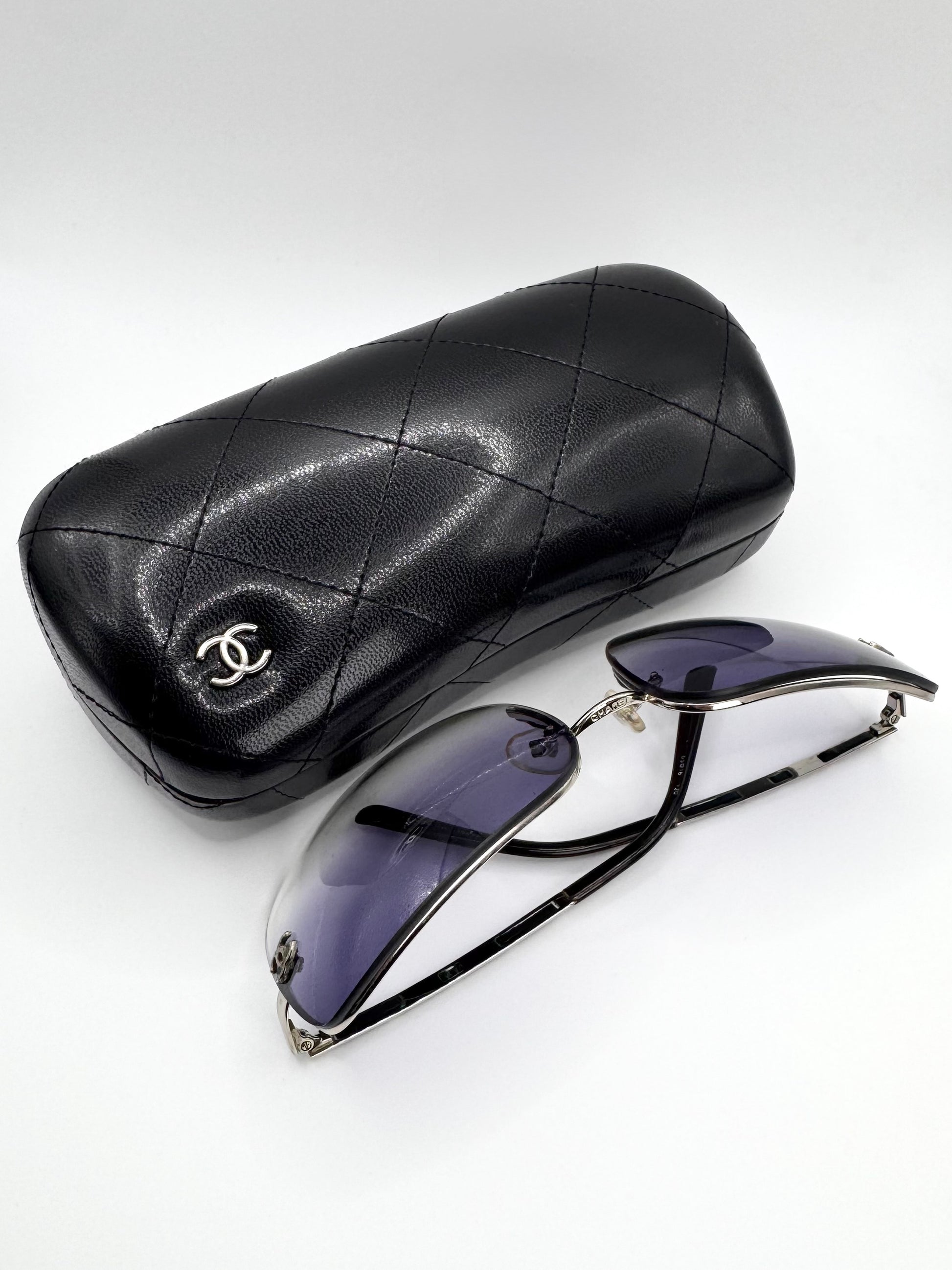 Iconic late 2000s Chanel ‘4112’ sunglasses featuring distinctive leather cutout detailing along the temples, a rare design element from the brand’s early-2000s era. Rimless rectangular frame with a navy/purple gradient tint lenses adorned with the signature ‘CC’ logo. In solid condition with slight scratches on lens — comes with the original quilted leather case