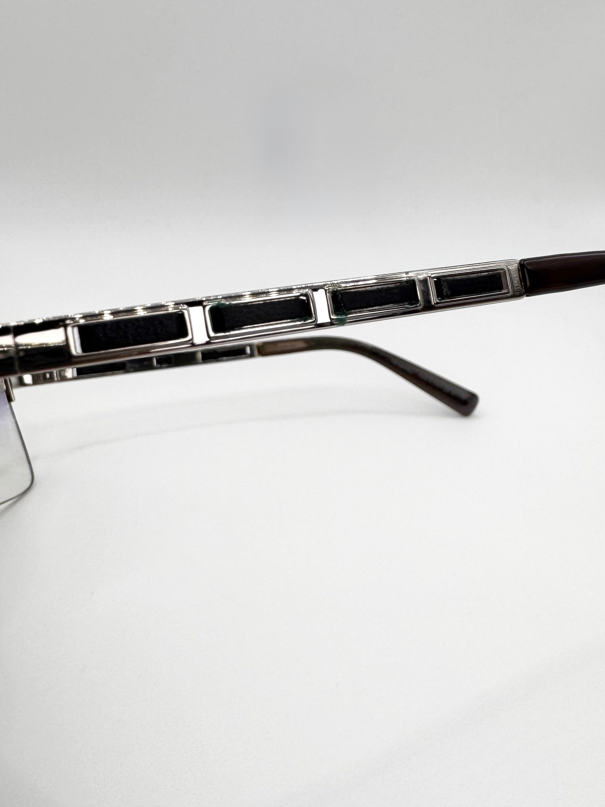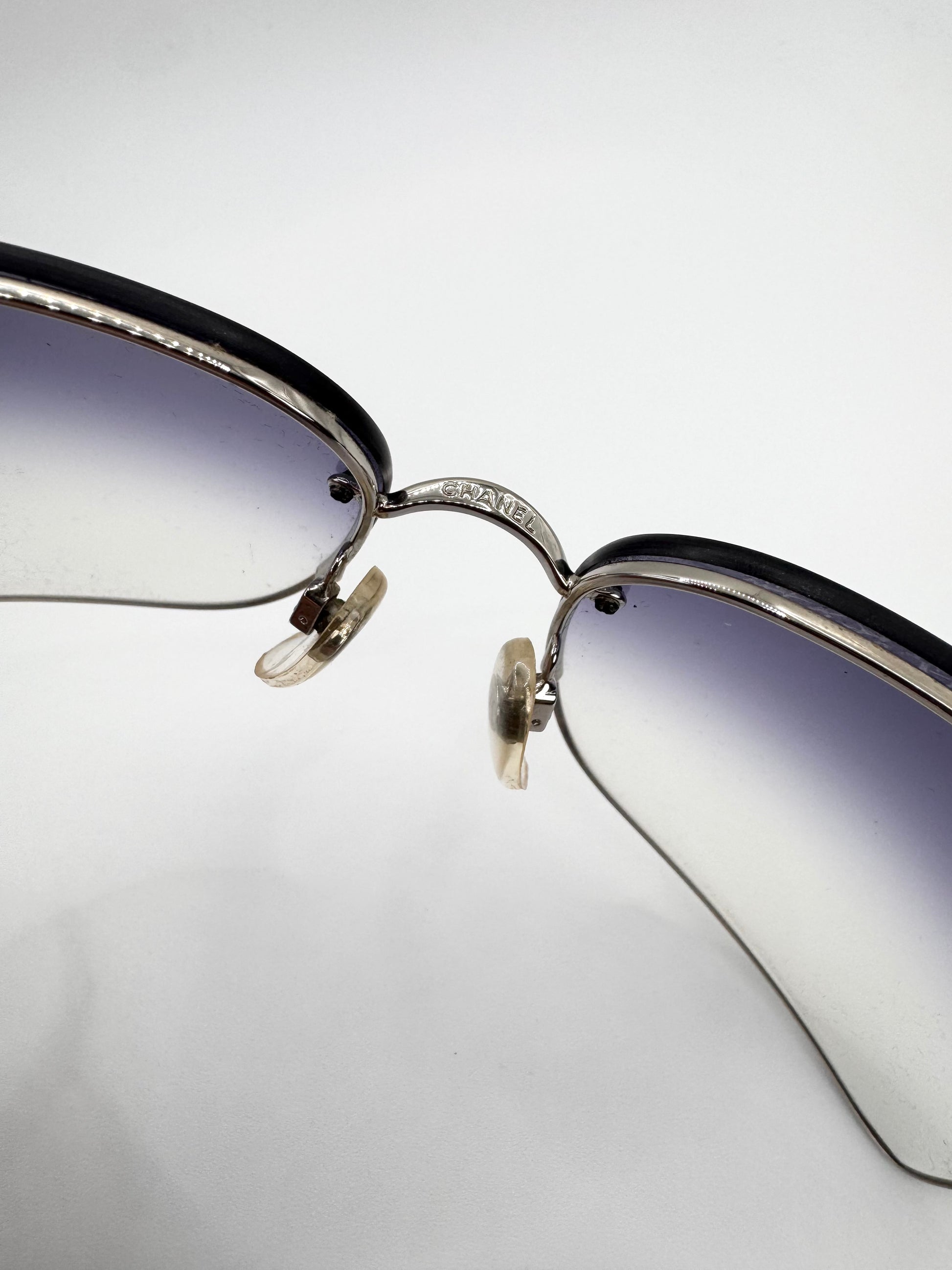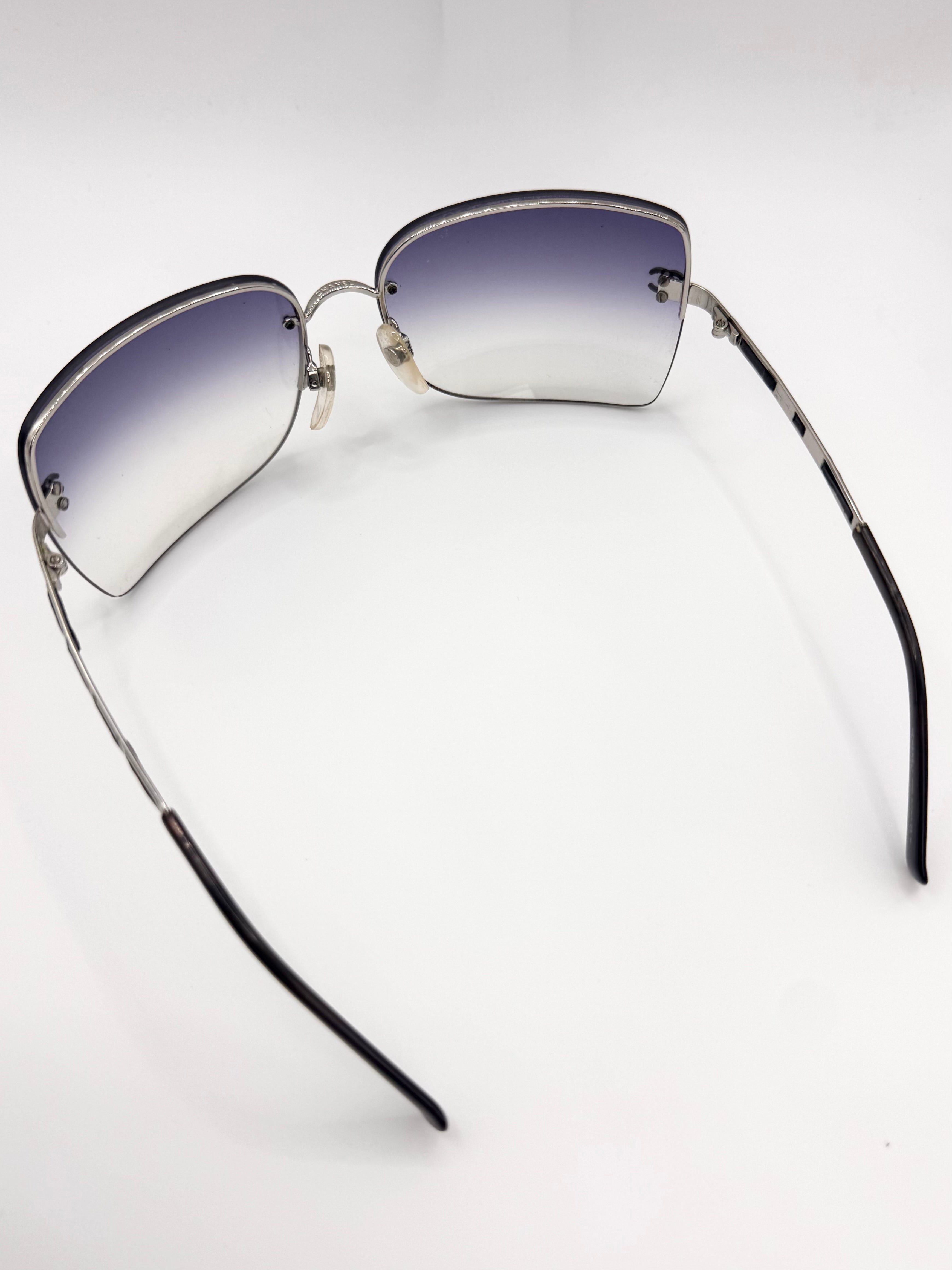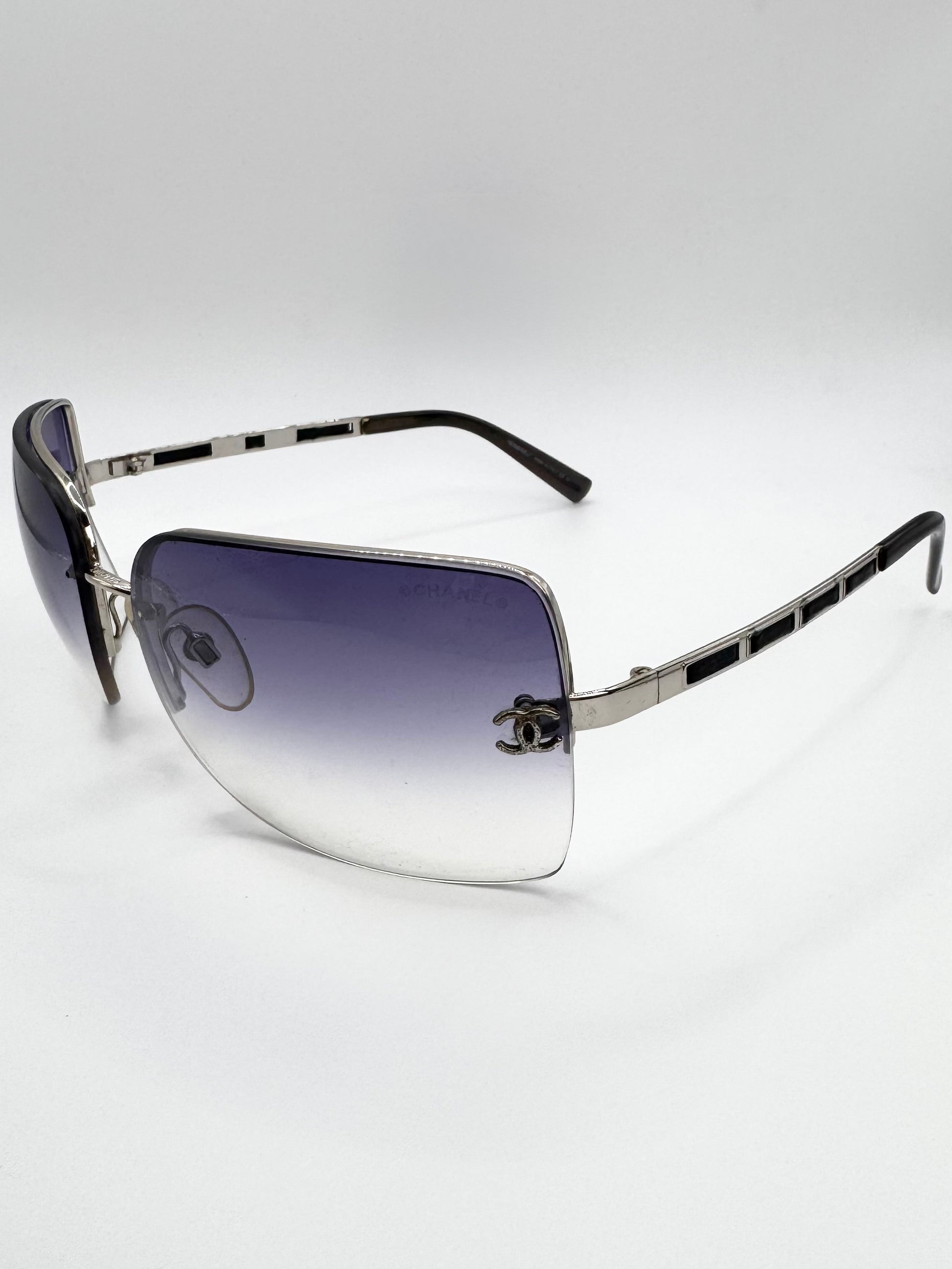 Iconic late 2000s Chanel ‘4112’ sunglasses featuring distinctive leather cutout detailing along the temples, a rare design element from the brand’s early-2000s era. Rimless rectangular frame with a navy/purple gradient tint lenses adorned with the signature ‘CC’ logo. In solid condition with slight scratches on lens — comes with the original quilted leather case