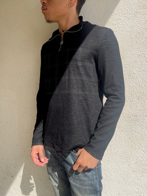 Gorgeous early 2000s Chanel Sport half-zip pullover crafted in France designed during the Karl Lagerfeld era — features signature CC square logo hardware on both the main zip and sleeve zip. The textured wool-cotton knit is complemented by a structured grid-stitched chest panel. Finished with a soft interior lining and subtle CC embroidery on the ribcage. Maintains good condition, some minor flaws on sleeve end and the rear; very good quality for age