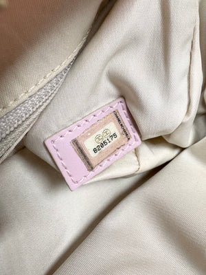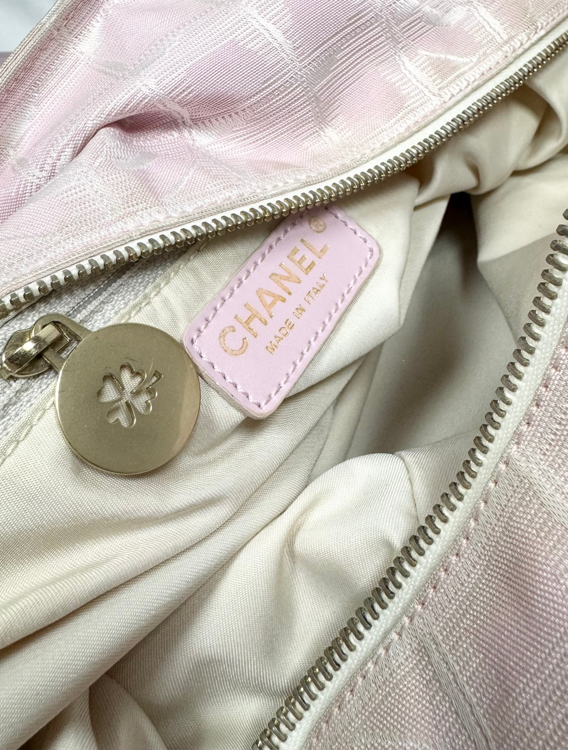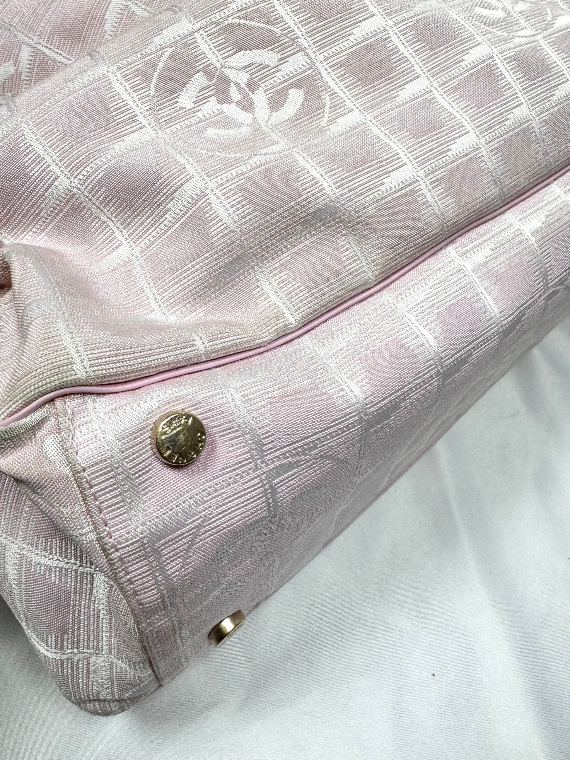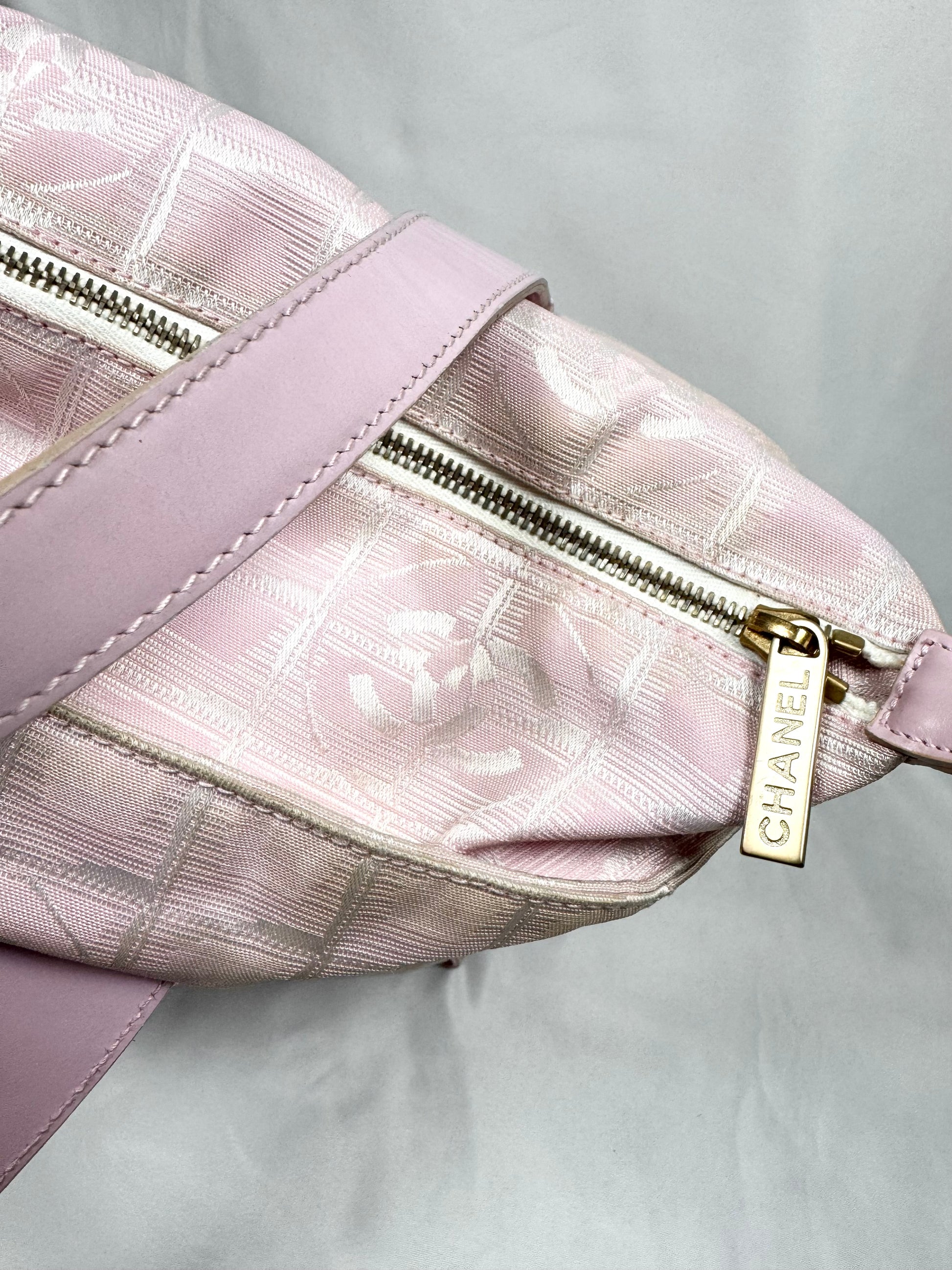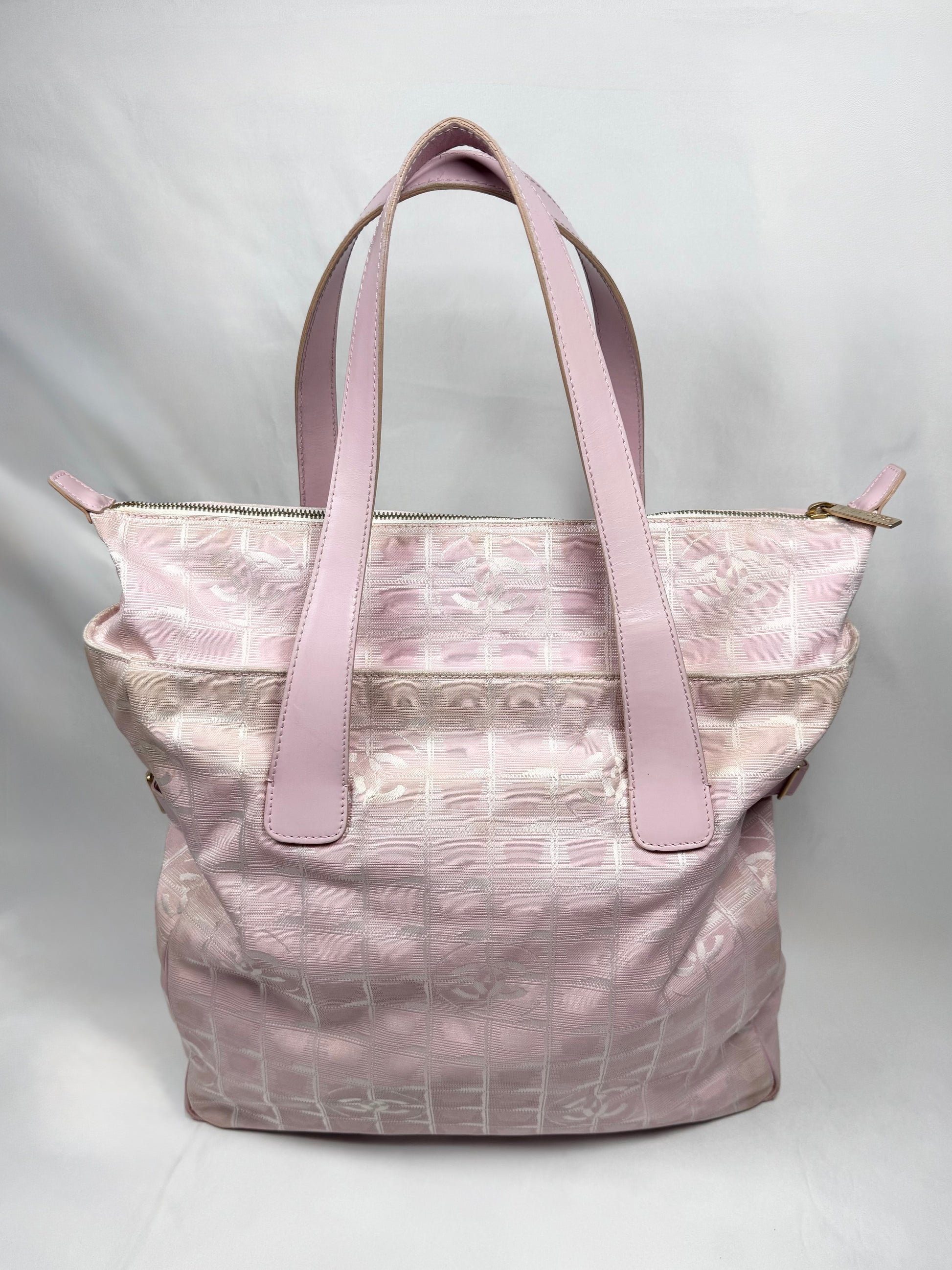 Iconic early 2000s Chanel tote from the ‘Travel Line’ , crafted in the signature lightweight CC monogram jacquard nylon in a soft pink tone. The bag features a zip-top closure with clover motif pull, and subtle grid-woven CC logos throughout the textile. Larger sized variation. spacious and lightweight. In good overall condition with no major flaws or damages (normal aging from usage)
