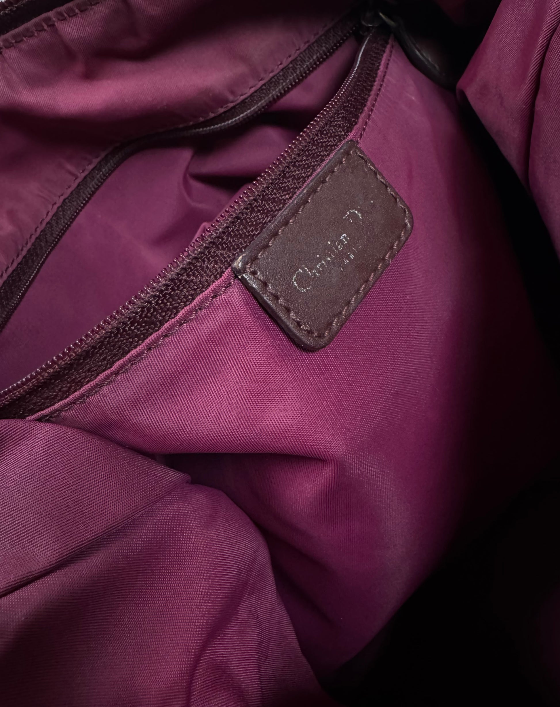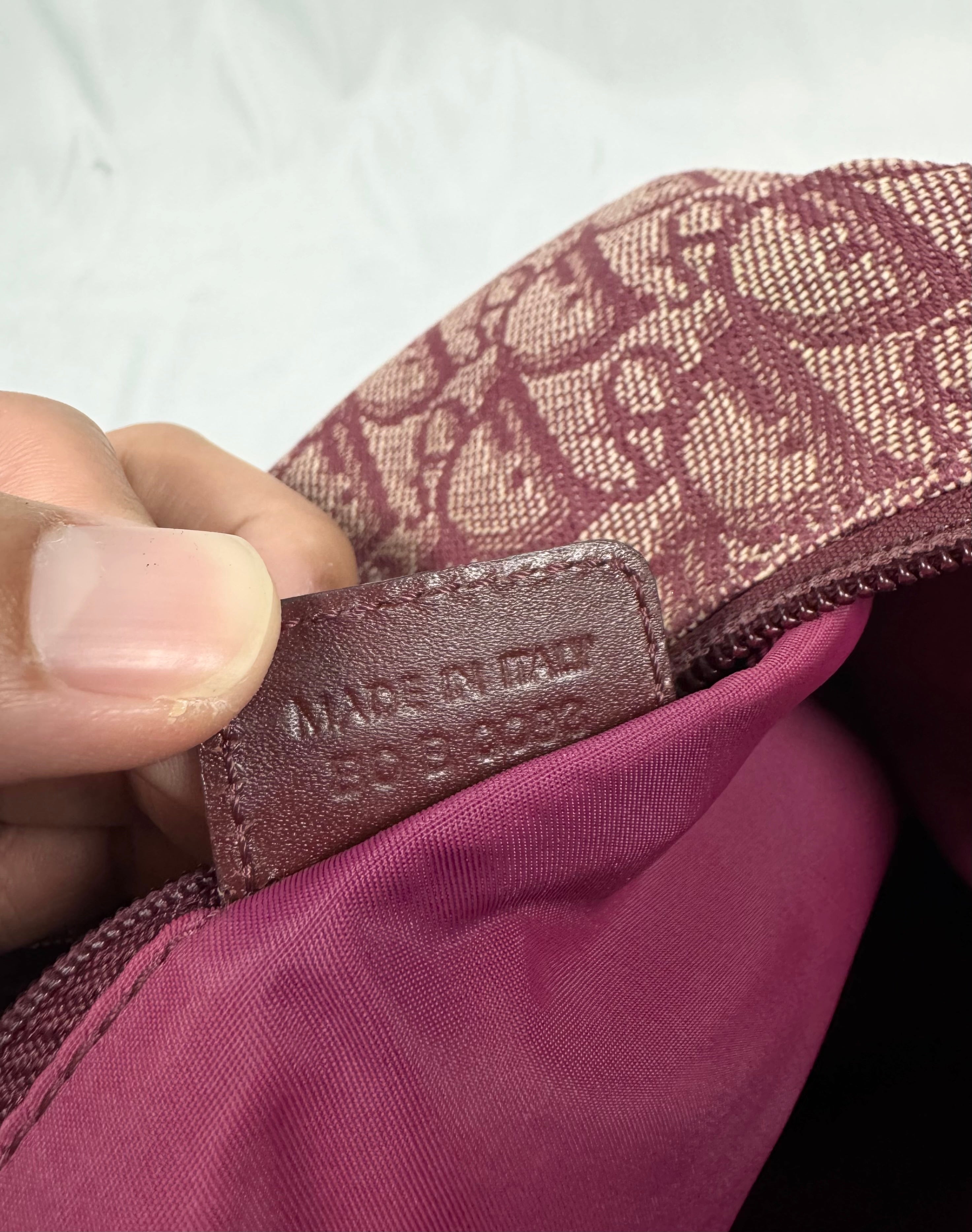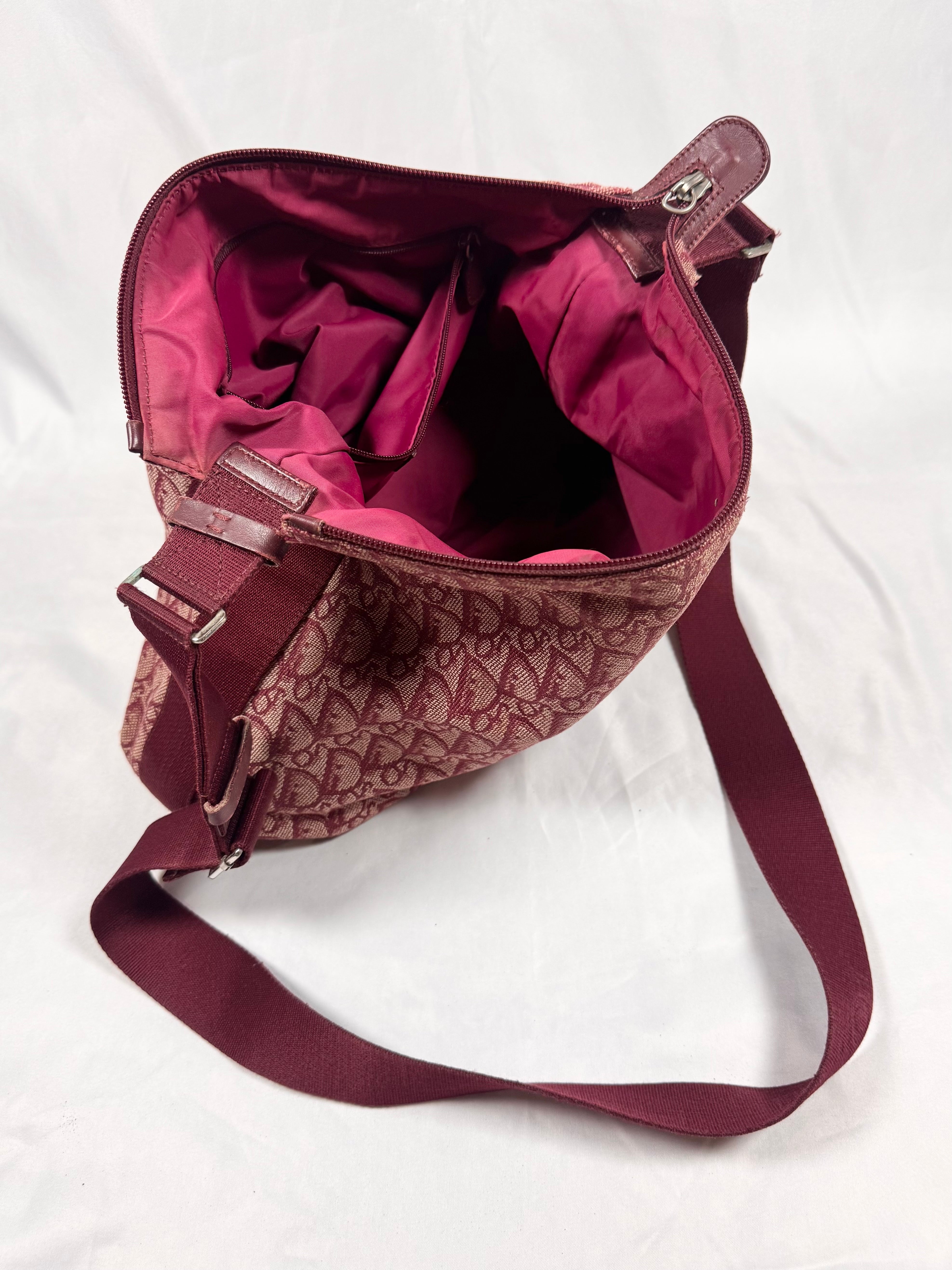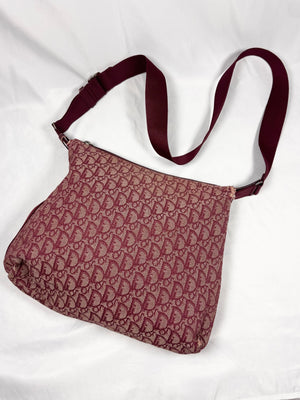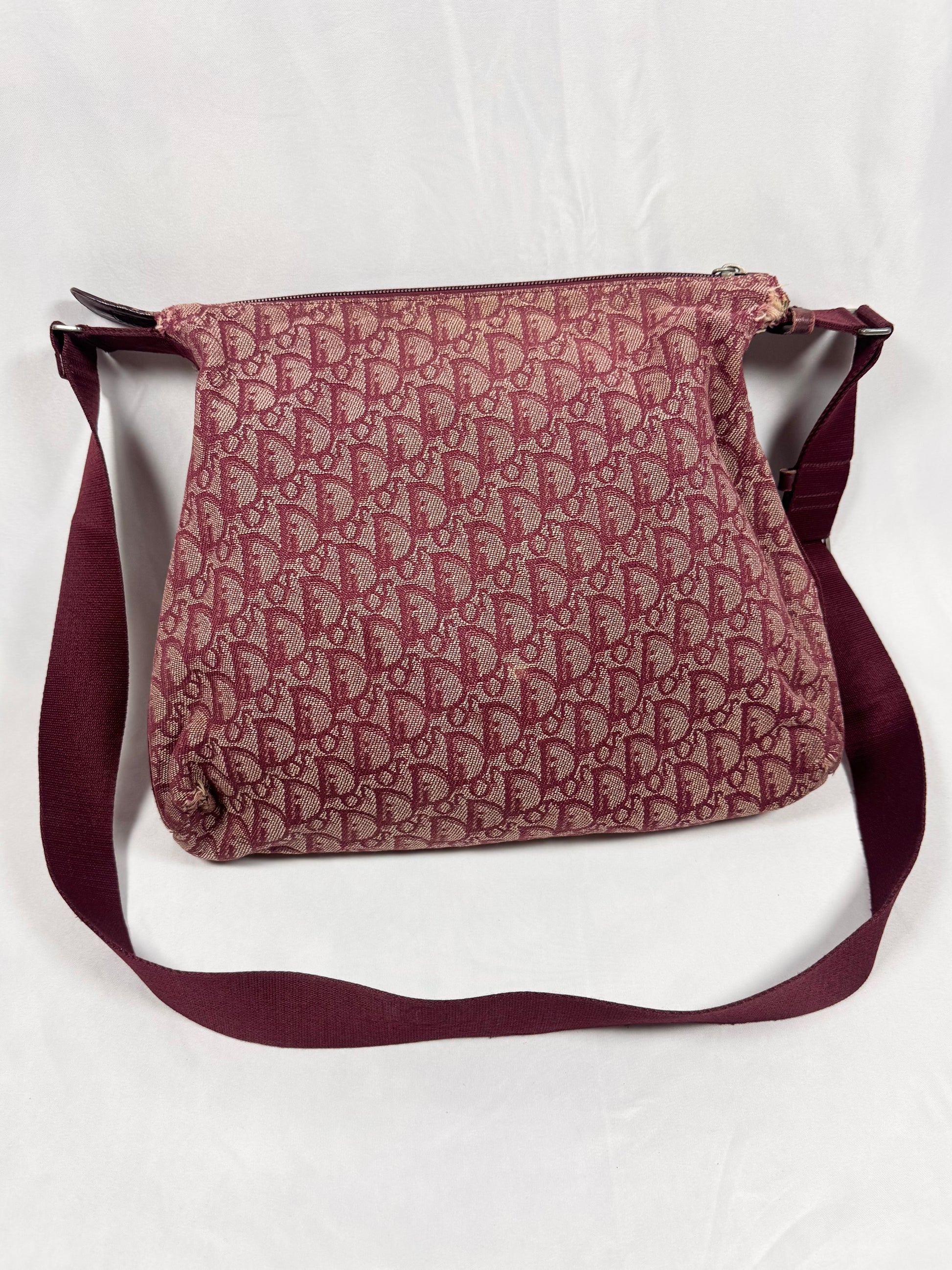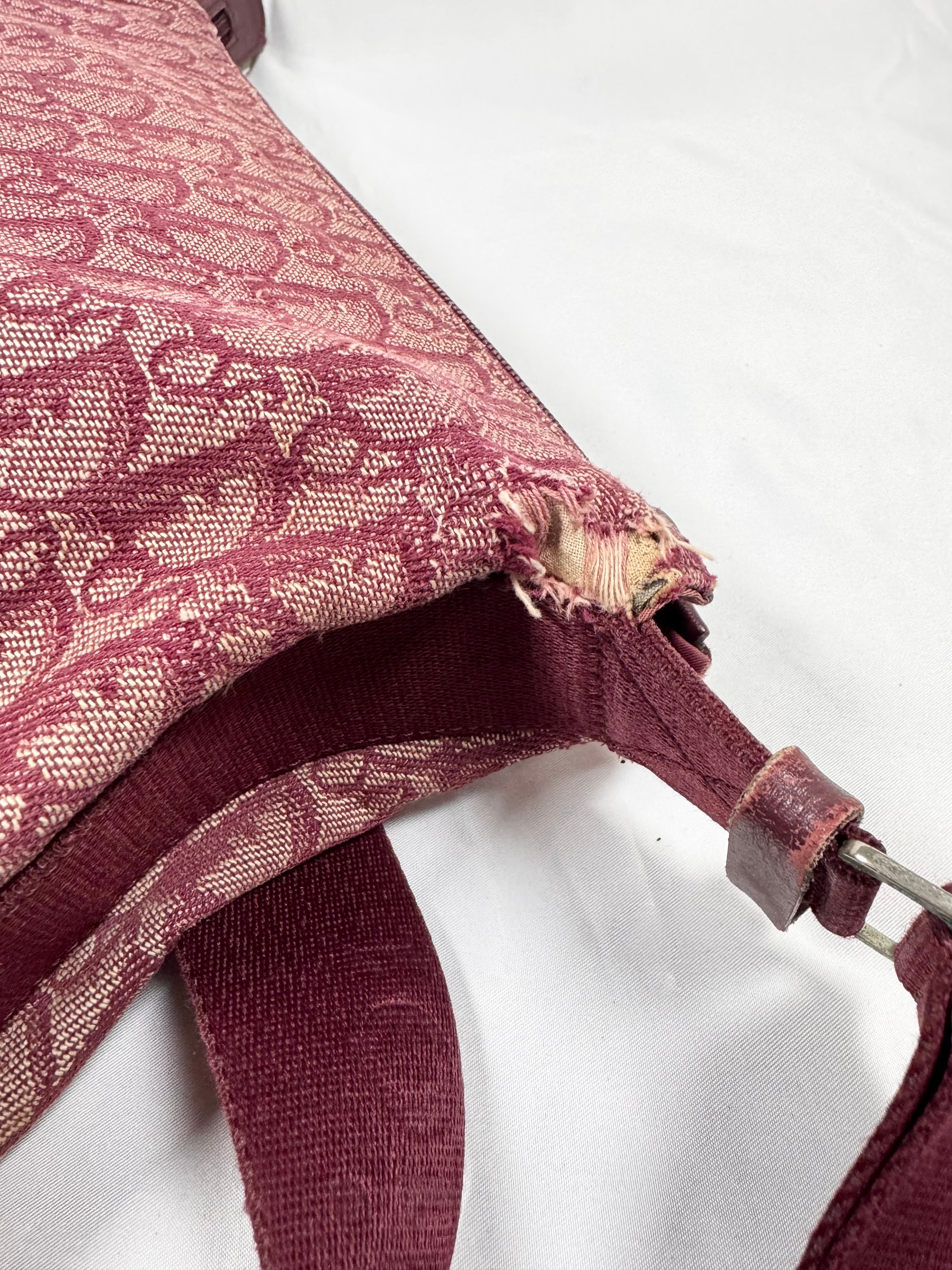 Early 2000s Christian Dior bag featuring the iconic Dior Oblique ‘Trotter’ monogram woven throughout a rich burgundy canvas, a signature of the Galliano-era Y2K aesthetic. Designed with a lightweight yet durable construction, it offers a practical zip-top closure and an adjustable shoulder strap for everyday wear. Some minor rips on corners (easy fix) , but maintains solid condition for its age