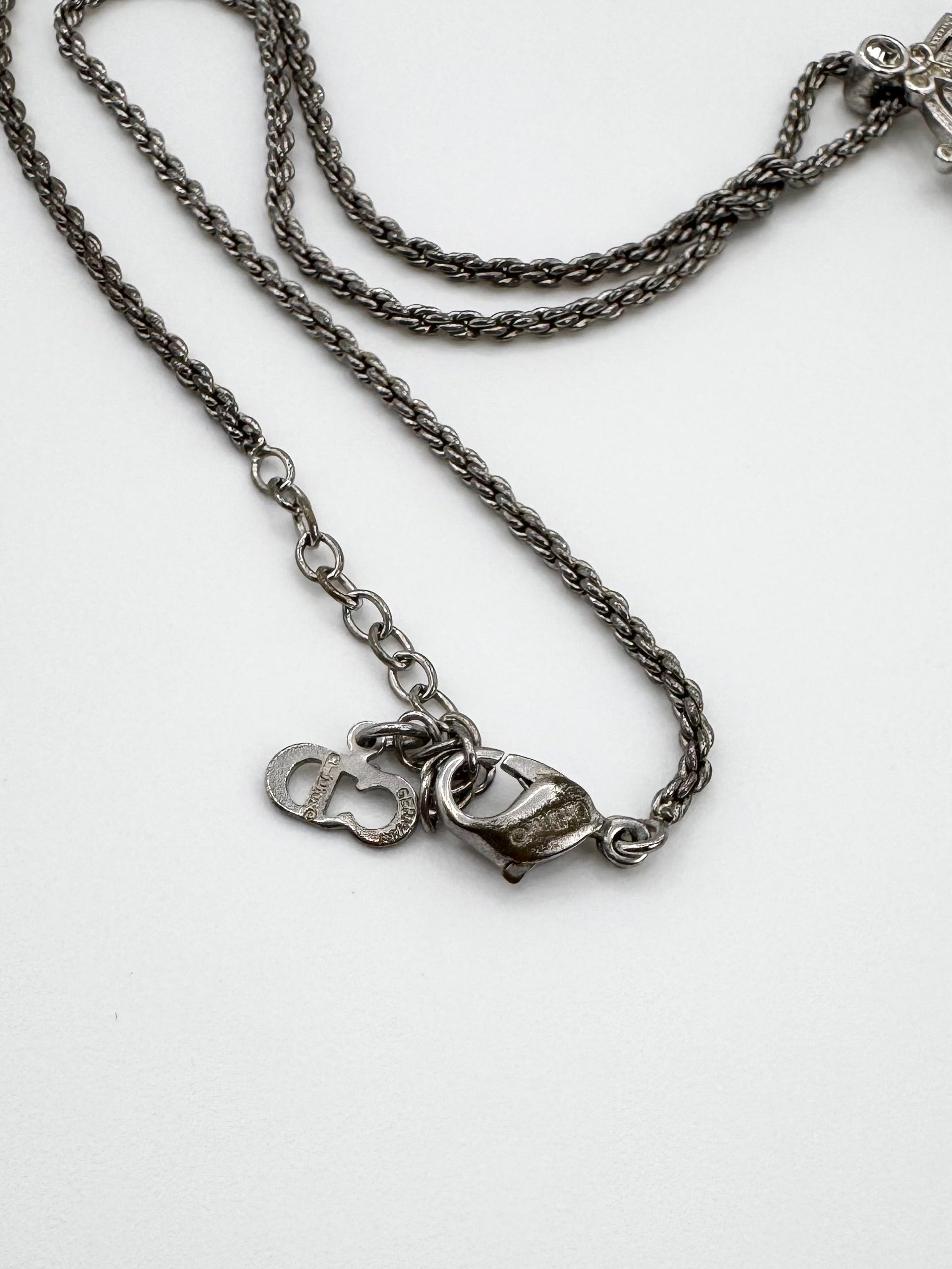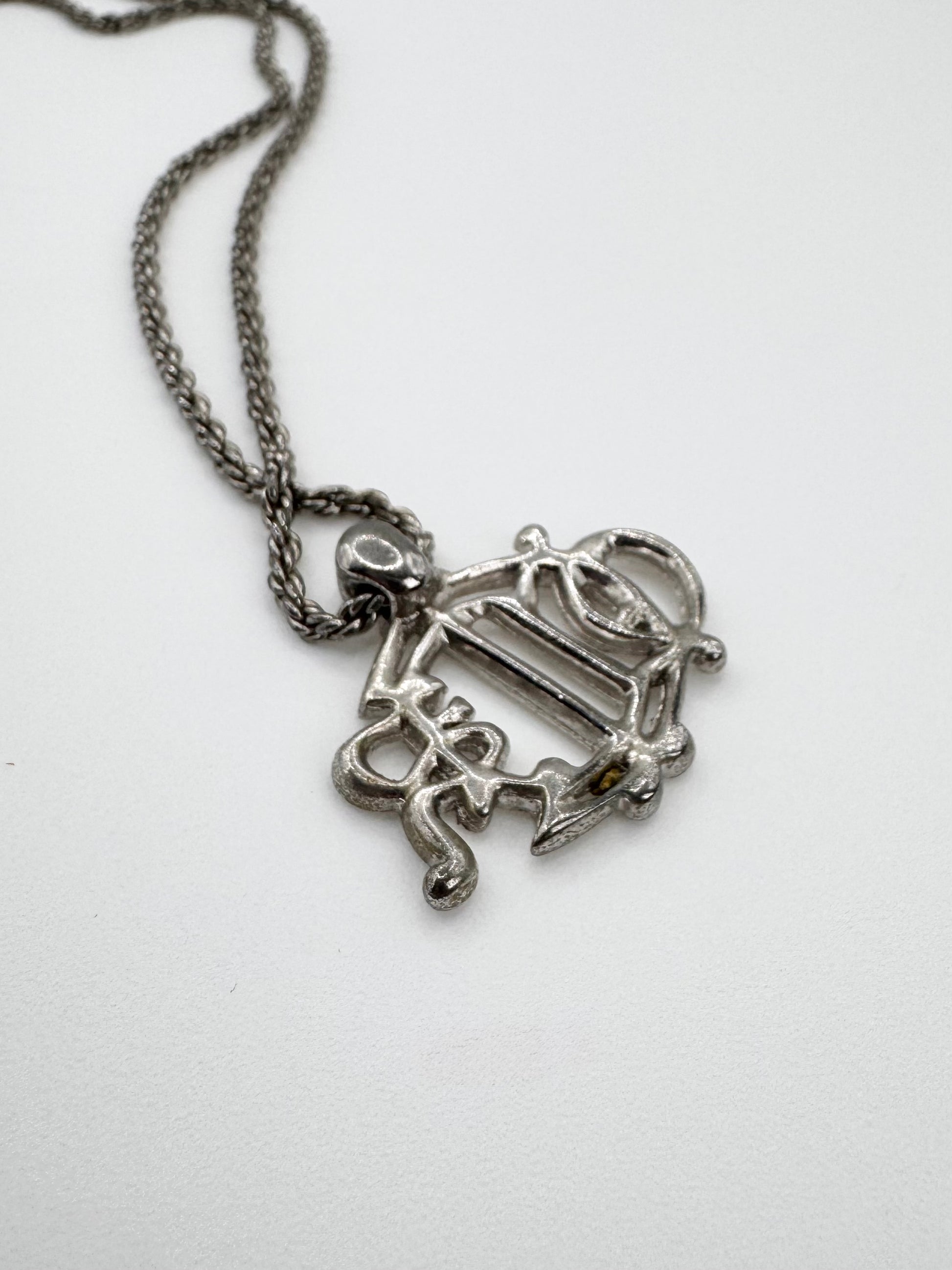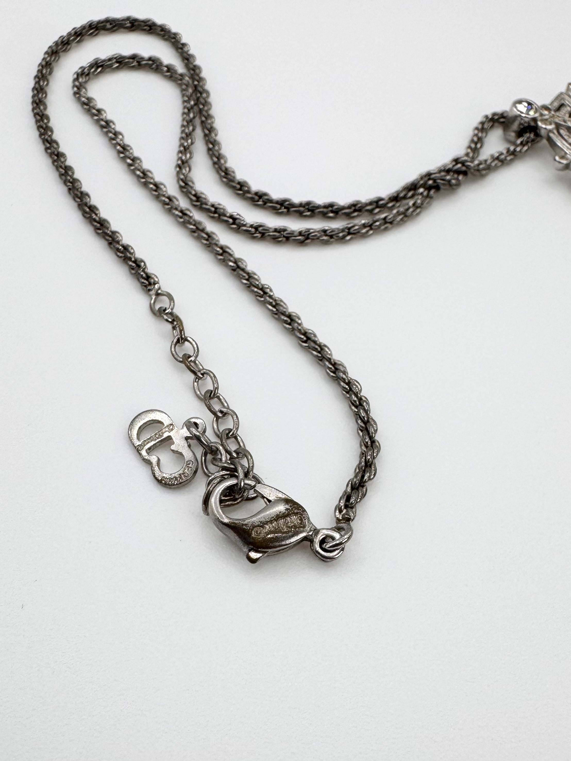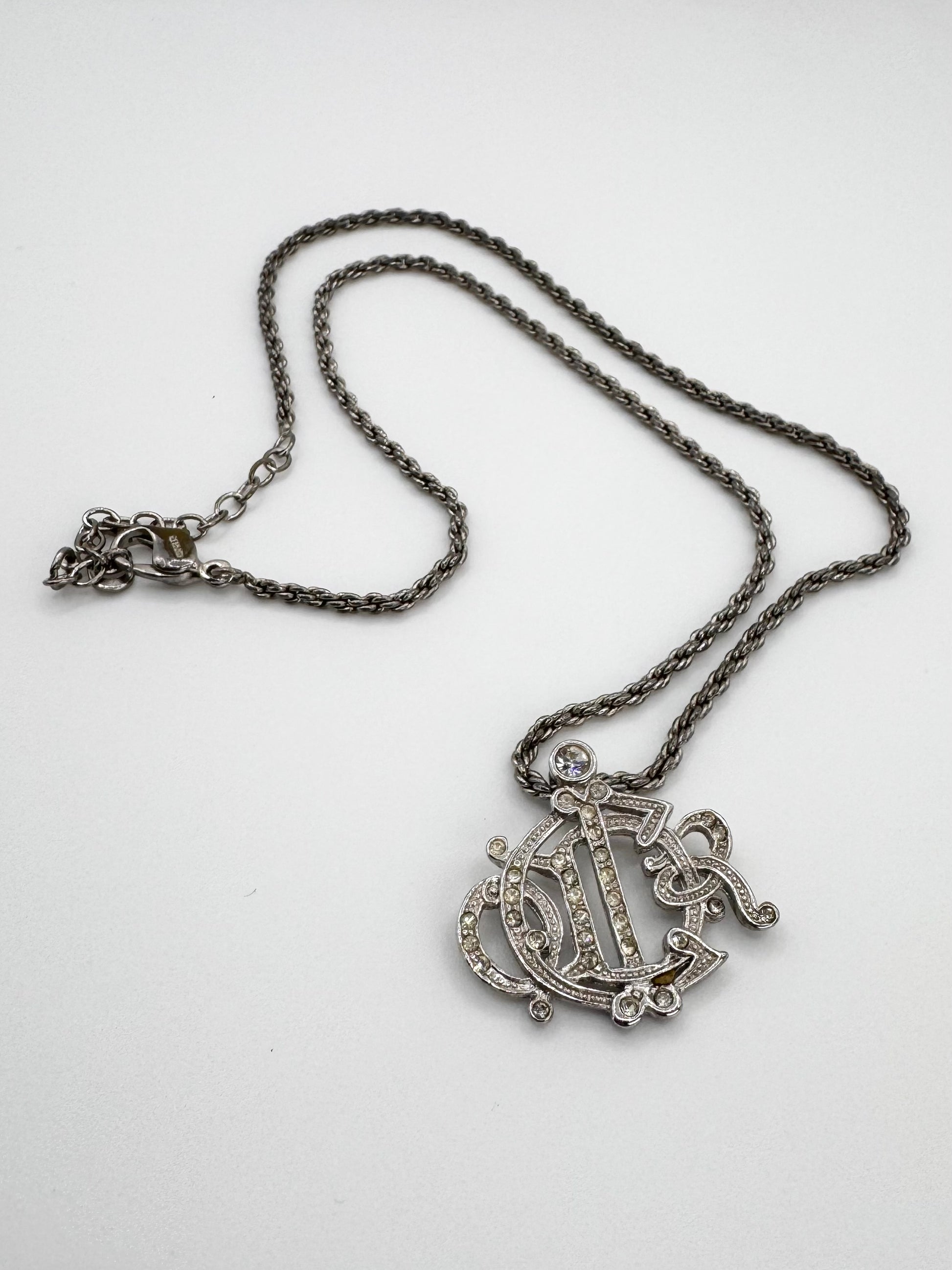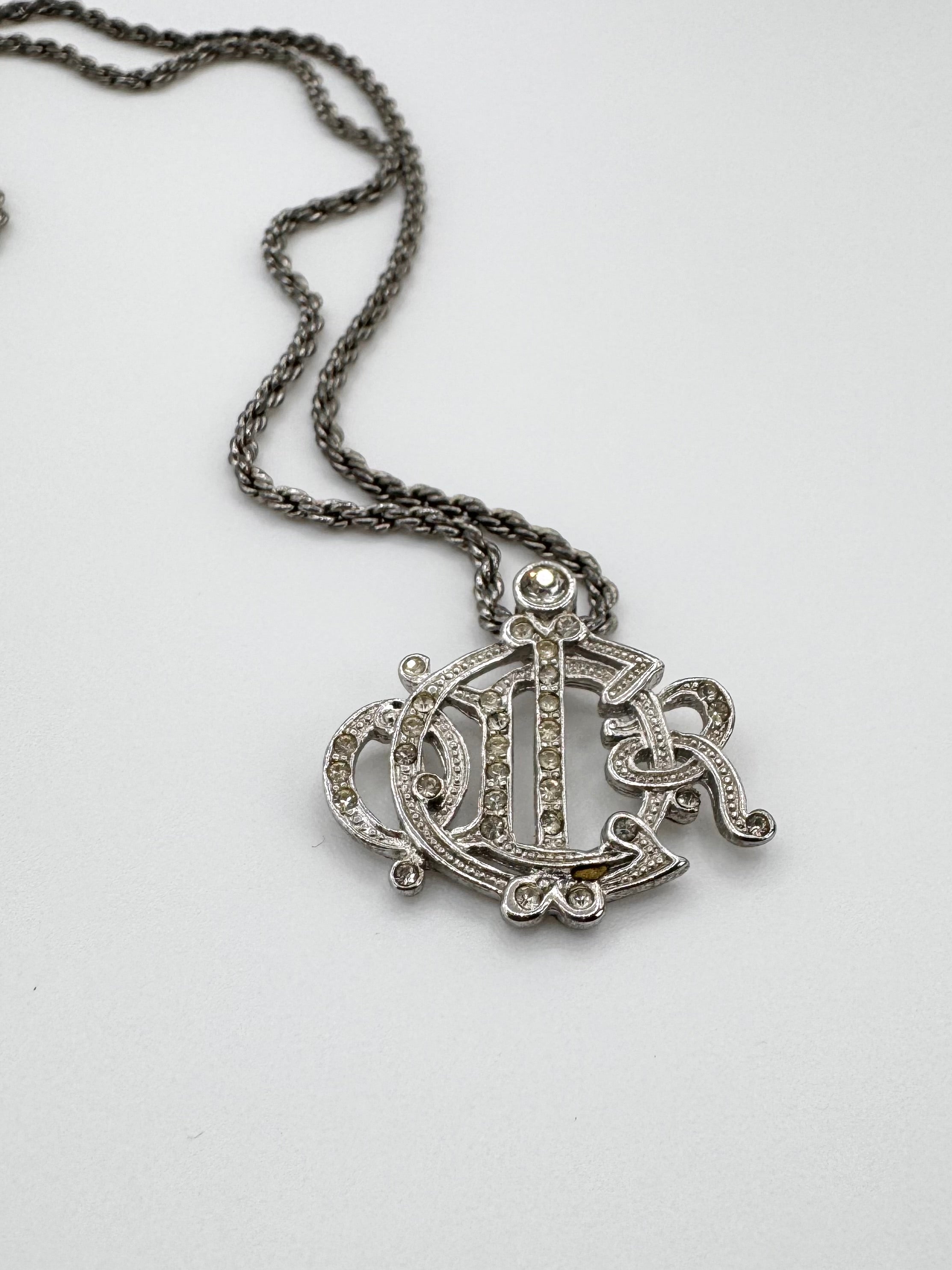 From the early 2000s, this vintage Christian Dior necklace features the brand’s iconic logo rendered in a timeless, silver-tone pendant with elegant alphabets overlaying each other with gem stones embossed. In very good condition for its age