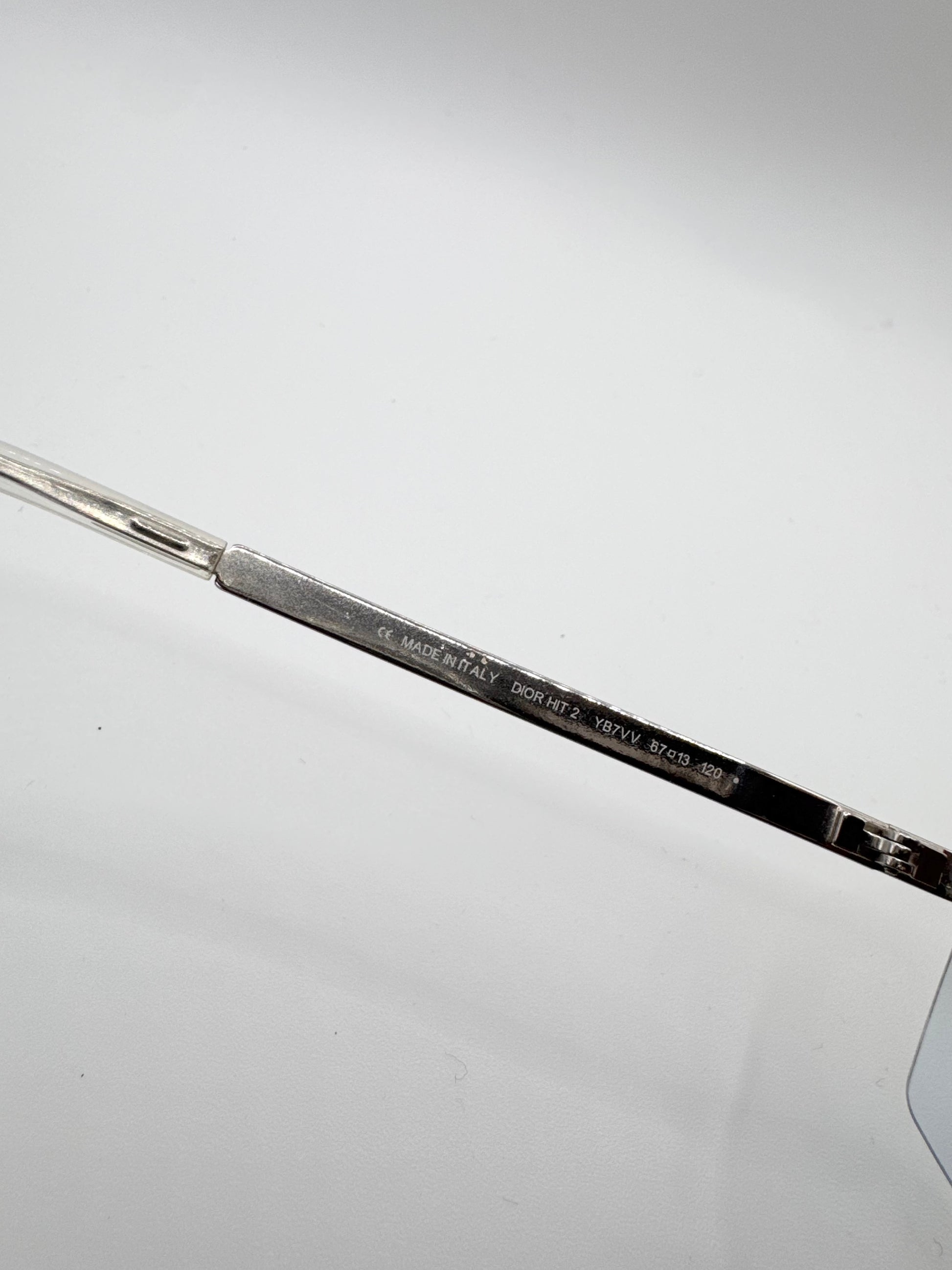 This gorgeous pair of Christian Dior sunglasses in the ‘Dior Hit 2’ model features an aviator style light blue lenses with rhinestone detailing at the top of the frame. Branding embossed at the bridge. Subtle branding on the arms, star detailing at the end of the arm. In solid condition, no major flaws or damages, comes with the original box