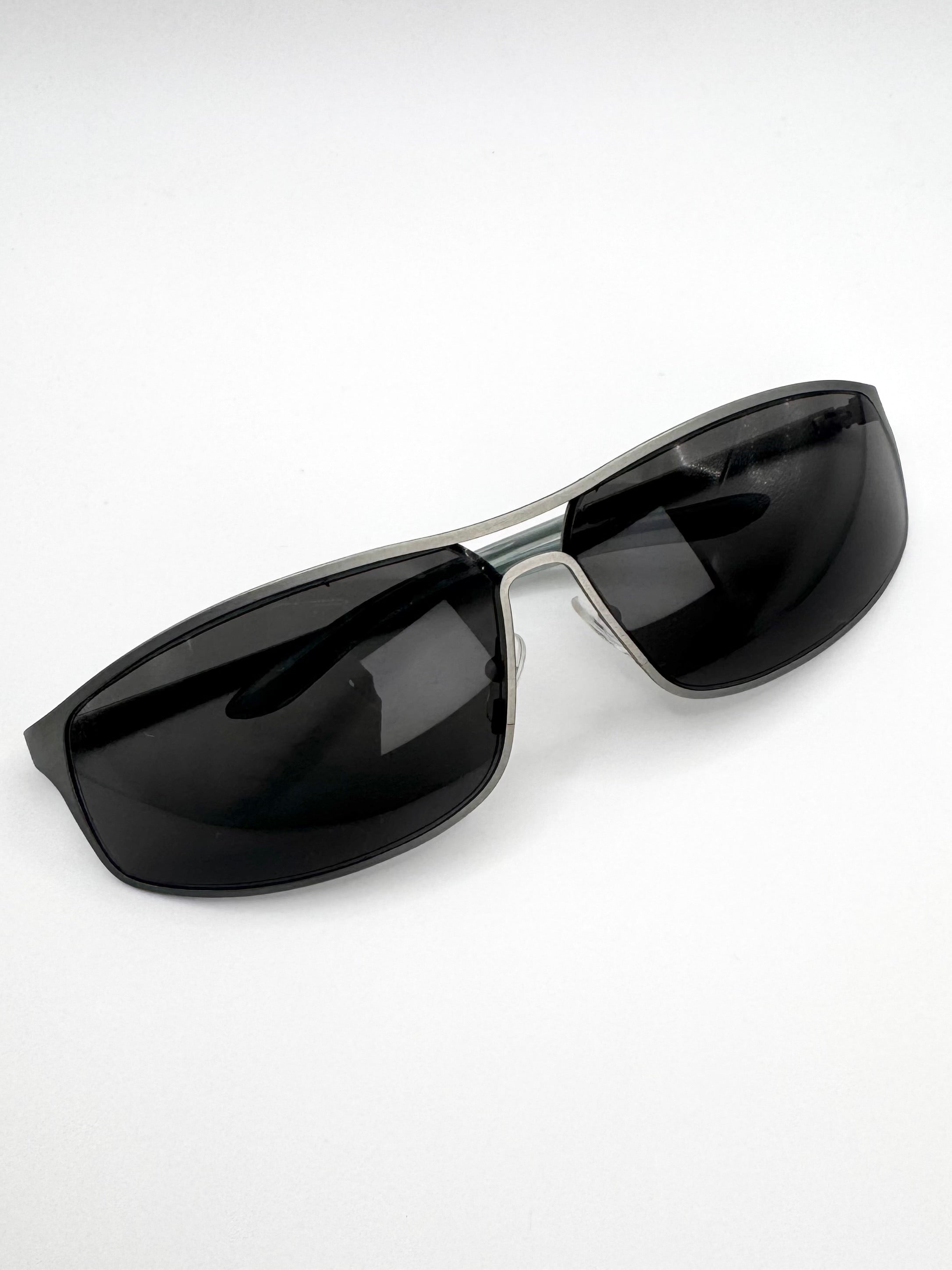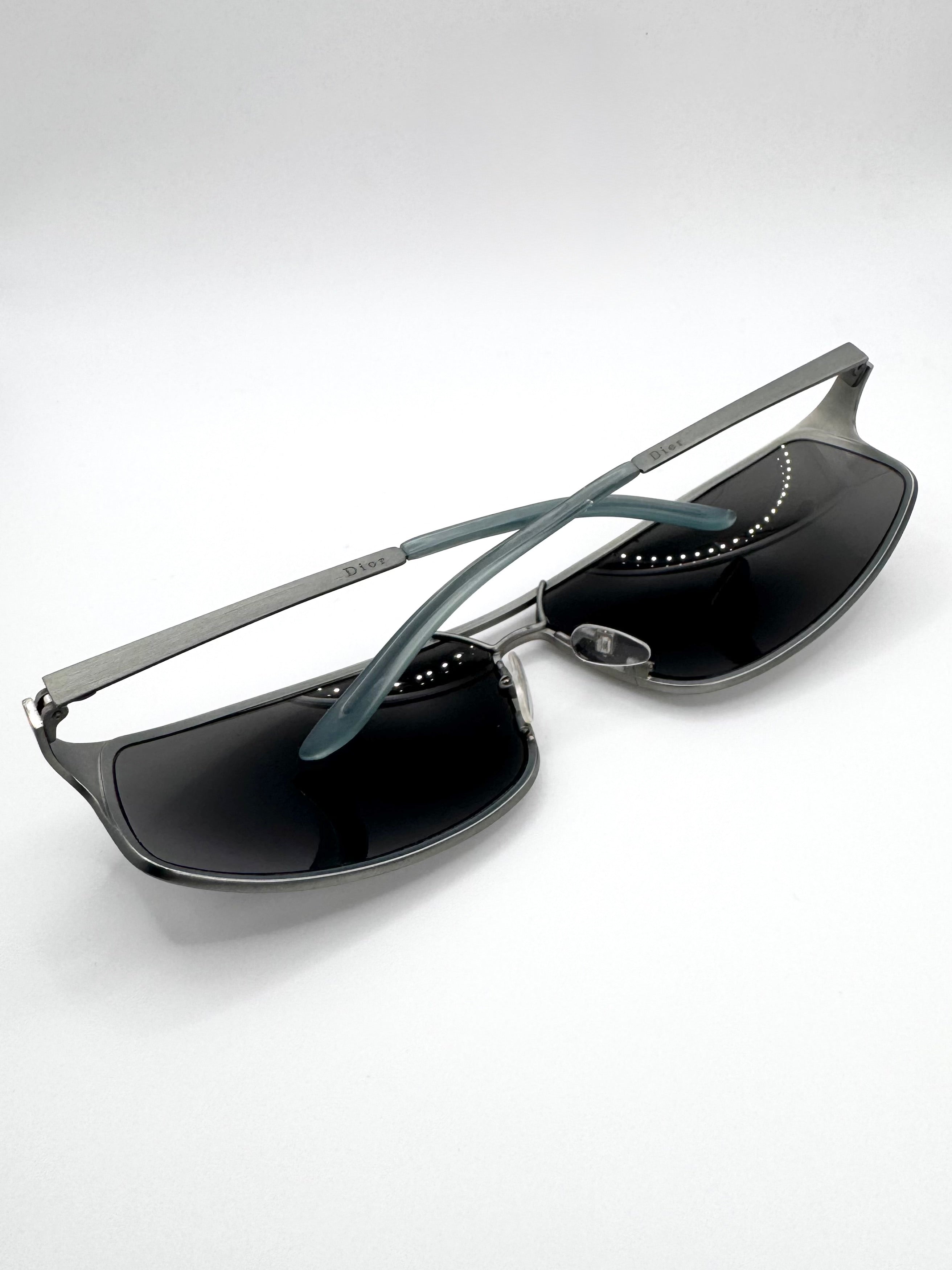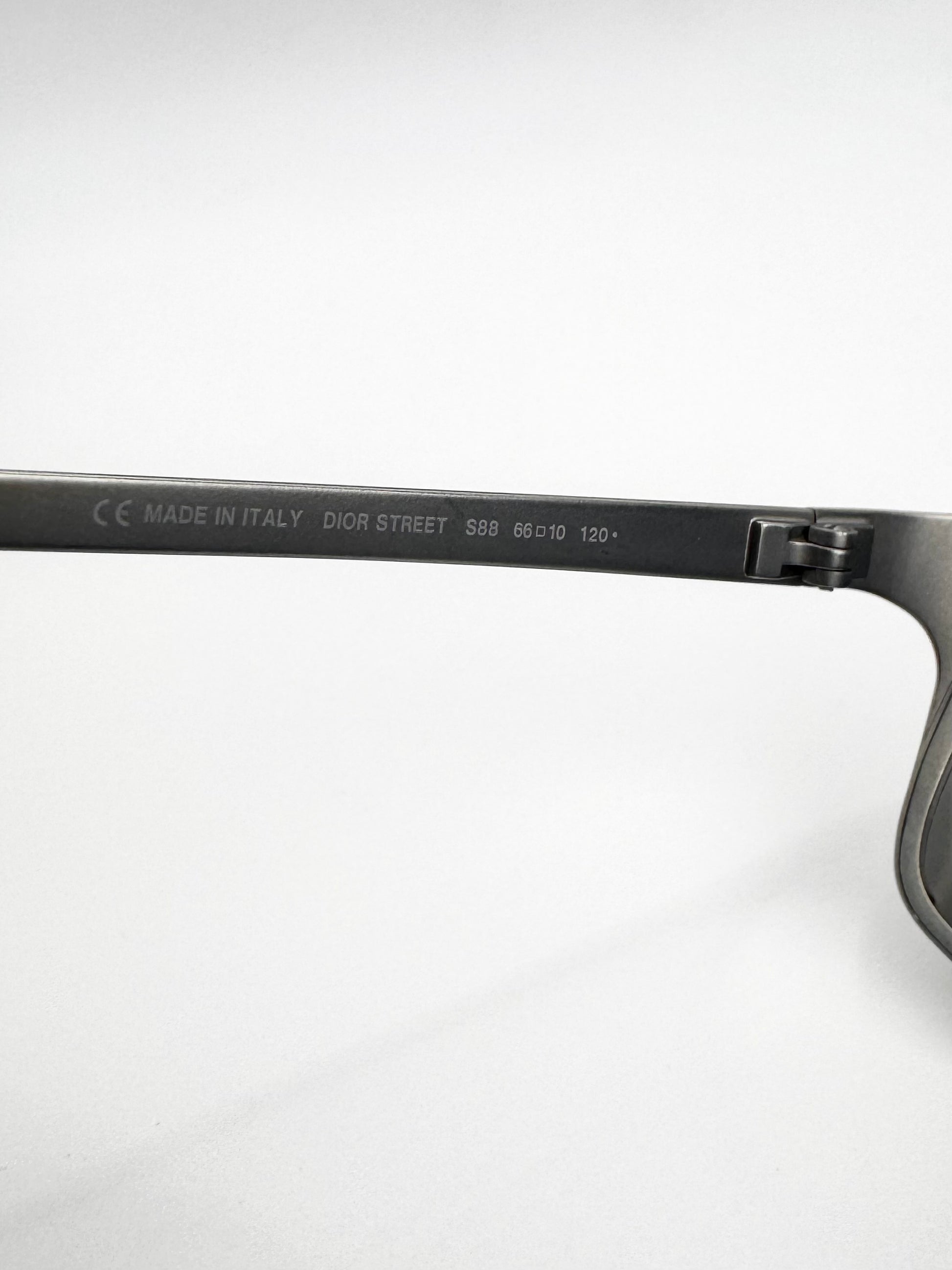 Early–mid 2000s Christian Dior “Dior Street” sunglasses featuring a sleek, industrial metal frame in a dark graphite / gunmetal finish. Designed with softly squared lenses and a streamlined silhouette, the pair reflects Dior’s Y2K-era approach to minimalist yet technical eyewear. Subtle engraved Dior branding appears on the temple. Made in Italy, kept in good quality for its age