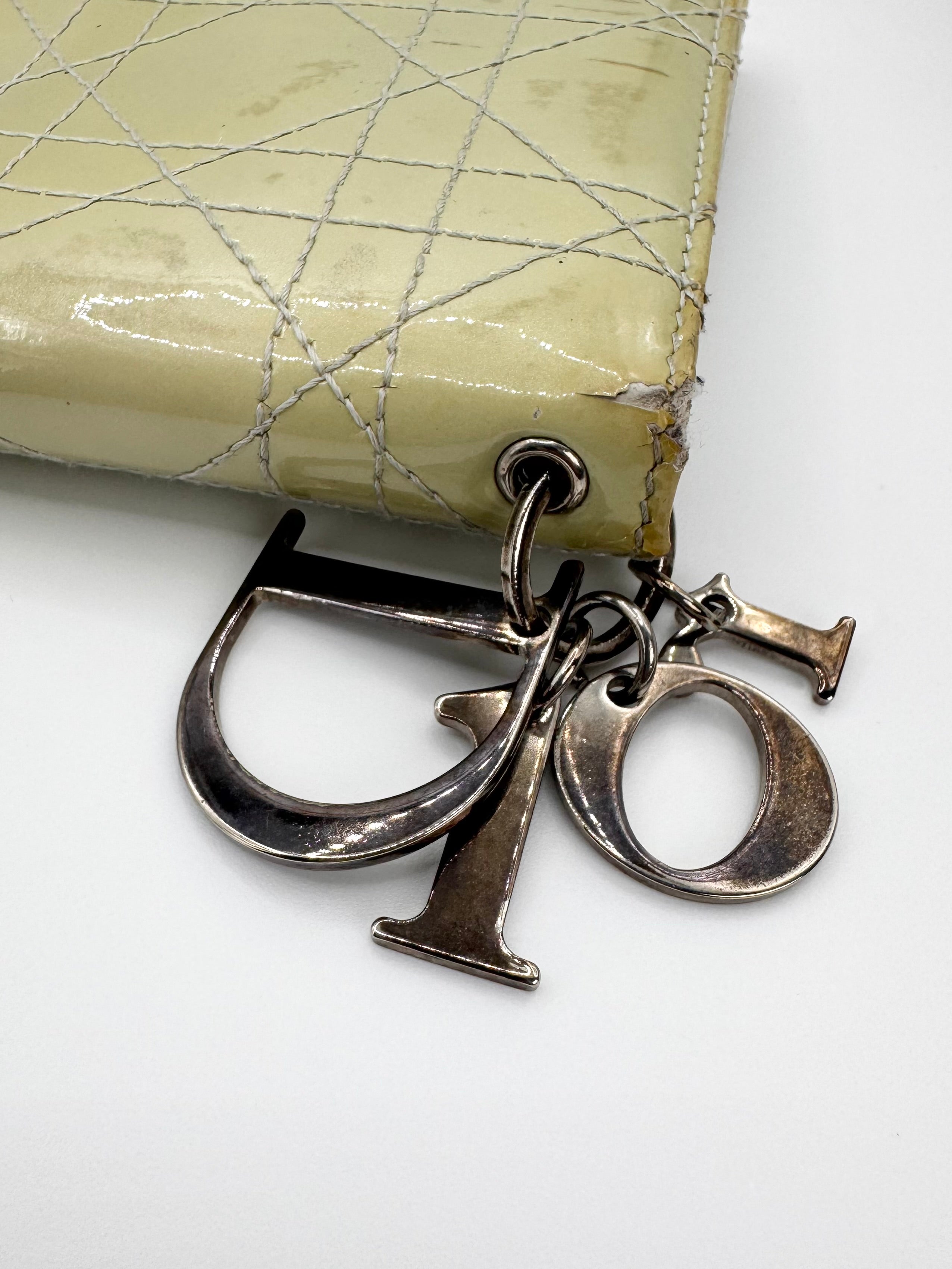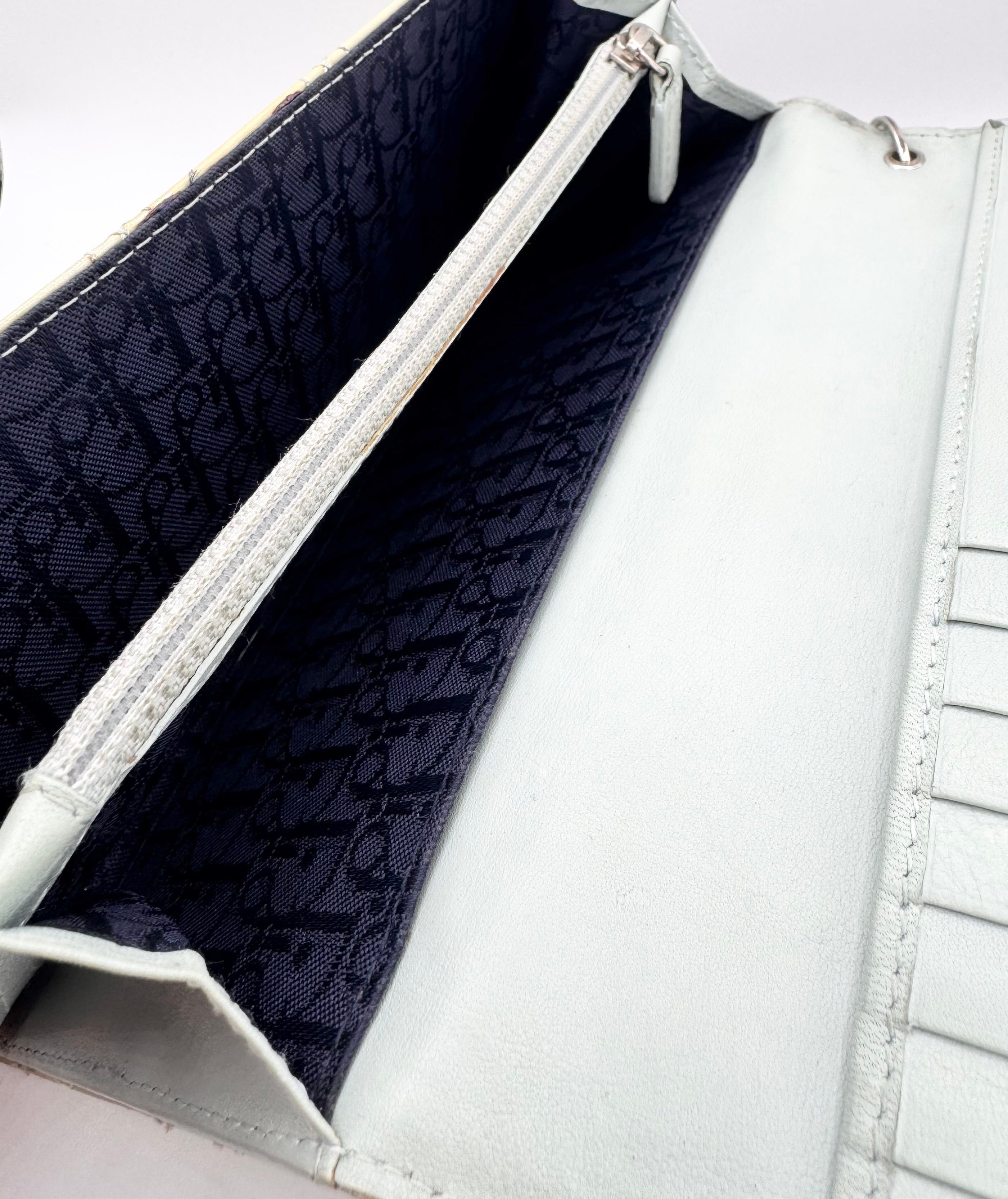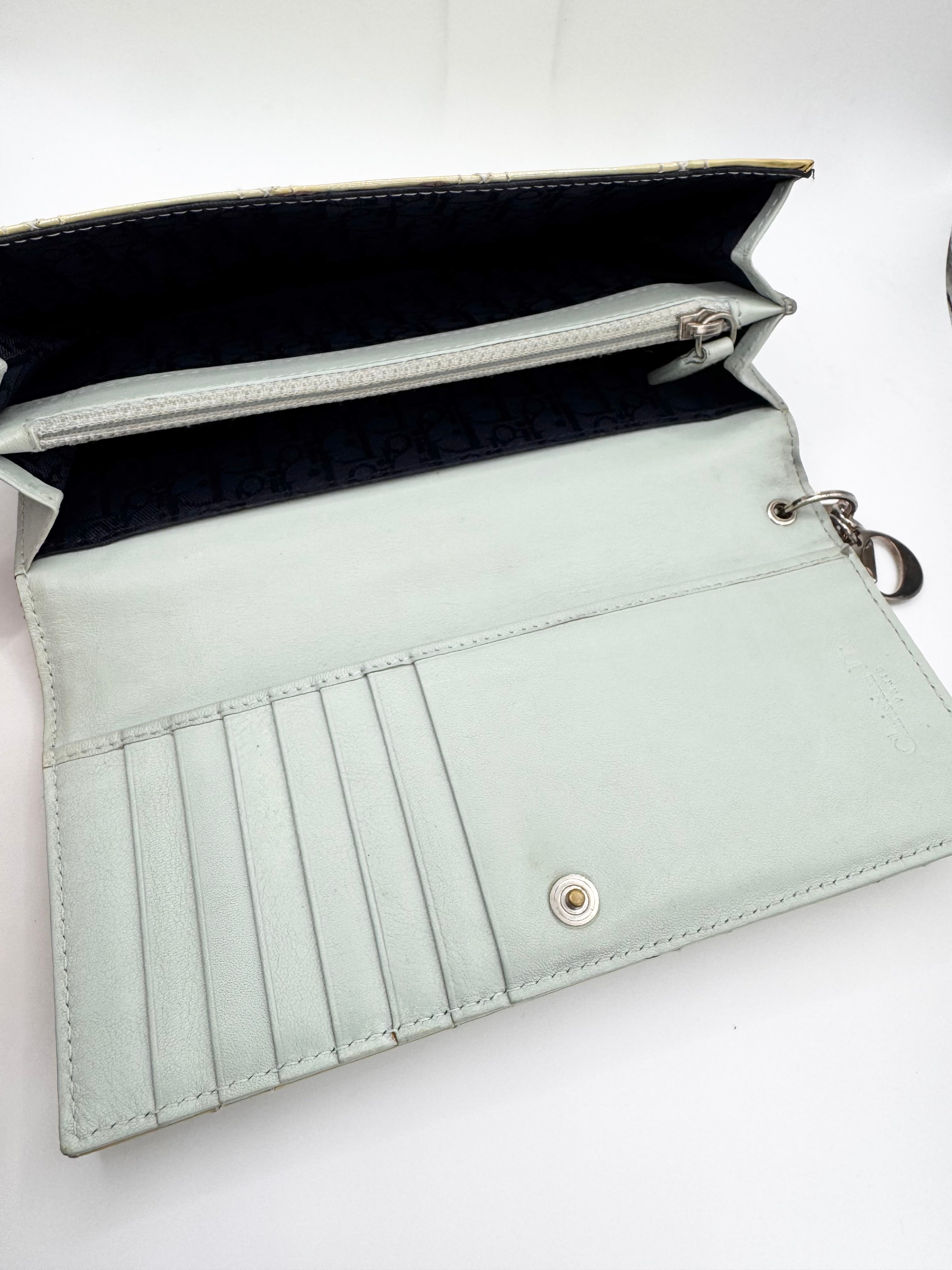 From the early 2000s, vintage Christian Dior wallet is crafted from glossy light emerald quilted leather, showcasing the house’s iconic cannage pattern in a soft, timeless tone. Finished with a signature Dior logo charm linked on the exterior. Good condition with some minor scuffs throughout (maintains good quality)