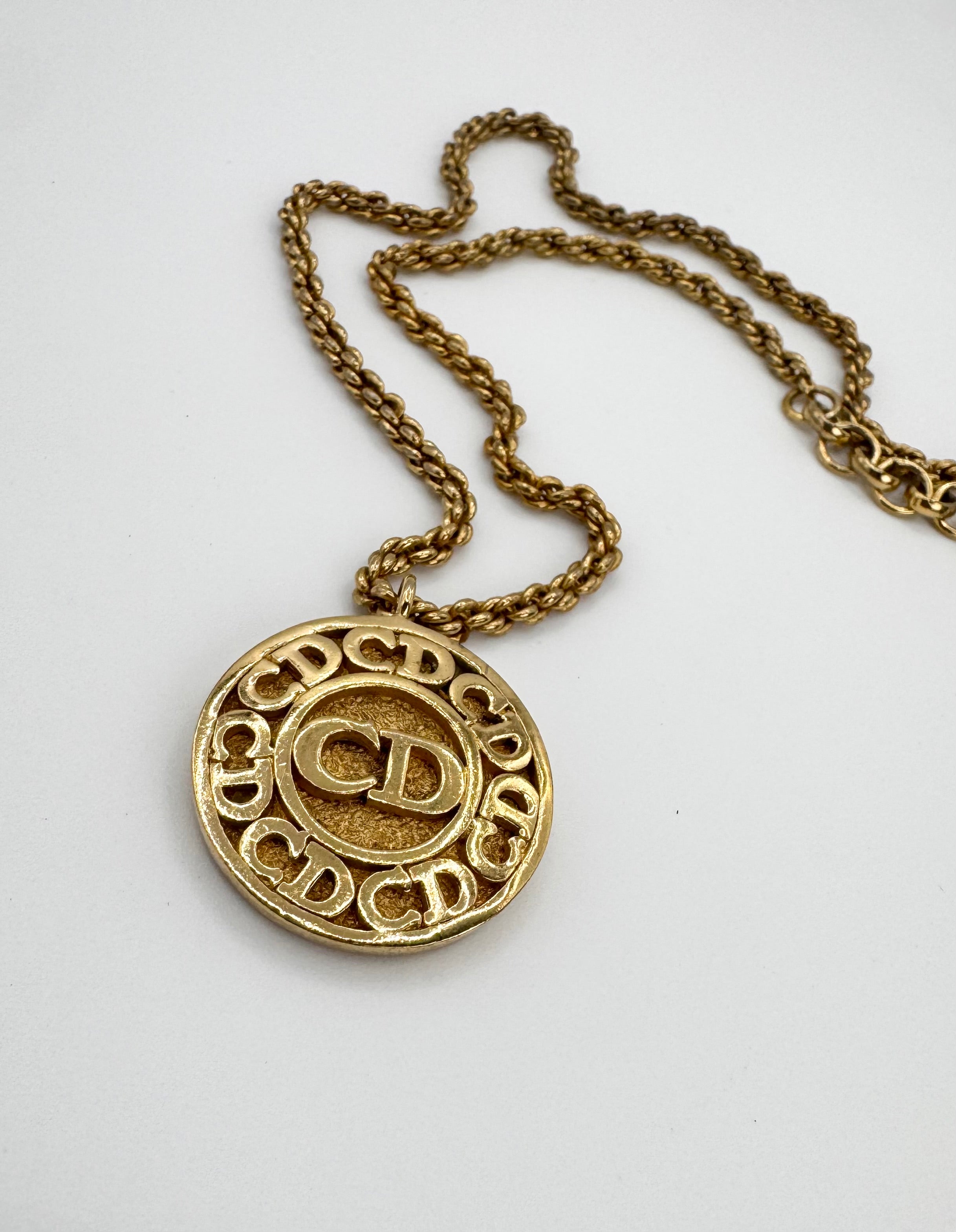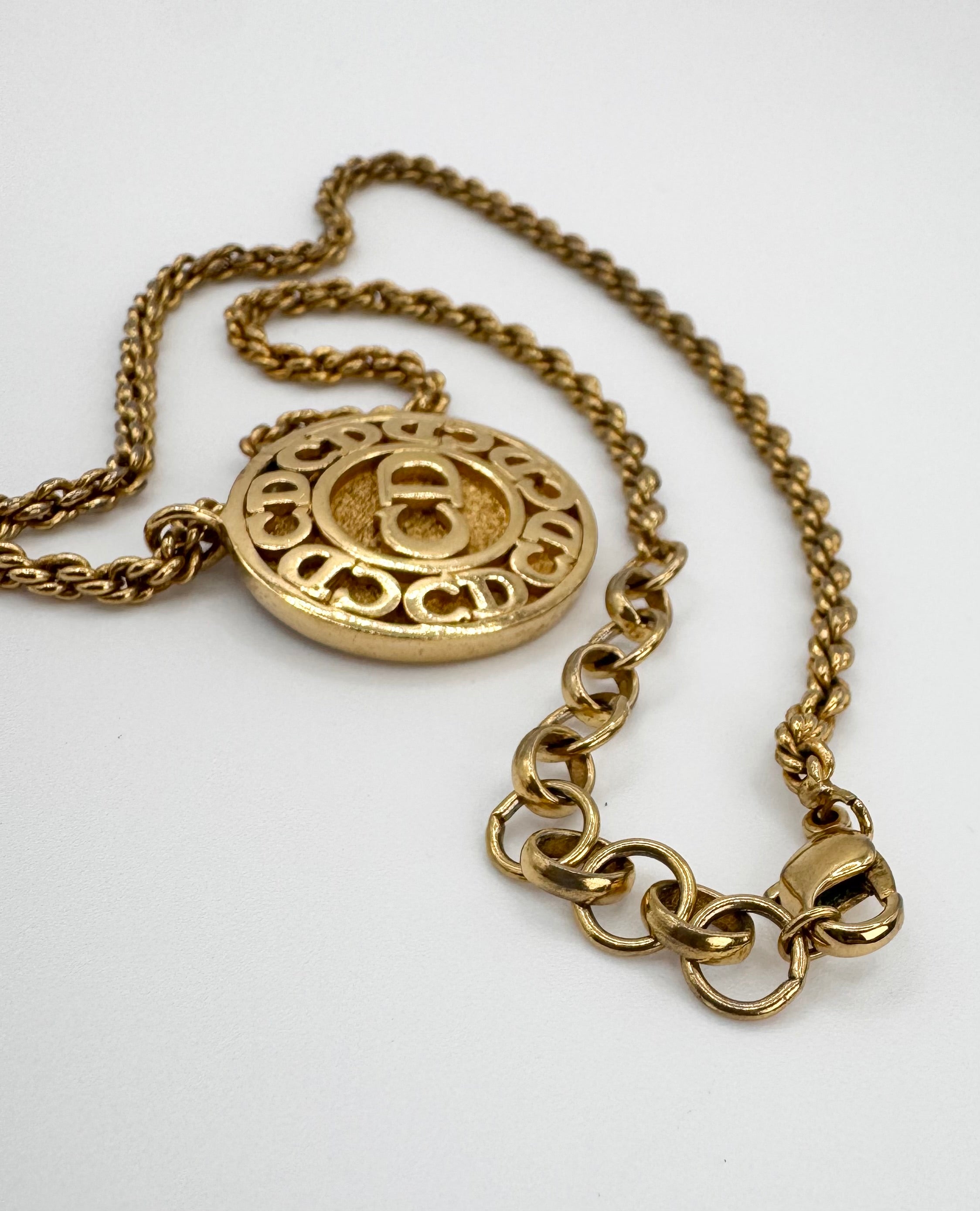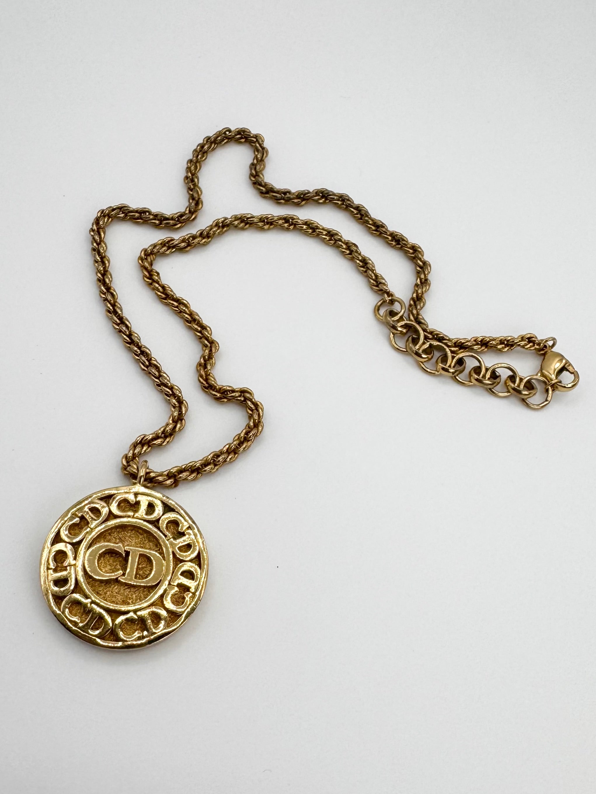 Vintage Christian Dior gold necklace from the early 2000s. Features a coin-style pendant with a raised “CD” monogram at the center, surrounded by a symmetrical ring of repeating CD engravings along the outer edge. The medallion design references vintage coin jewelry, blending classic heraldic symbolism with Dior’s iconic branding. In good condition for its age with no major flaws