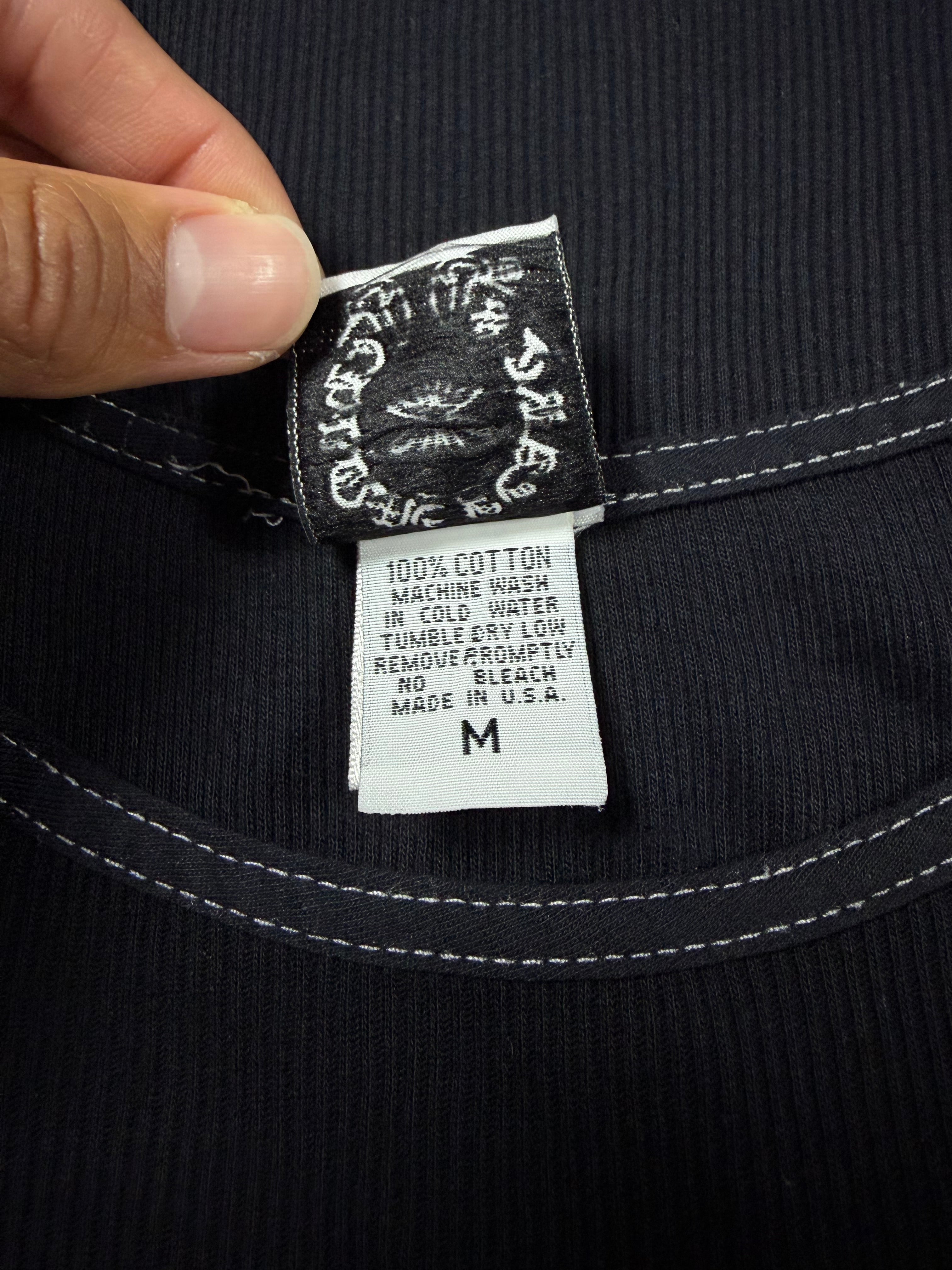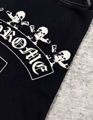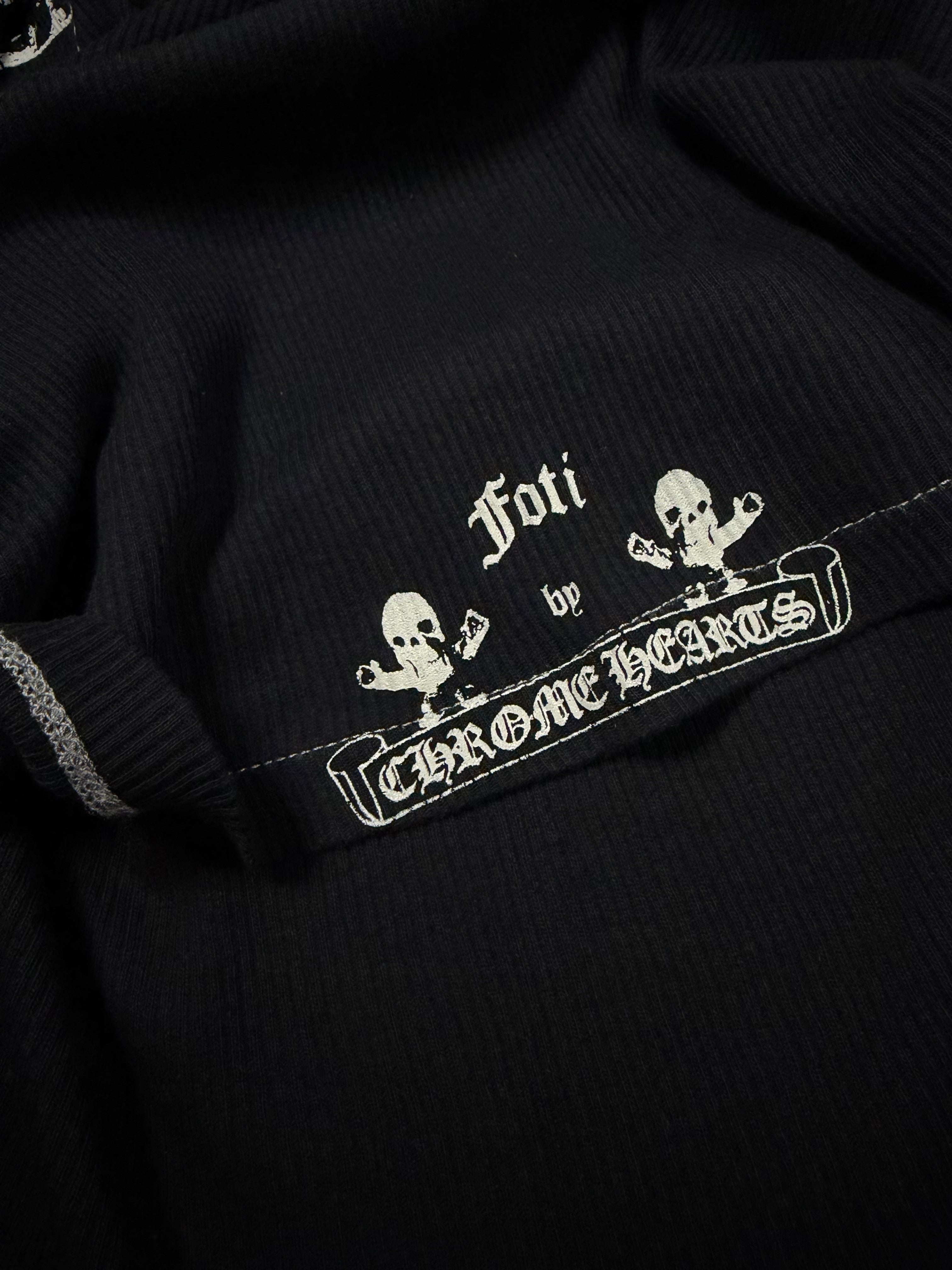 A rare Foti-era piece, this ribbed tank features the unmistakable hand-drawn ‘Harris’ skull motifs associated with Joe Foti’s early Chrome Hearts graphics. The side print composition blends gothic “Chrome Hearts” script with playful yet irreverent skull iconography. Constructed from soft ribbed cotton, it offers a fitted silhouette that stays true to the brand’s classic cut-and-sew essentials. In lovely vintage condition with no flaws or damages. (Elastic fit)