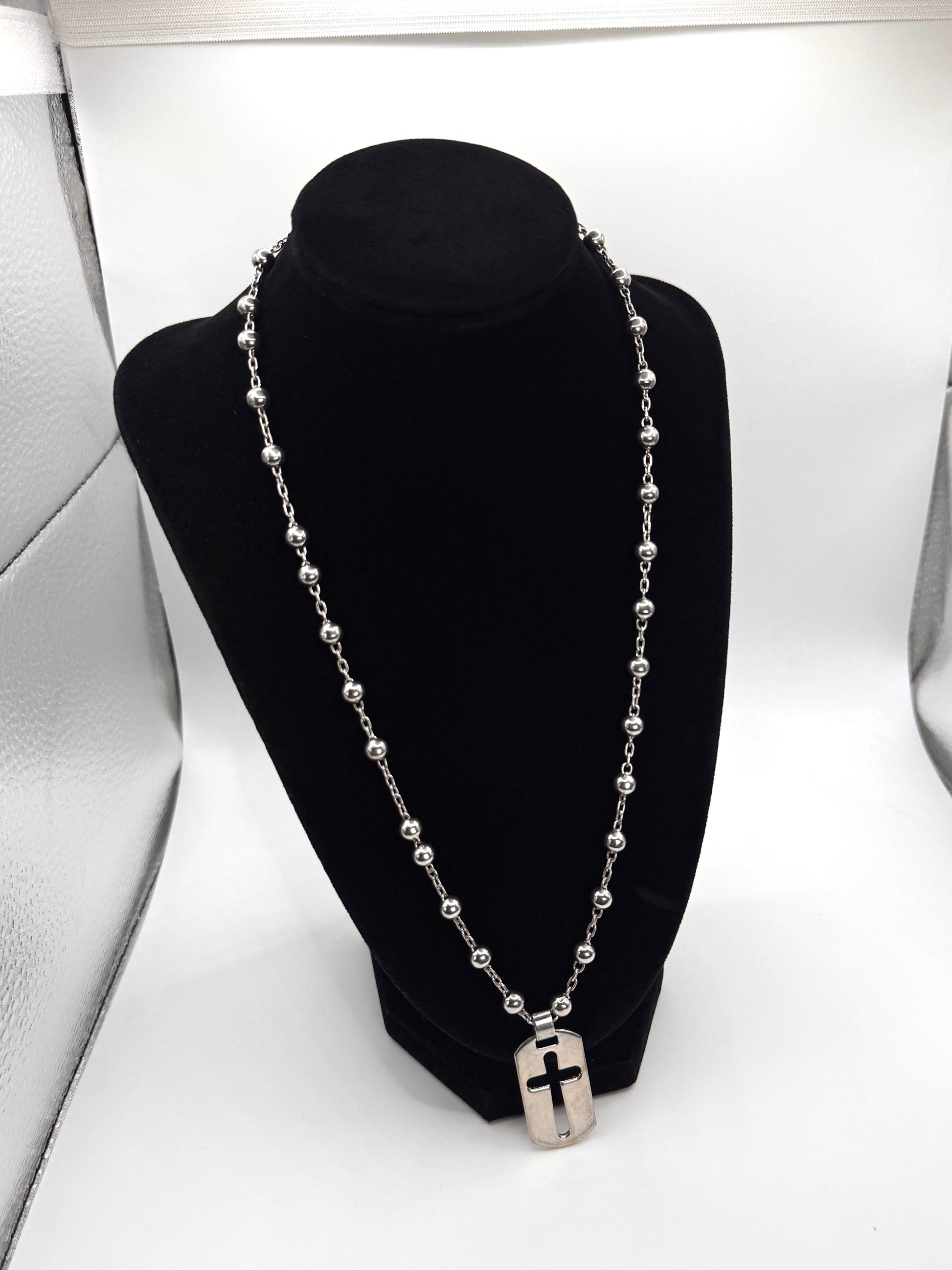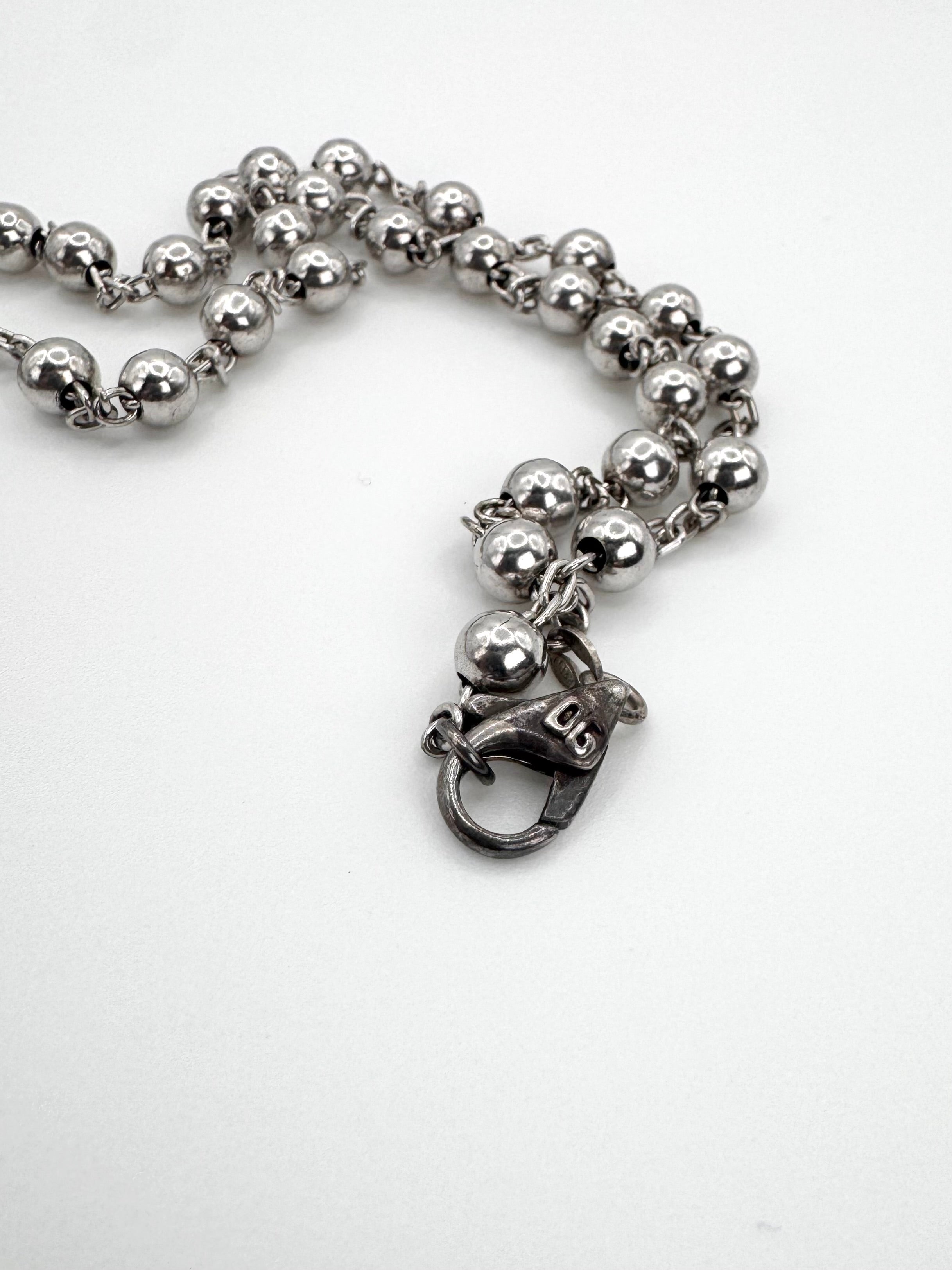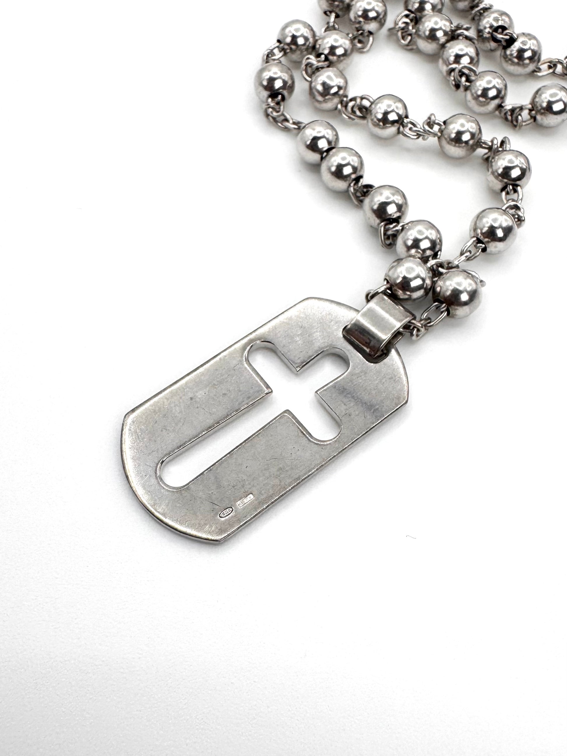 A rare early-2000s Dolce & Gabbana dog tag necklace featuring a sleek cut-out cross motif on a polished silver-tone pendant. Constructed with a durable ball chain and secure lobster clasp, embodying the brand’s signature Y2K-era industrial aesthetic. The minimalist cross cut-out design gives the piece a bold yet understated archival look suitable for layering or standalone wear. A collectible vintage accessory that reflects Dolce & Gabbana’s iconic fusion of religious symbolism and contemporary fashion hardware from the 2000s.