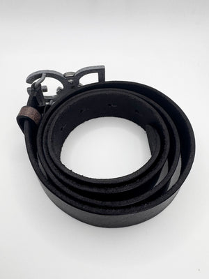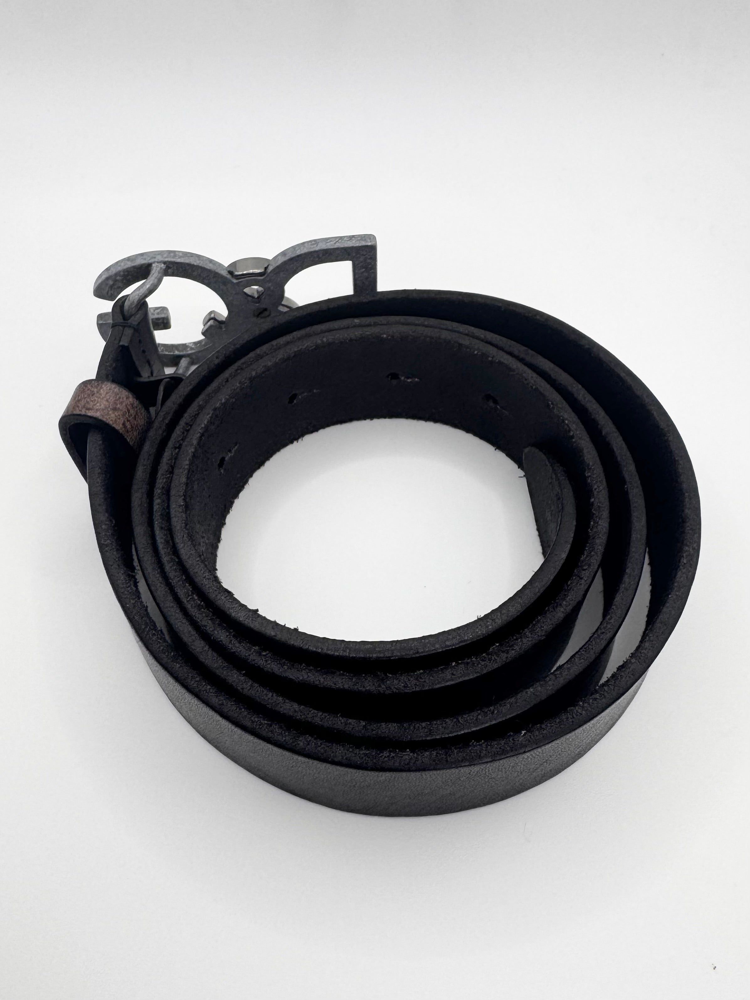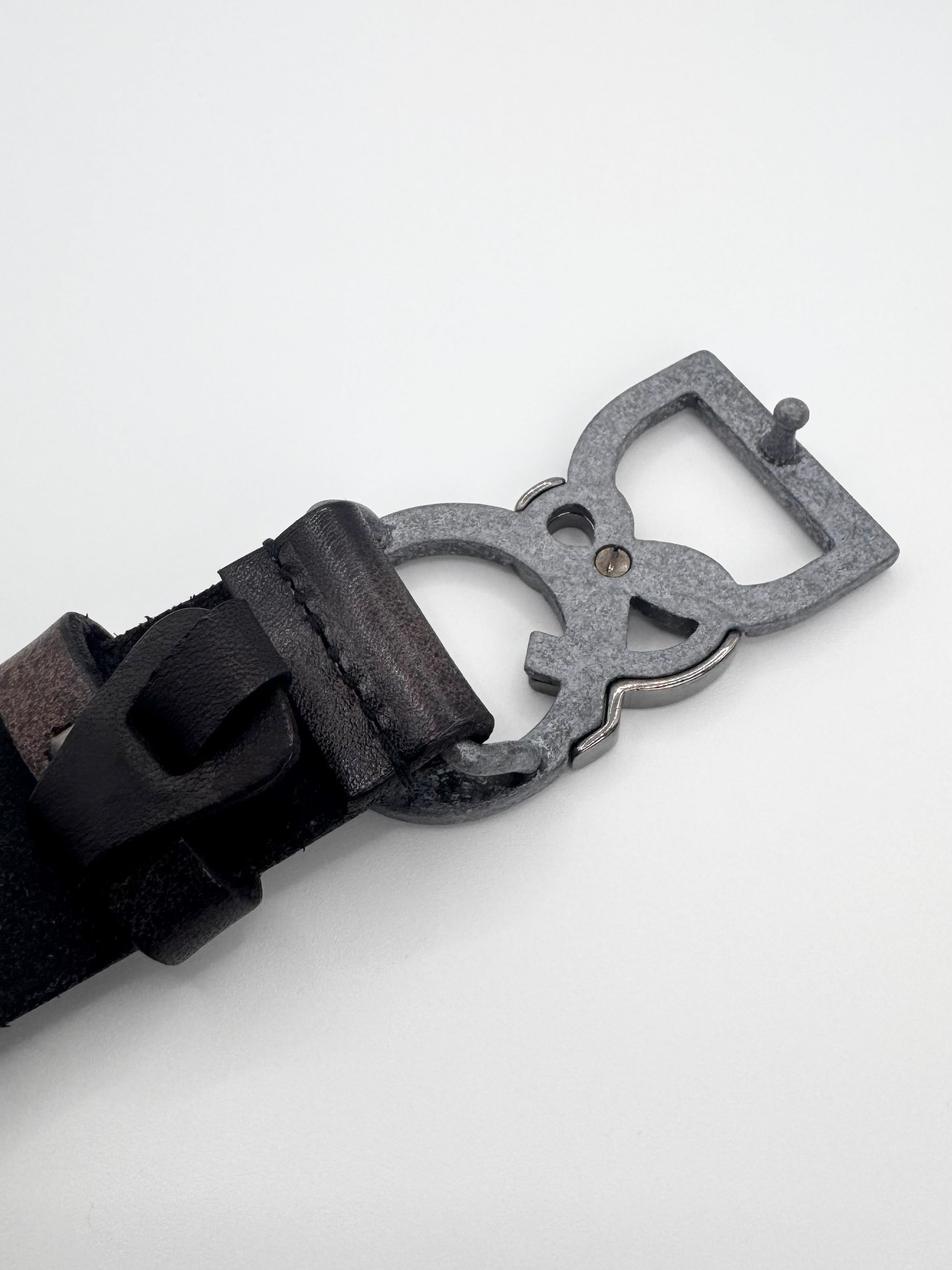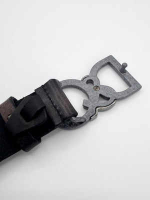 Showcased is 2000s Dolce & Gabbana black leather belt featuring a sculptural DG logo buckle with a stone-like, graphite-textured finish. The buckle showcases a contrast construction, combining a rough, industrial outer texture with a polished silver-tone DG centerpiece. Crafted in Italy, the belt is constructed from durable leather. In solid condtion with no major flaws or damages