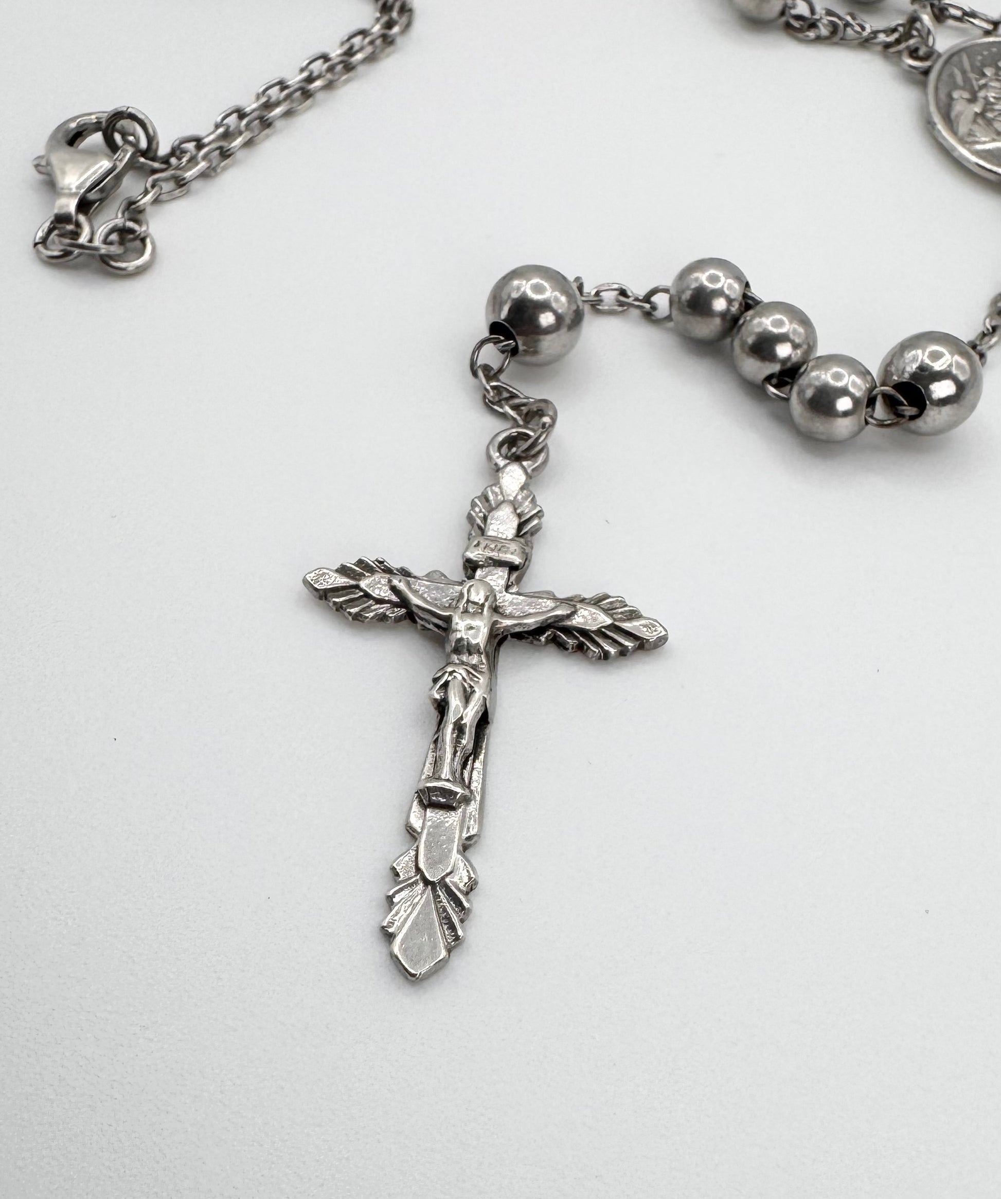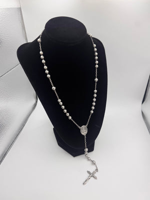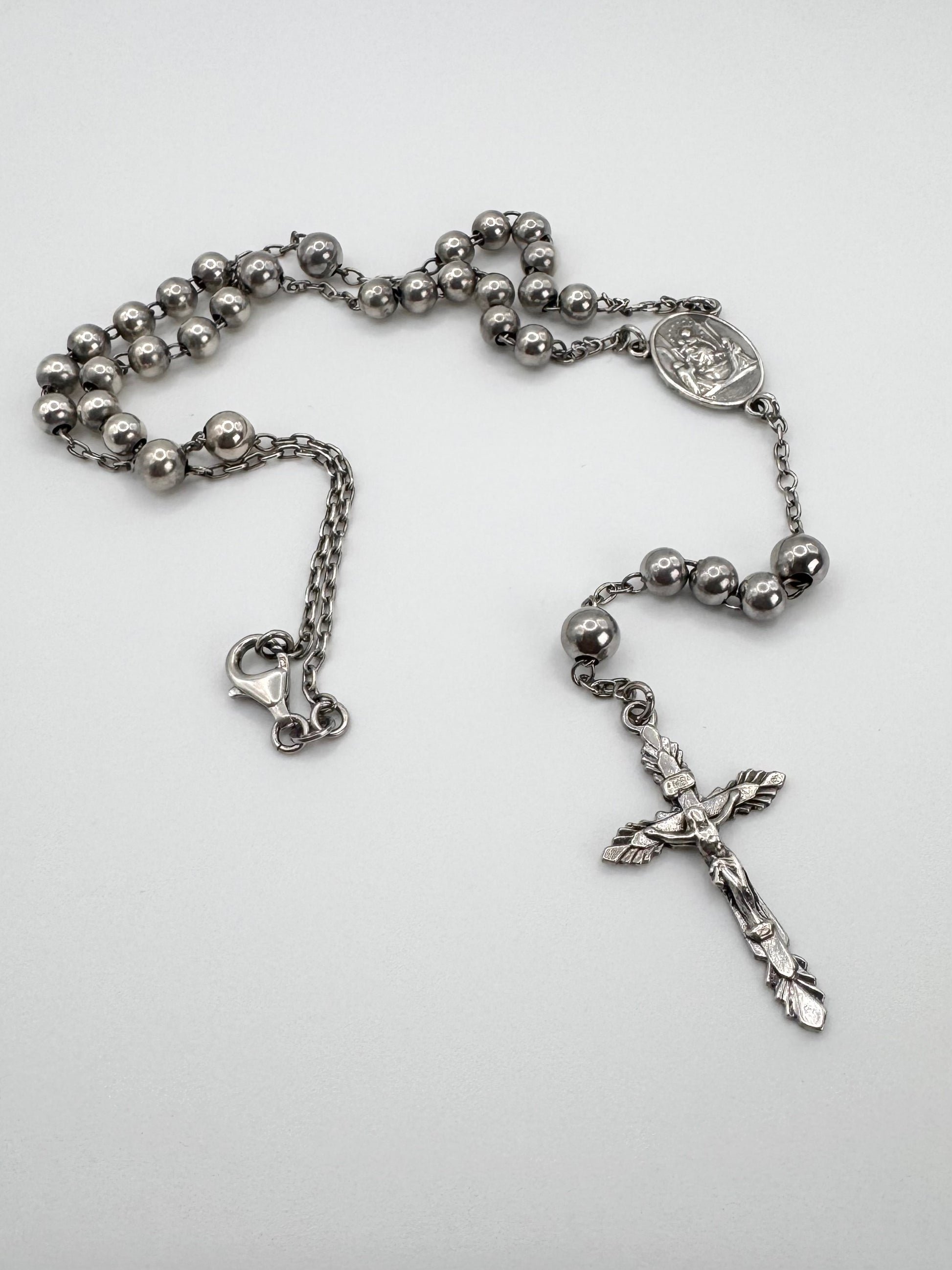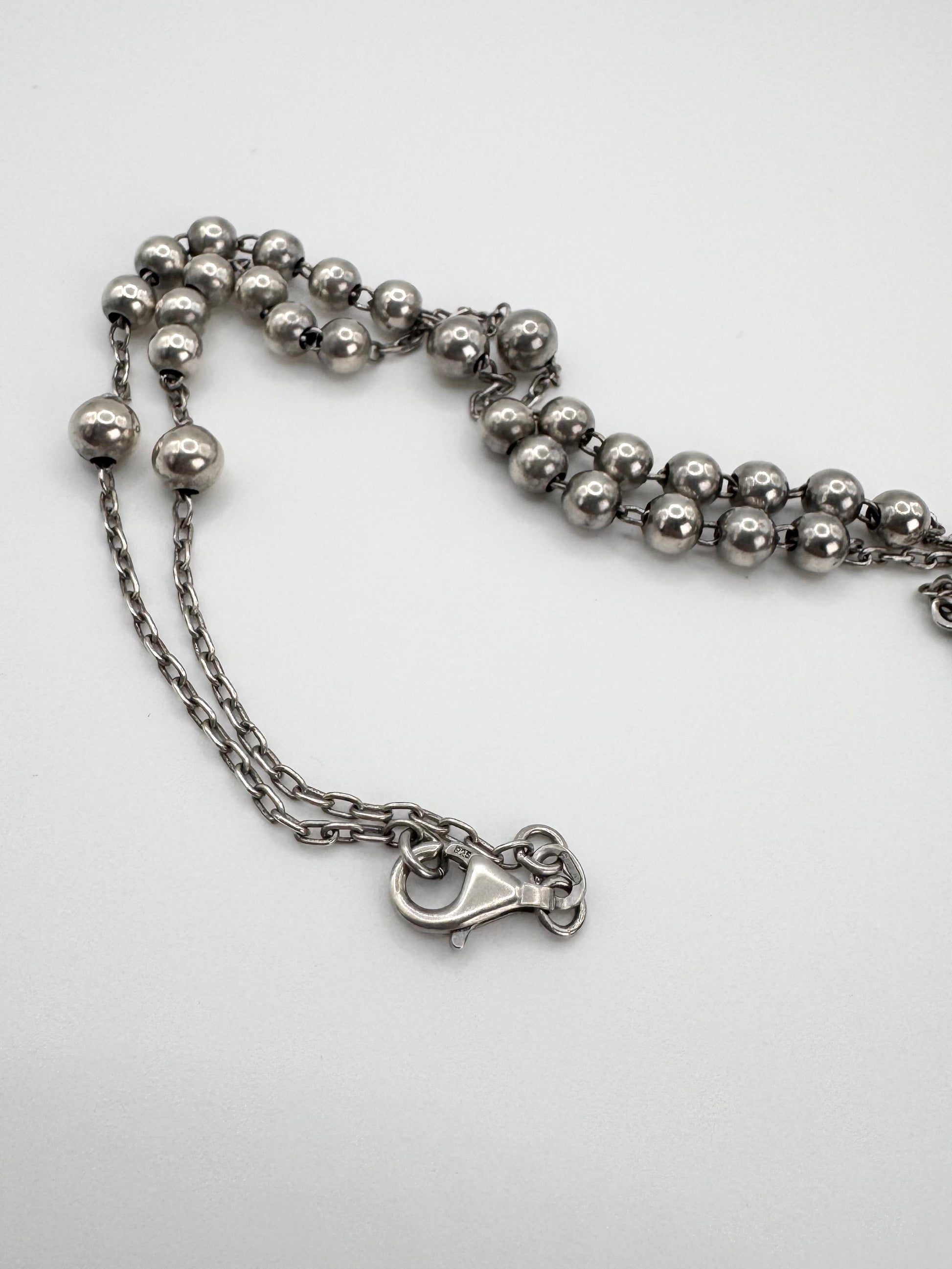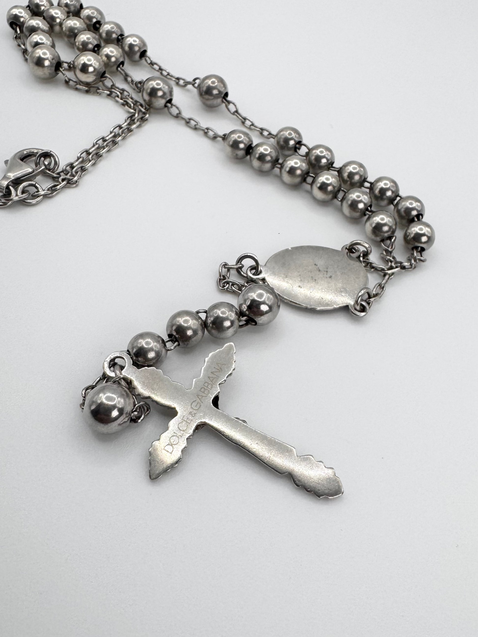 Early 2000s Dolce & Gabbana silver rosary necklace featuring polished bead links, a detailed crucifix, and an engraved medallion centerpiece. This piece reflects the brand’s iconic era where religious symbolism met bold, sensual Italian design. In fantastic condition with no flaws or damages