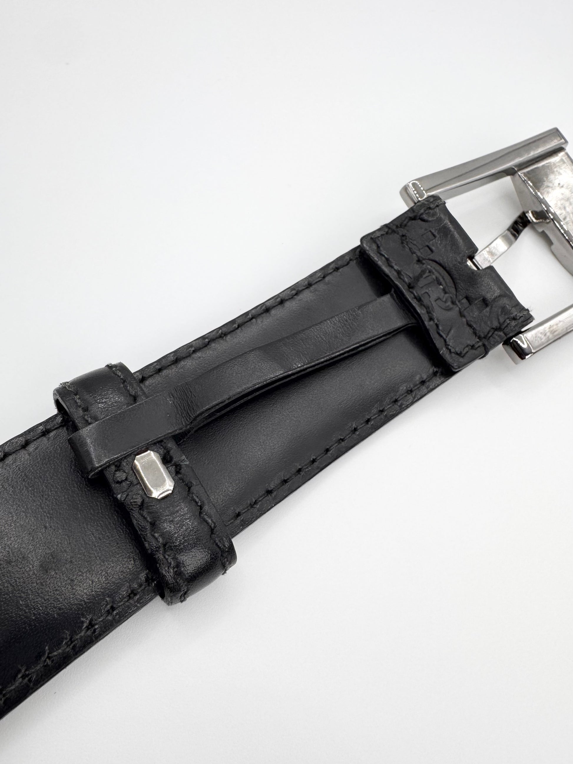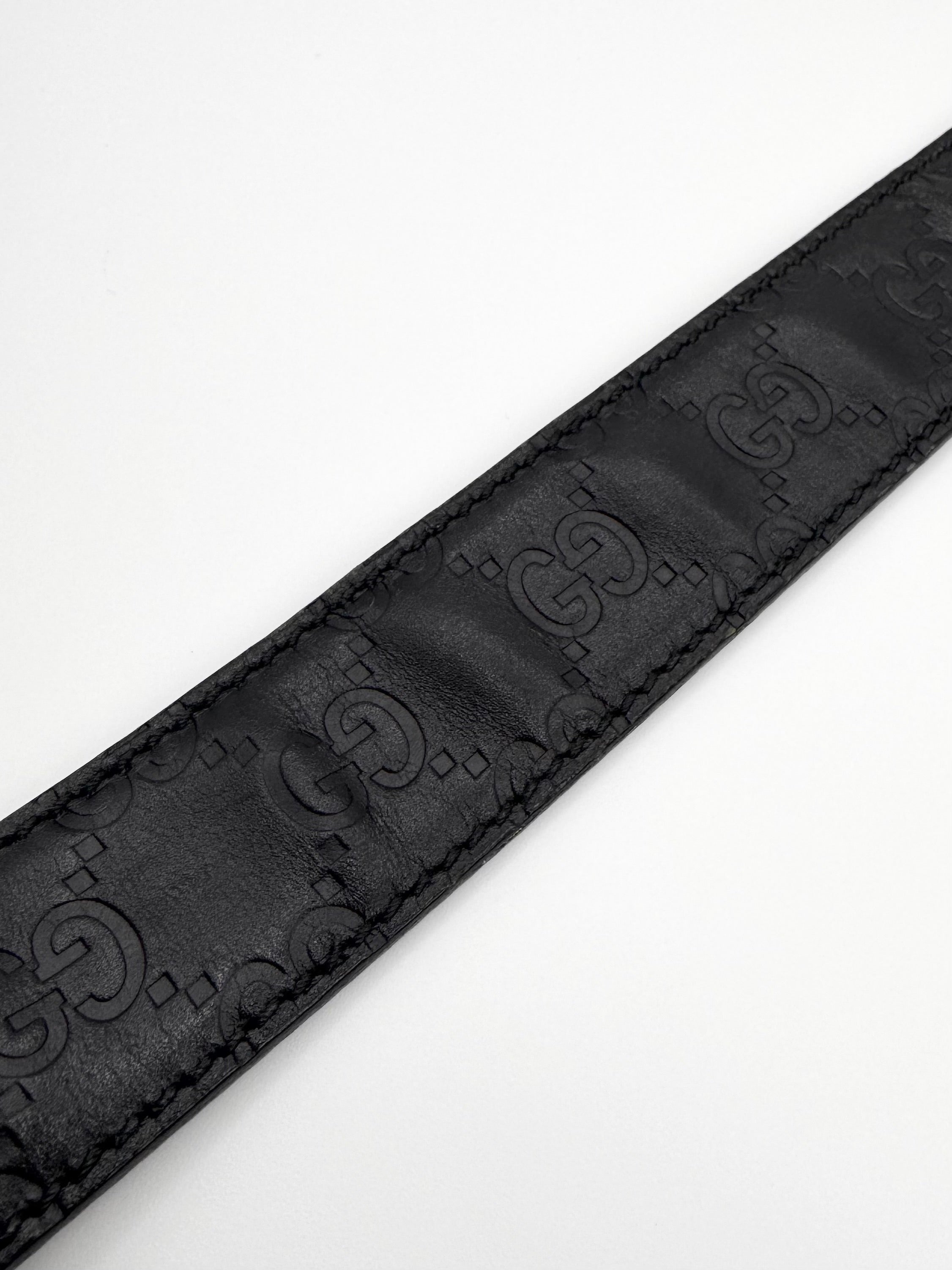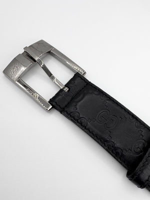 A timeless Gucci belt crafted from black Guccissima embossed leather from the late 2000s-early 2010s during the Frida Gianni era — featuring the house’s iconic repeating GG monogram pattern throughout. The sleek rectangular frame buckle with engraved “GUCCI” branding adds a refined and modern edge to a classic luxury accessory. Made in Italy, this piece showcases durable construction and a versatile design. Shows light natural wear consistent with vintage use, including minor creasing. Maintains top quality and no major flaws