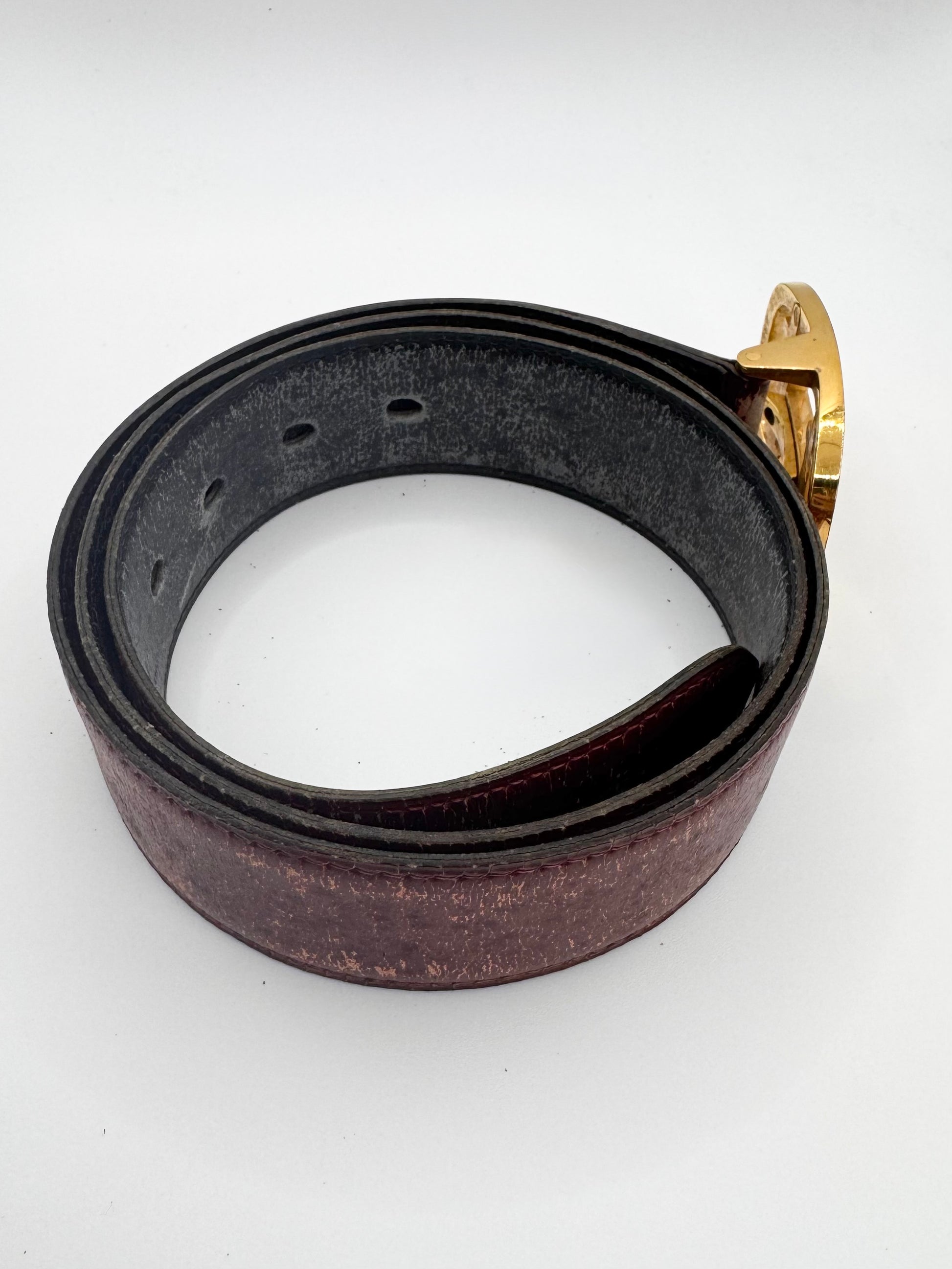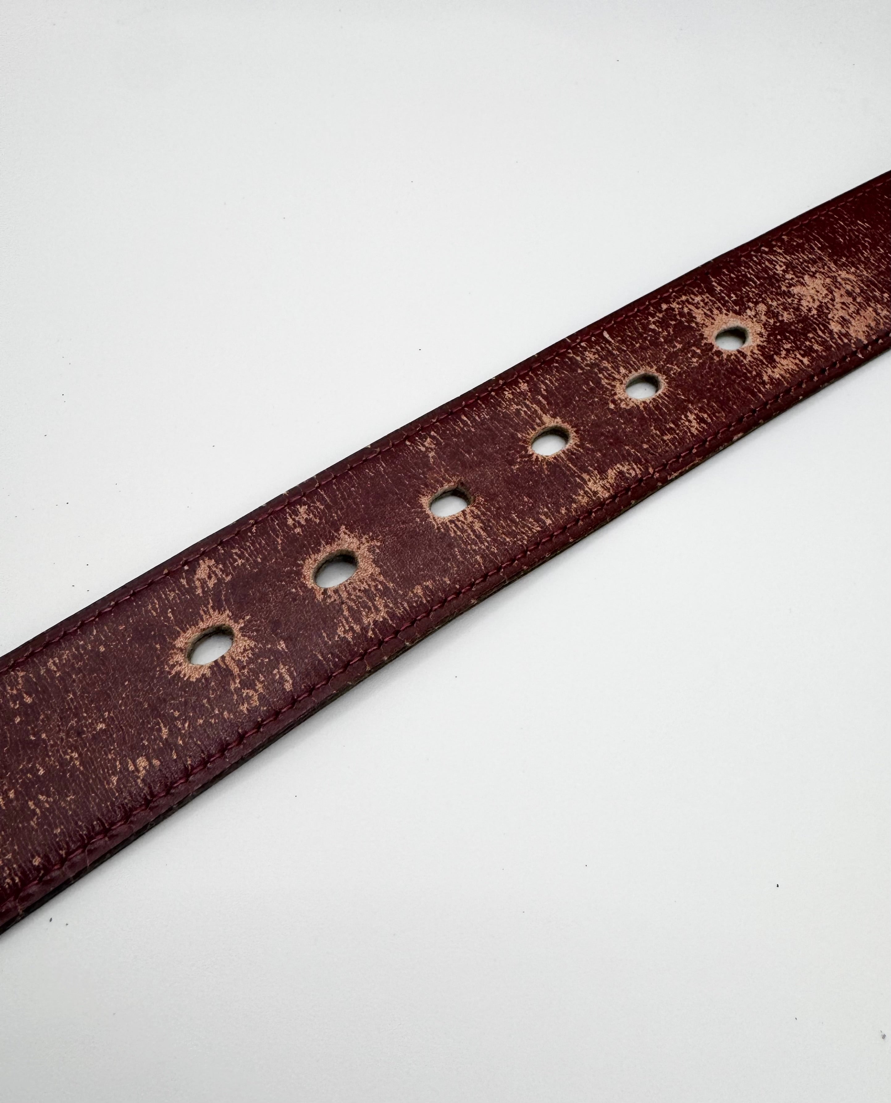 This early 2000s Hermès vintage belt features the iconic gold-tone H buckle paired with richly patinated burgundy leather. Crafted in France with exceptional attention to detail, the structured leather strap develops character with age, enhancing its archival appeal. In solid condition with aging on leather, no major damages