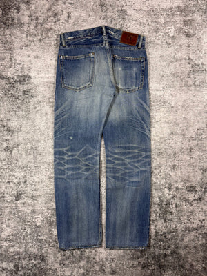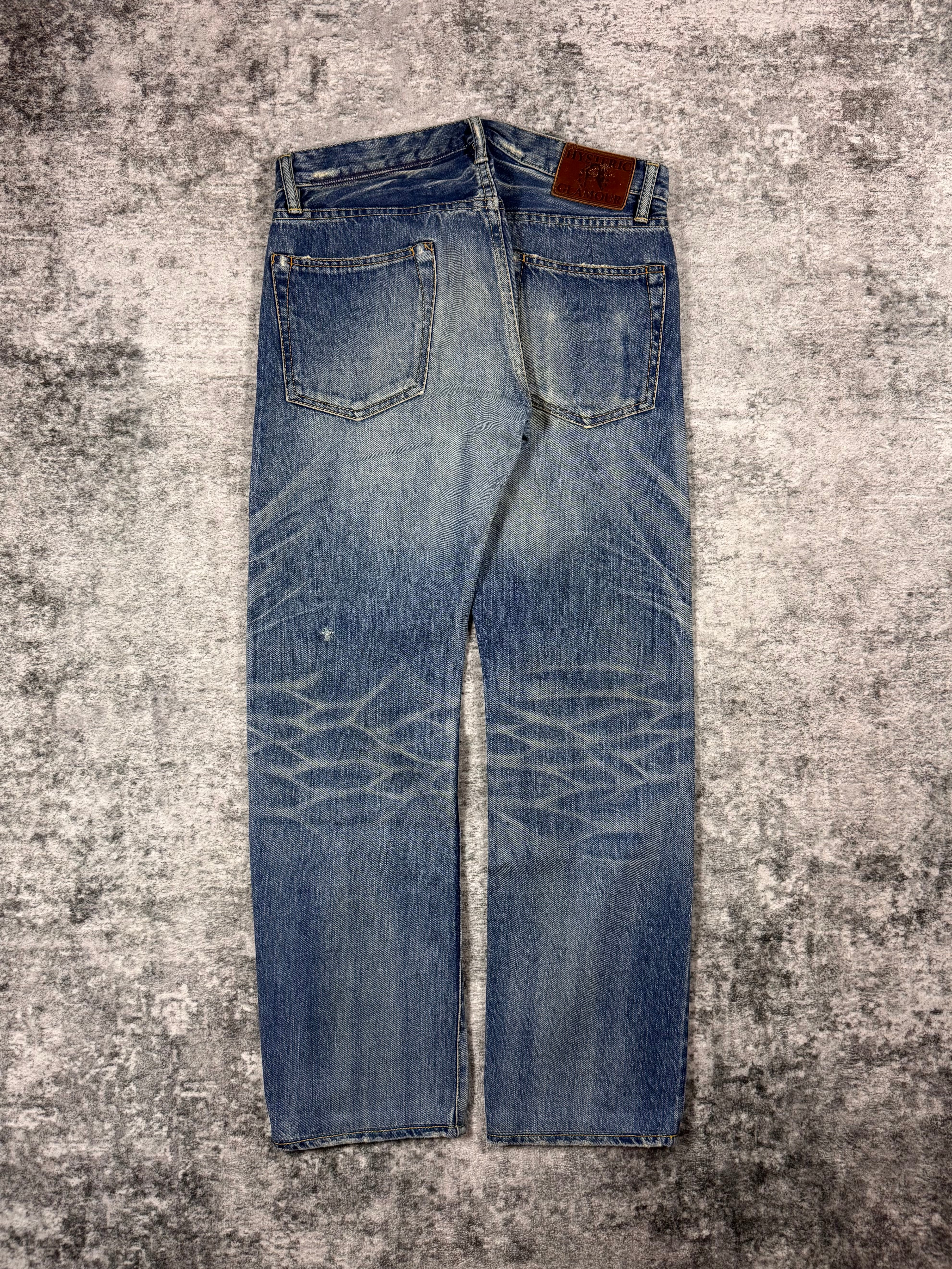 Showcased is a beautiful pair light blue wash Hysteric Glamour jeans with factory processed distressing throughout. Signature studded right pocket seen across many Hysteric Glamour denim. Honey combo whispering on the rear. In great condition with no major flaws or damages