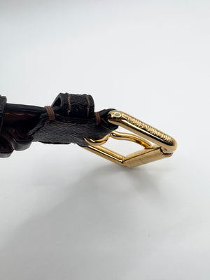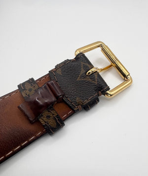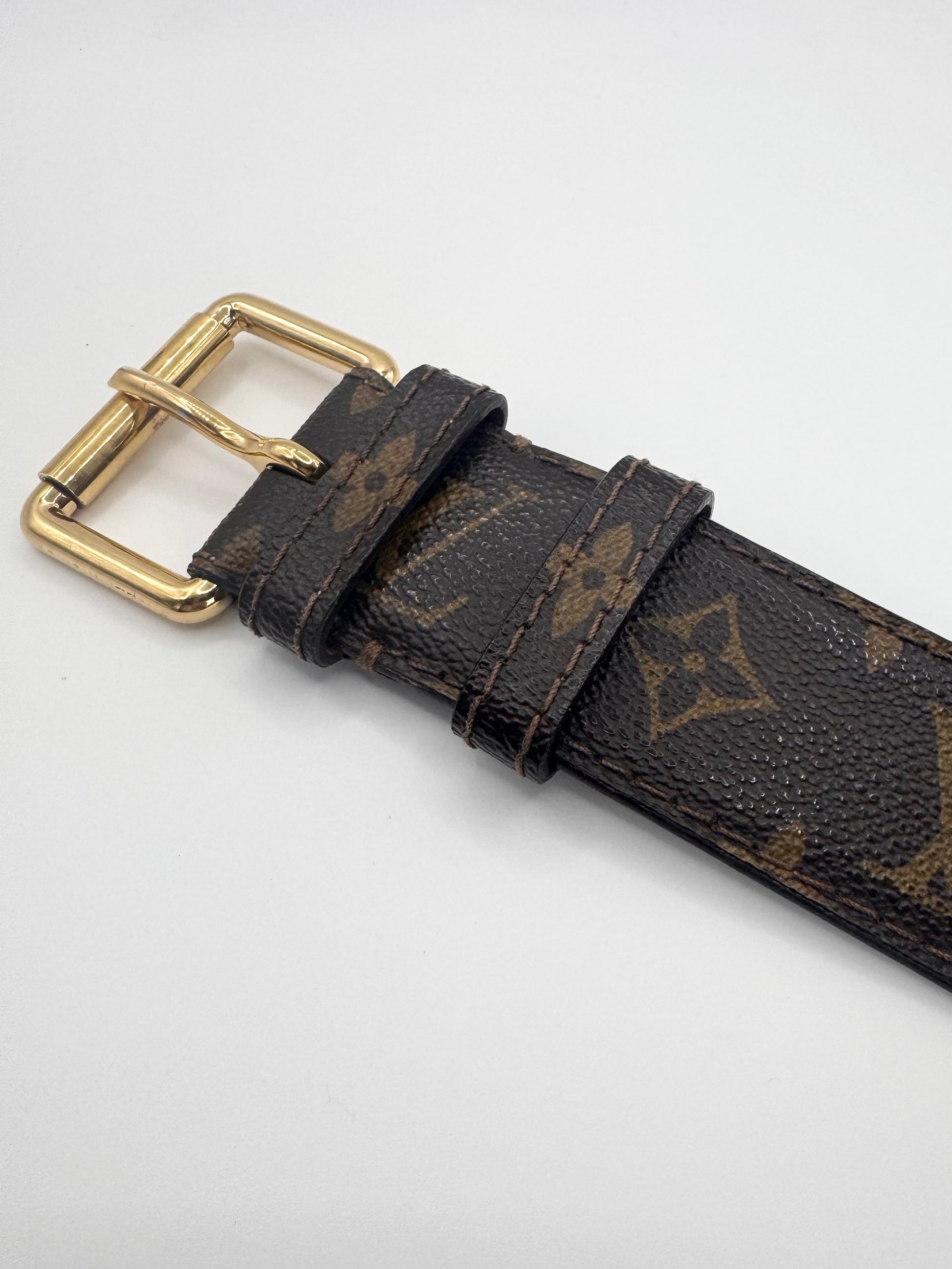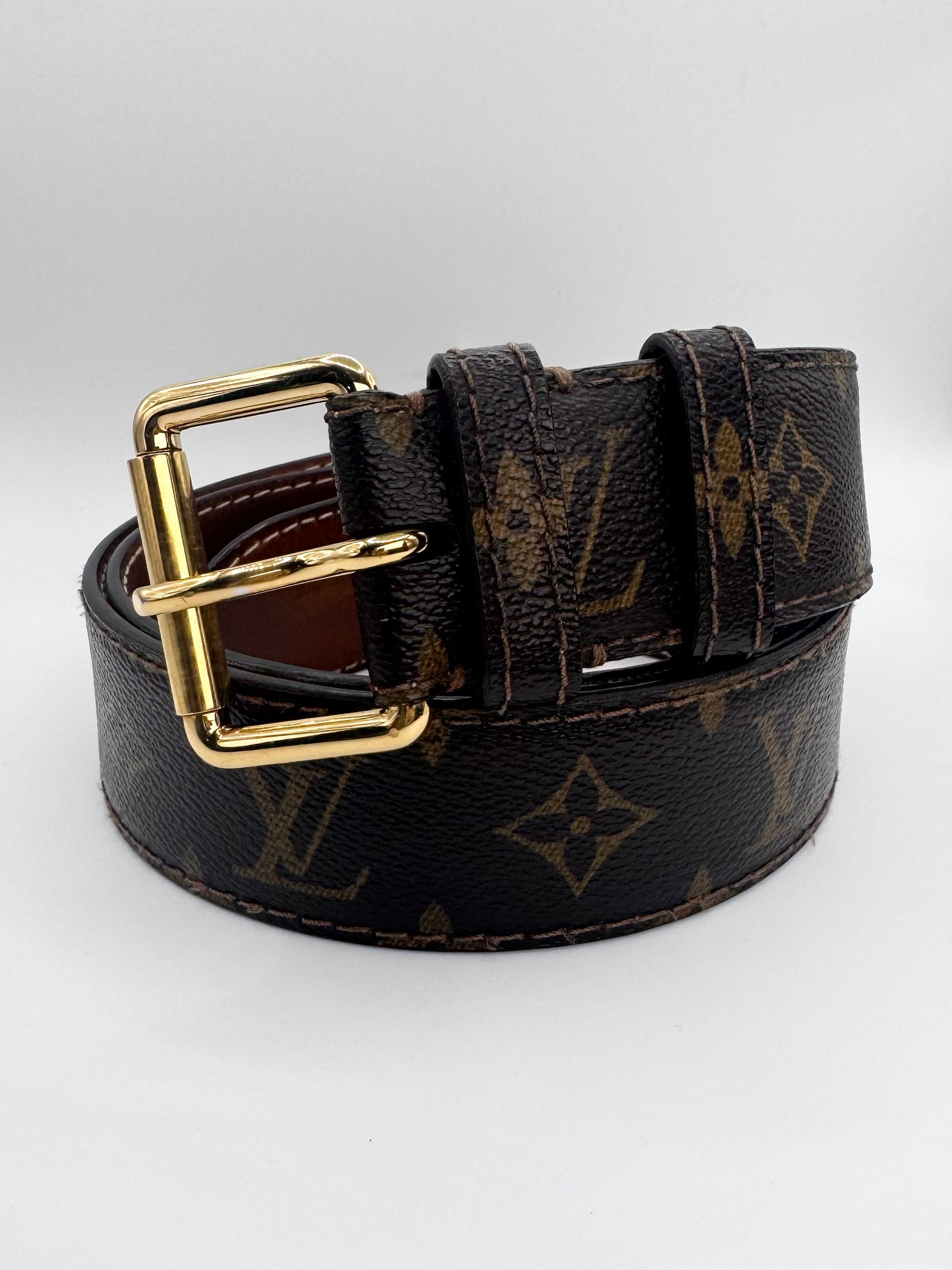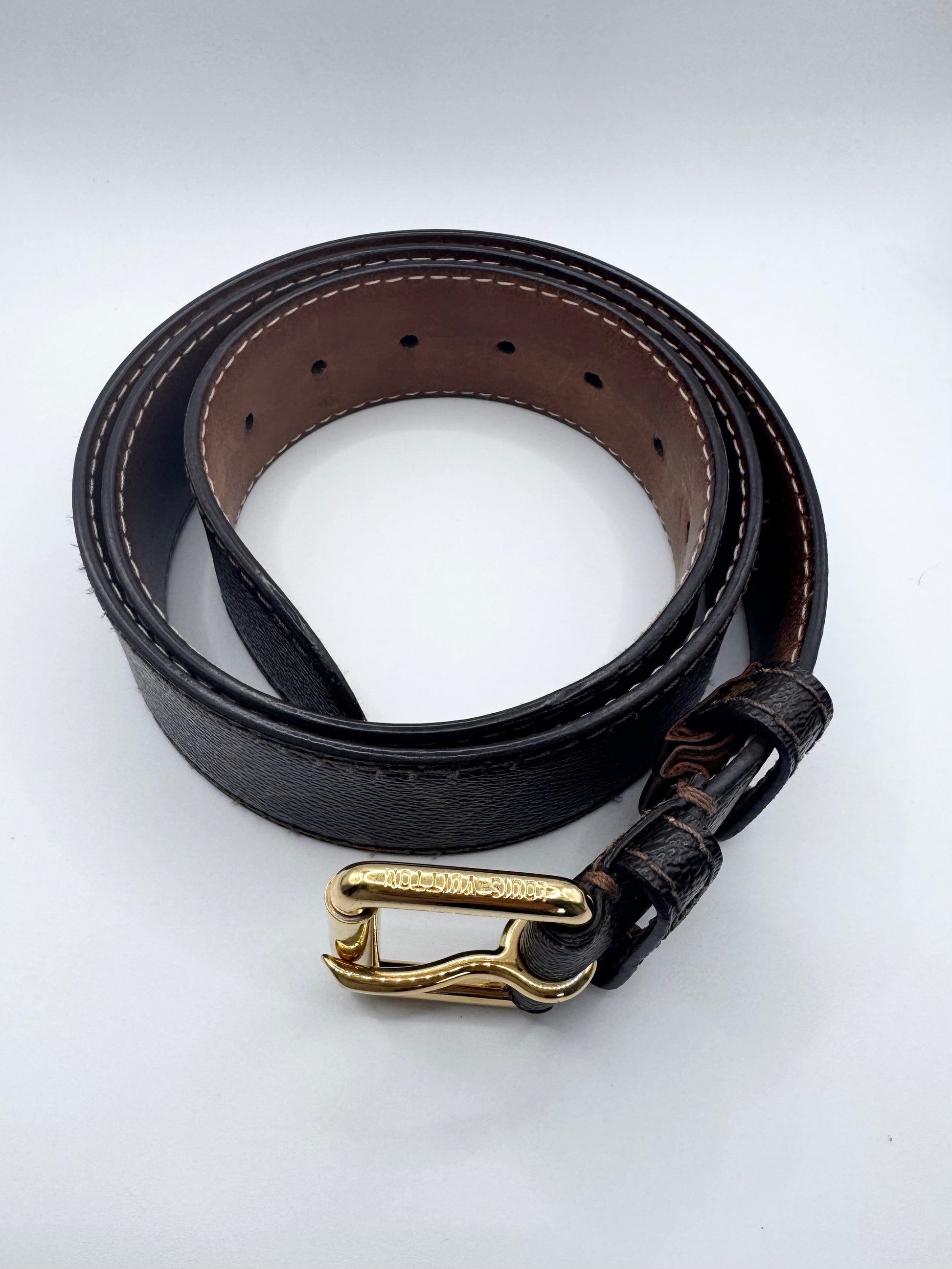 Extremely rare Louis Vuitton belt from the early 2000s, crafted from durable leather and finished with the house’s iconic monogram canvas. This piece features a highly sought-after solid brass gold-tone buckle, paired with embossed Louis Vuitton branding on the interior, a detail characteristic of early Marc Jacobs–era accessories. Beautifully preserved in exceptional condition, the belt shows no flaws or damage and stands as a timeless collector’s piece with enduring appeal.