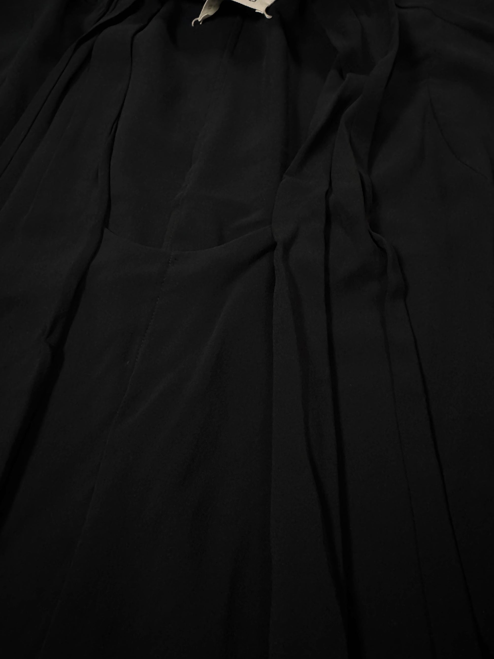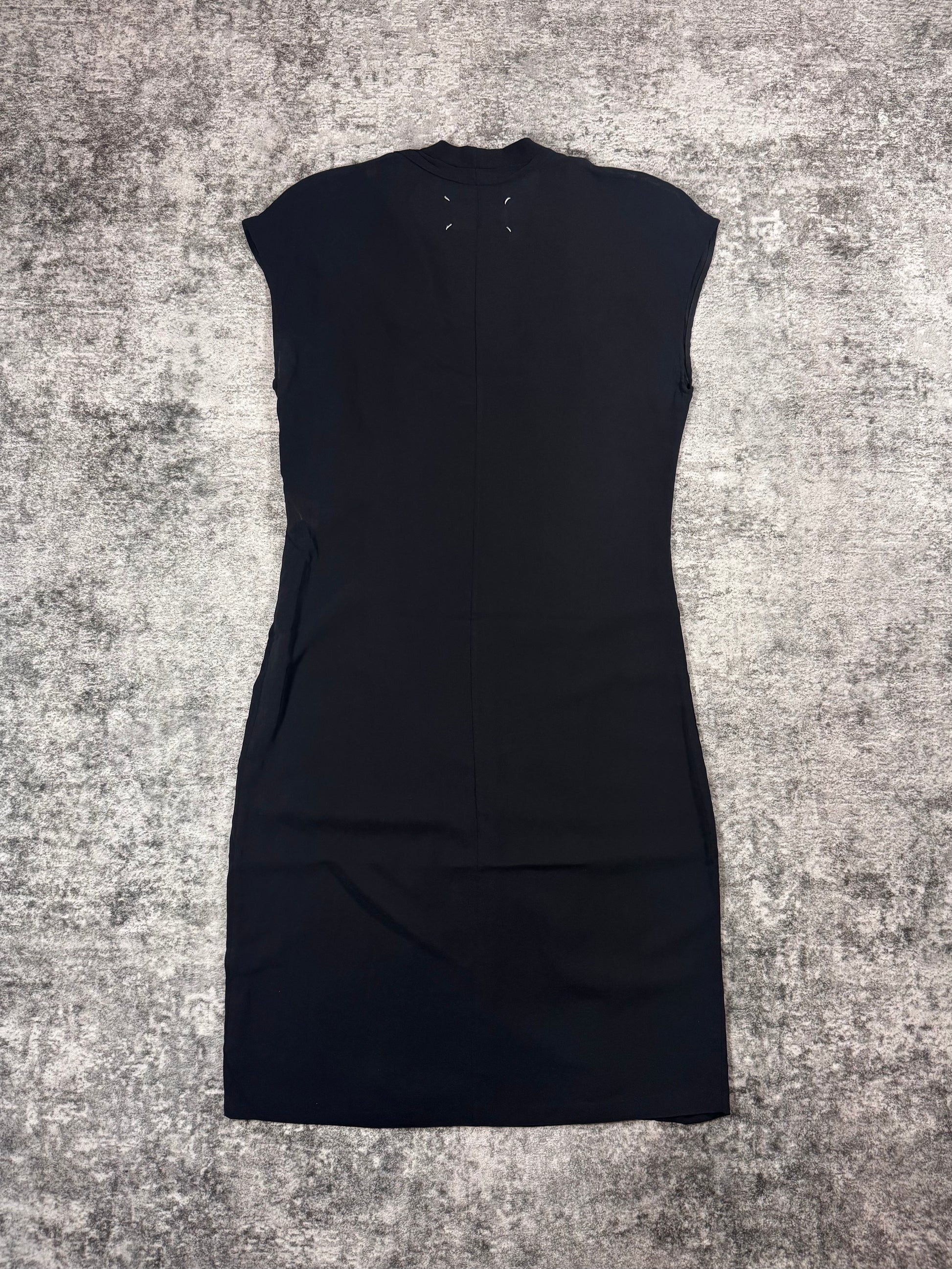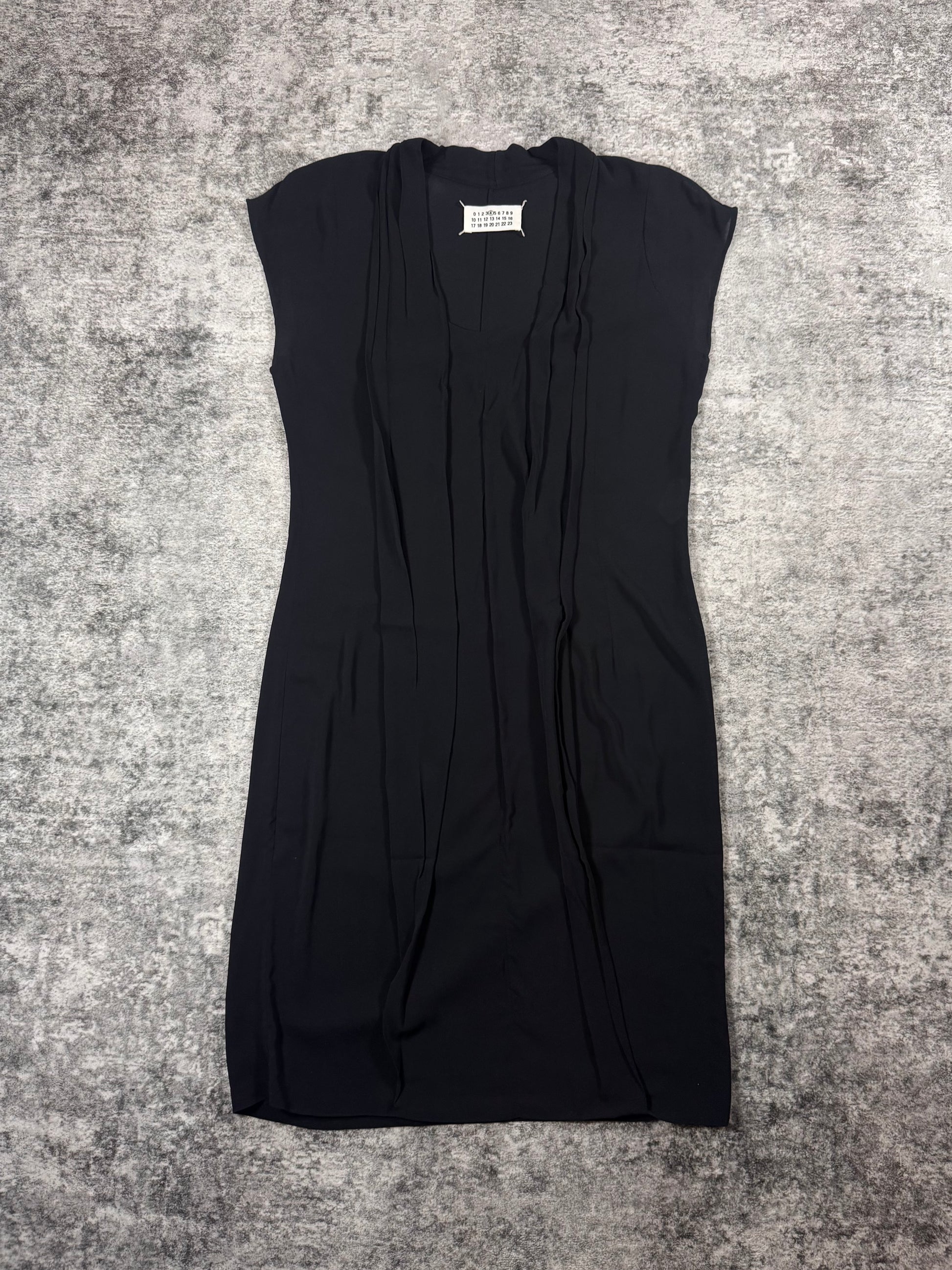 Refined early-2000s Maison Margiela sleeveless dress crafted in fluid black fabric, featuring elongated draped panel detailing cascading down the front for a subtle yet architectural effect. The clean, minimal silhouette contrasts with soft vertical folds, embodying Margiela’s signature balance between structure and movement. Finished with the iconic four-stitch label at the neckline. In beautiful condition with no major flaws or damages