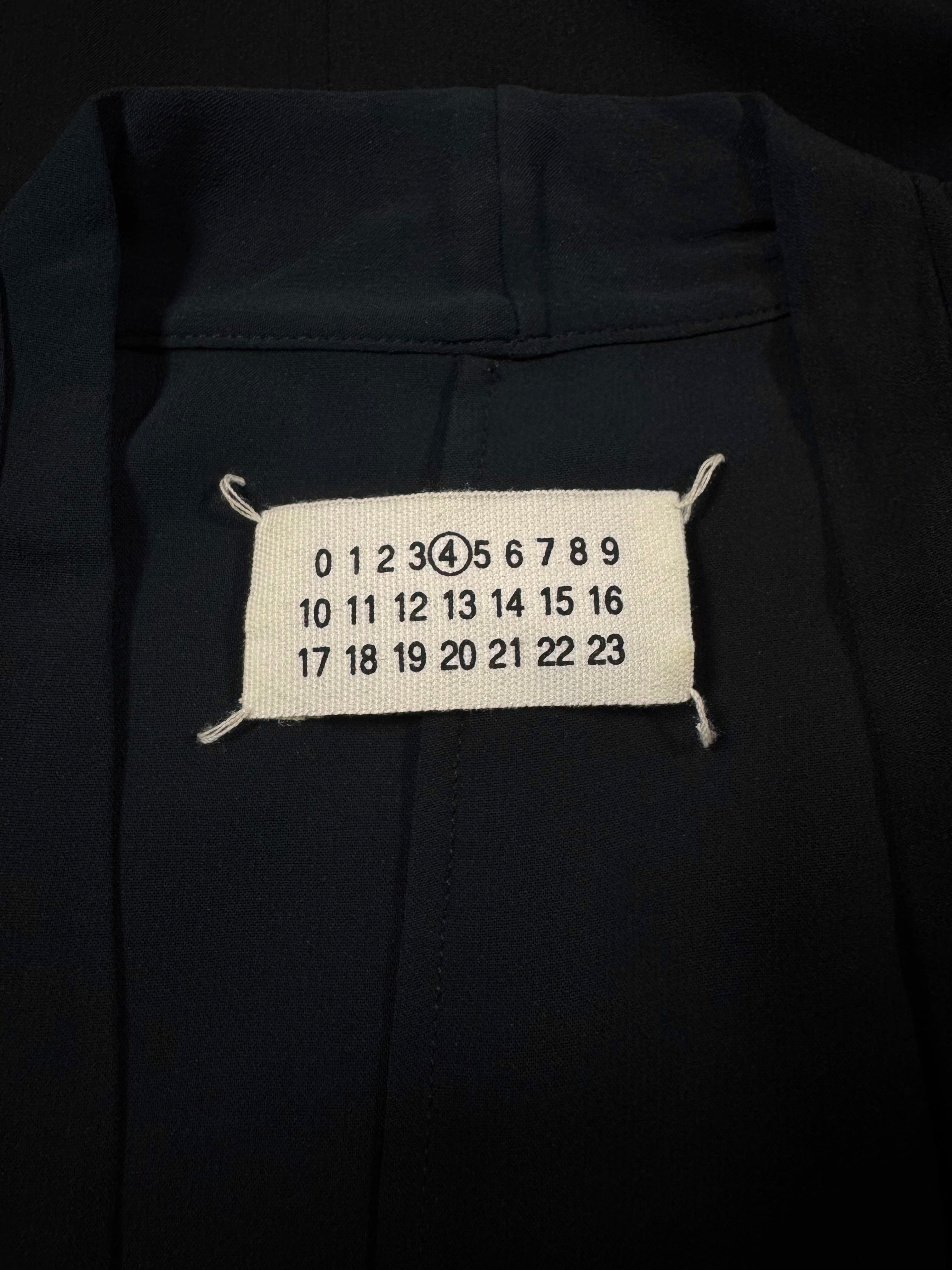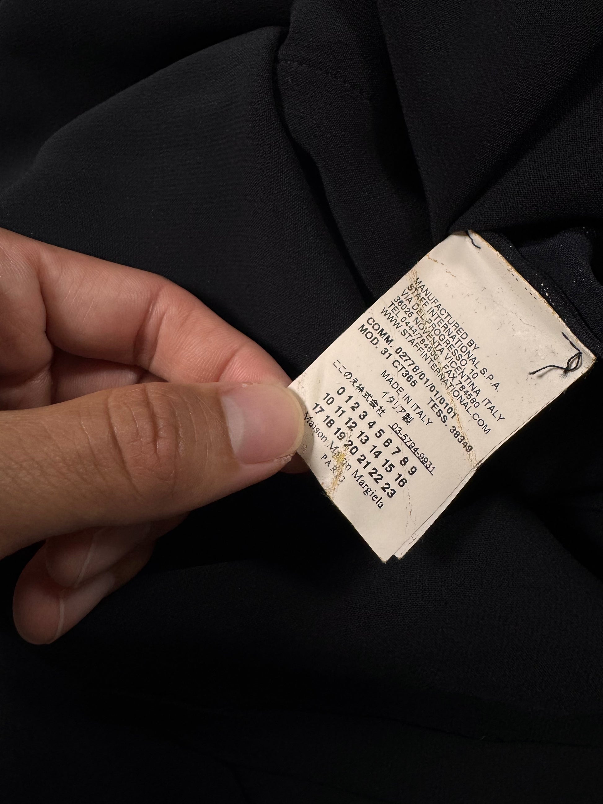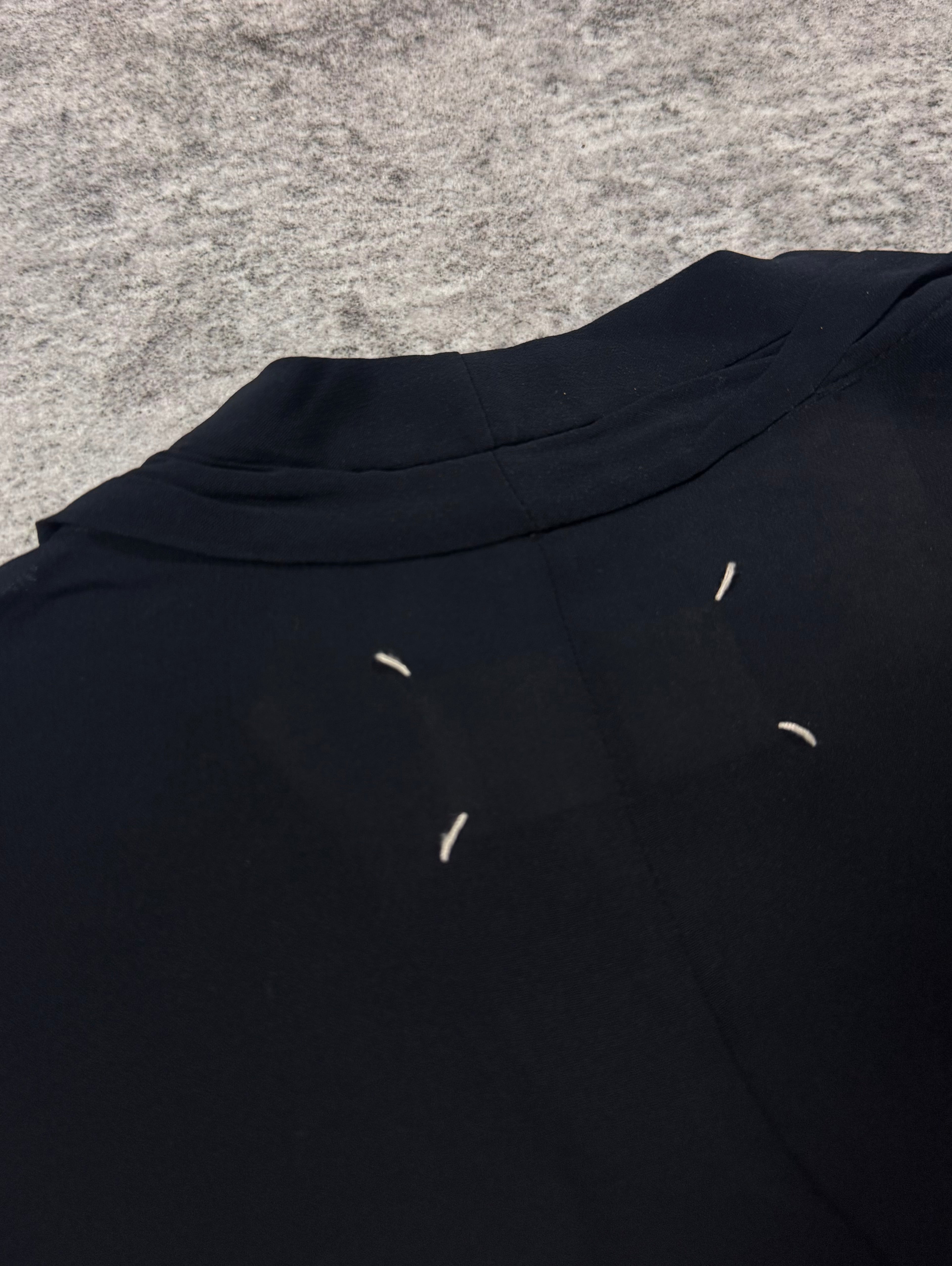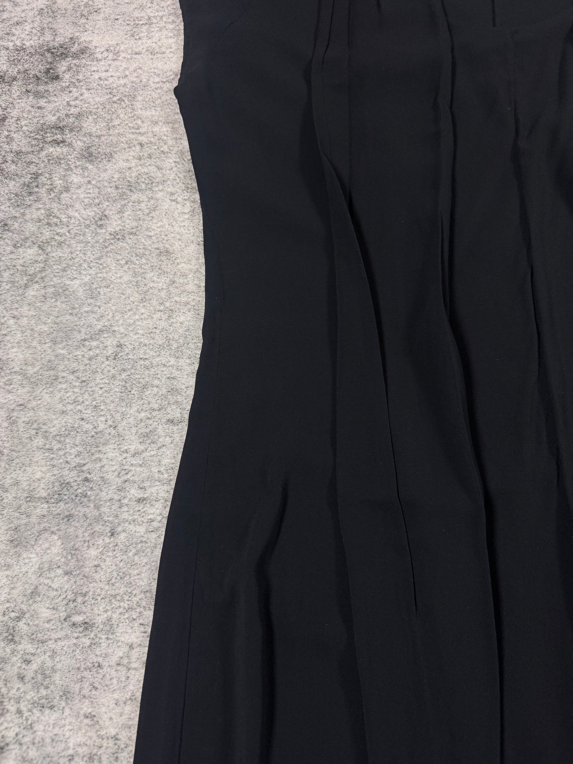 Refined early-2000s Maison Margiela sleeveless dress crafted in fluid black fabric, featuring elongated draped panel detailing cascading down the front for a subtle yet architectural effect. The clean, minimal silhouette contrasts with soft vertical folds, embodying Margiela’s signature balance between structure and movement. Finished with the iconic four-stitch label at the neckline. In beautiful condition with no major flaws or damages