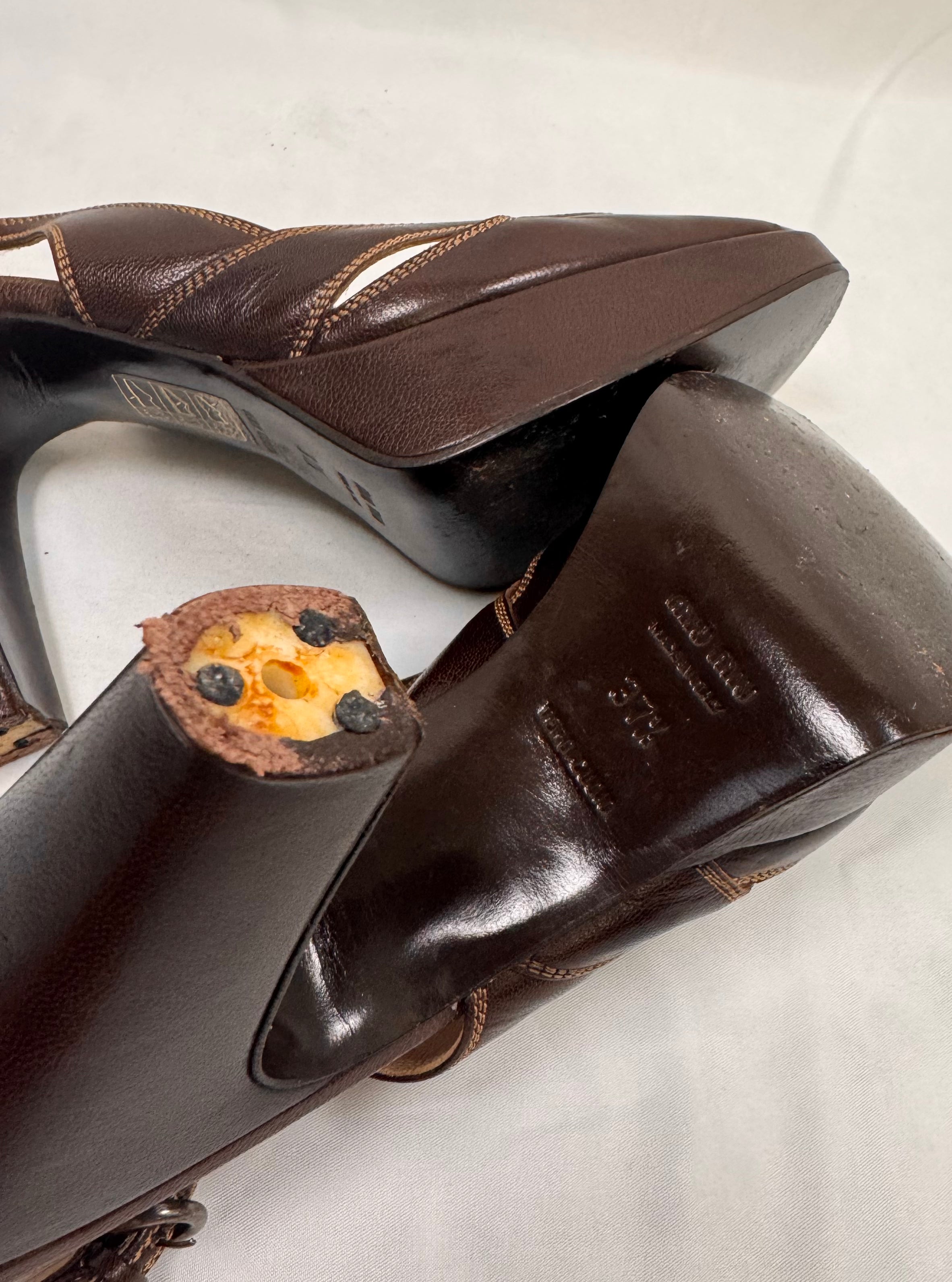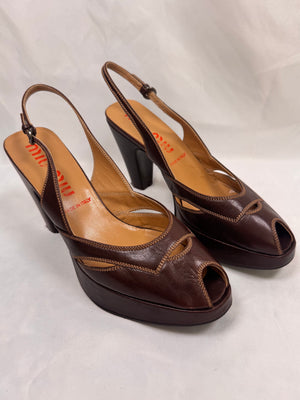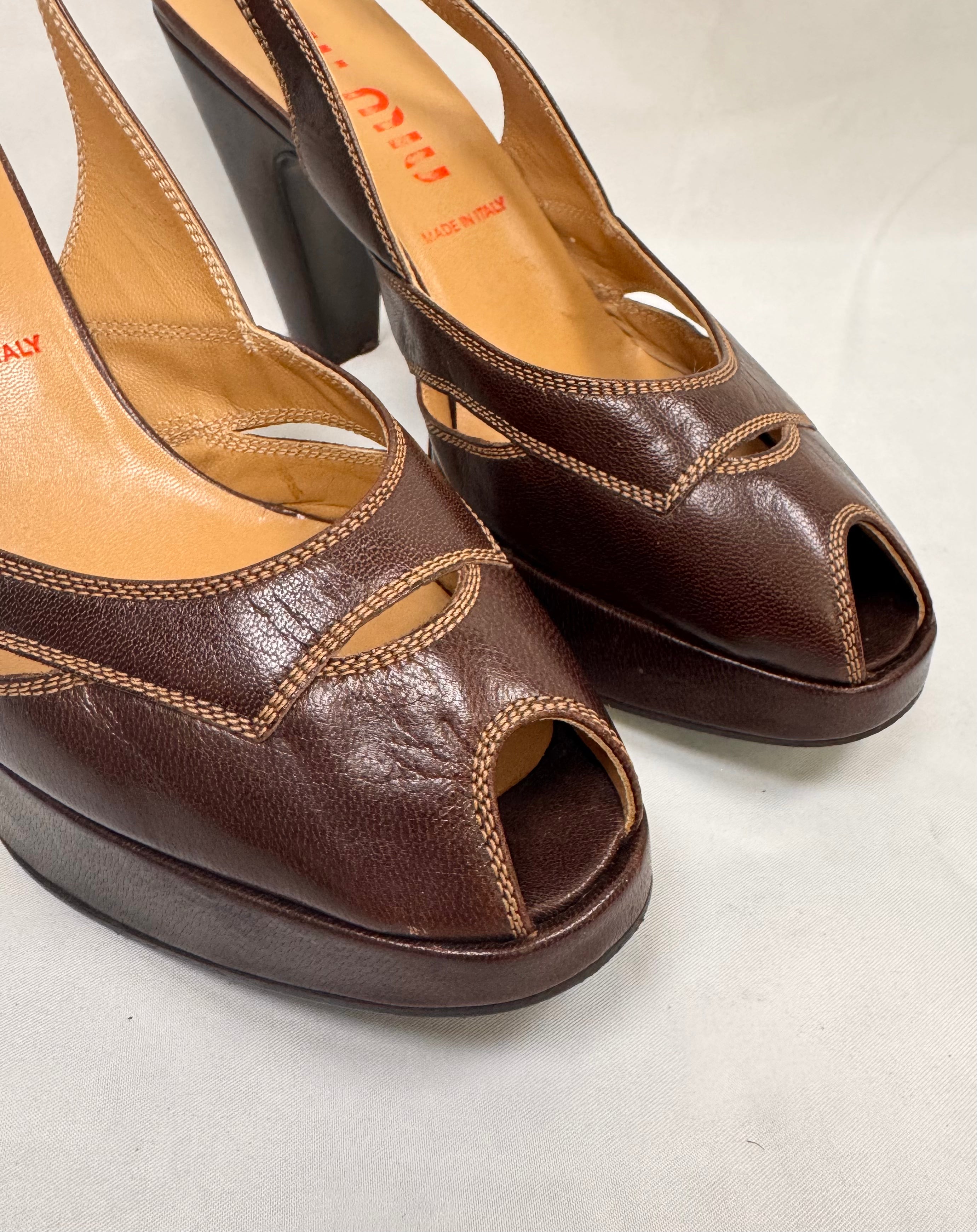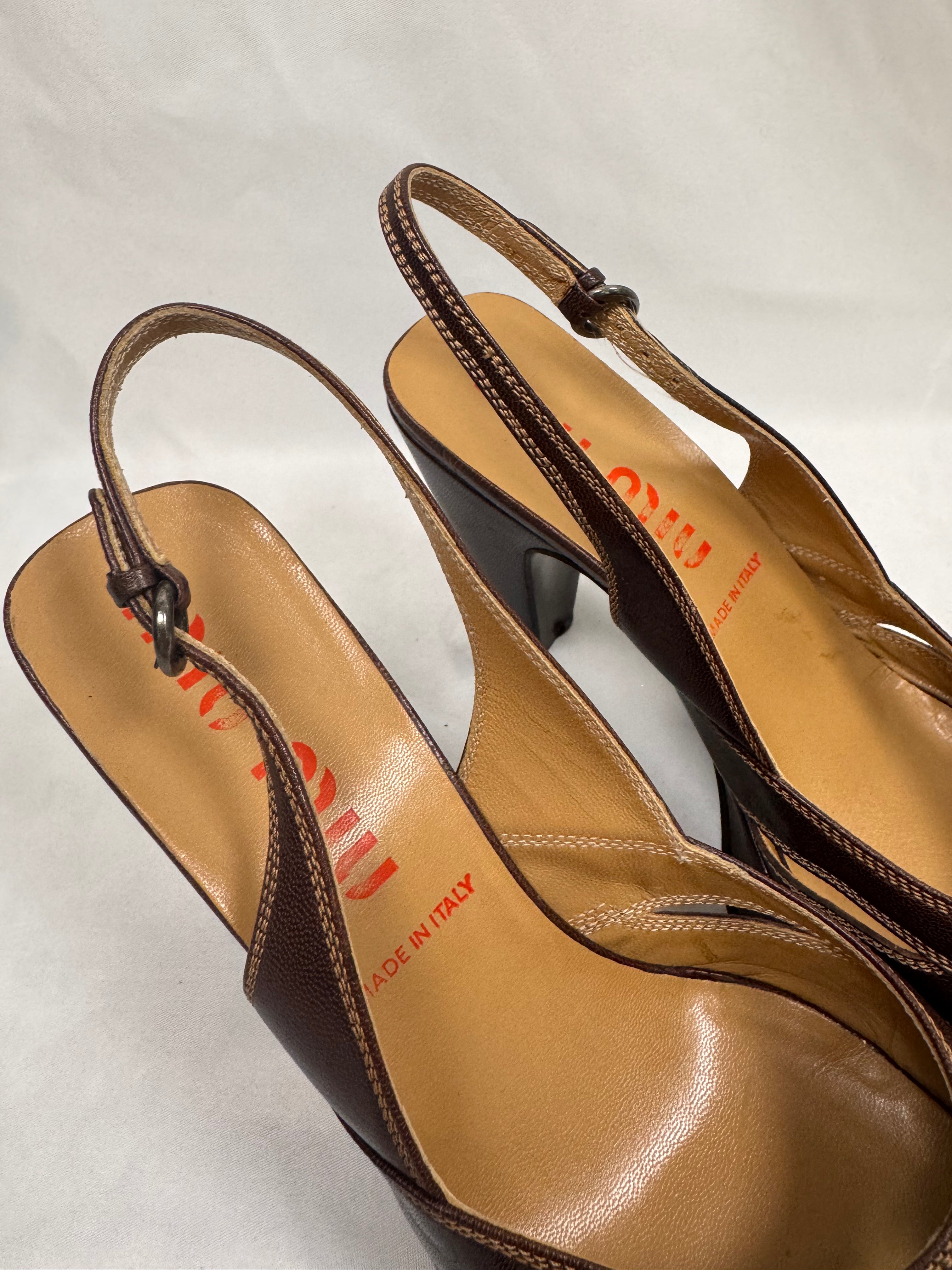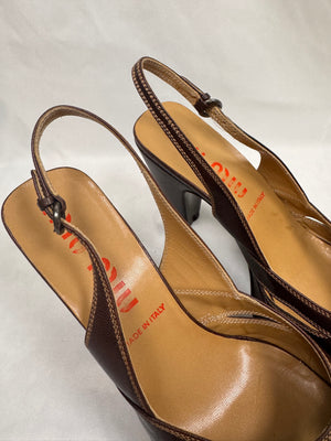 2000s Miu Miu Brown Leather Peep-Toe Slingback Pumps