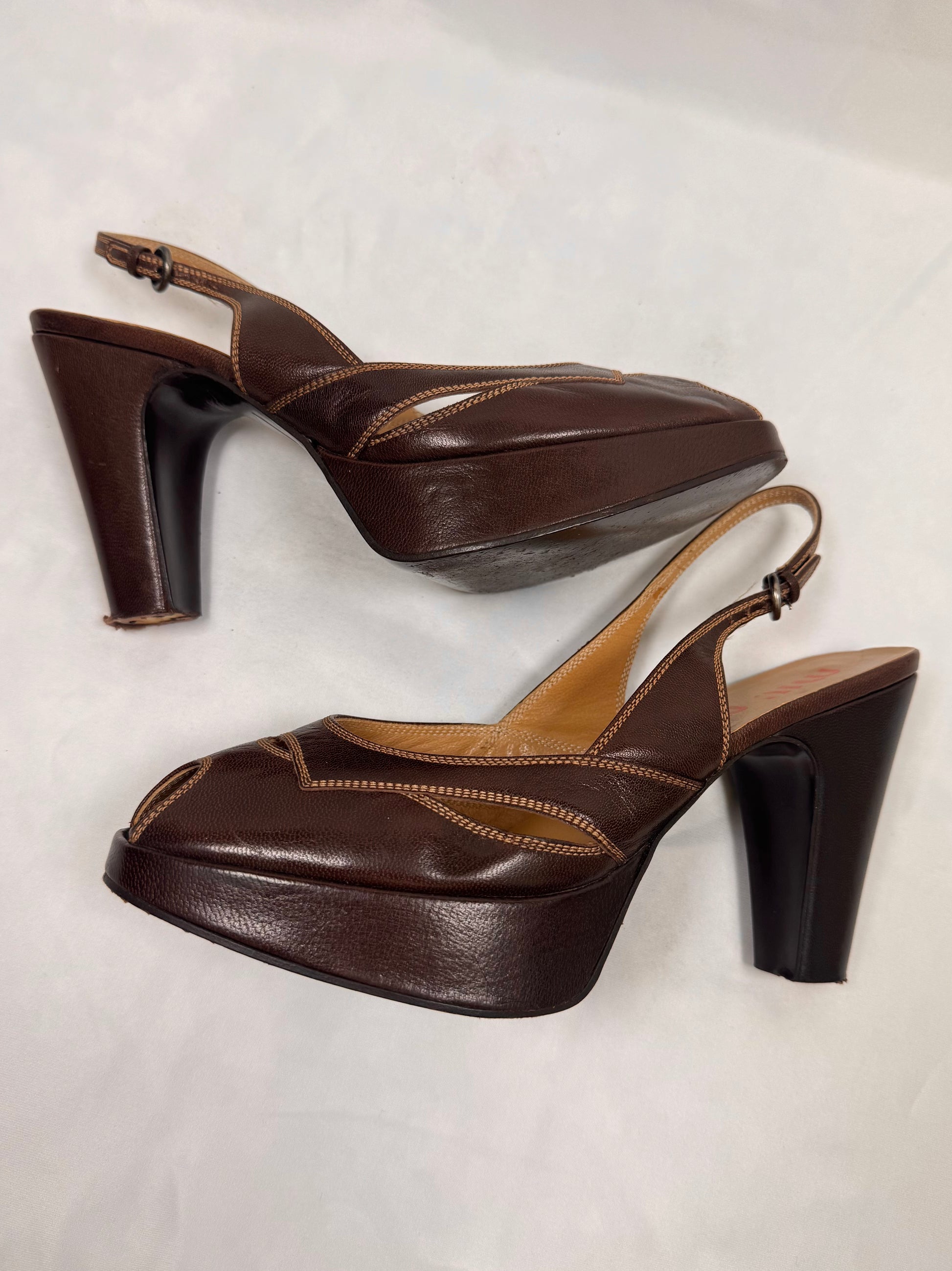 Beautiful early 2000s Miu Miu brown leather pumps with thick contrast top-stitching and tan insole with classic branding. Raised platform under the toe and peep-toe front. In good overall condition with missing heel tip (easily fixable)