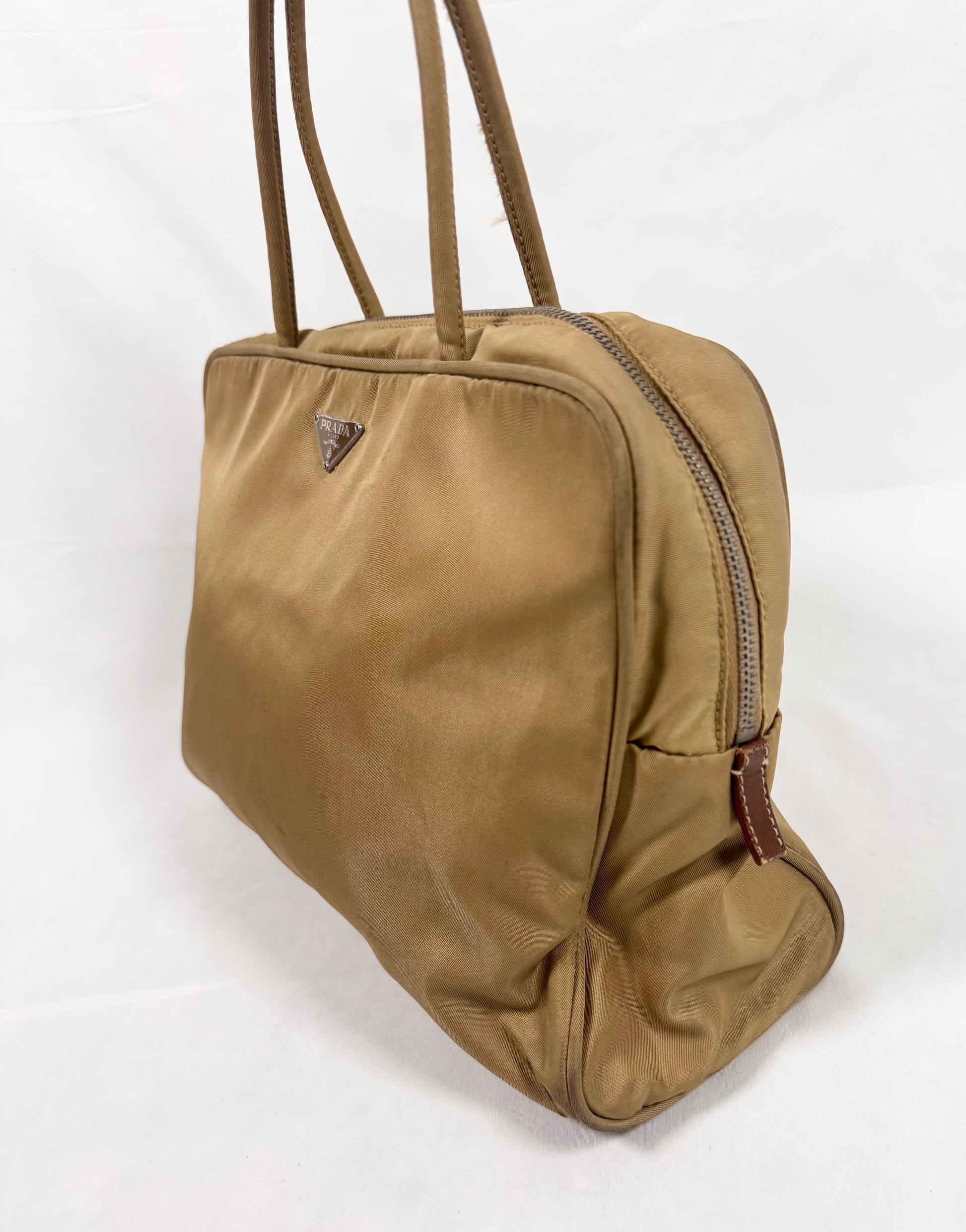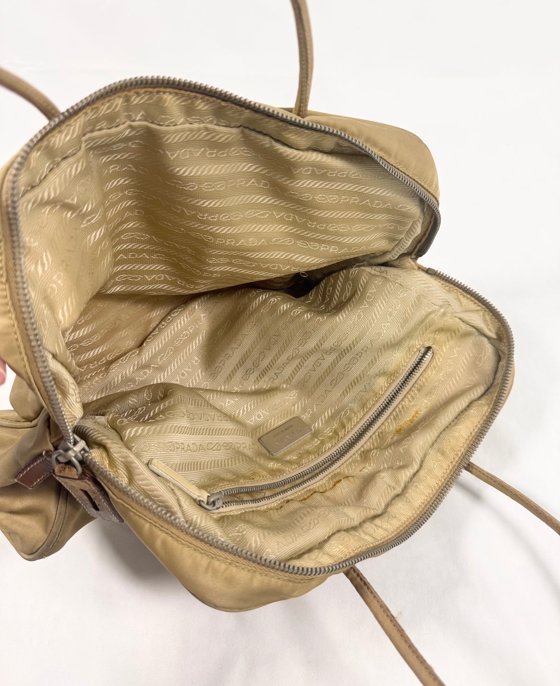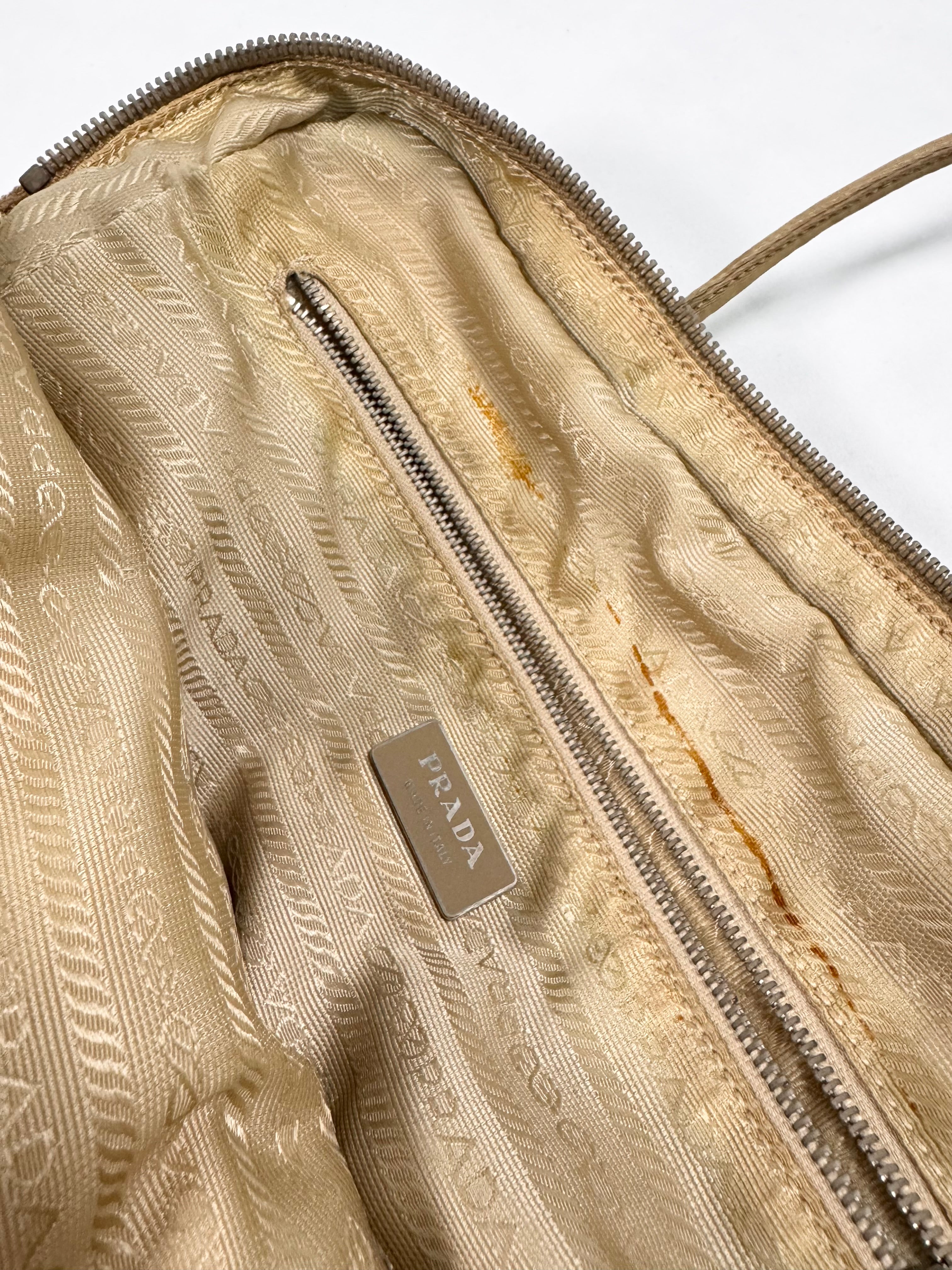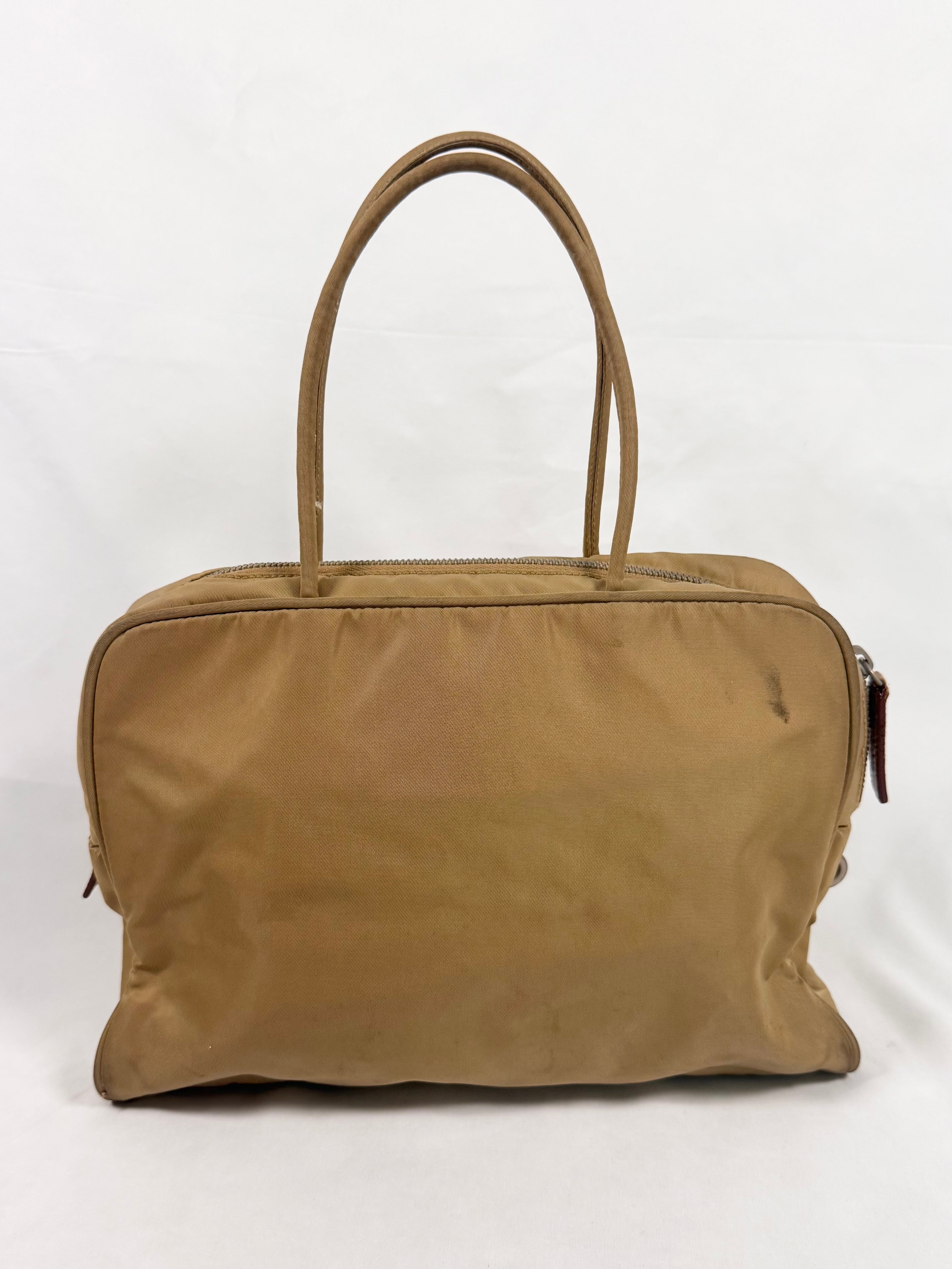From the early 2000s this gorgeous bag comes in the 'Camillo' color way with the iconic triangular Prada logo plate on the front side. One main storage compartment with a mini inner zipper pocket as well. In solid condition with some minor flaws some throughout; maintains great quality