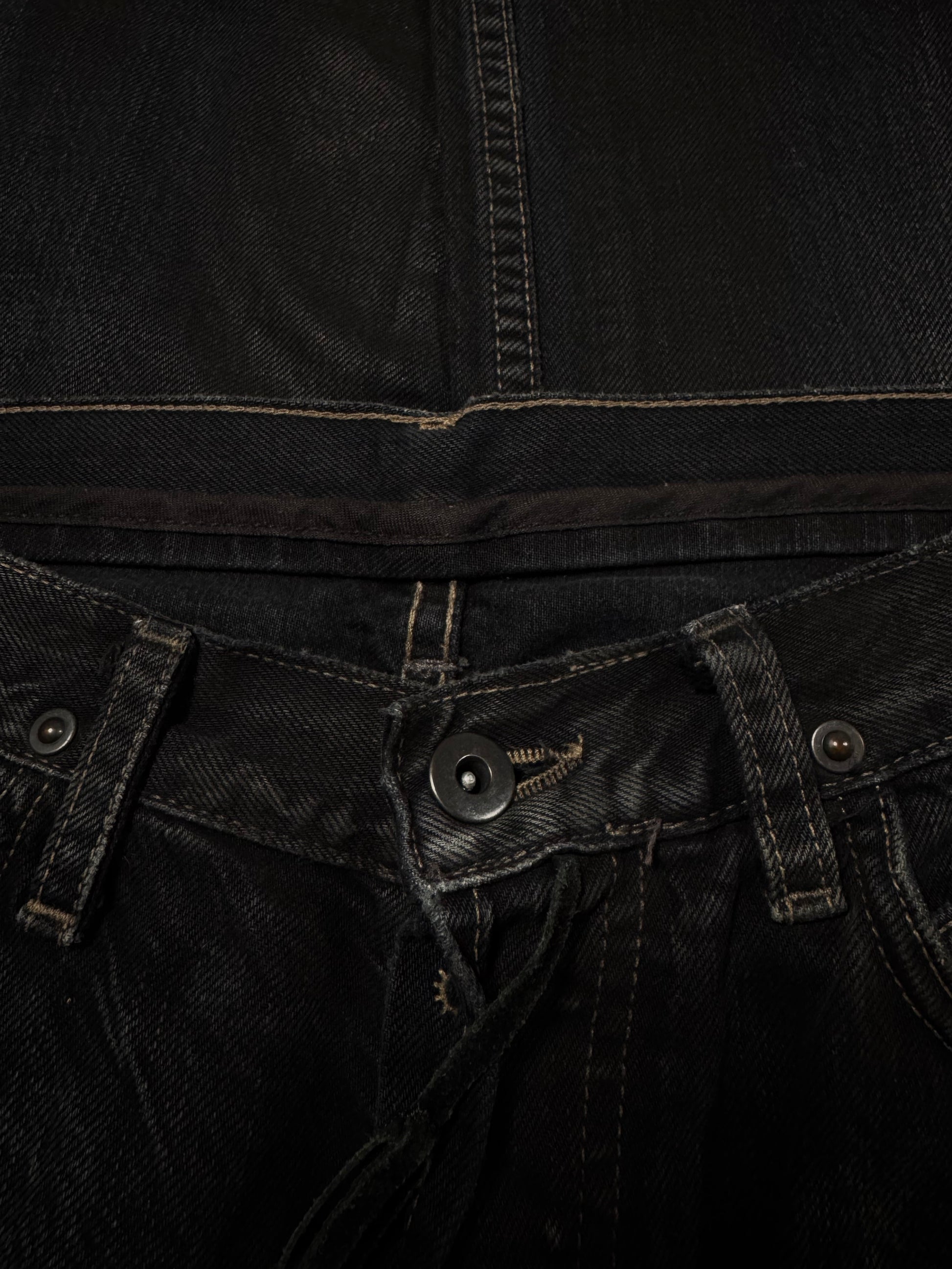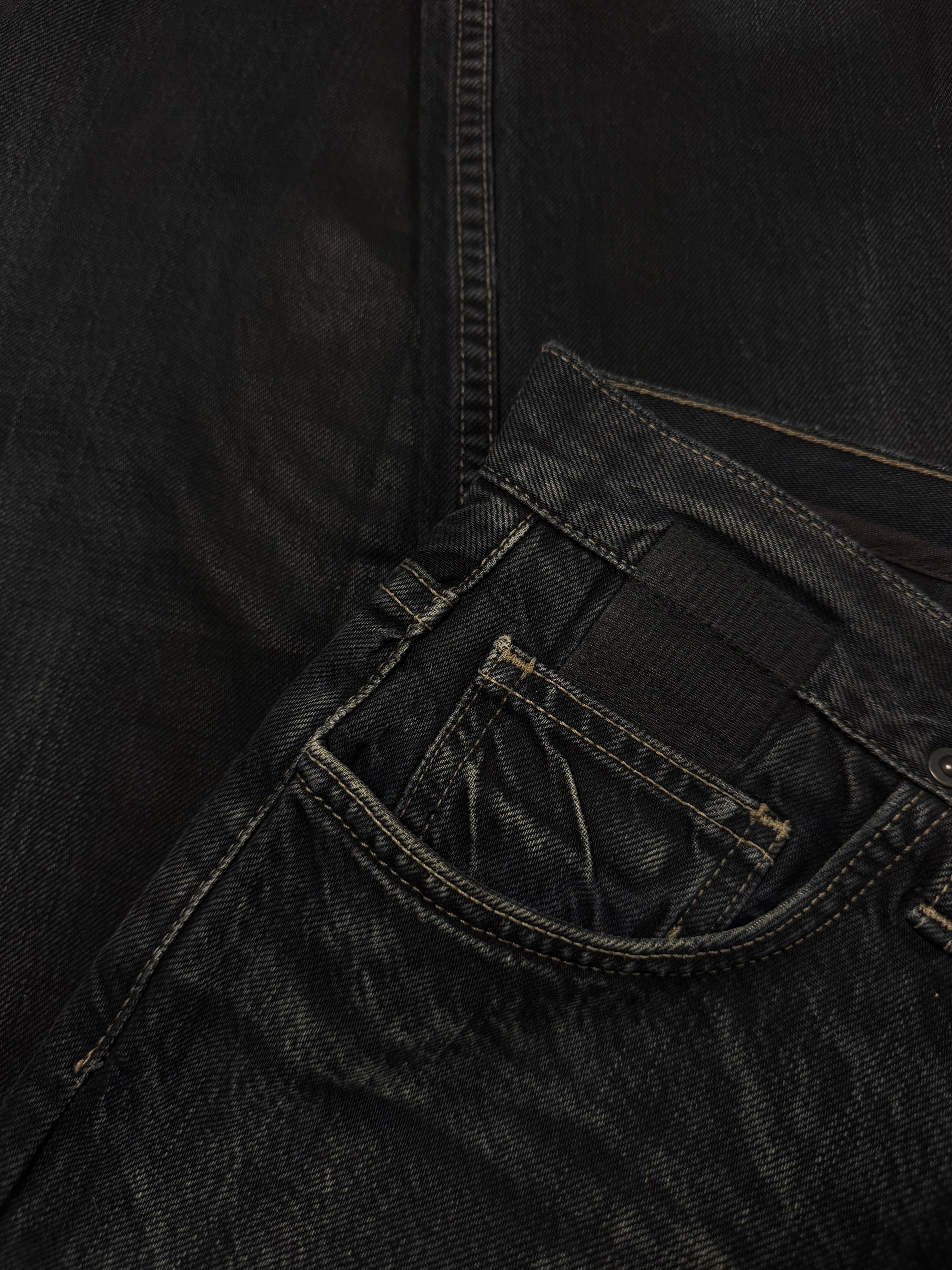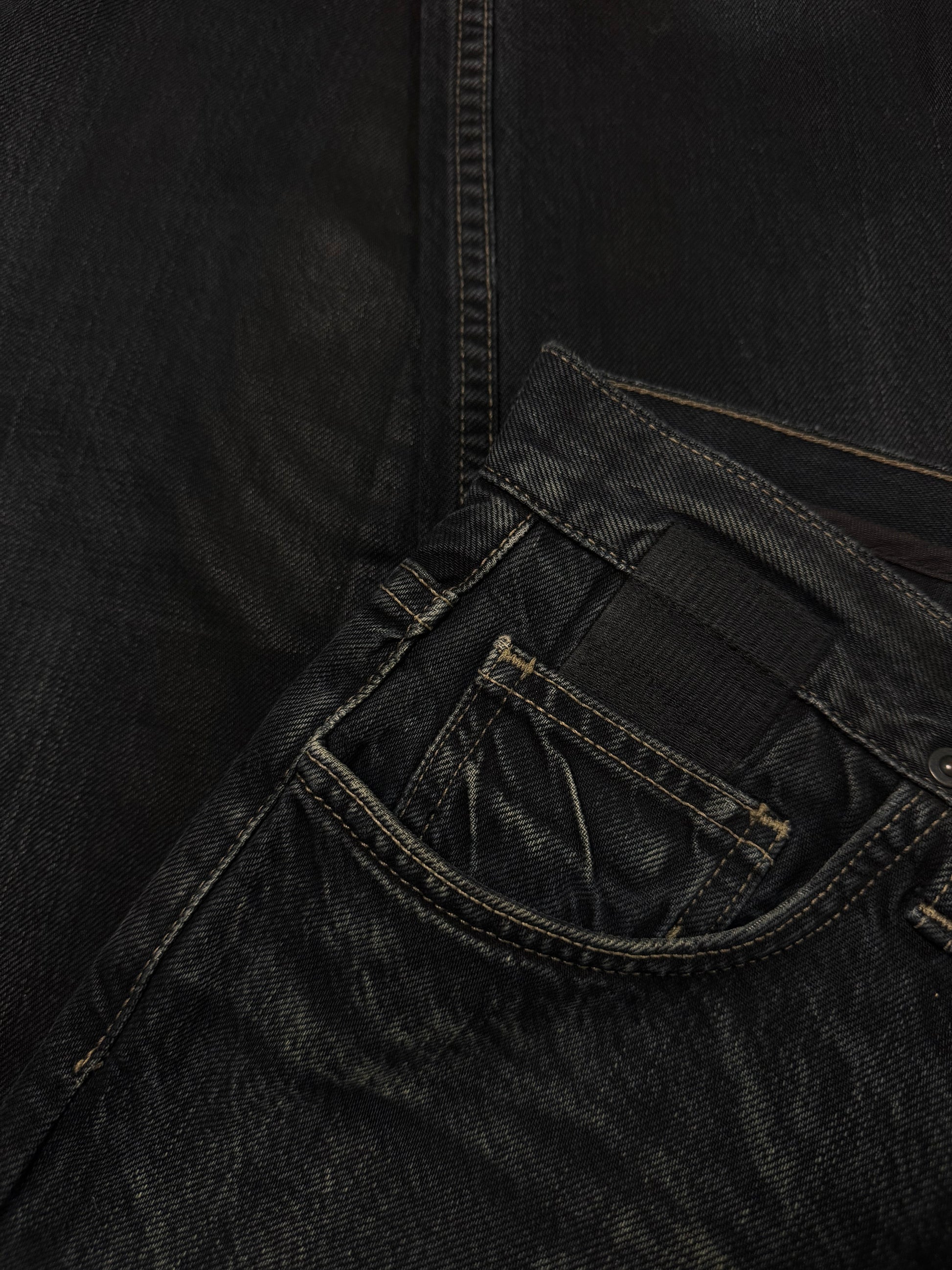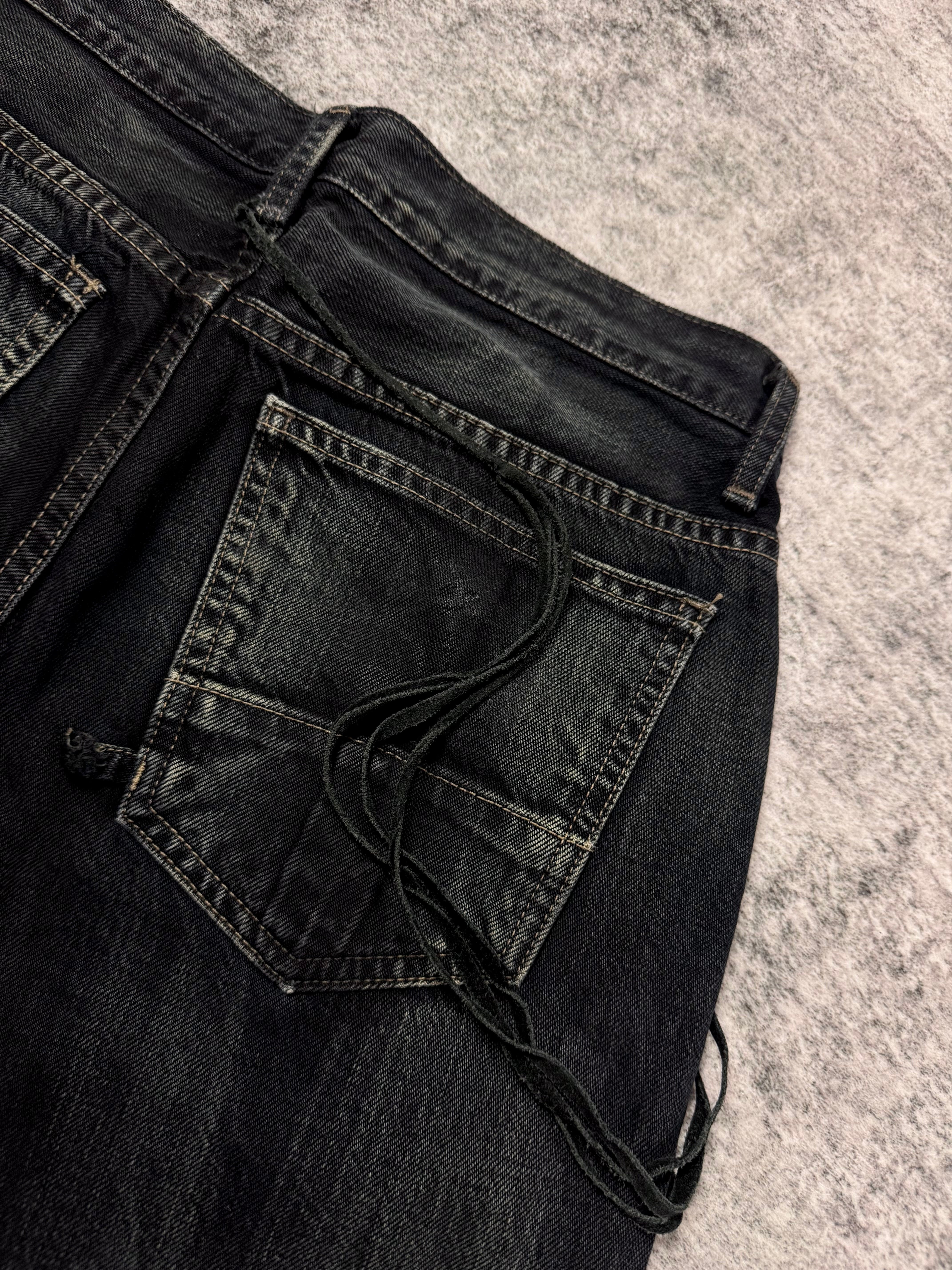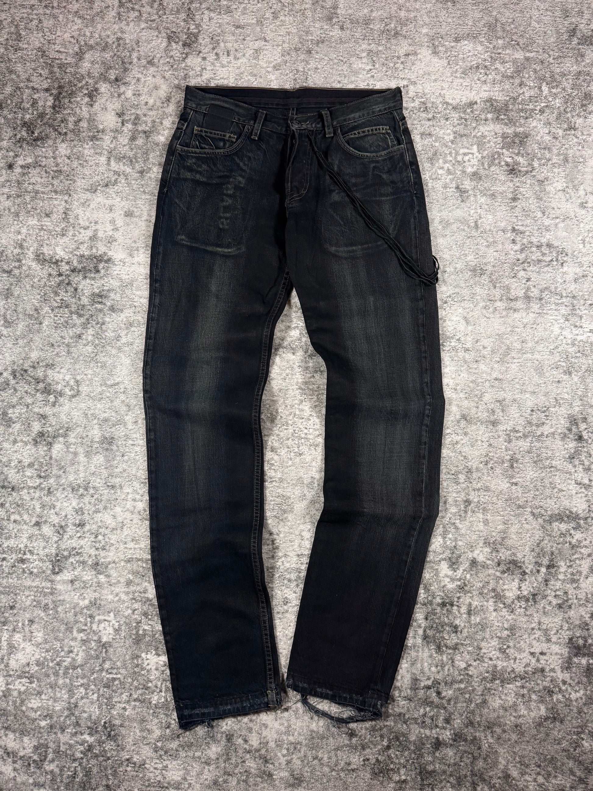 Stunning piece from the early 2000s Rick Owens SLAB line — the precursor to the later DRKSHDW diffusion label. Crafted from 100% cotton heavyweight denim and made in the USA, this pair features a waxed and washed black finish, giving it a ‘oil-spill’ texture. Signature suede string detail running along the side seam (rare detail). The thrashed leg opening on the rear adds great character to the denim along the natural wax fading. In very solid condtion for its age with natural aging, no major flaws