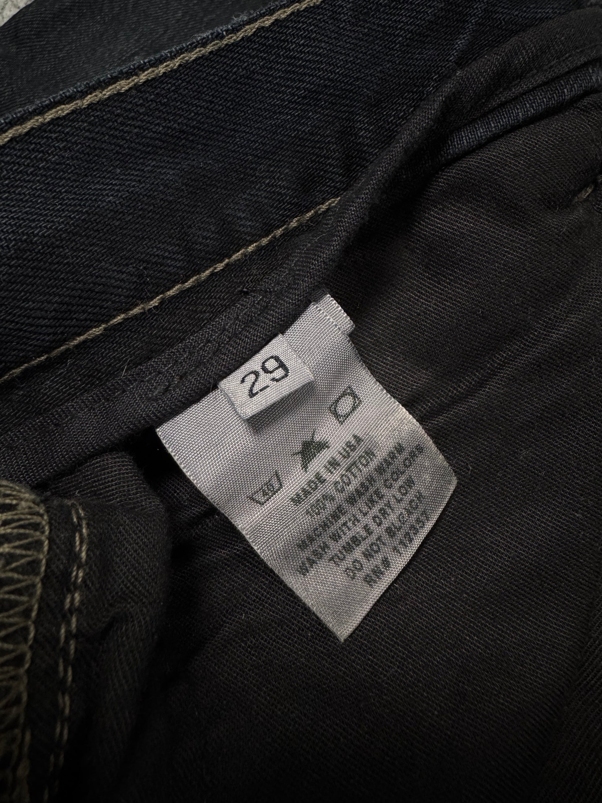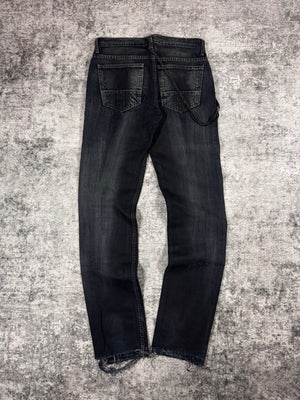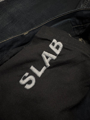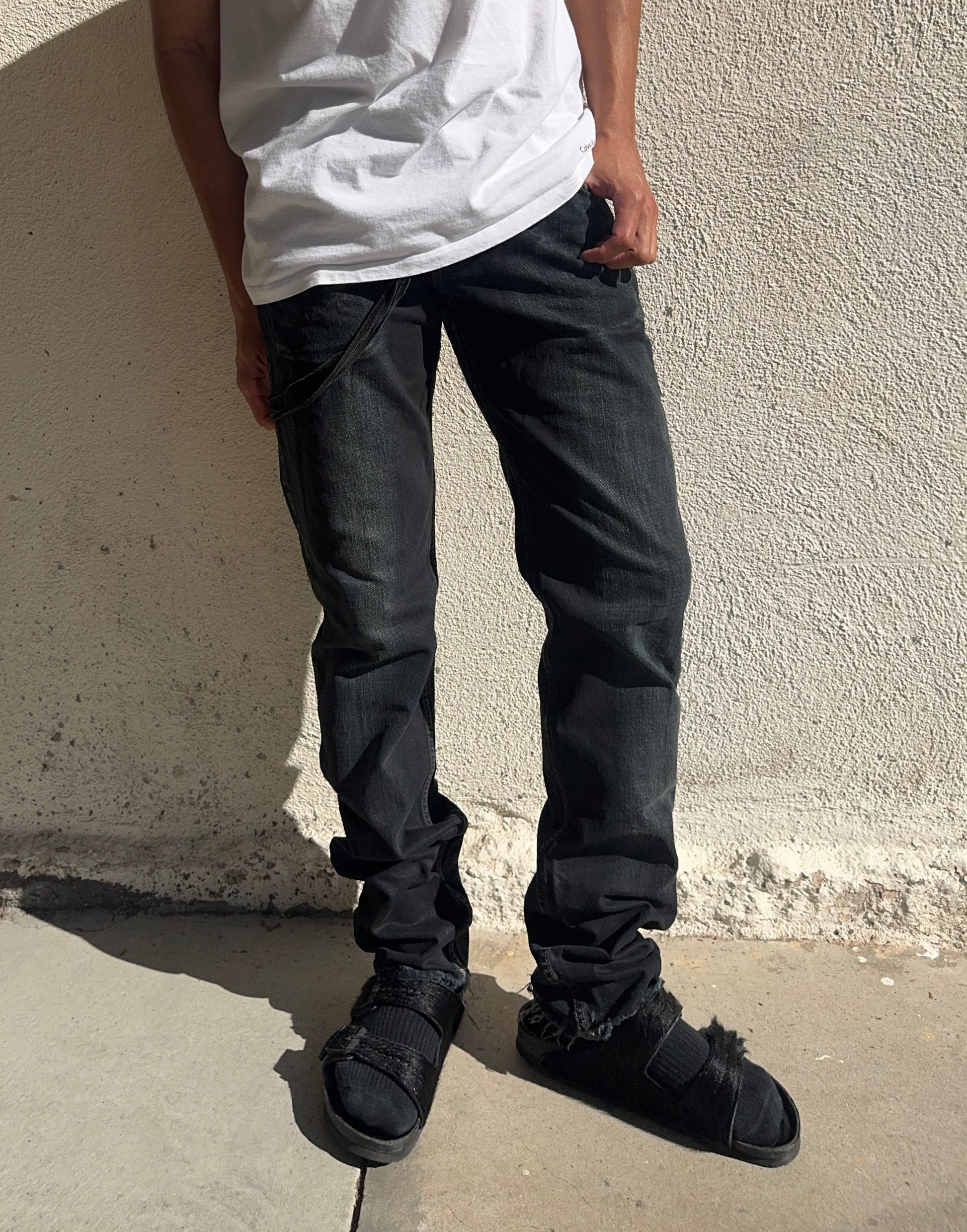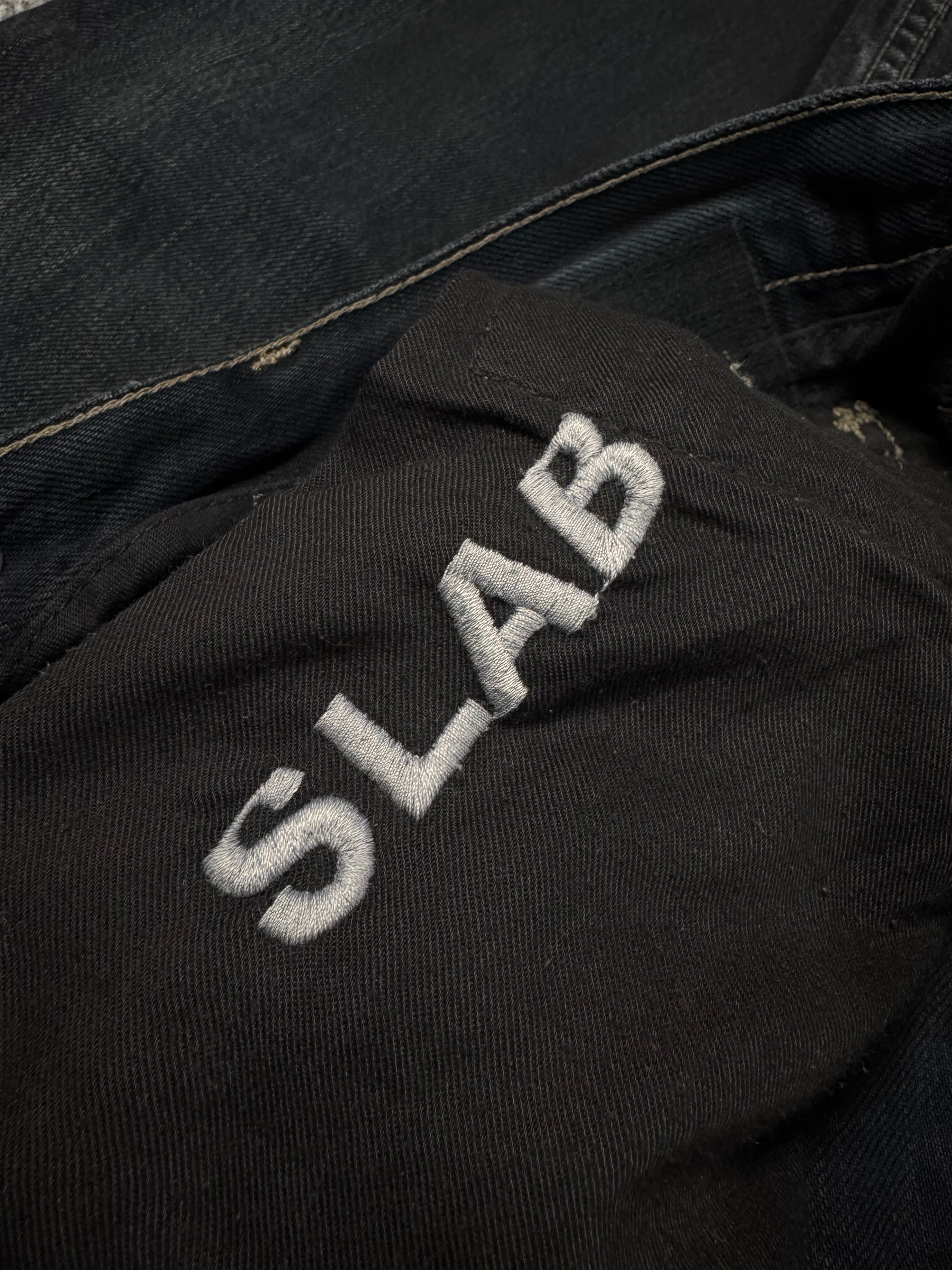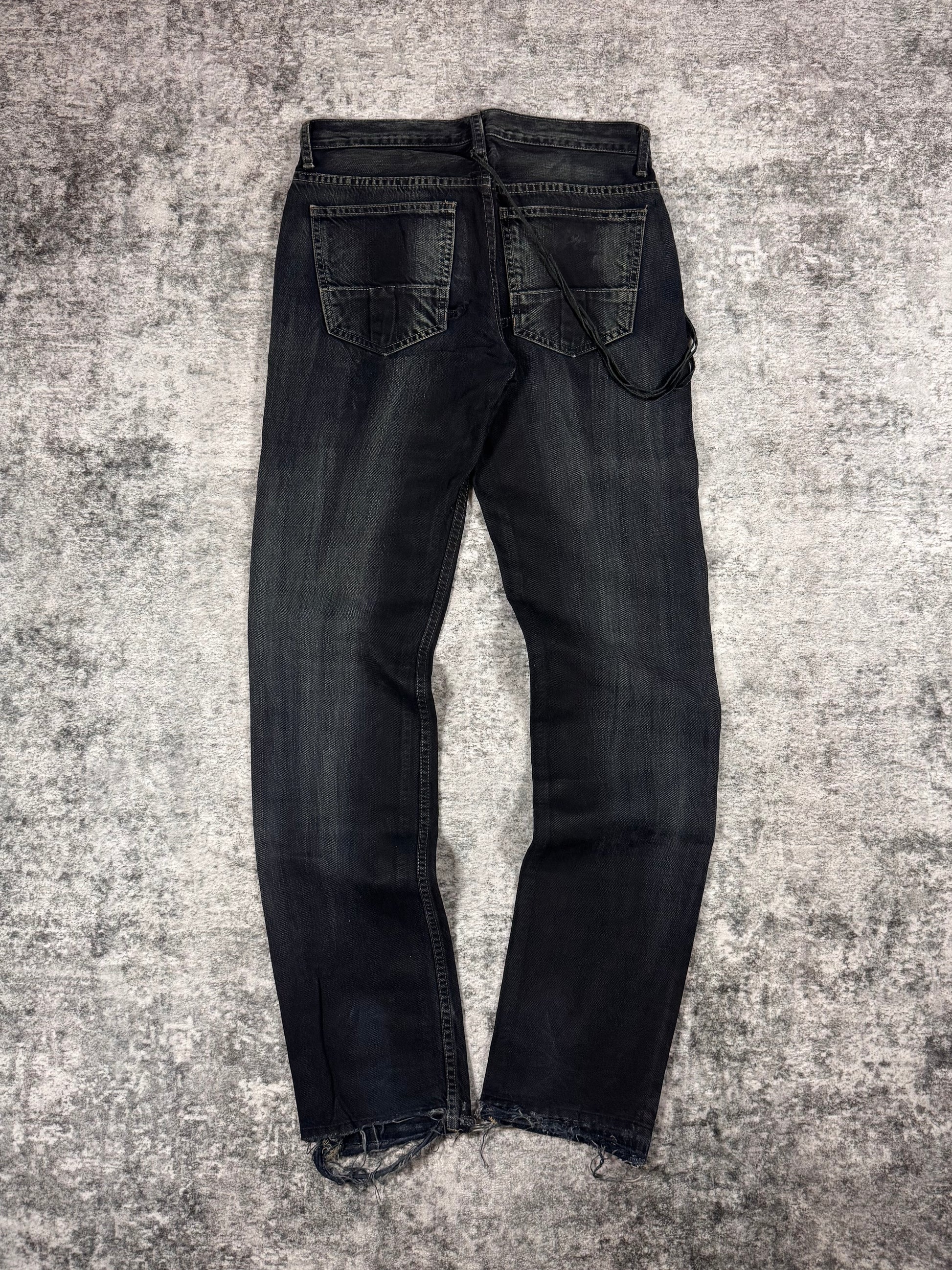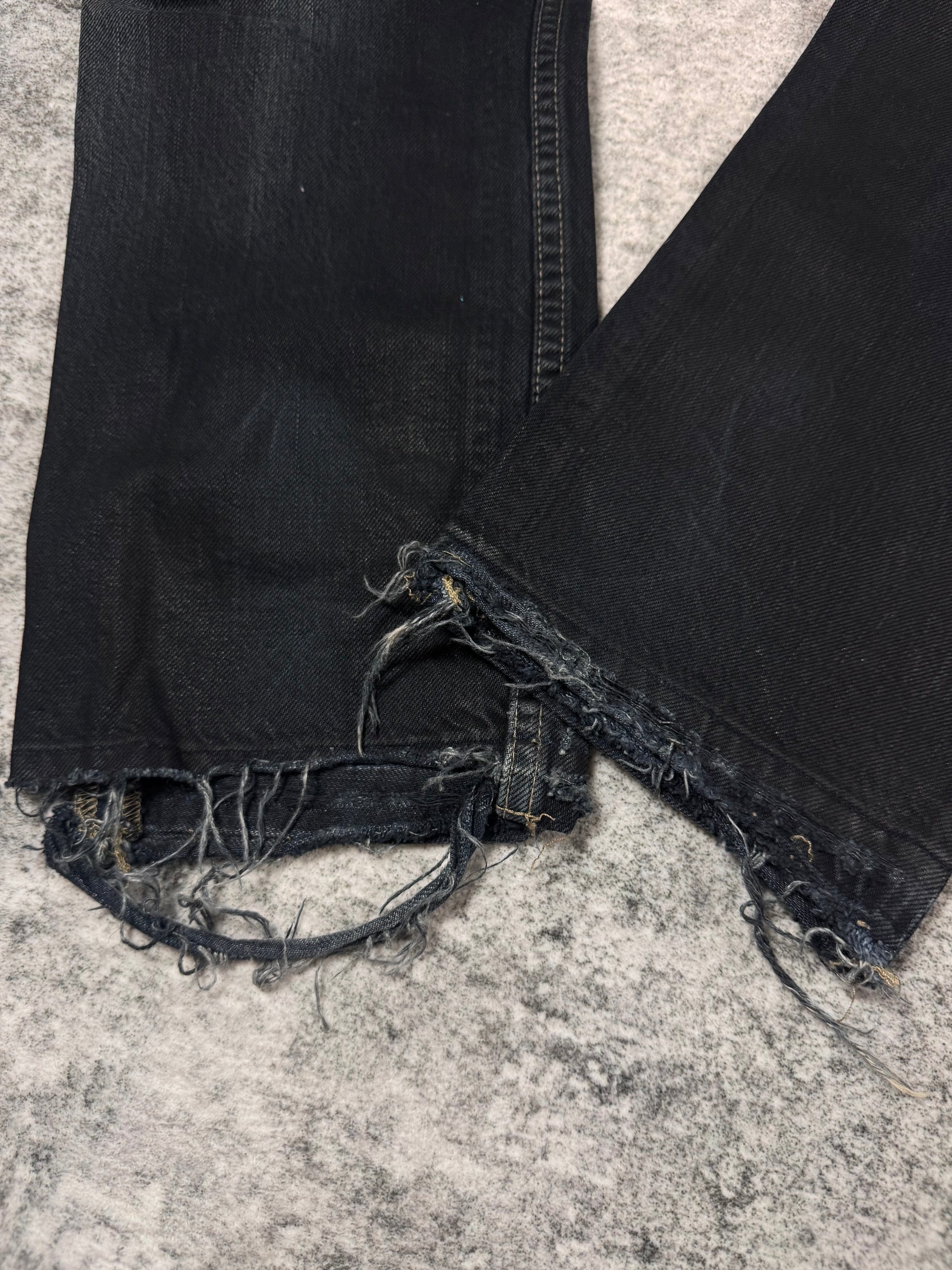 Stunning piece from the early 2000s Rick Owens SLAB line — the precursor to the later DRKSHDW diffusion label. Crafted from 100% cotton heavyweight denim and made in the USA, this pair features a waxed and washed black finish, giving it a ‘oil-spill’ texture. Signature suede string detail running along the side seam (rare detail). The thrashed leg opening on the rear adds great character to the denim along the natural wax fading. In very solid condtion for its age with natural aging, no major flaws