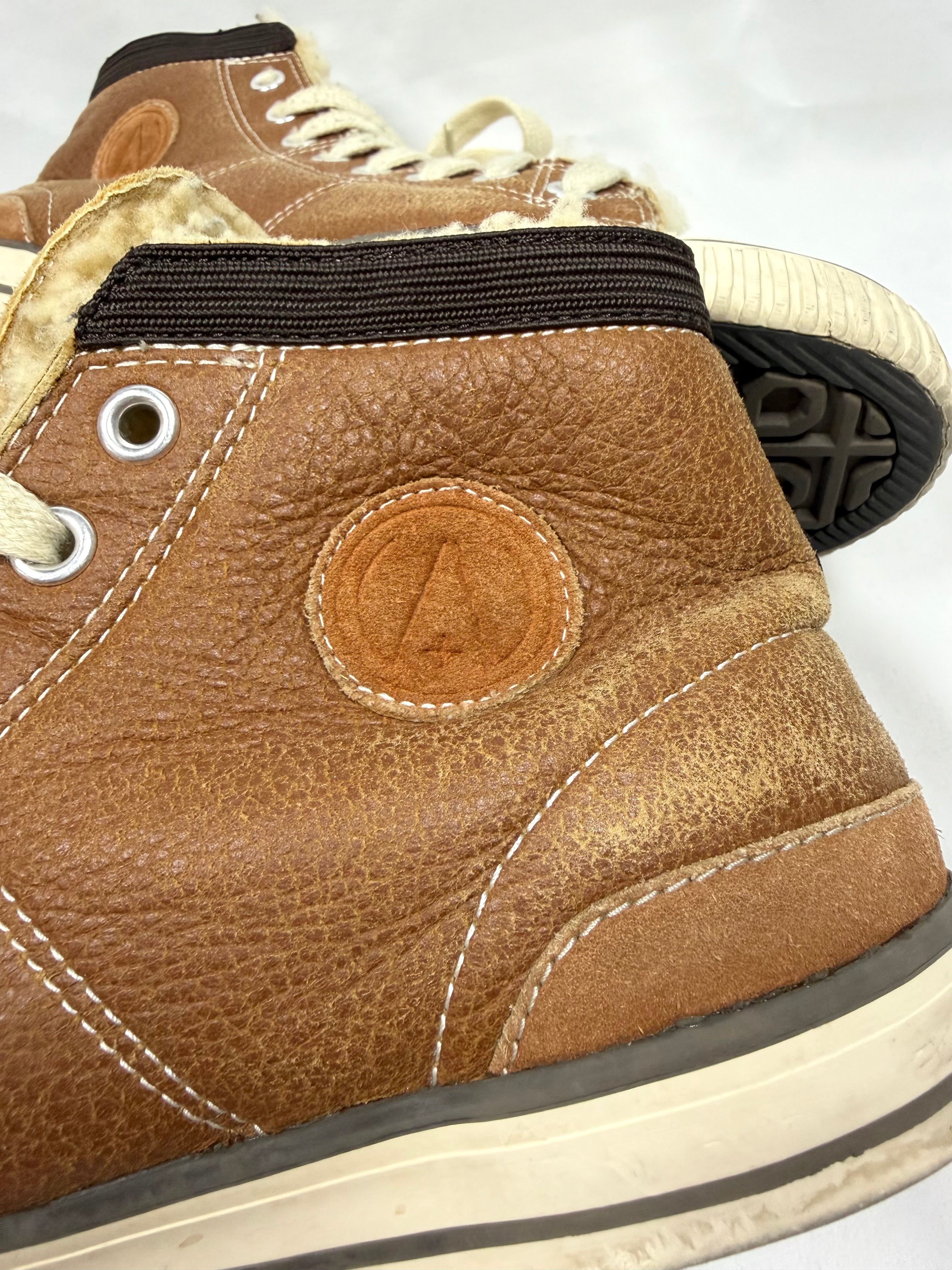 An early iteration of Visvim’s iconic Skagway silhouette, executed in premium leather with full shearling lining for elevated warmth and texture. The design reinterprets classic American high-top sneakers through Hiroki Nakamura’s lens, blending heritage inspiration with luxury craftsmanship. Featuring a soft, broken-in leather upper, wool-lined interior, and vulcanized sole construction, it embodies Visvim’s balance of comfort and durability. A rare cold-weather variation that highlights the brand’s attention to material and understated detailing.