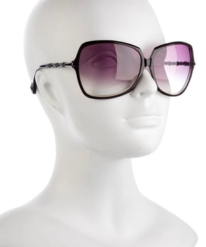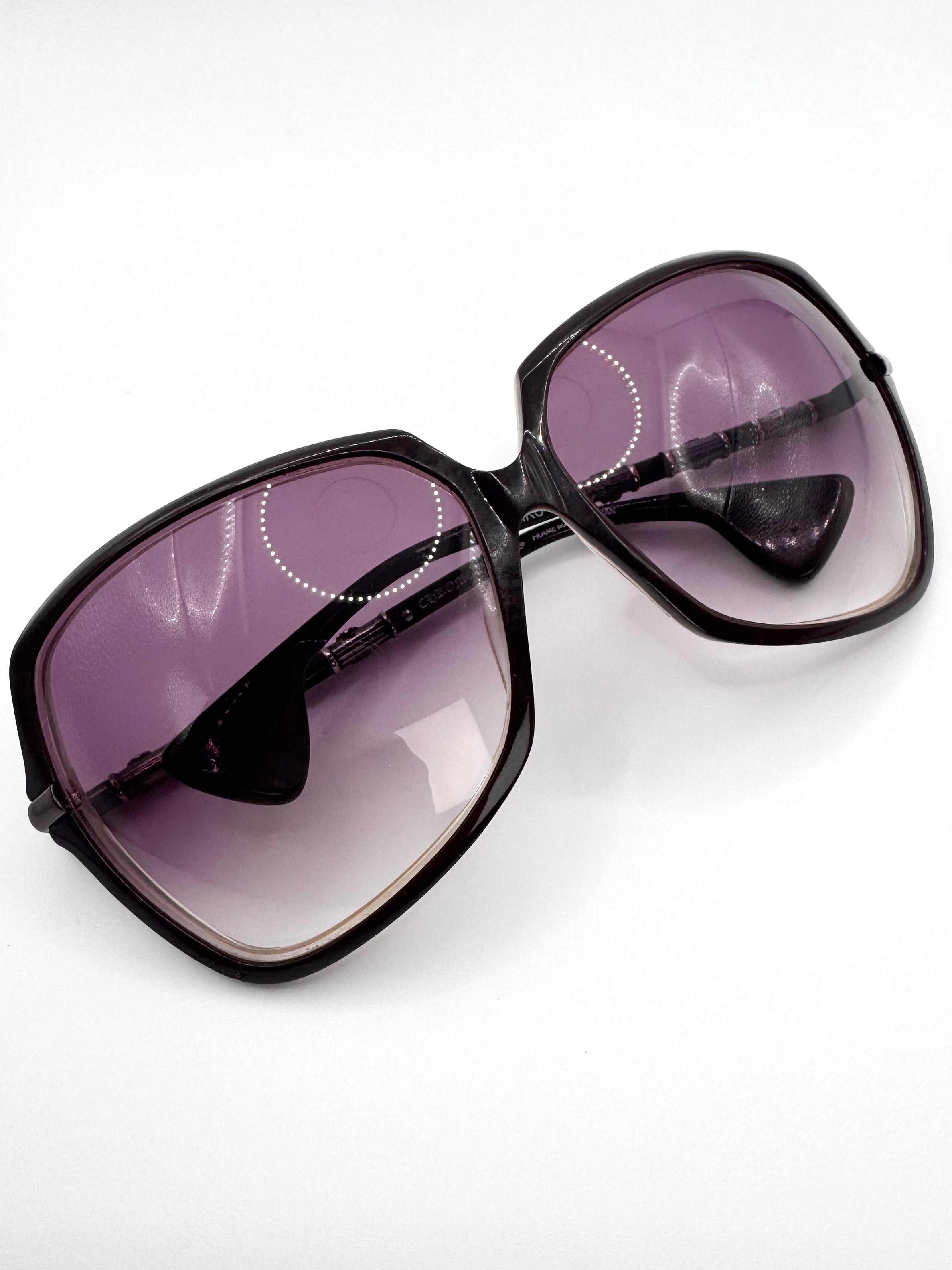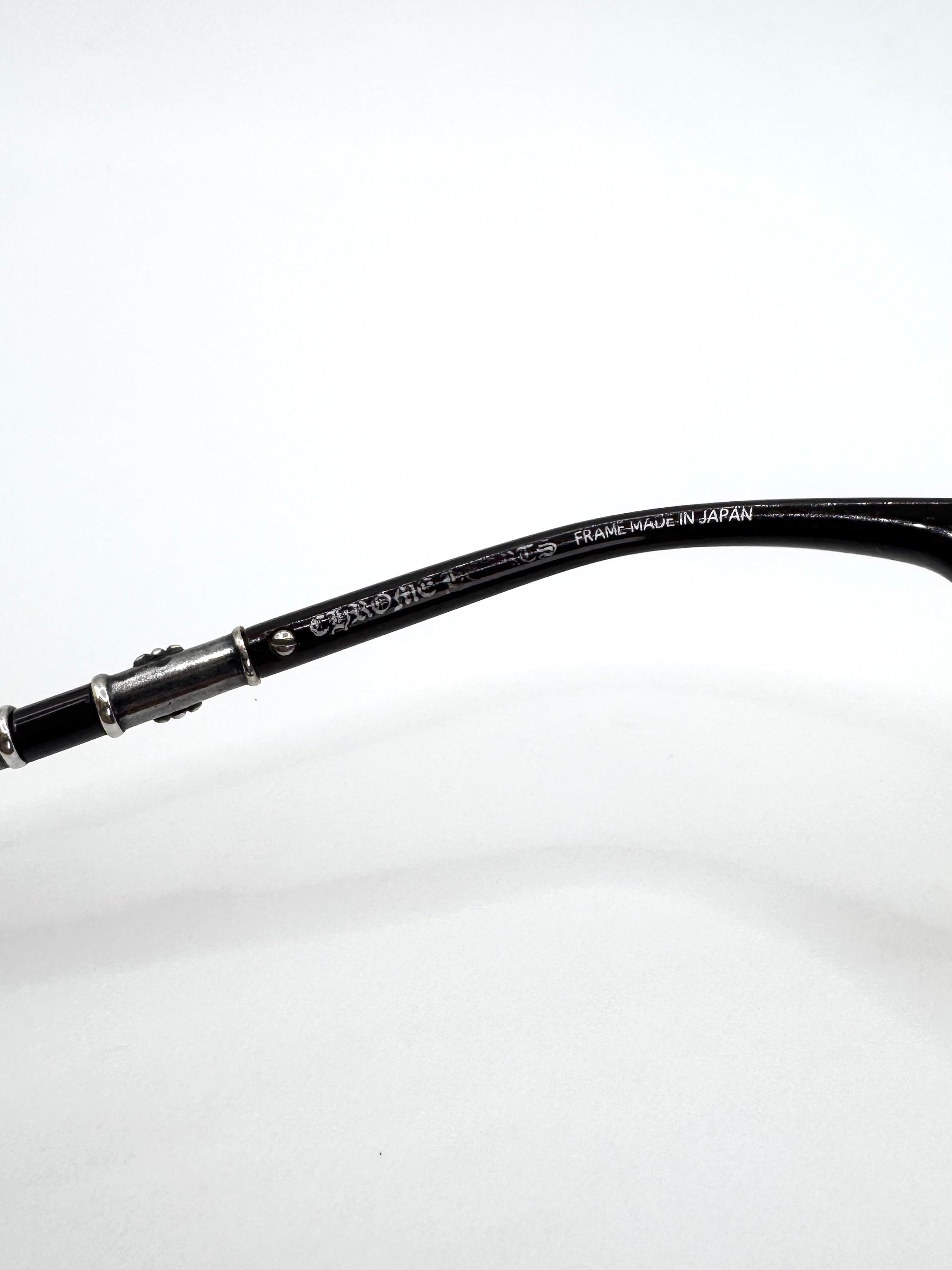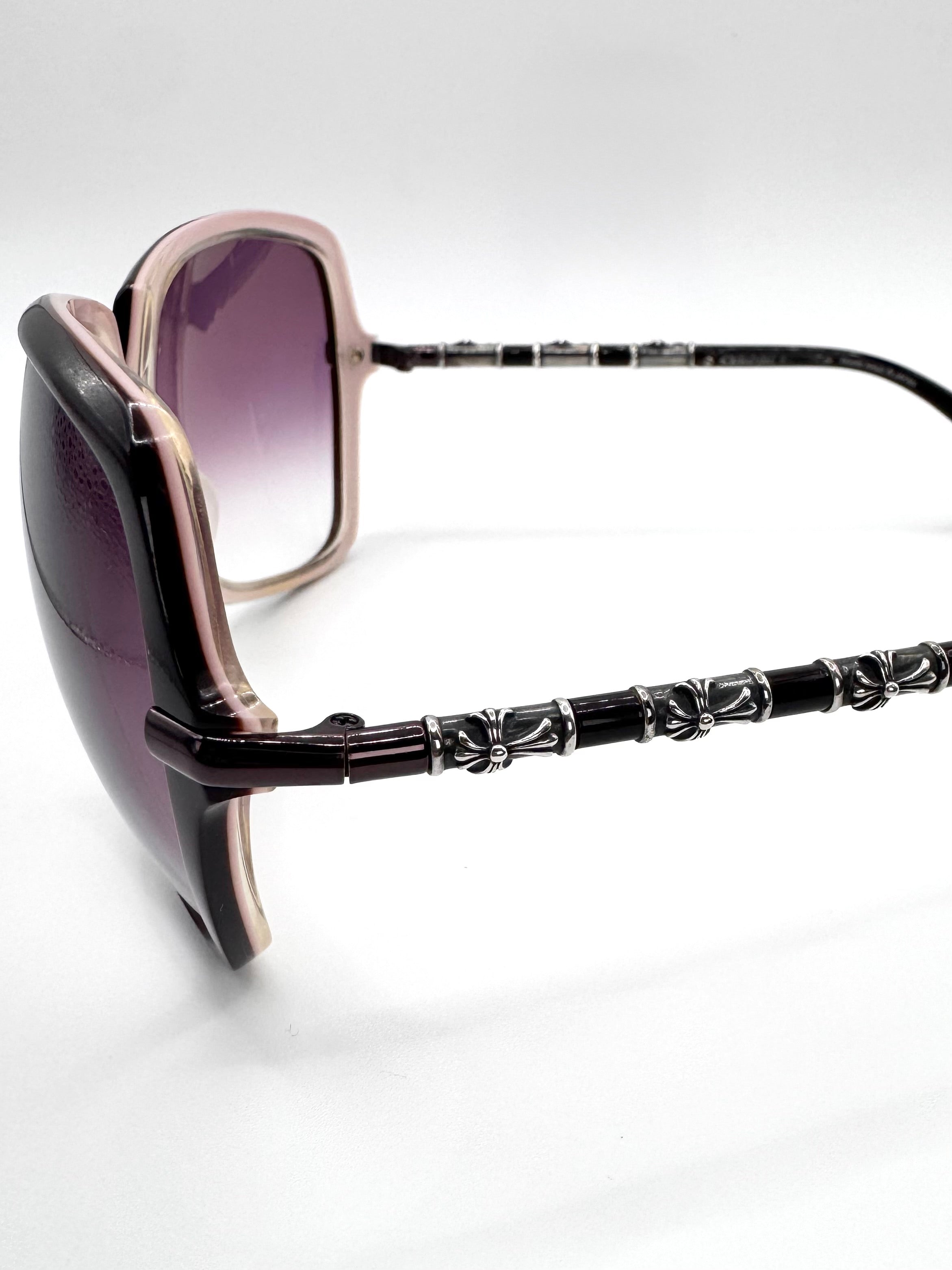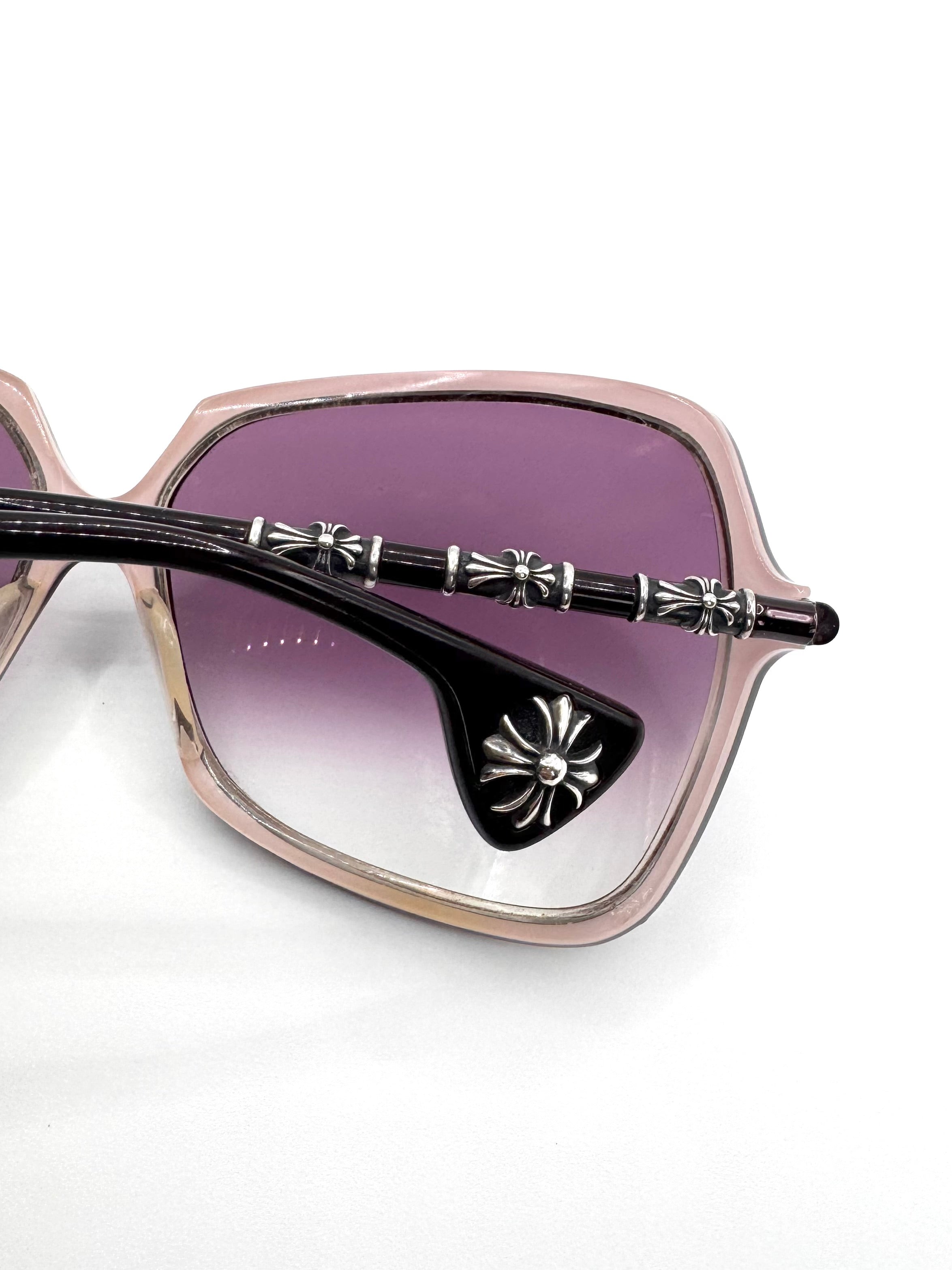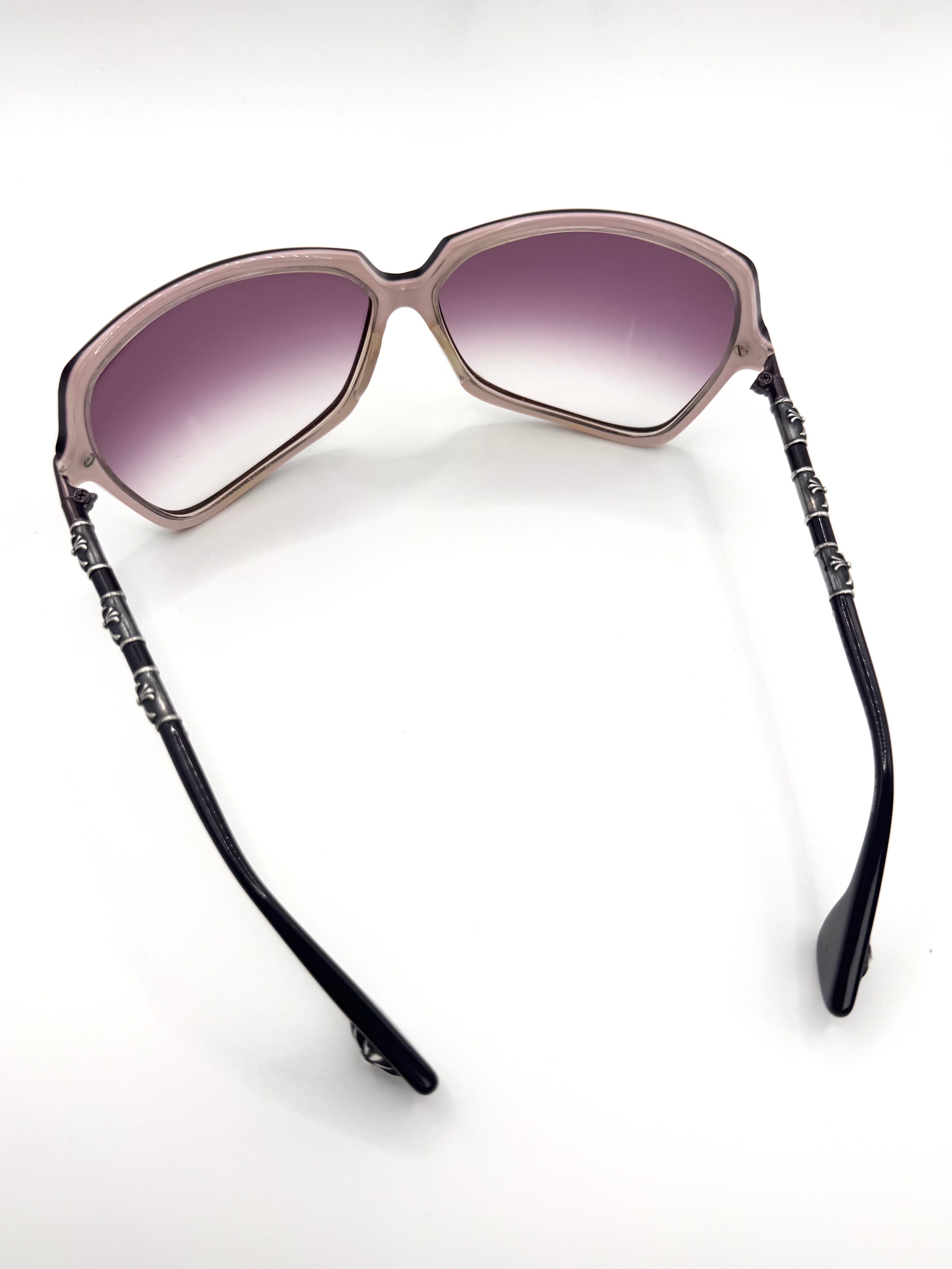 Extremely rare Chrome Hearts sunglasses from the early 2010s named “Iku Iku” — features an oversized square frame silhouette with gradient purple lenses and signature sterling silver cemetery cross motif hardware along the arma. Engraved silver temple bars and cross accents. Produced in Japan as part of the brand’s high-end optical line. Maintains solid condition with minor flaws (unnoticeable scratches), and loose arms. Good quality for its age