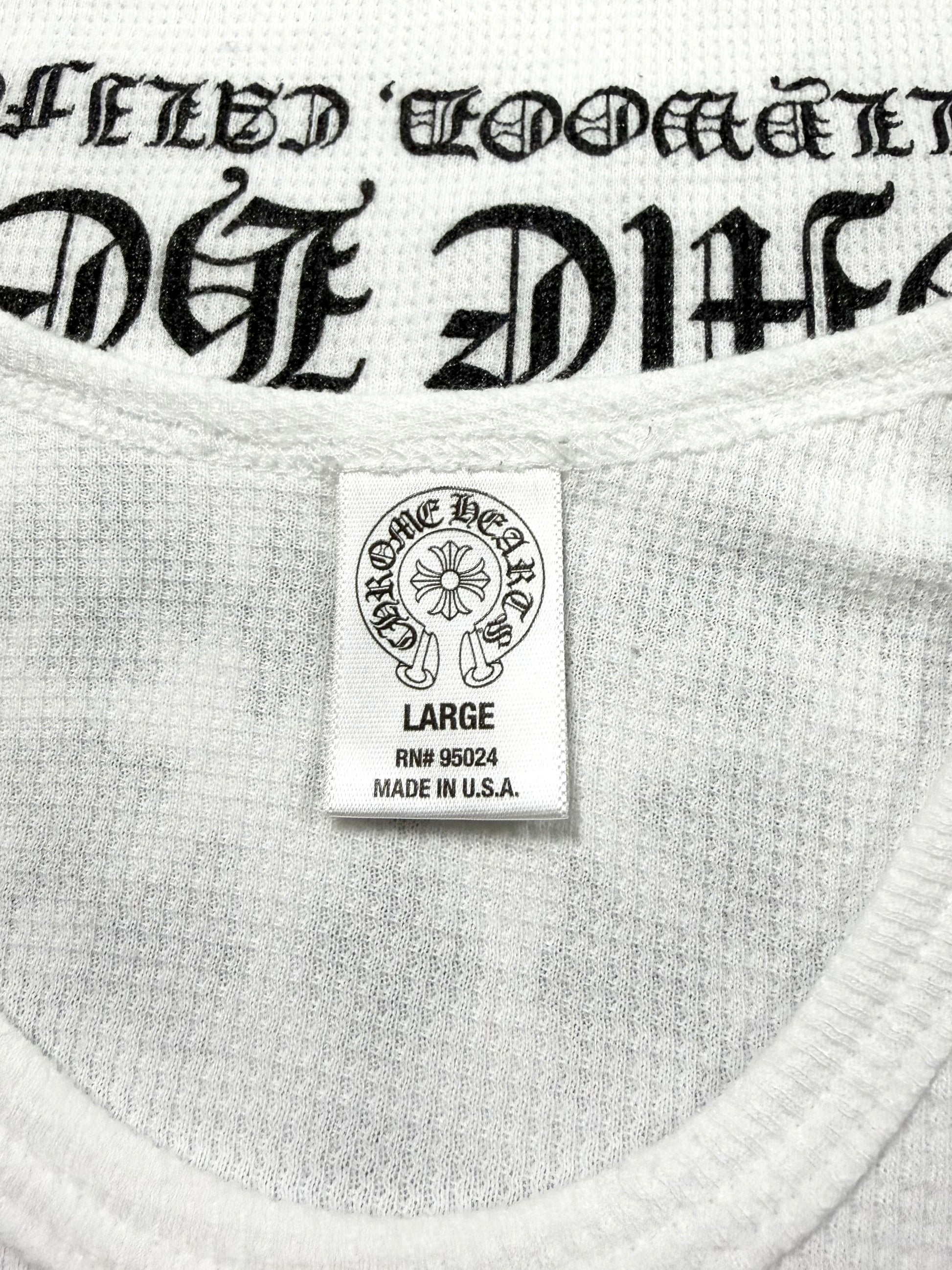 Extremely rare 2010s Chrome Hearts thermal constructed in a soft white waffle knit, finished with a dense “Cemetery” multi-cross grid print across the chest. The bold gothic Chrome Hearts logo anchors the composition, paired with “Made in Hollywood, California, U.S.A.” beneath. Subtle branding continues with a CH hit at the hem and a minimal chest logo on the reverse, balancing graphic intensity with restraint. A staple Chrome Hearts silhouette in close to brand new condition with no flaws—pristine quality.