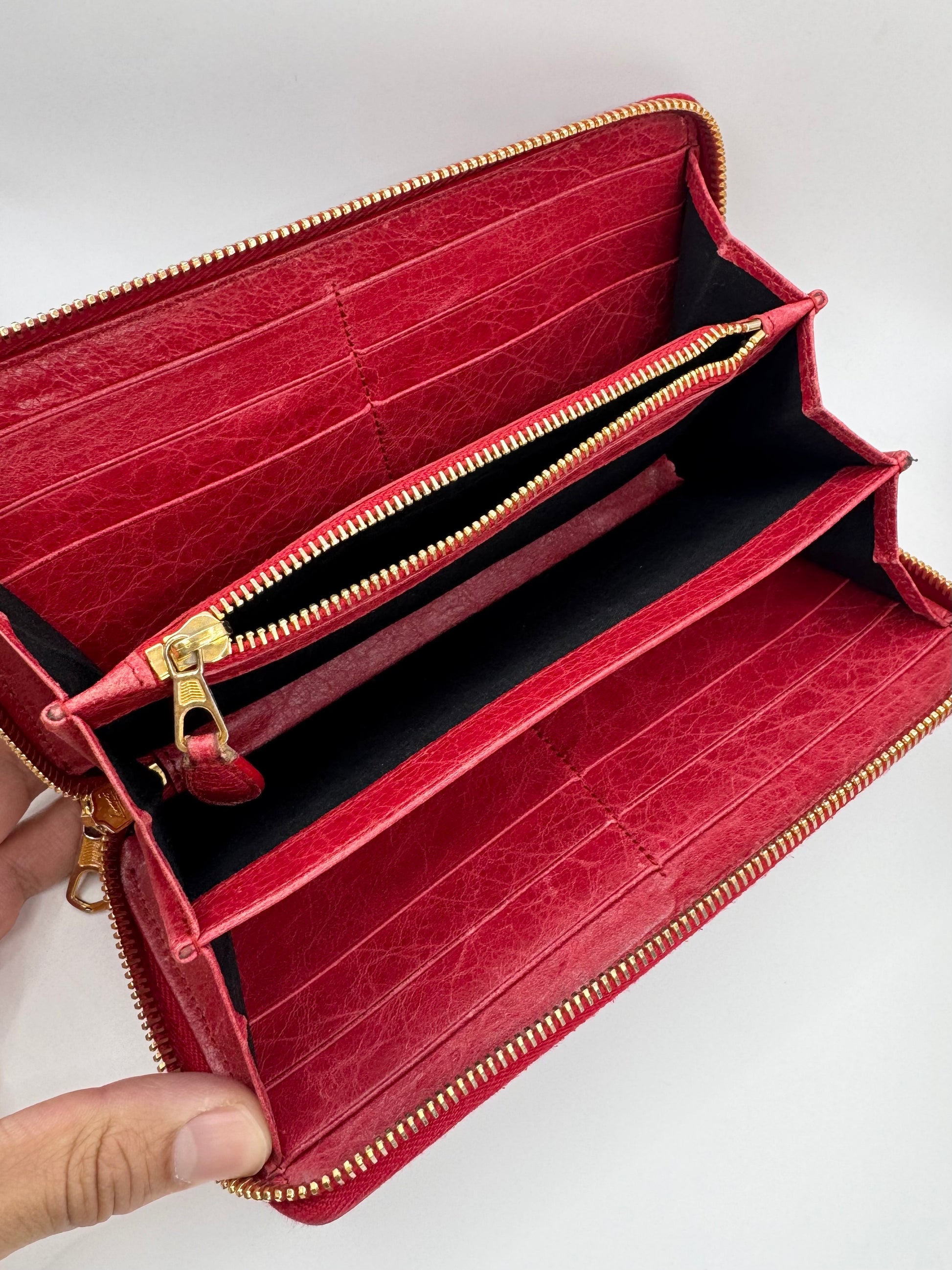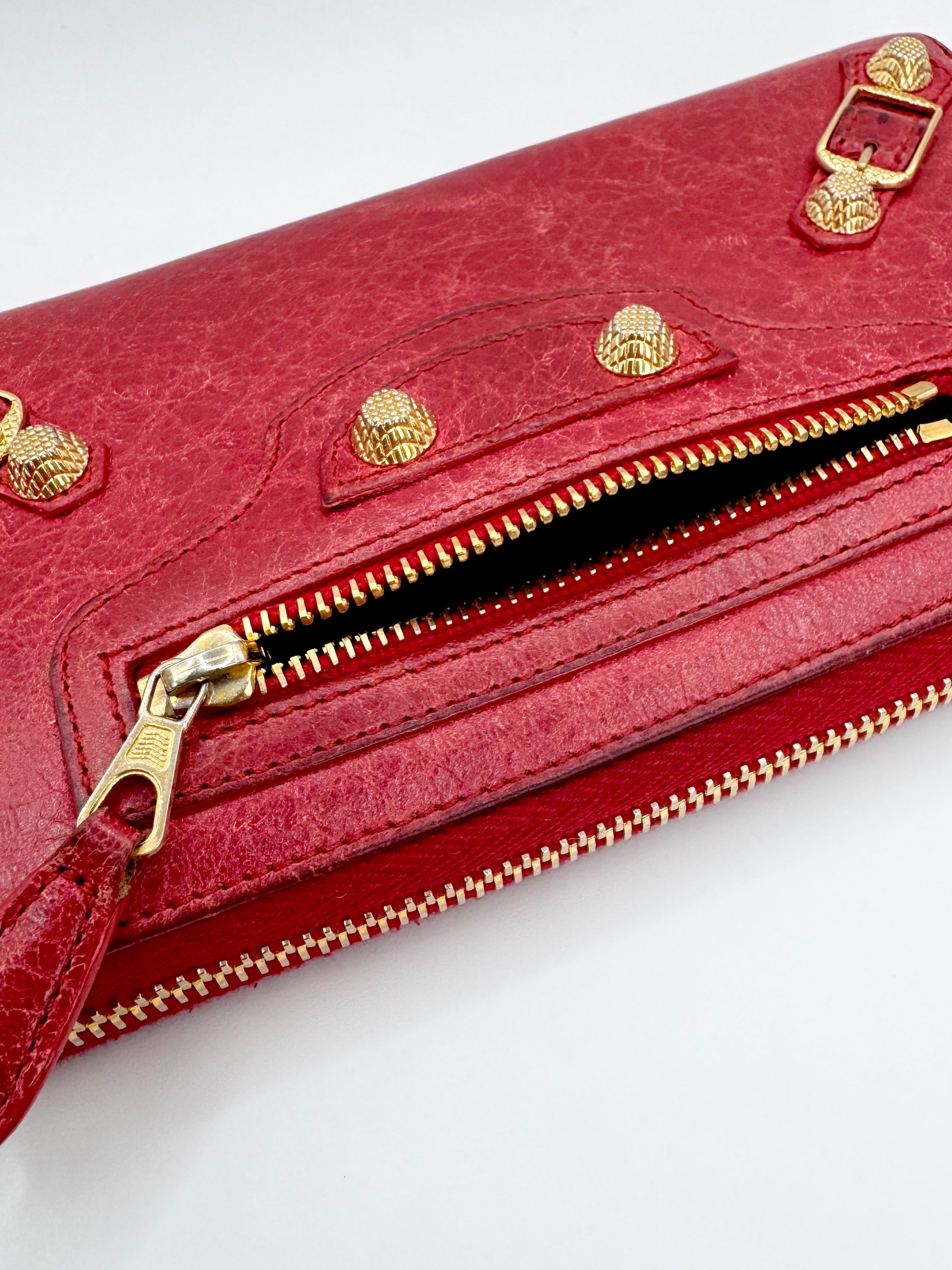 This beautiful Balenciaga cuty long wallet from 2013 coming in the ‘Rouge Grenade’ color way features multiple card slots, large storage compartments, and even zipper compartments. Signature stud and buckle details at the front in bronze-tone hardware. Comes with the original box, dust bag and all of the cards from purchase