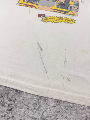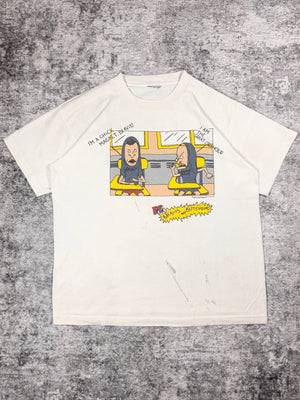 Vintage Beavis and Butthead t shirt from the 90s. Features a bold cartoon graphic of the iconic duo in their signature style, complete with classic quotes like “I’m a chick magnet, Beavis!” In good condition for its age with natural distressing that adds character to the piece