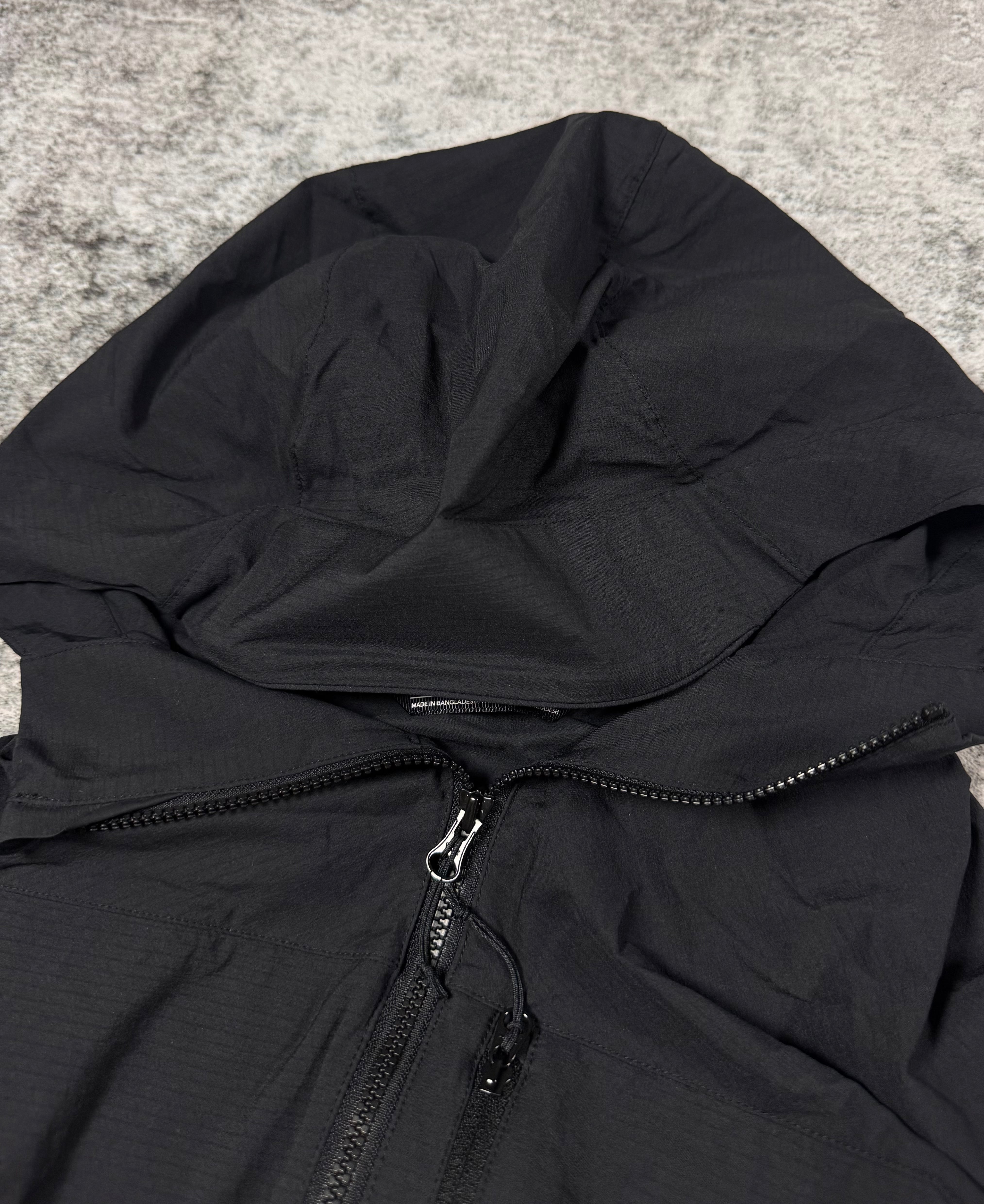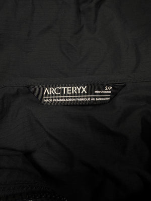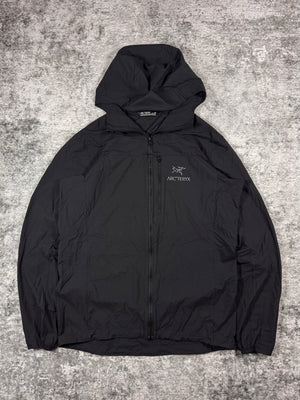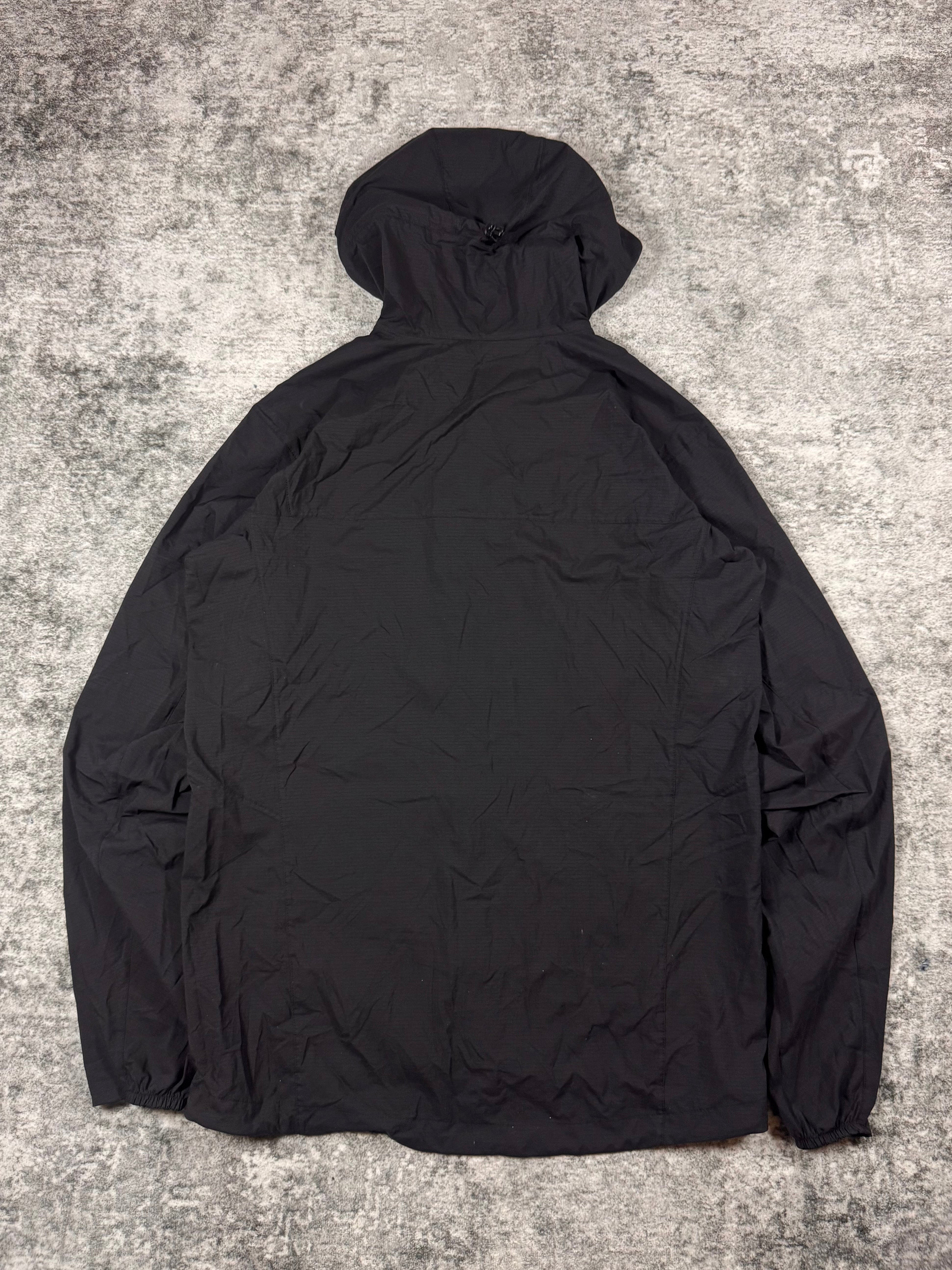 Released in 2023 this all-black Arc’teryx zip-up in the “Squamish Hoody” silhouette is extremely light and compressible. This hooded windshell features ultralight minimalist construction and stows in the chest pocket for maximum packability. Made with a premium wind resistant fabric that has surprising strength and resilience. In good condition with no flaws or damages