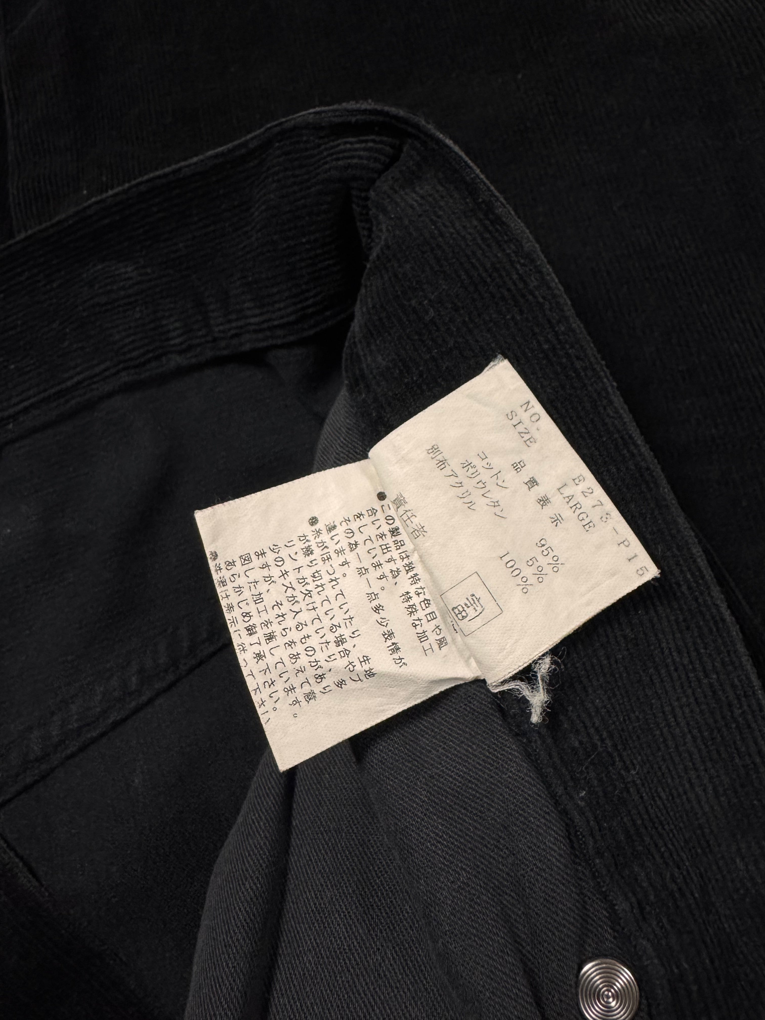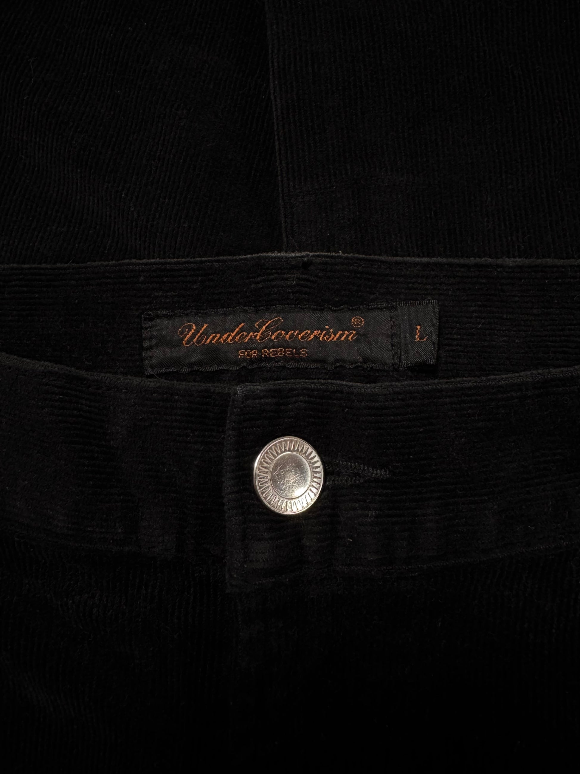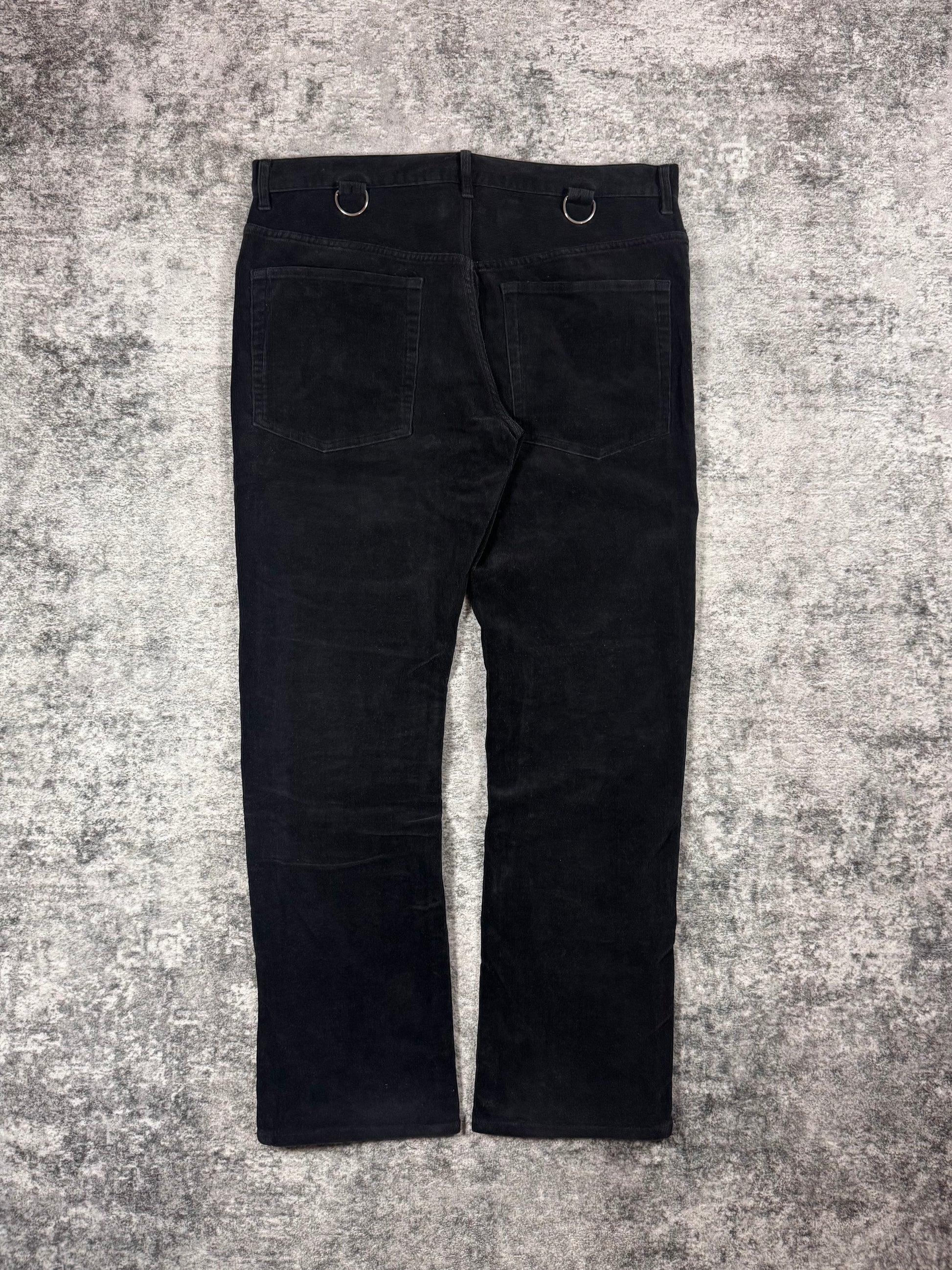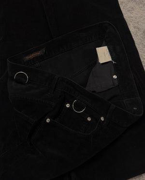 Extremely rare pants from Jun Takahashi’s Autumn/Winter 2002 “Witch’s Cell Division” hybrid corduroy featuring a tonal black corduroy base contrasted by textured knitted knee panel inserts,. Signature D-ring hardware at the front pockets and reinforced panel construction reflect the utilitarian yet conceptual ethos of the 2002 collection. In fantastic condition with no flaws or damages