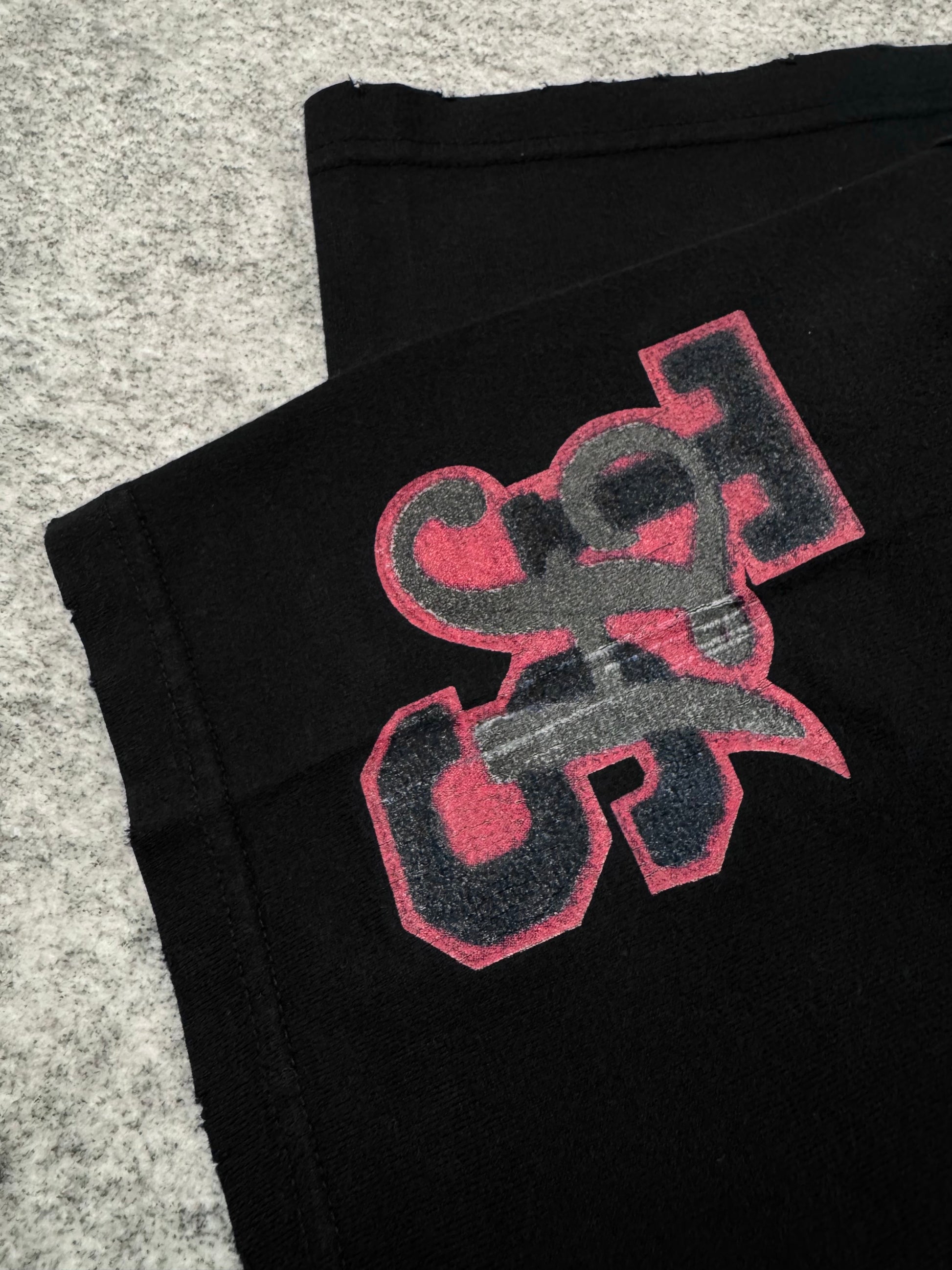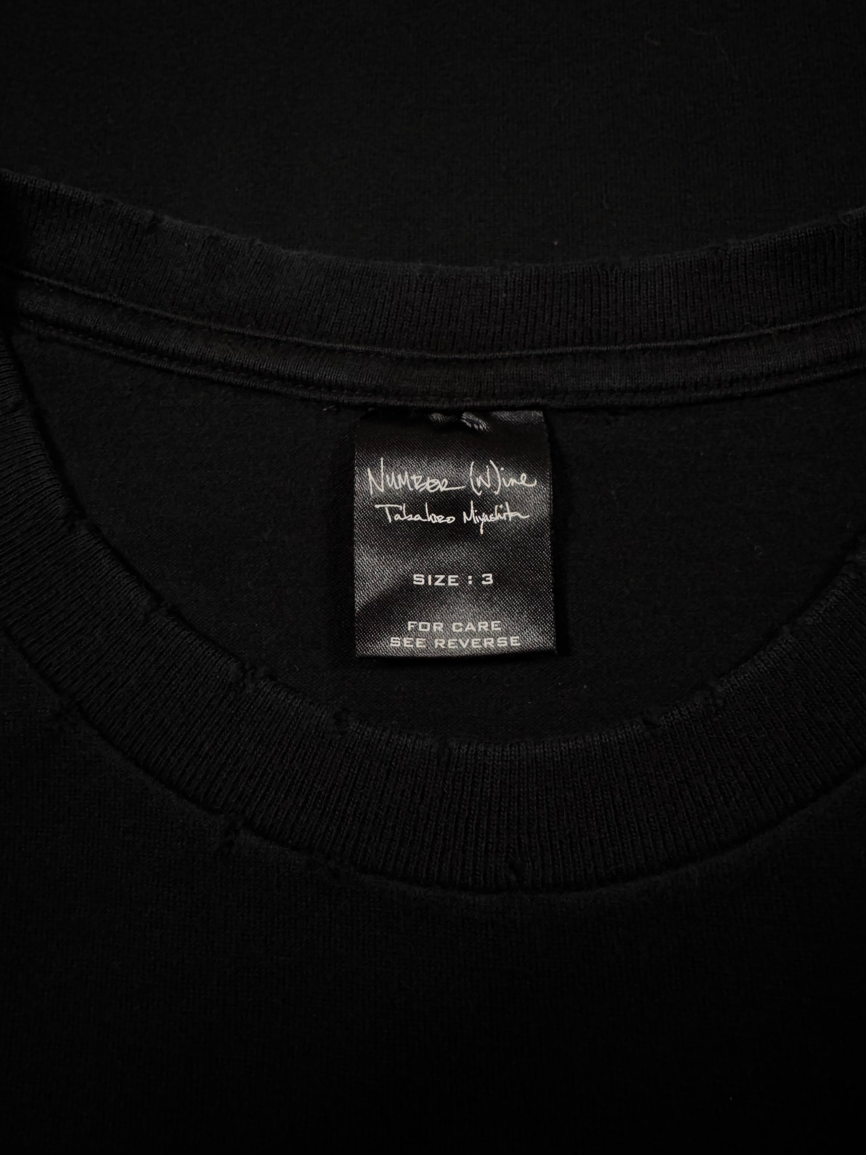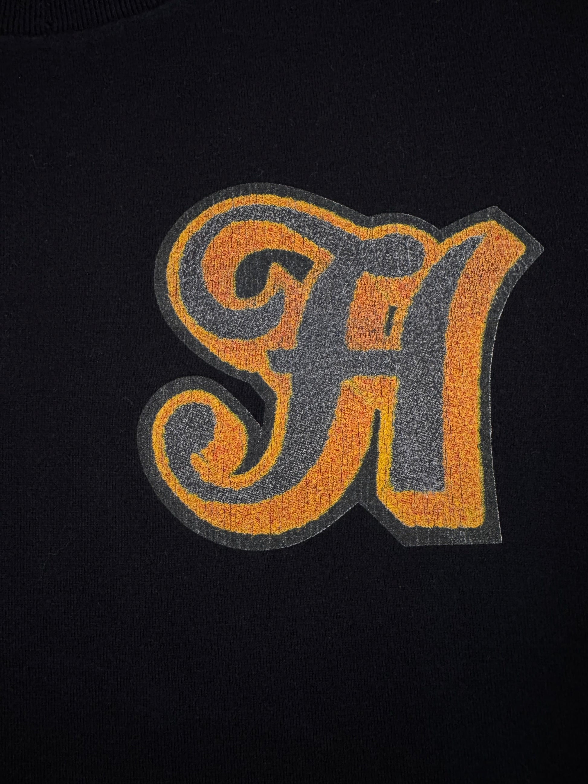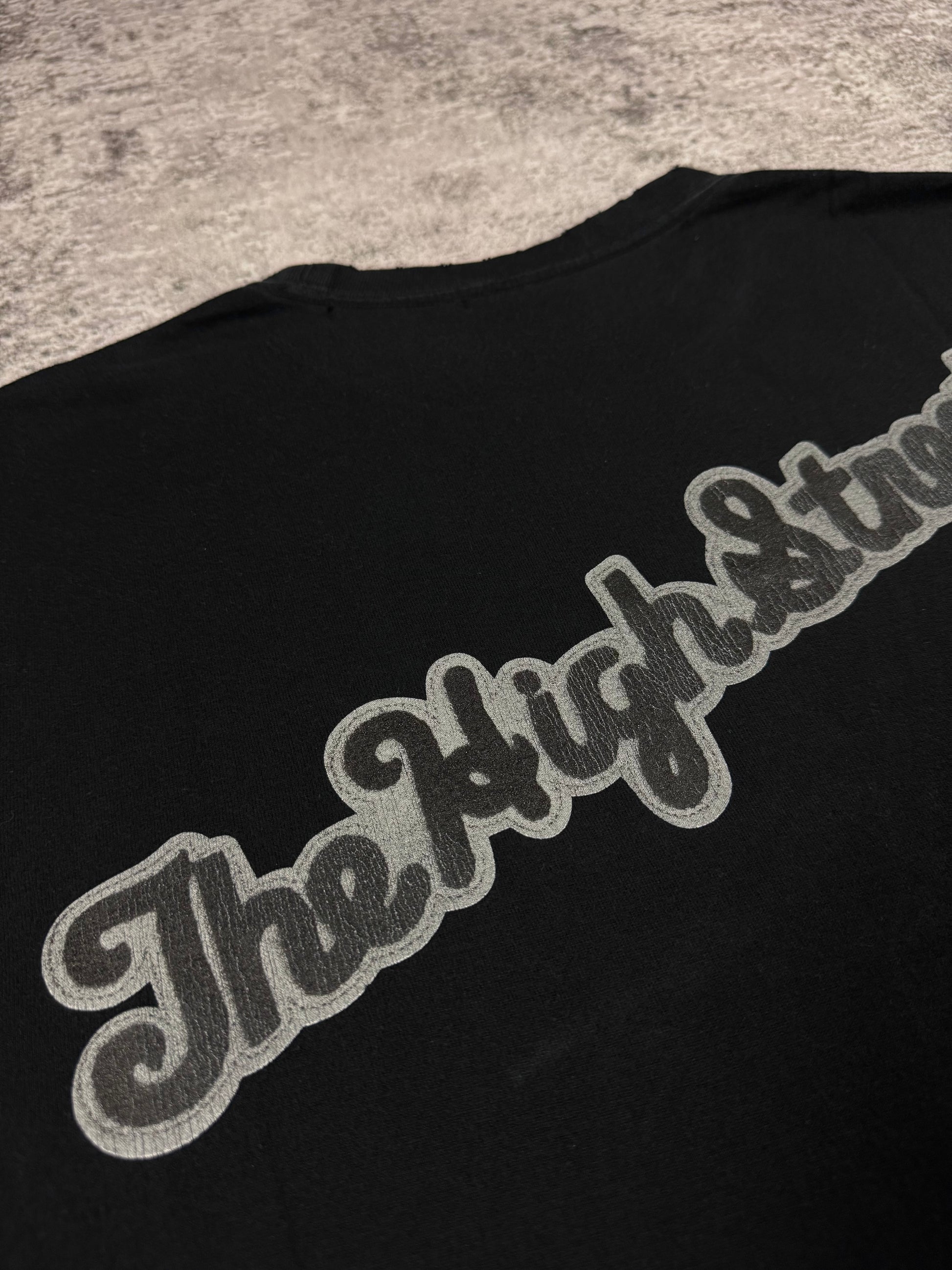 This iconic piece is from the Autumn/Winter 2005 Number (N)ine collection “The High Streets”. Features the “H” patch graphic on the left chest and the “THS” patch graphic on the right arm, which stands for “The High Streets”. High streets spell-out graphic featured on the rear. Factory processes distressing on the neckline, sleeve and hem end. In good condition with some discoloration, but maintains good quality
