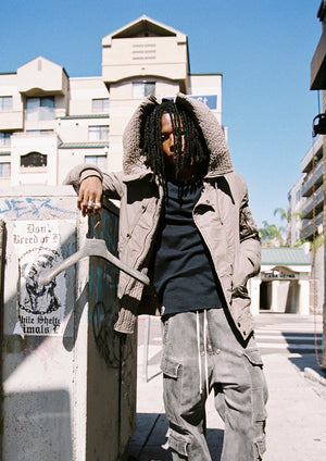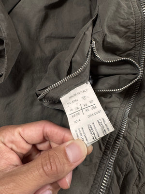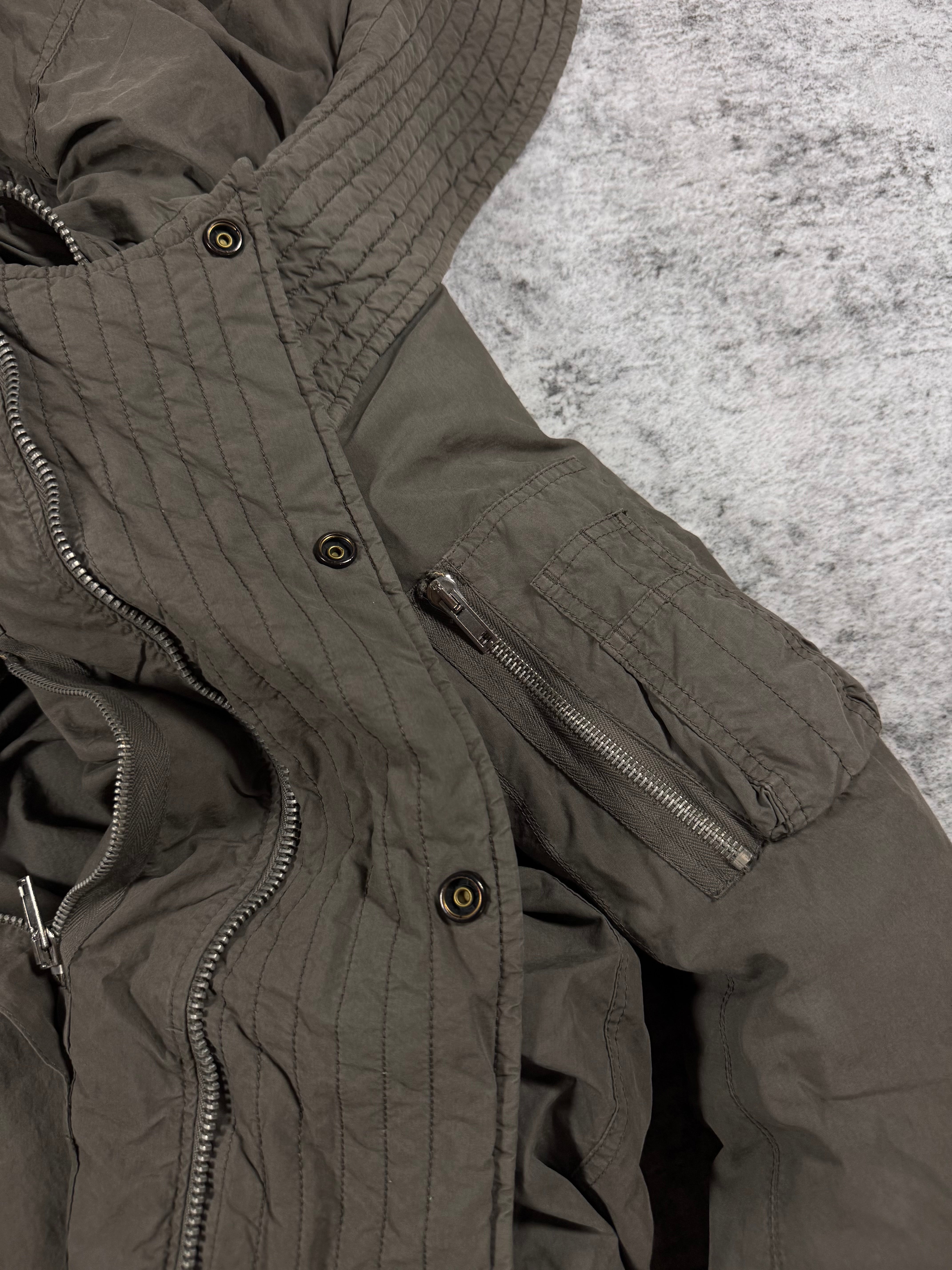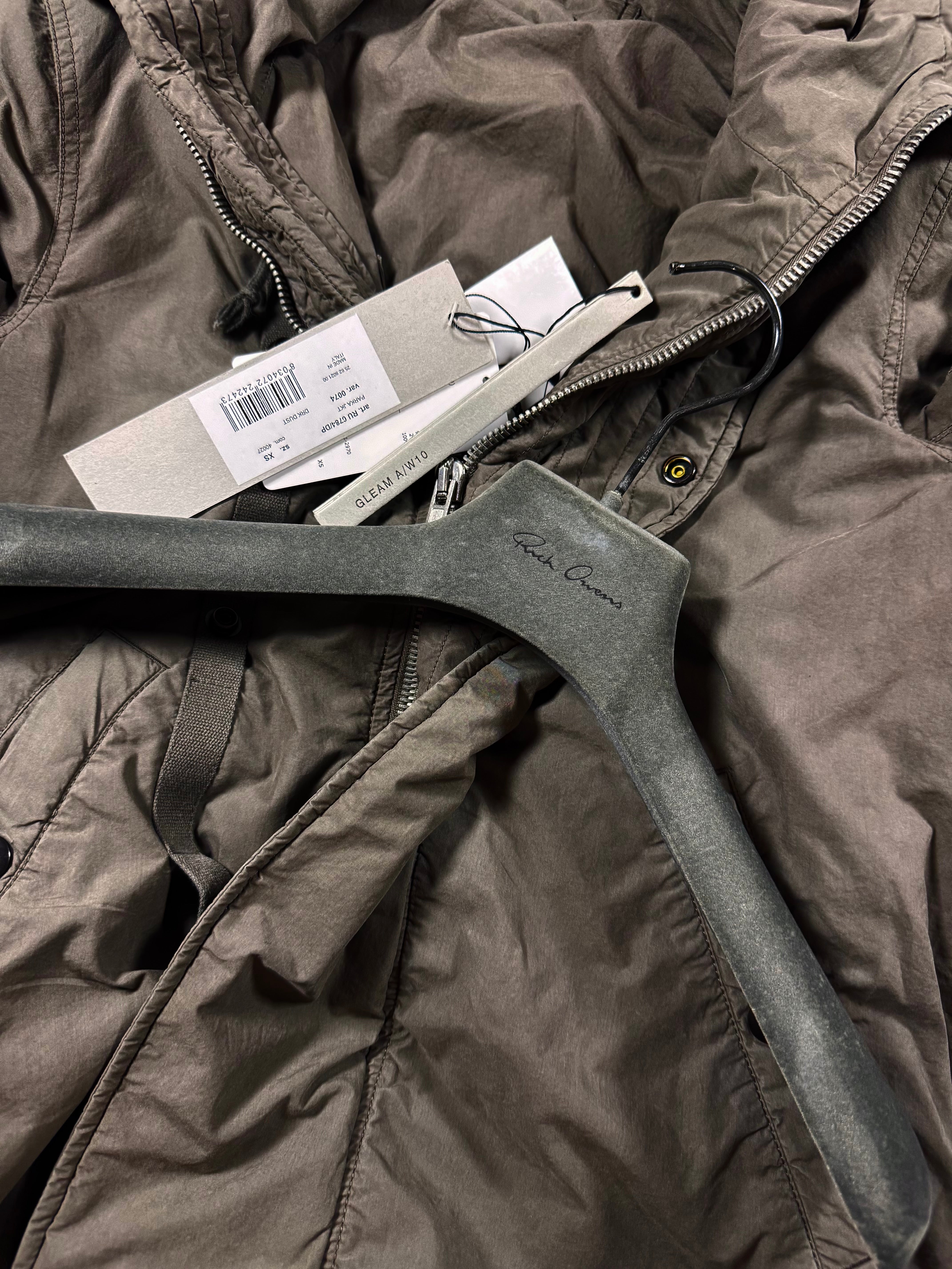 Stunning parka from Autumn/Winter 2010 “Gleam”— embodies Rick Owens signature fusion of brutalist utility and sculptural volume. Cut in a compact, armored silhouette, the jacket features a heavy insulated body, ribbed cuffs and hem, and the iconic oversized hood that frames the wearer like protective architecture. 'Dark Dust’ nylon gives it a militaristic, presence, along the snap-button closure details, hidden inner and sleeve zipper pockets. Like new, o flaws or damages (pristine) — comes with the original tags and even the felt coated hanger